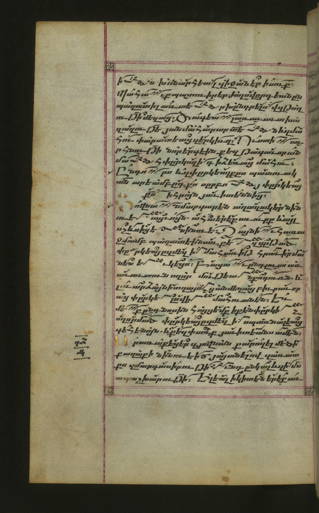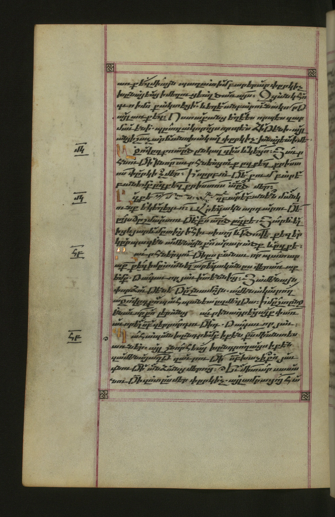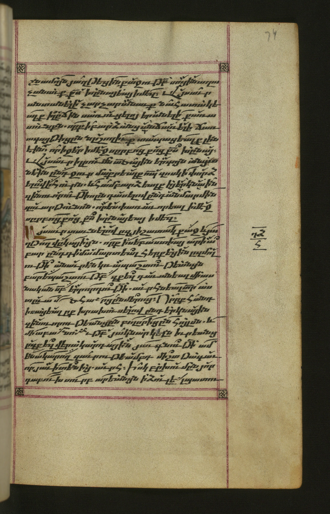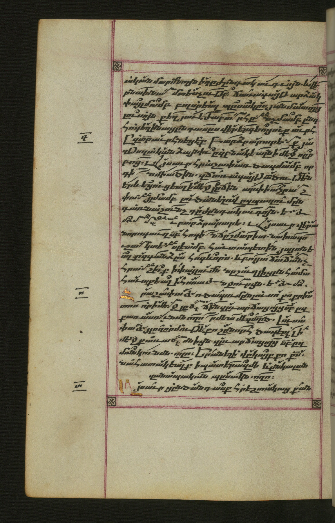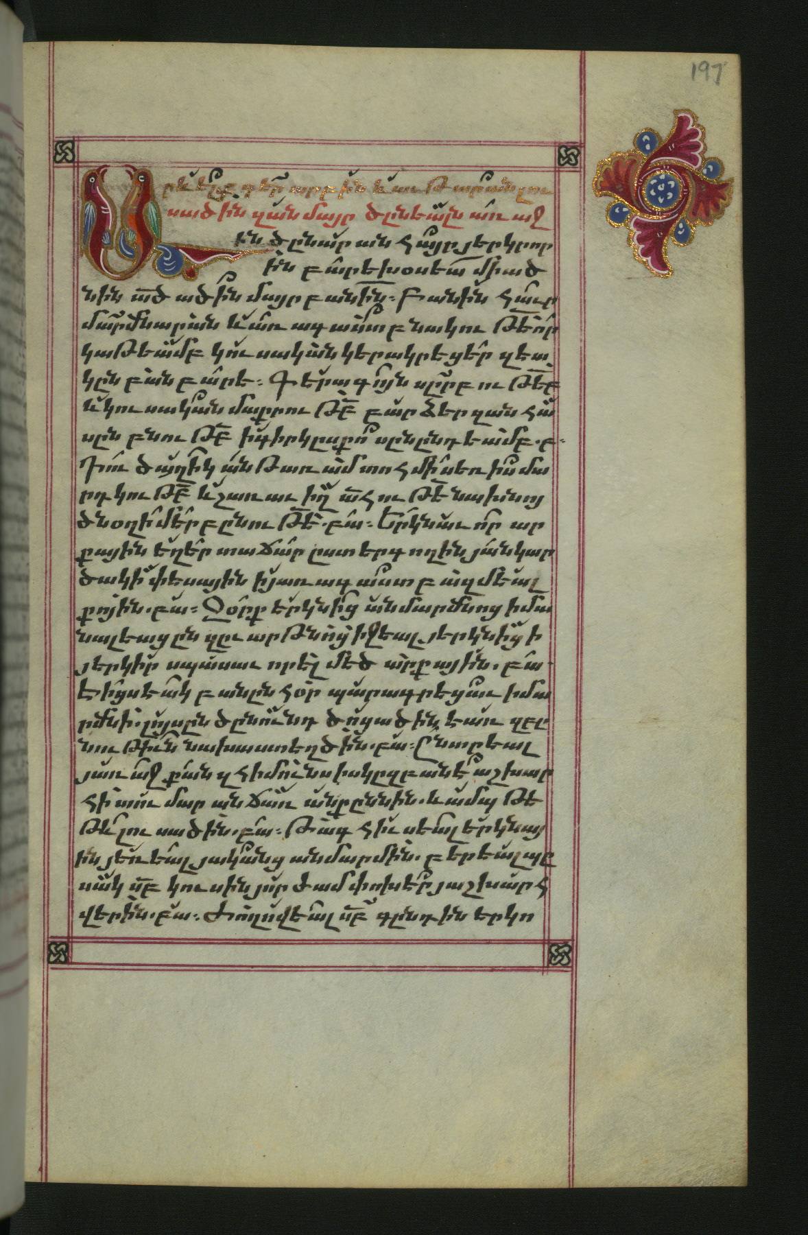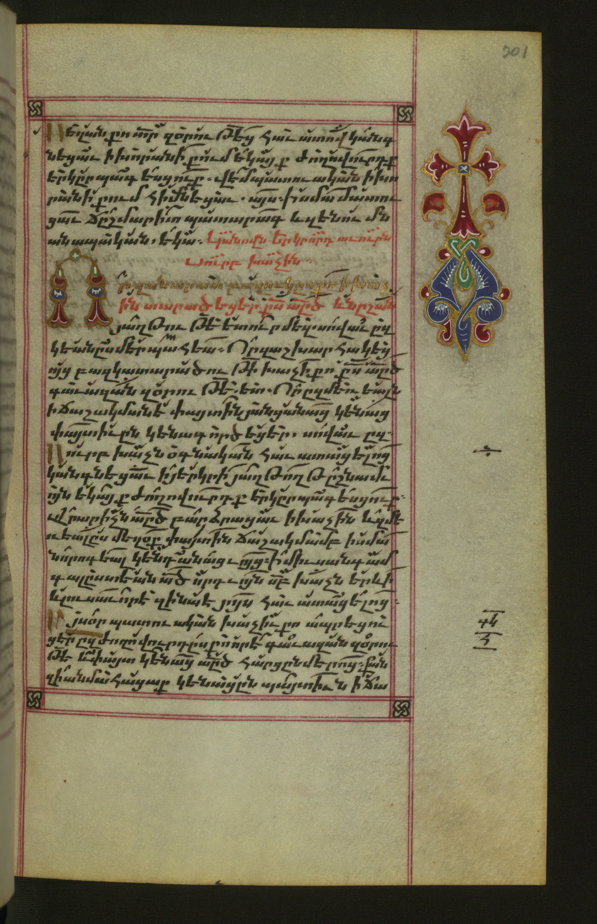 This hymnal was completed in Constantinople on August 15, 1678 [AE 1127], by the priest Yakob Pēligratc‘i, having been commissioned by Člav, son of Nawasard, as a dedication to his sons, Astuacatur and Sahak. The structure of the hymns adheres approximately to the standard Armenian hymnal (Շաբակնոց), with minor variations in order and a few substitutions (see Sanjian in the bibliography). The book is illuminated extensively, with thirty-eight full- and half-page polychrome miniatures against gold backgrounds, eight decorated head-pieces marking the principal divisions of the hymnal, and numerous marginal miniatures marking individual hymns, including biblical figures, saints, bishops, and vignettes. The style of the miniatures is largely in imitation of western European models, though more traditional Armenian and Byzantine influences stand out, such as the vibrant color palette, an iconic frontality for depictions of saints and bishops, and the highly abstracted floral motifs and zoomorphic incipits marking hymn divisions.