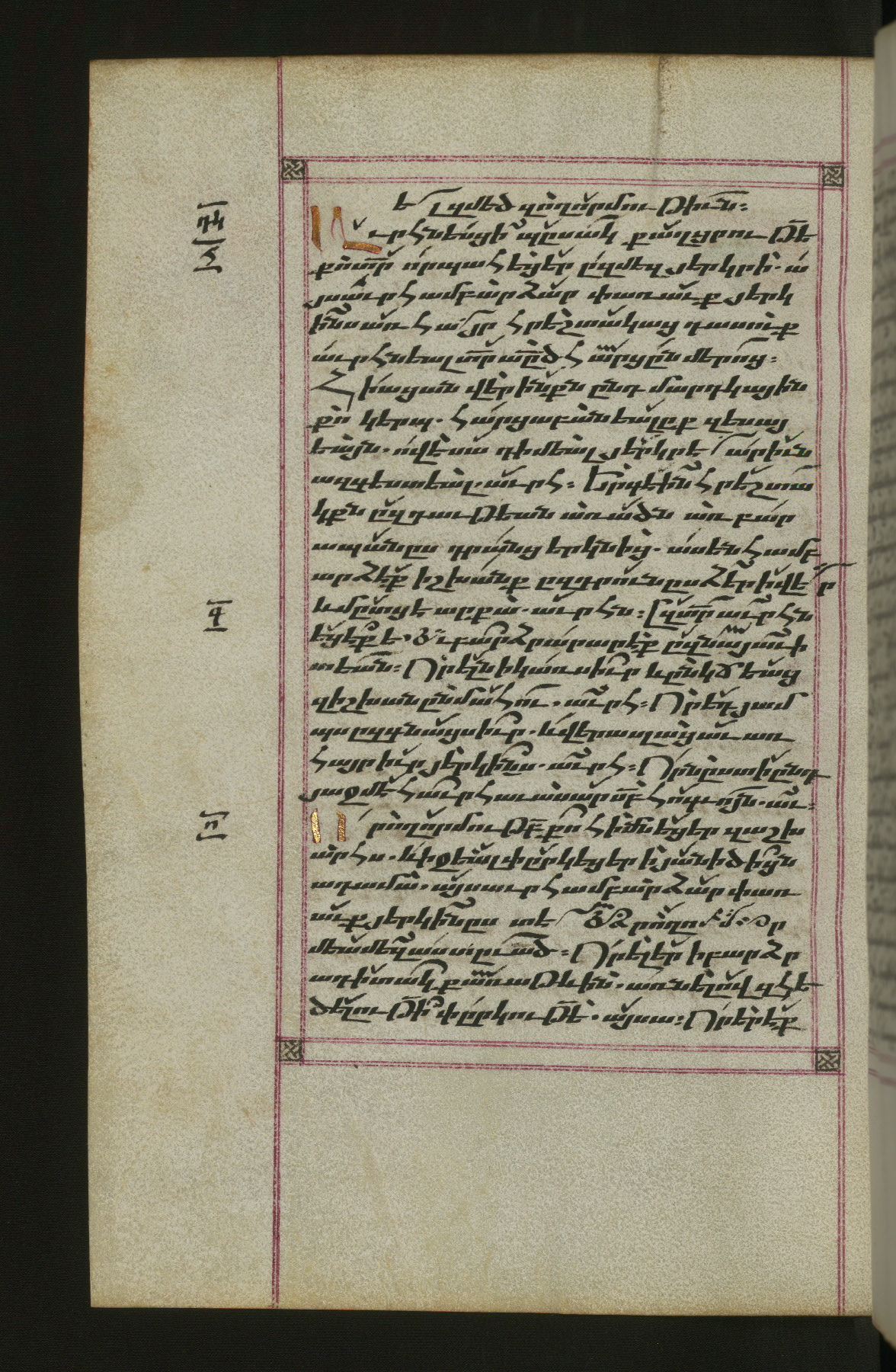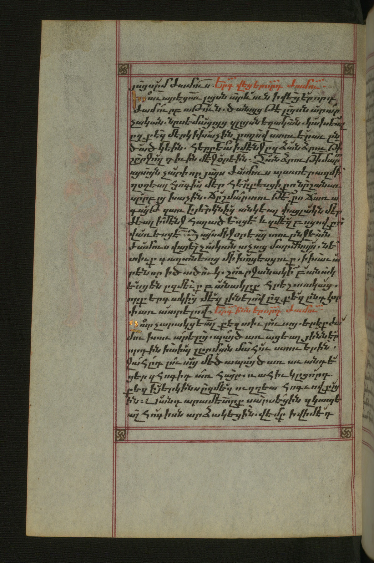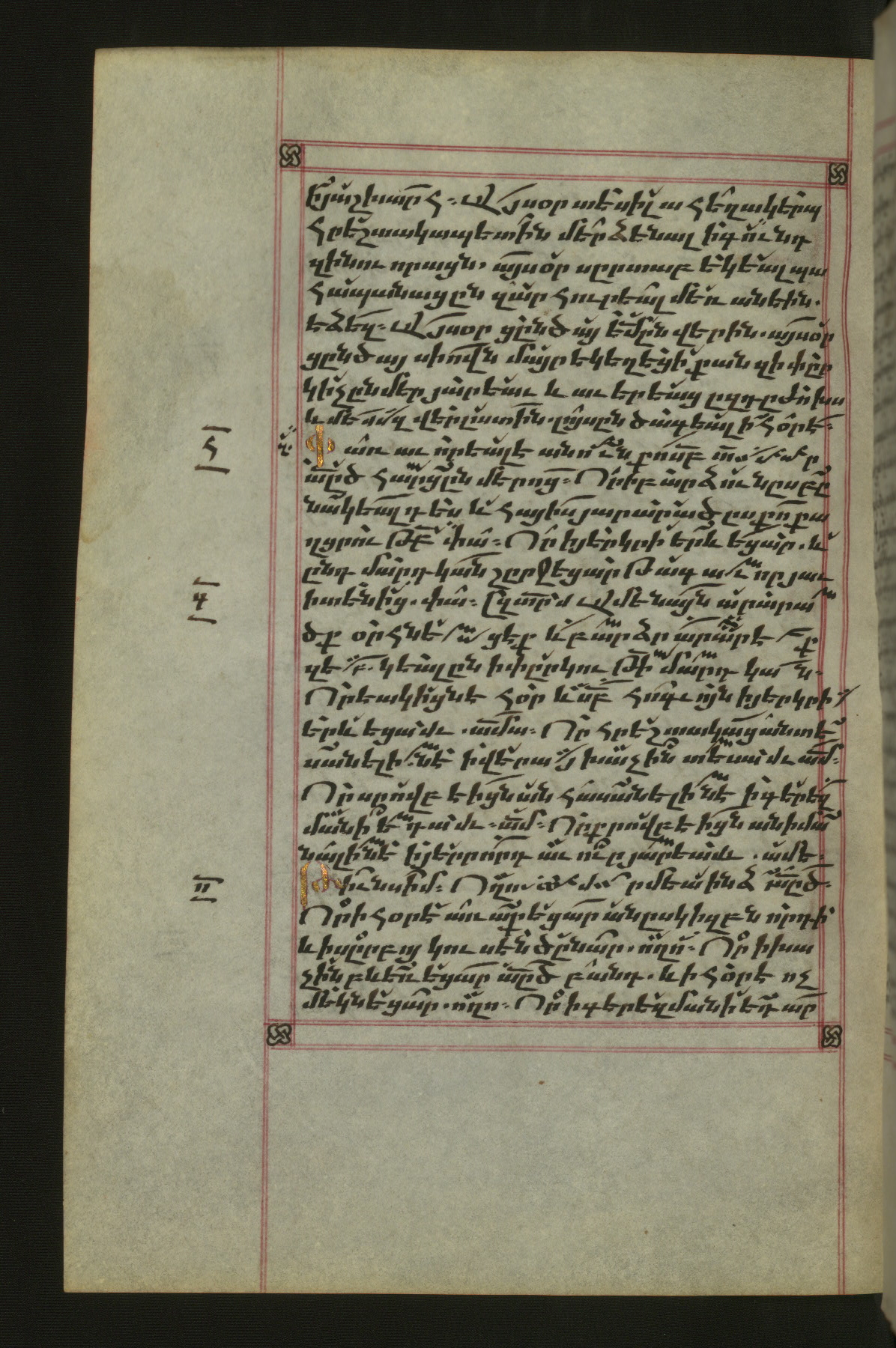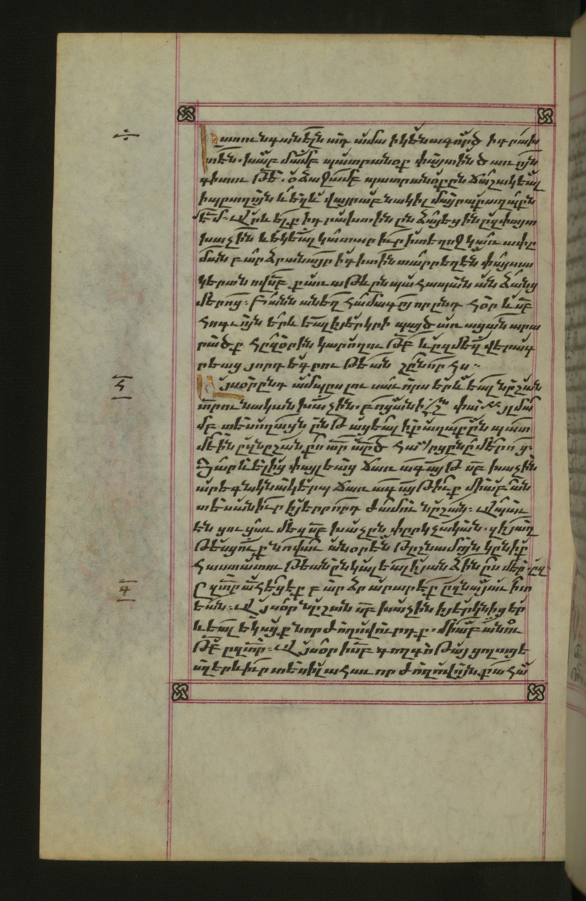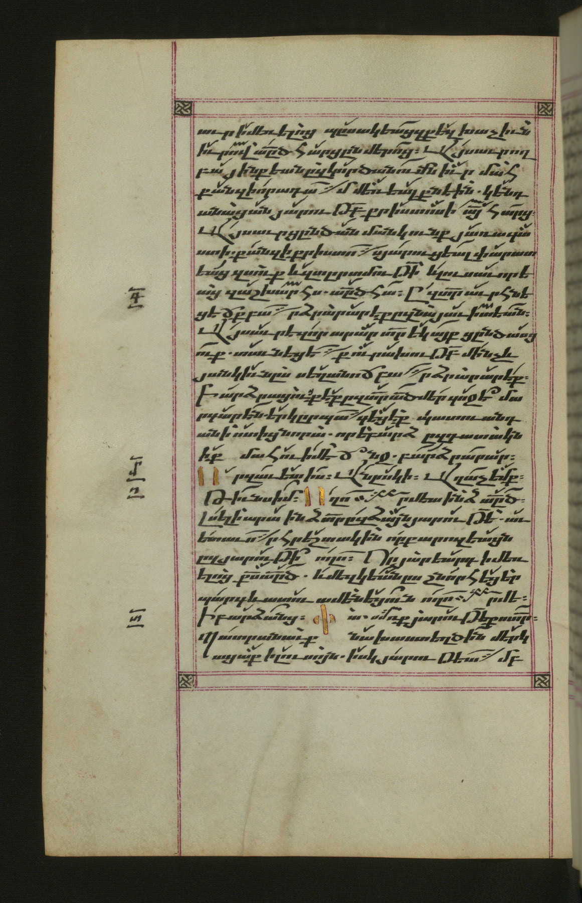 This hymnal was completed in Constantinople on August 15, 1678 [AE 1127], by the priest Yakob Pēligratc‘i, having been commissioned by Člav, son of Nawasard, as a dedication to his sons, Astuacatur and Sahak. The structure of the hymns adheres approximately to the standard Armenian hymnal (Շաբակնոց), with minor variations in order and a few substitutions (see Sanjian in the bibliography). The book is illuminated extensively, with thirty-eight full- and half-page polychrome miniatures against gold backgrounds, eight decorated head-pieces marking the principal divisions of the hymnal, and numerous marginal miniatures marking individual hymns, including biblical figures, saints, bishops, and vignettes. The style of the miniatures is largely in imitation of western European models, though more traditional Armenian and Byzantine influences stand out, such as the vibrant color palette, an iconic frontality for depictions of saints and bishops, and the highly abstracted floral motifs and zoomorphic incipits marking hymn divisions.
