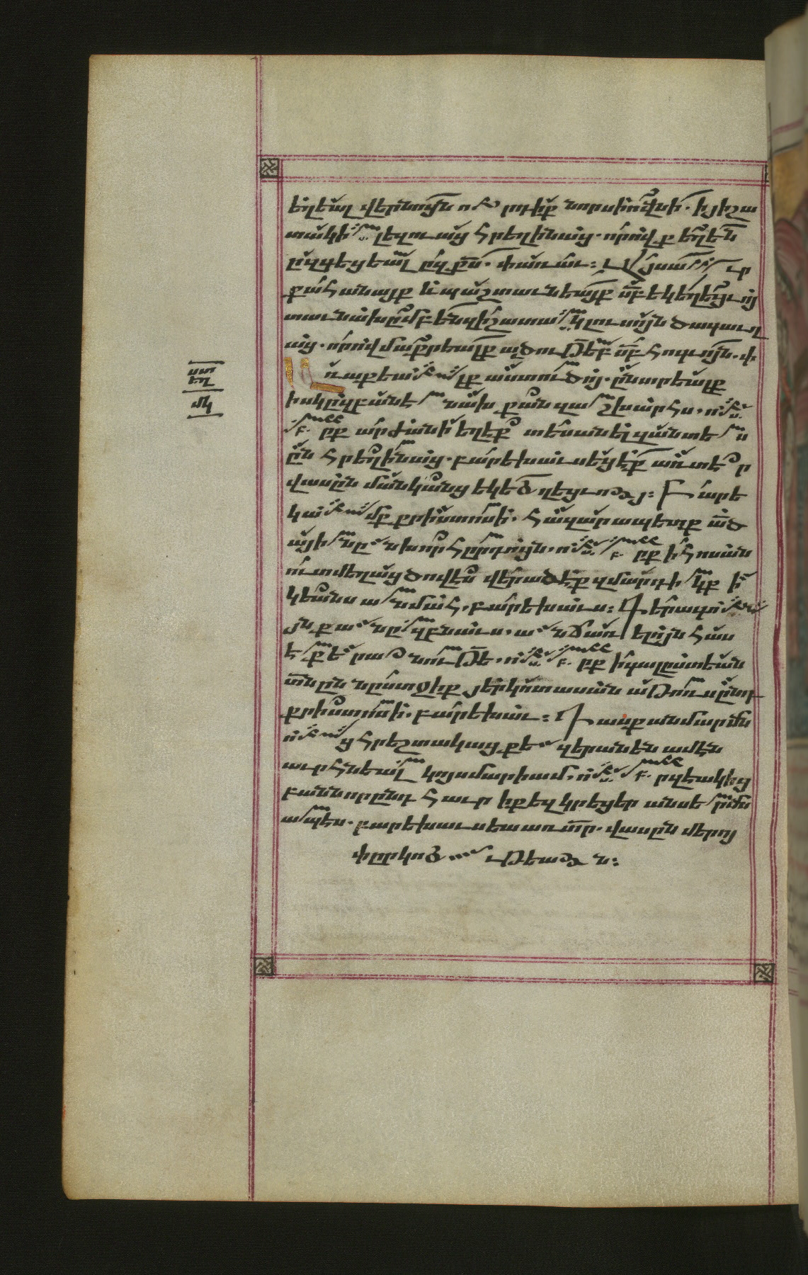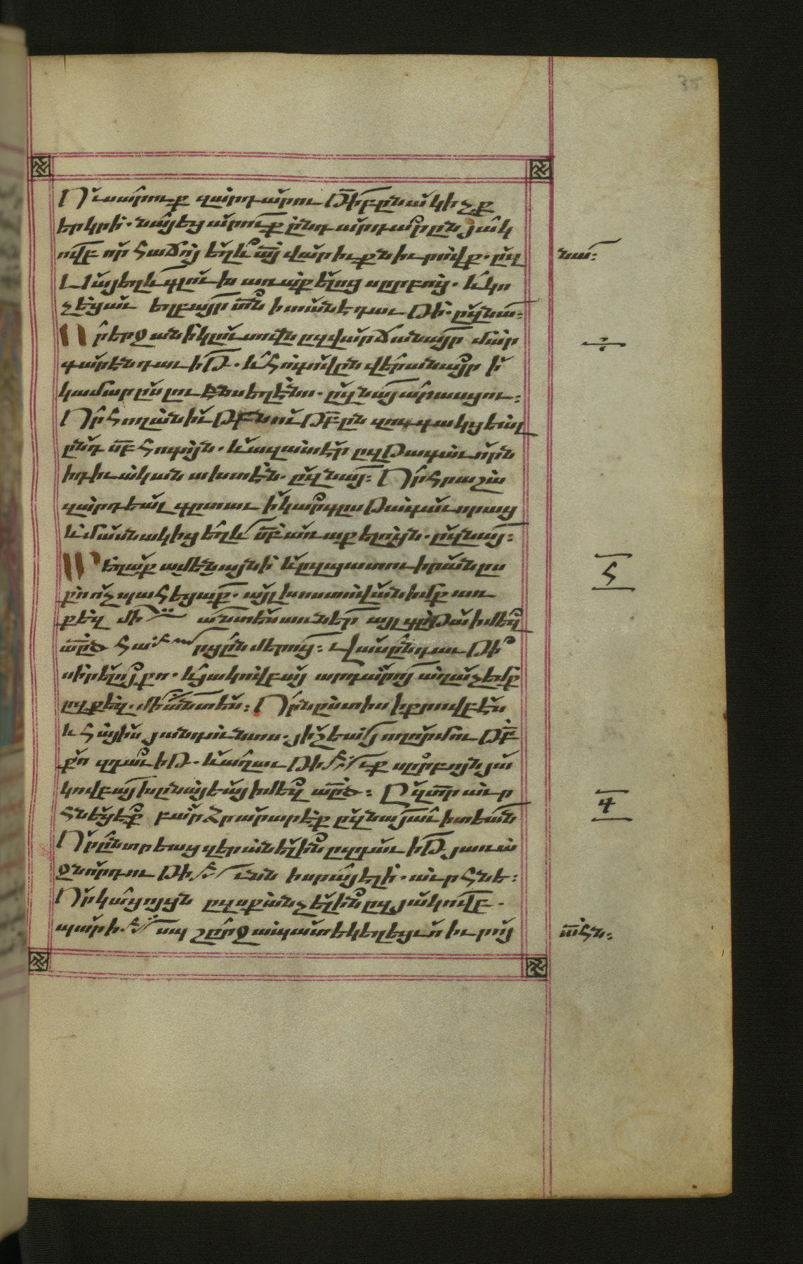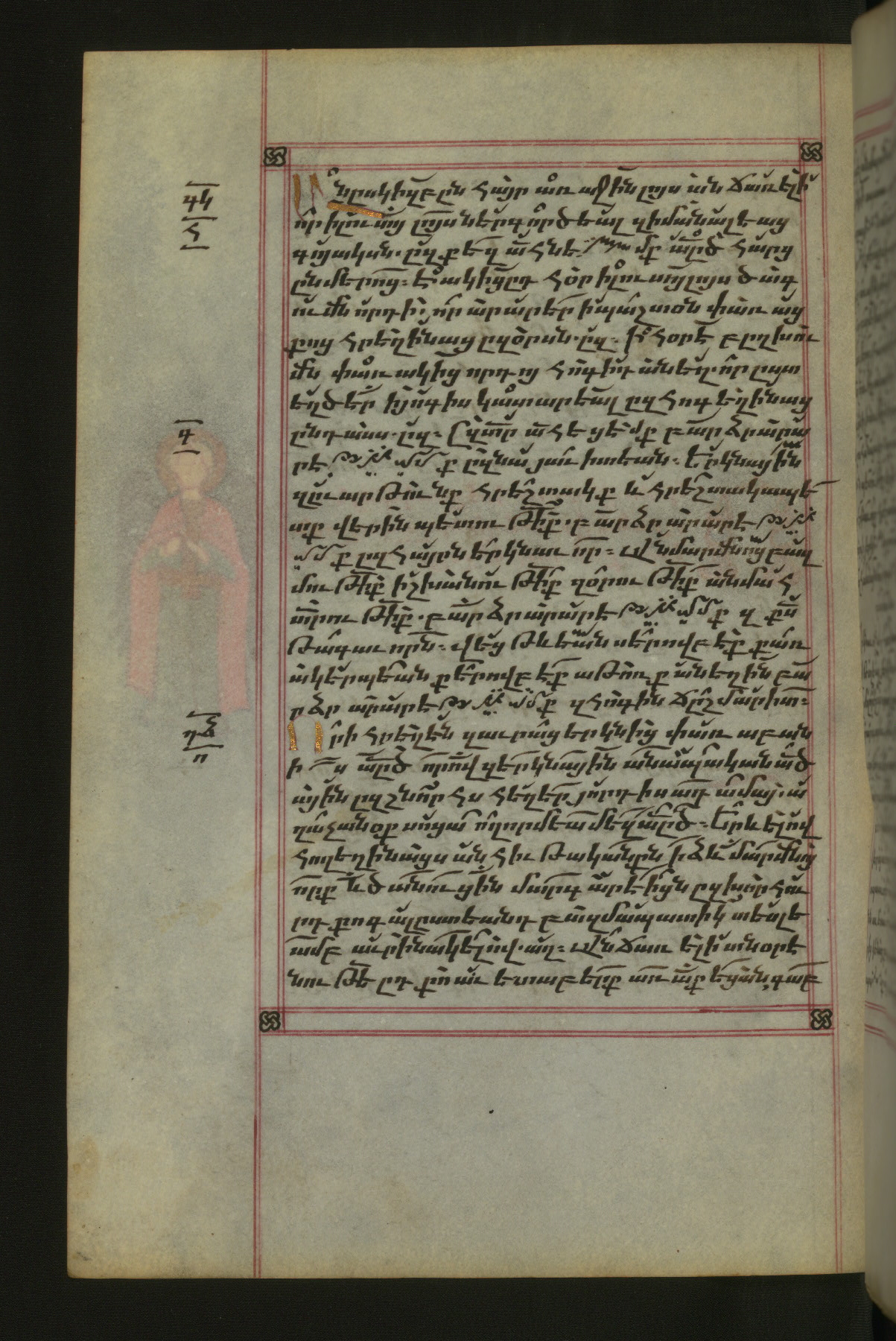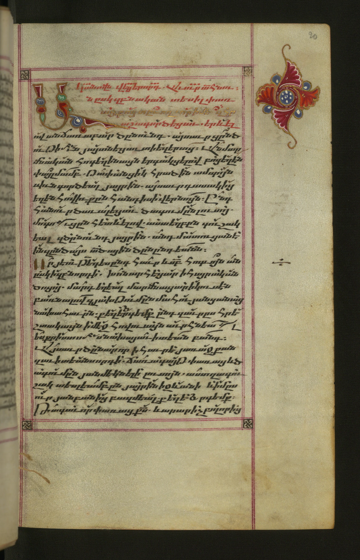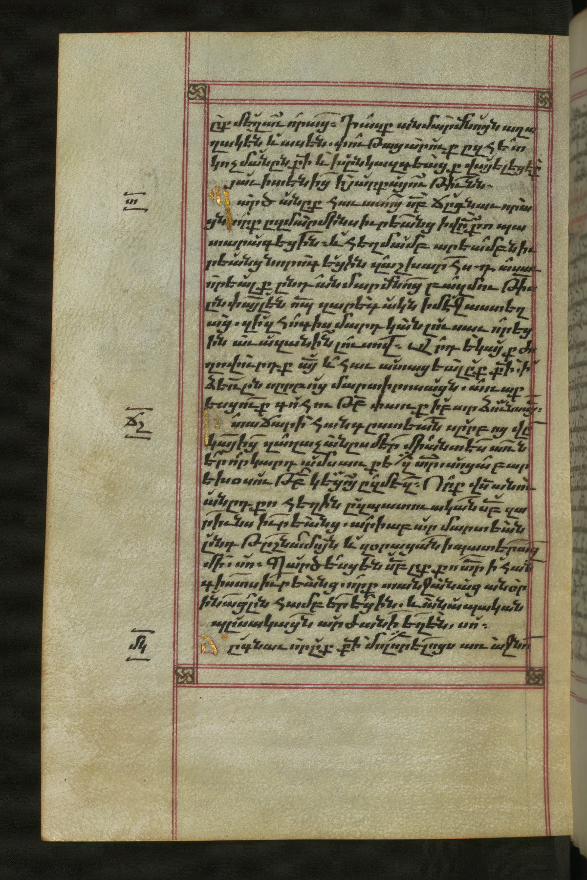 This hymnal was completed in Constantinople on August 15, 1678 [AE 1127], by the priest Yakob Pēligratc‘i, having been commissioned by Člav, son of Nawasard, as a dedication to his sons, Astuacatur and Sahak. The structure of the hymns adheres approximately to the standard Armenian hymnal (Շաբակնոց), with minor variations in order and a few substitutions (see Sanjian in the bibliography). The book is illuminated extensively, with thirty-eight full- and half-page polychrome miniatures against gold backgrounds, eight decorated head-pieces marking the principal divisions of the hymnal, and numerous marginal miniatures marking individual hymns, including biblical figures, saints, bishops, and vignettes. The style of the miniatures is largely in imitation of western European models, though more traditional Armenian and Byzantine influences stand out, such as the vibrant color palette, an iconic frontality for depictions of saints and bishops, and the highly abstracted floral motifs and zoomorphic incipits marking hymn divisions.