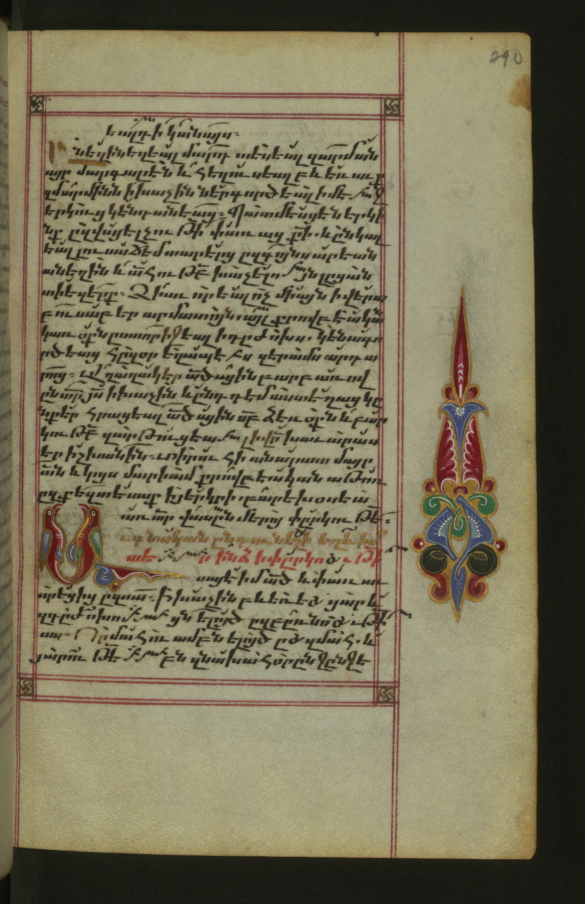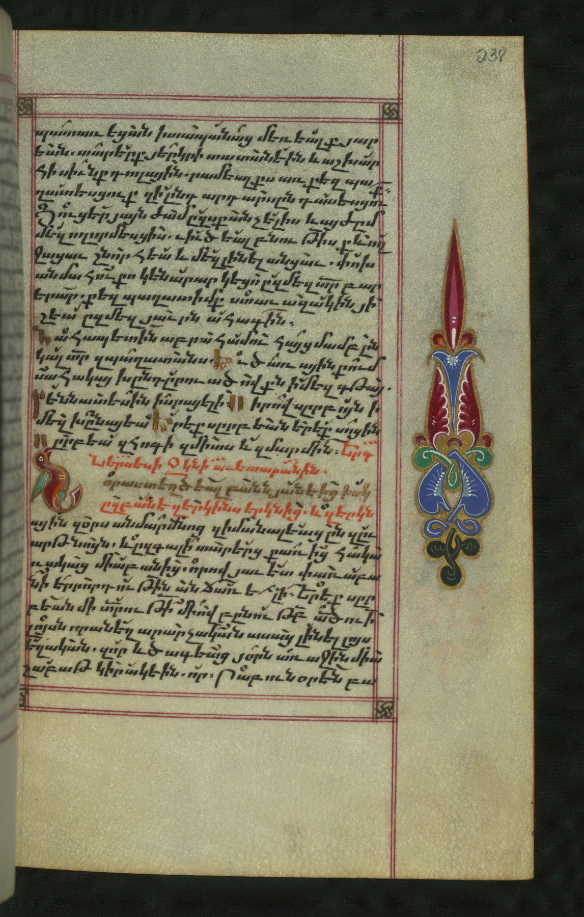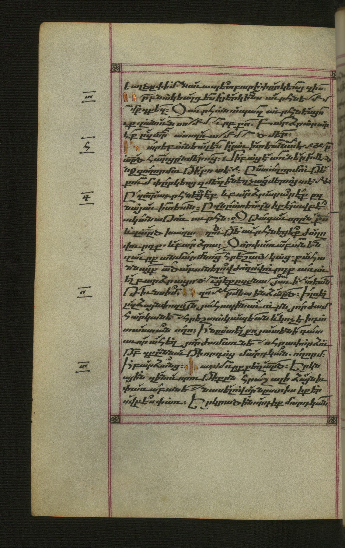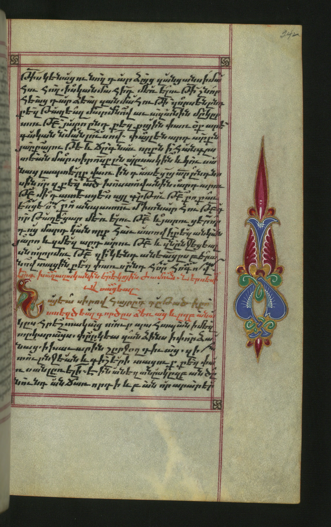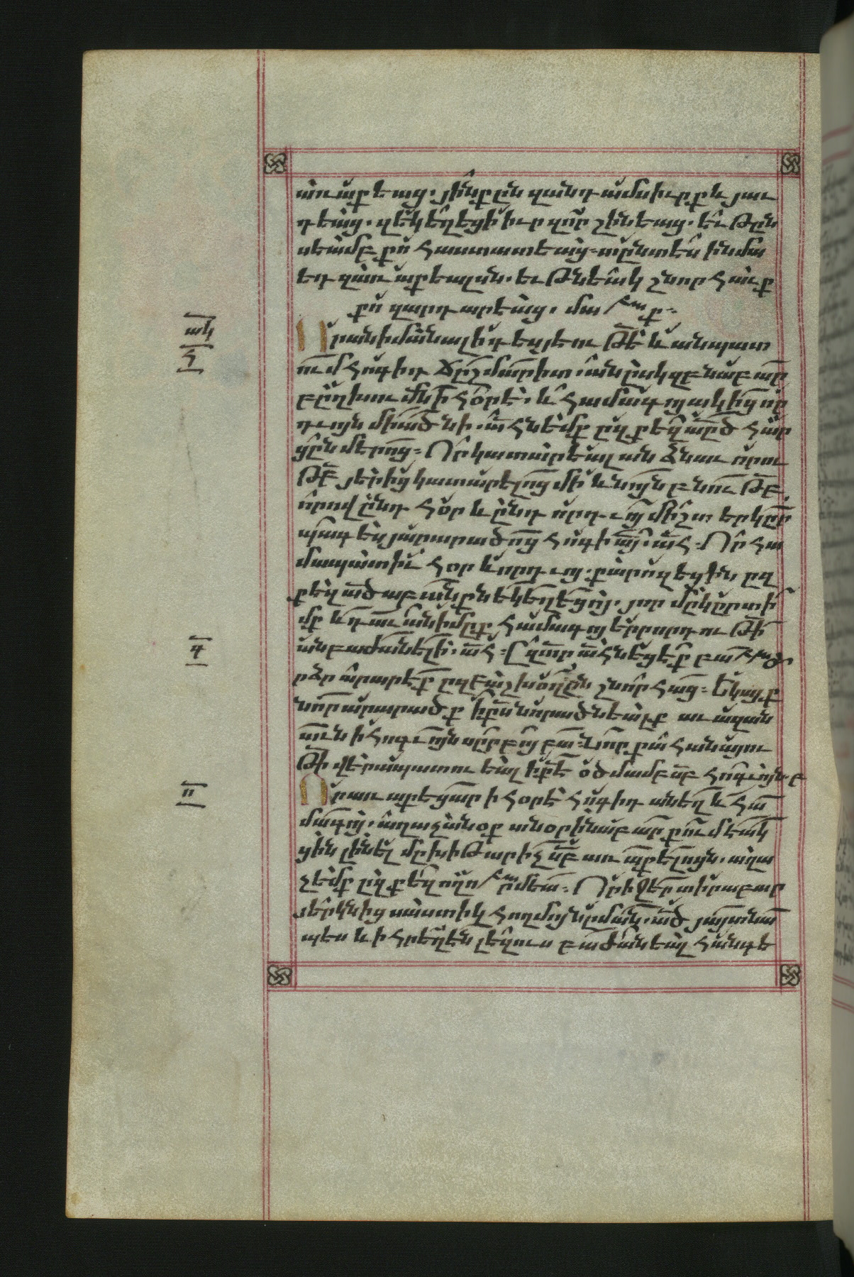 This hymnal was completed in Constantinople on August 15, 1678 [AE 1127], by the priest Yakob Pēligratc‘i, having been commissioned by Člav, son of Nawasard, as a dedication to his sons, Astuacatur and Sahak. The structure of the hymns adheres approximately to the standard Armenian hymnal (Շաբակնոց), with minor variations in order and a few substitutions (see Sanjian in the bibliography). The book is illuminated extensively, with thirty-eight full- and half-page polychrome miniatures against gold backgrounds, eight decorated head-pieces marking the principal divisions of the hymnal, and numerous marginal miniatures marking individual hymns, including biblical figures, saints, bishops, and vignettes. The style of the miniatures is largely in imitation of western European models, though more traditional Armenian and Byzantine influences stand out, such as the vibrant color palette, an iconic frontality for depictions of saints and bishops, and the highly abstracted floral motifs and zoomorphic incipits marking hymn divisions.
