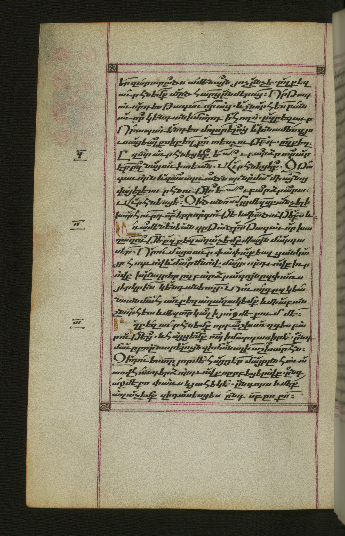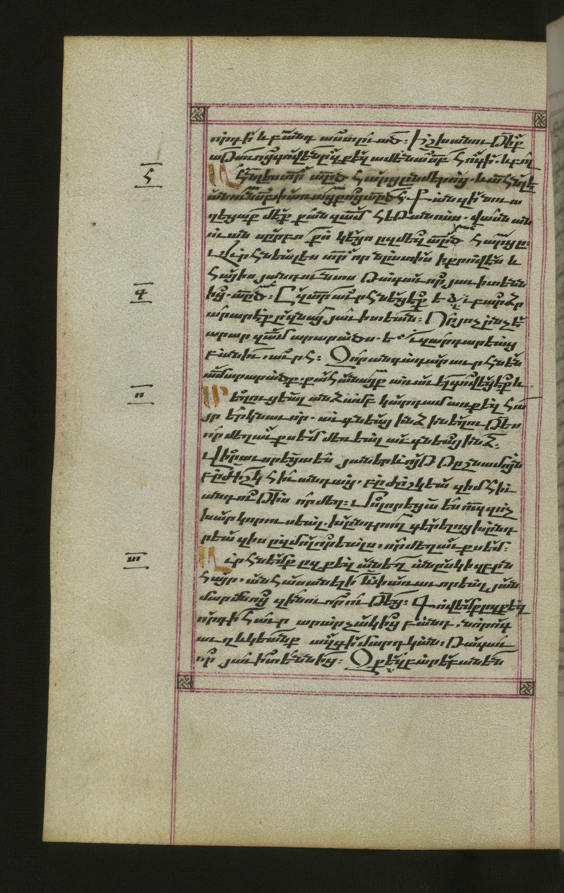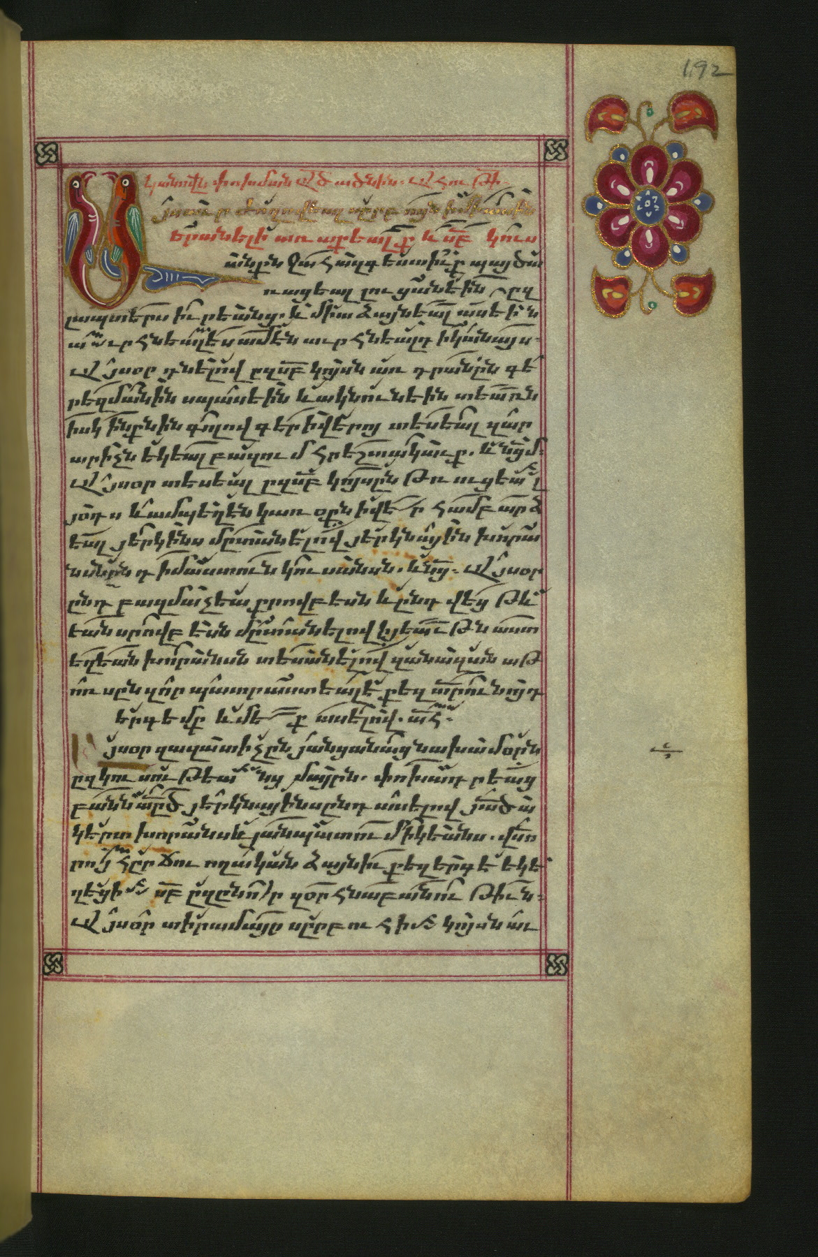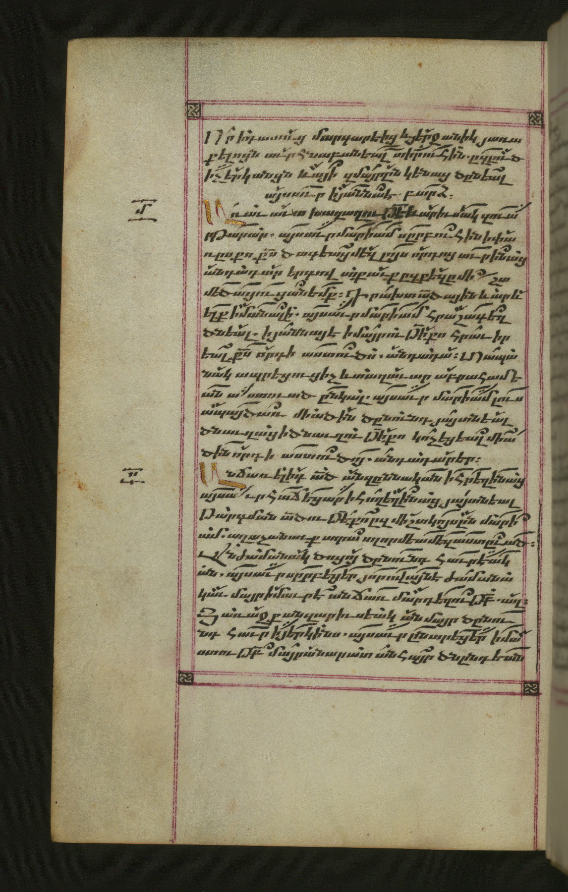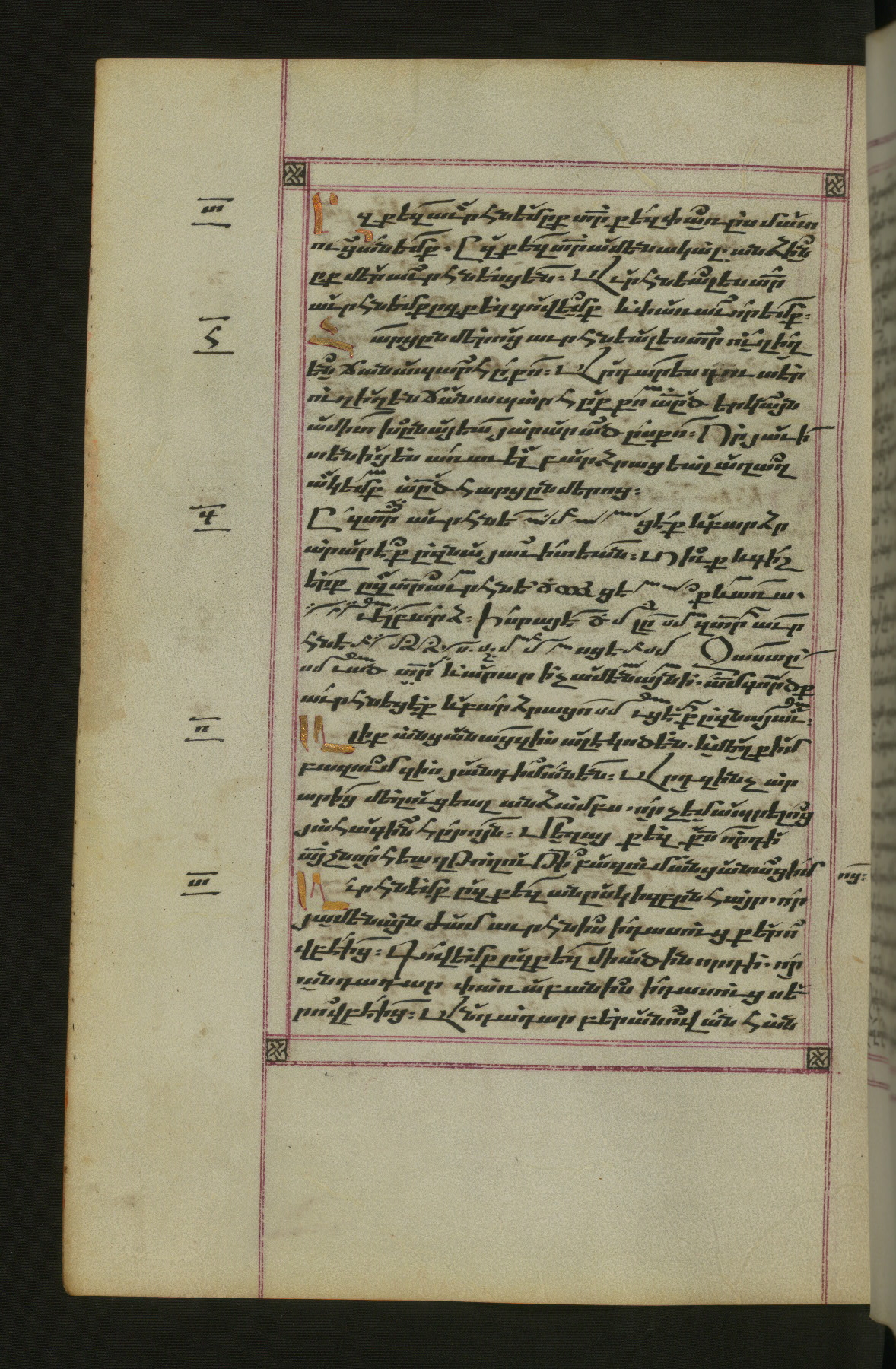 This hymnal was completed in Constantinople on August 15, 1678 [AE 1127], by the priest Yakob Pēligratc‘i, having been commissioned by Člav, son of Nawasard, as a dedication to his sons, Astuacatur and Sahak. The structure of the hymns adheres approximately to the standard Armenian hymnal (Շաբակնոց), with minor variations in order and a few substitutions (see Sanjian in the bibliography). The book is illuminated extensively, with thirty-eight full- and half-page polychrome miniatures against gold backgrounds, eight decorated head-pieces marking the principal divisions of the hymnal, and numerous marginal miniatures marking individual hymns, including biblical figures, saints, bishops, and vignettes. The style of the miniatures is largely in imitation of western European models, though more traditional Armenian and Byzantine influences stand out, such as the vibrant color palette, an iconic frontality for depictions of saints and bishops, and the highly abstracted floral motifs and zoomorphic incipits marking hymn divisions.