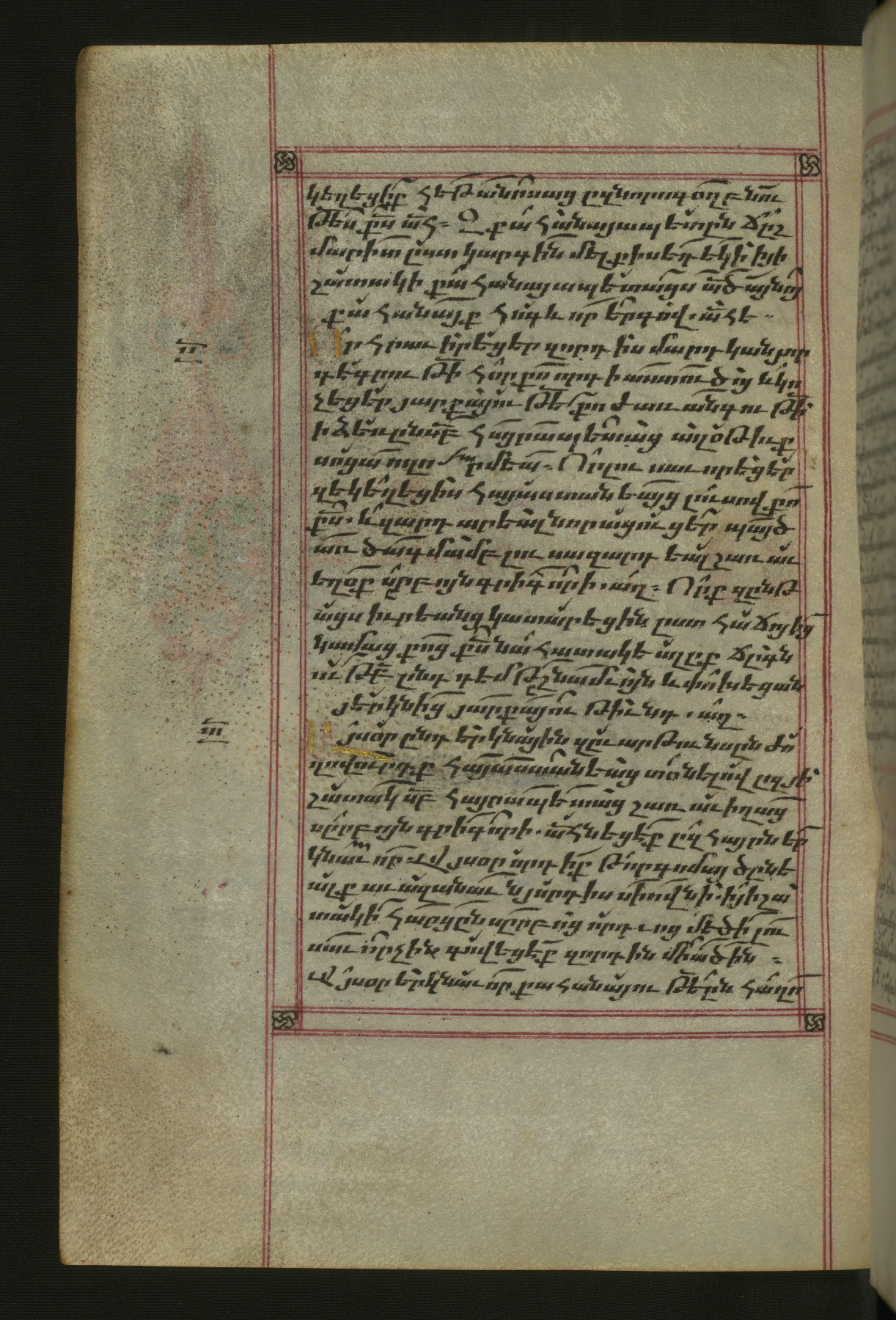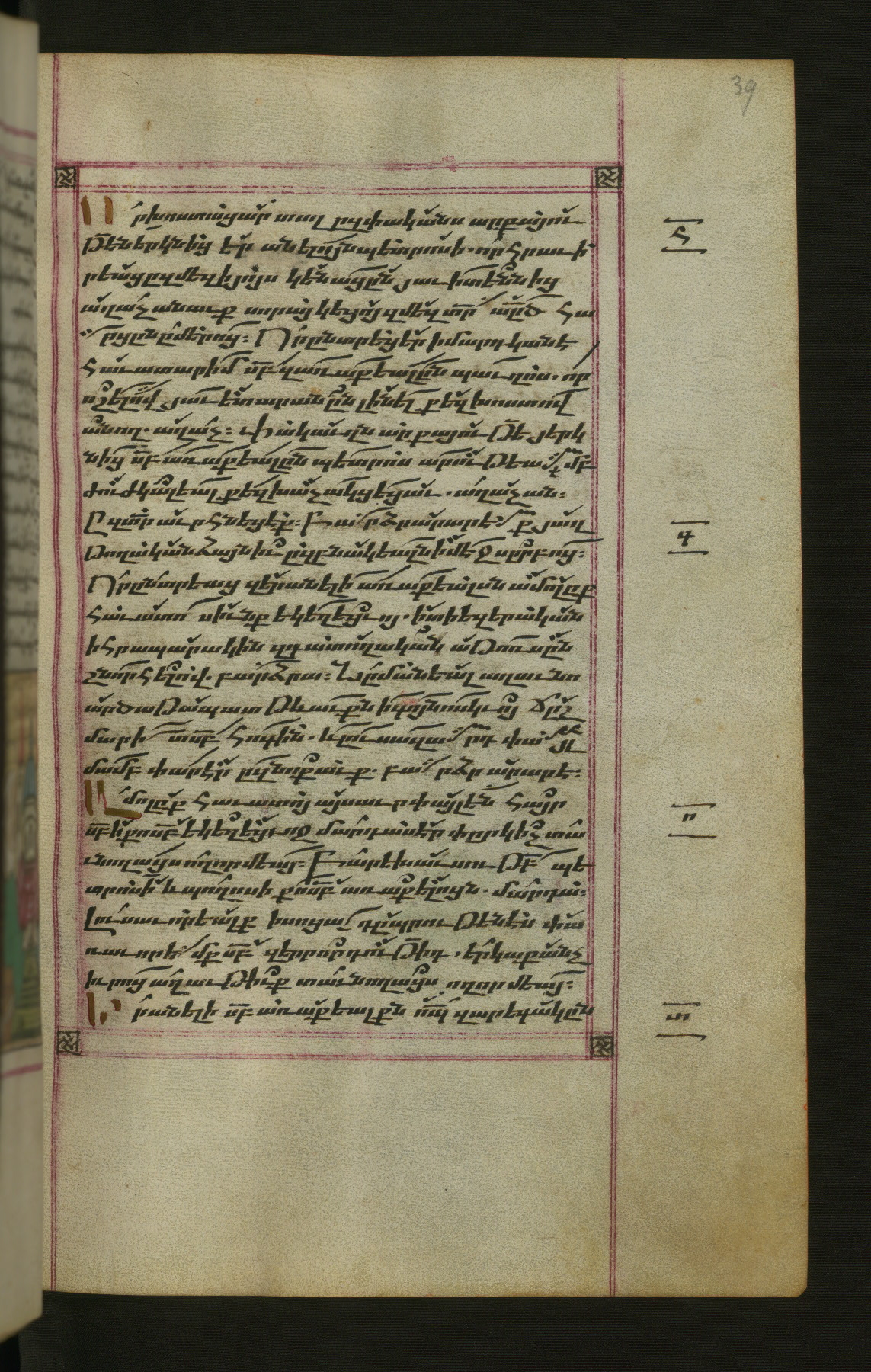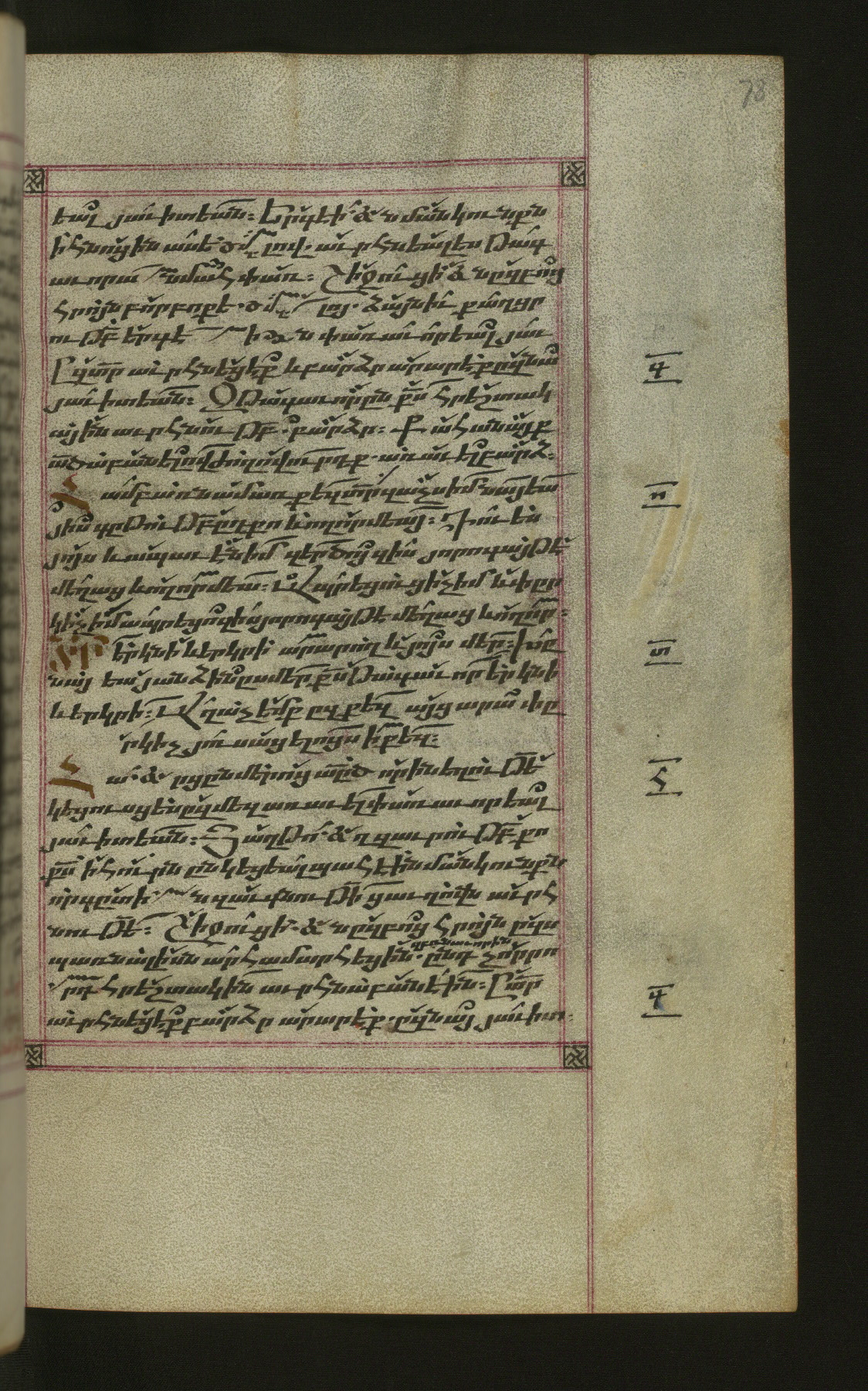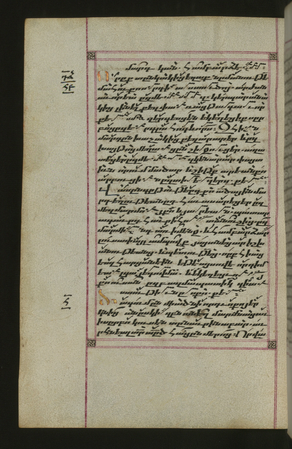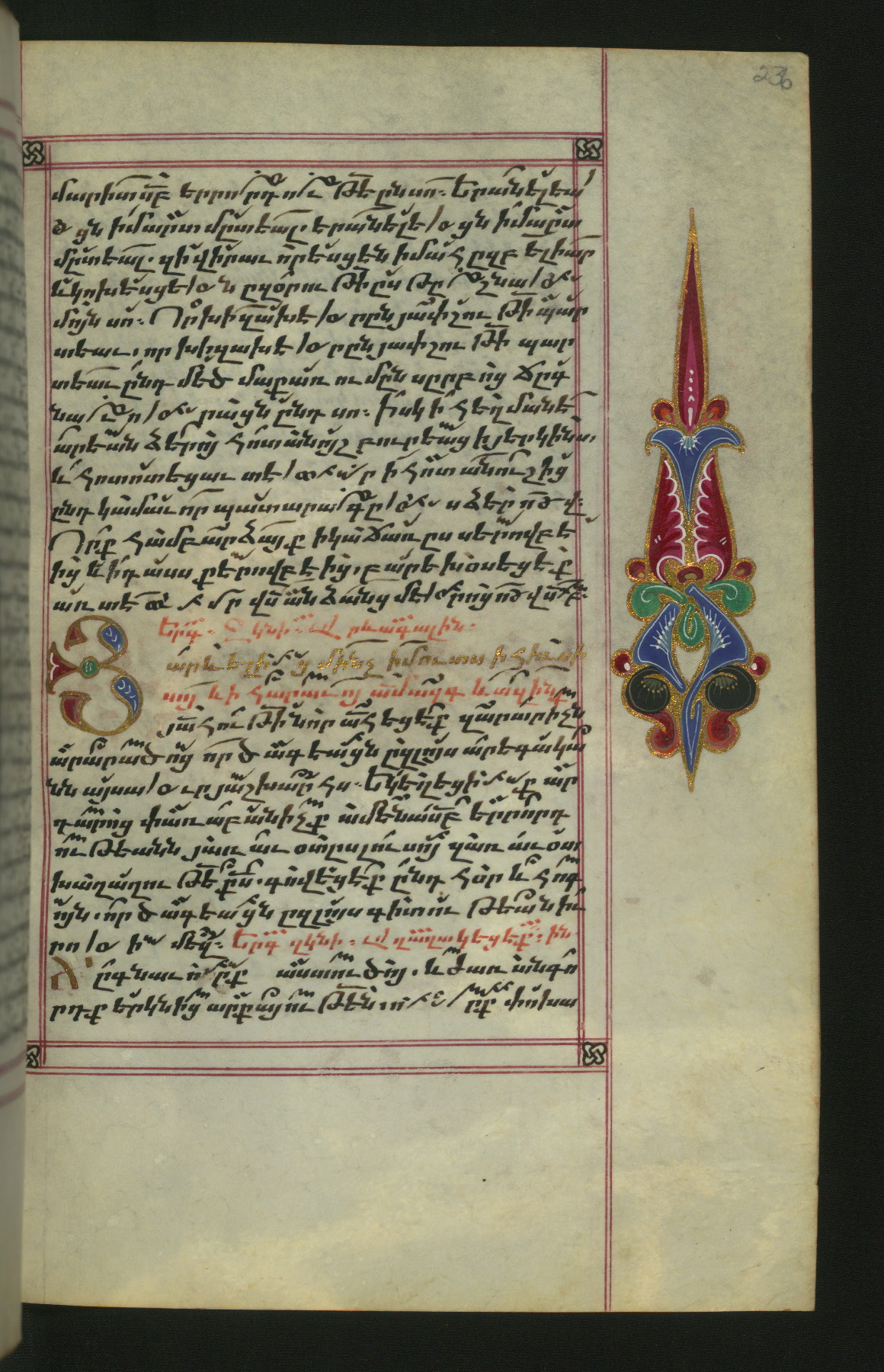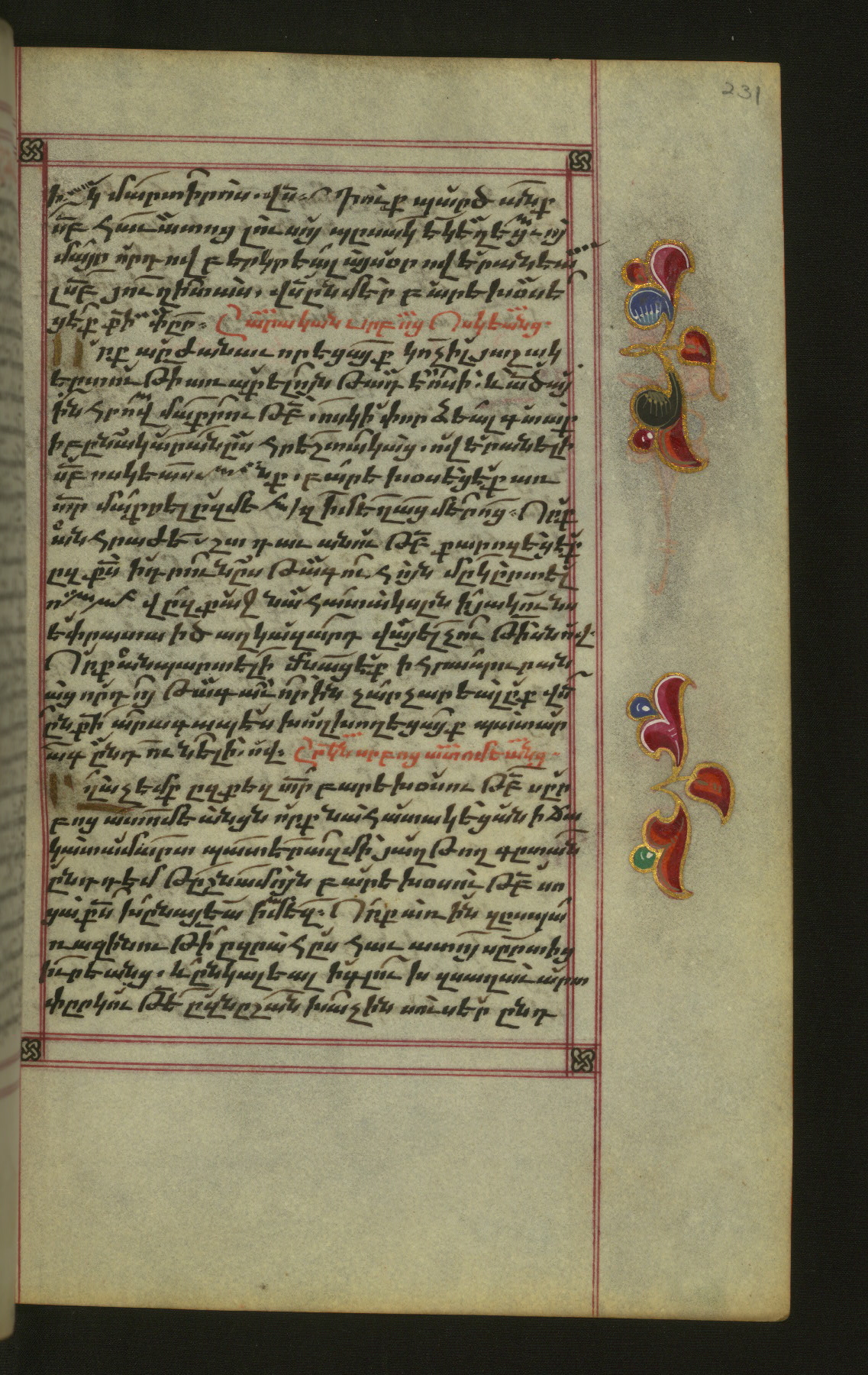 This hymnal was completed in Constantinople on August 15, 1678 [AE 1127], by the priest Yakob Pēligratc‘i, having been commissioned by Člav, son of Nawasard, as a dedication to his sons, Astuacatur and Sahak. The structure of the hymns adheres approximately to the standard Armenian hymnal (Շաբակնոց), with minor variations in order and a few substitutions (see Sanjian in the bibliography). The book is illuminated extensively, with thirty-eight full- and half-page polychrome miniatures against gold backgrounds, eight decorated head-pieces marking the principal divisions of the hymnal, and numerous marginal miniatures marking individual hymns, including biblical figures, saints, bishops, and vignettes. The style of the miniatures is largely in imitation of western European models, though more traditional Armenian and Byzantine influences stand out, such as the vibrant color palette, an iconic frontality for depictions of saints and bishops, and the highly abstracted floral motifs and zoomorphic incipits marking hymn divisions.