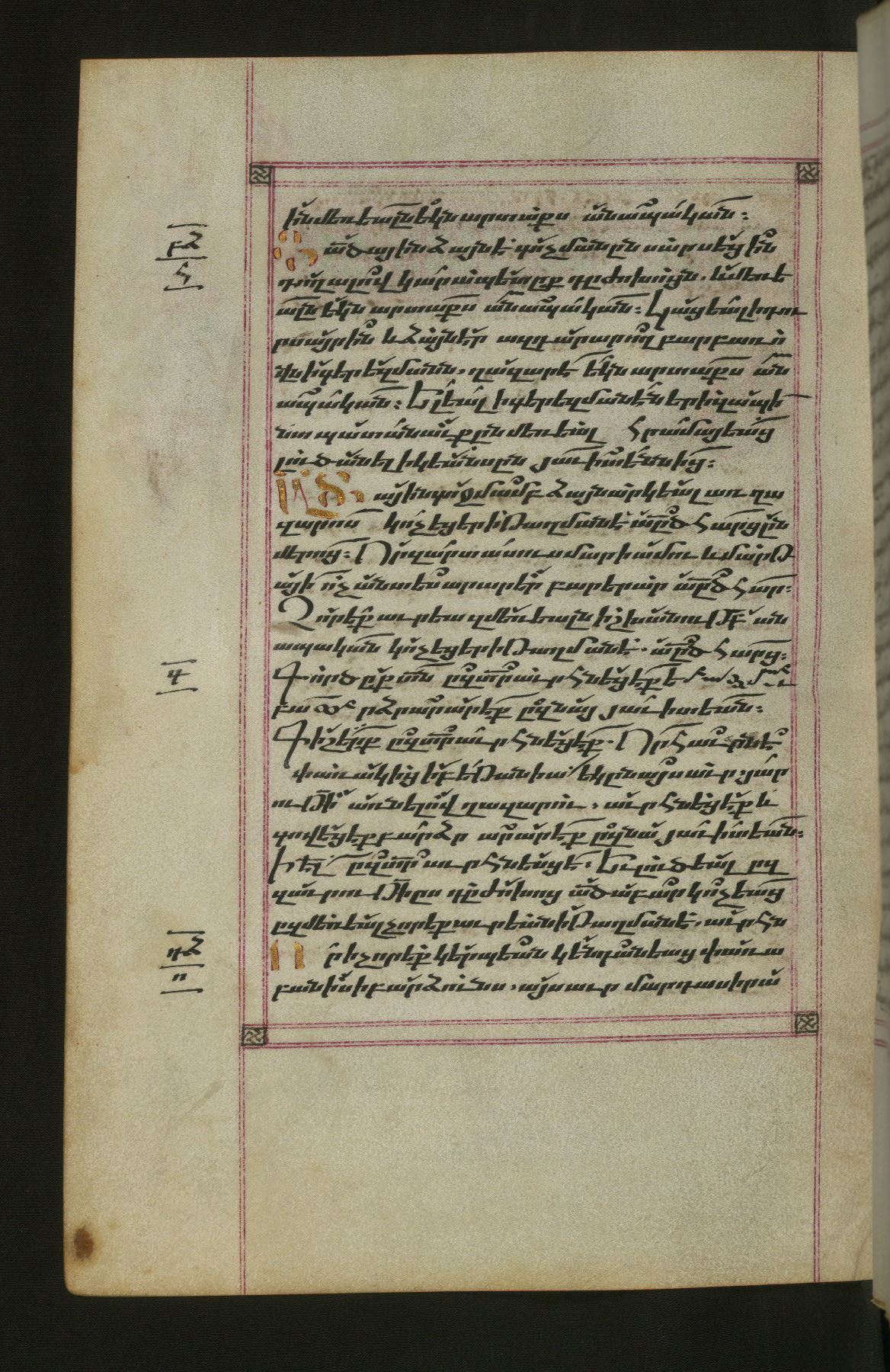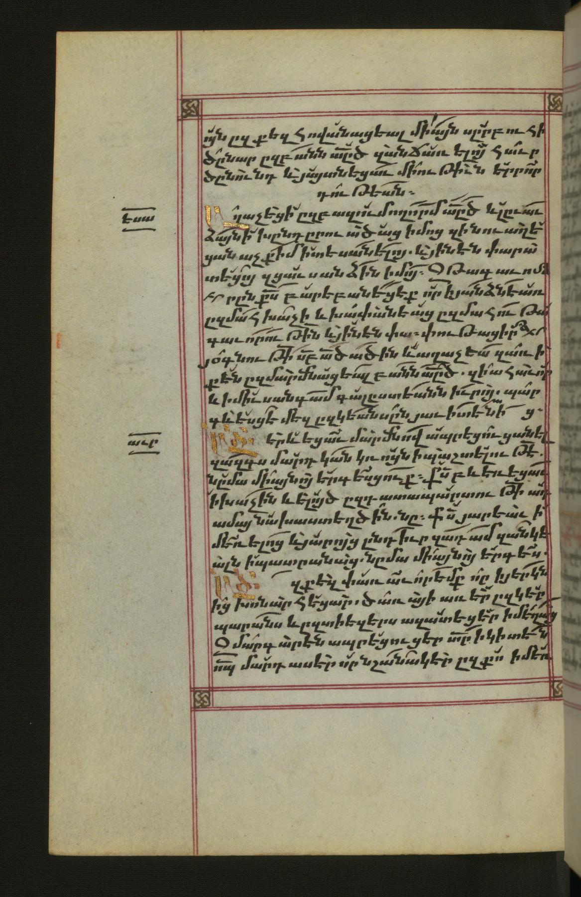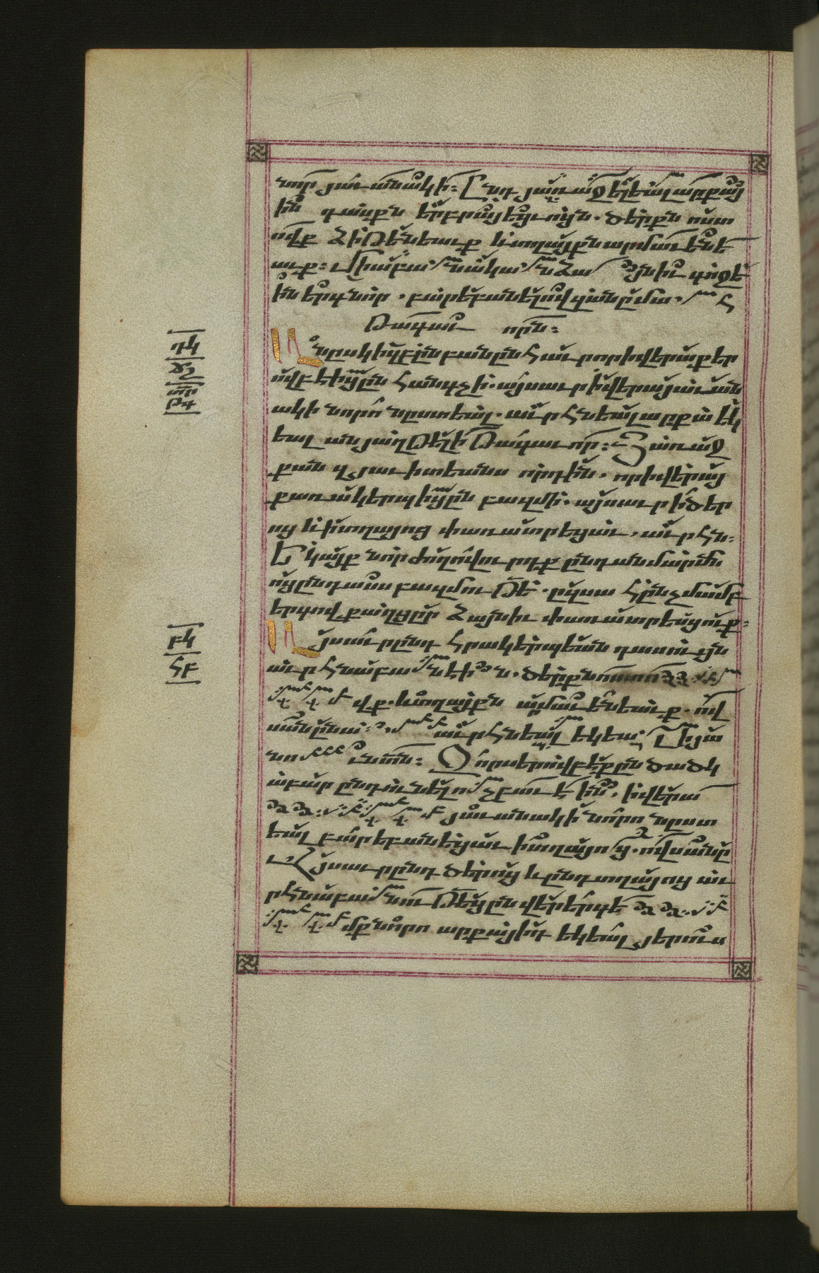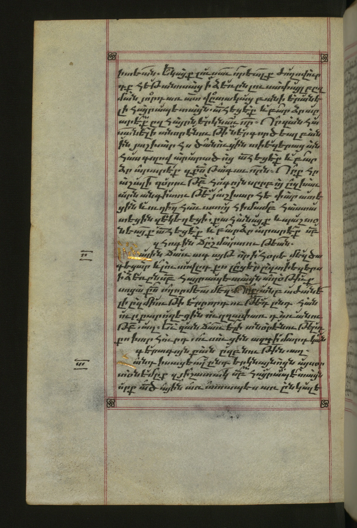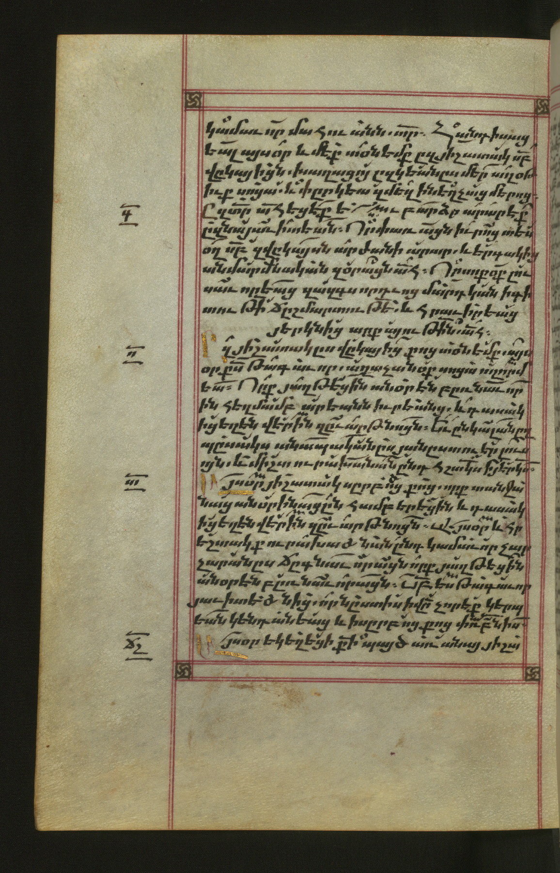 This hymnal was completed in Constantinople on August 15, 1678 [AE 1127], by the priest Yakob Pēligratc‘i, having been commissioned by Člav, son of Nawasard, as a dedication to his sons, Astuacatur and Sahak. The structure of the hymns adheres approximately to the standard Armenian hymnal (Շաբակնոց), with minor variations in order and a few substitutions (see Sanjian in the bibliography). The book is illuminated extensively, with thirty-eight full- and half-page polychrome miniatures against gold backgrounds, eight decorated head-pieces marking the principal divisions of the hymnal, and numerous marginal miniatures marking individual hymns, including biblical figures, saints, bishops, and vignettes. The style of the miniatures is largely in imitation of western European models, though more traditional Armenian and Byzantine influences stand out, such as the vibrant color palette, an iconic frontality for depictions of saints and bishops, and the highly abstracted floral motifs and zoomorphic incipits marking hymn divisions.