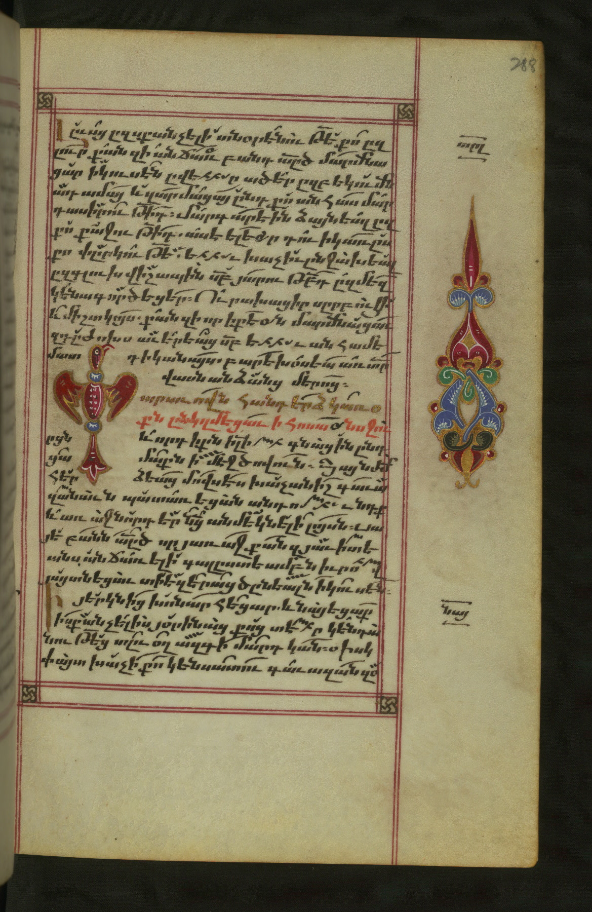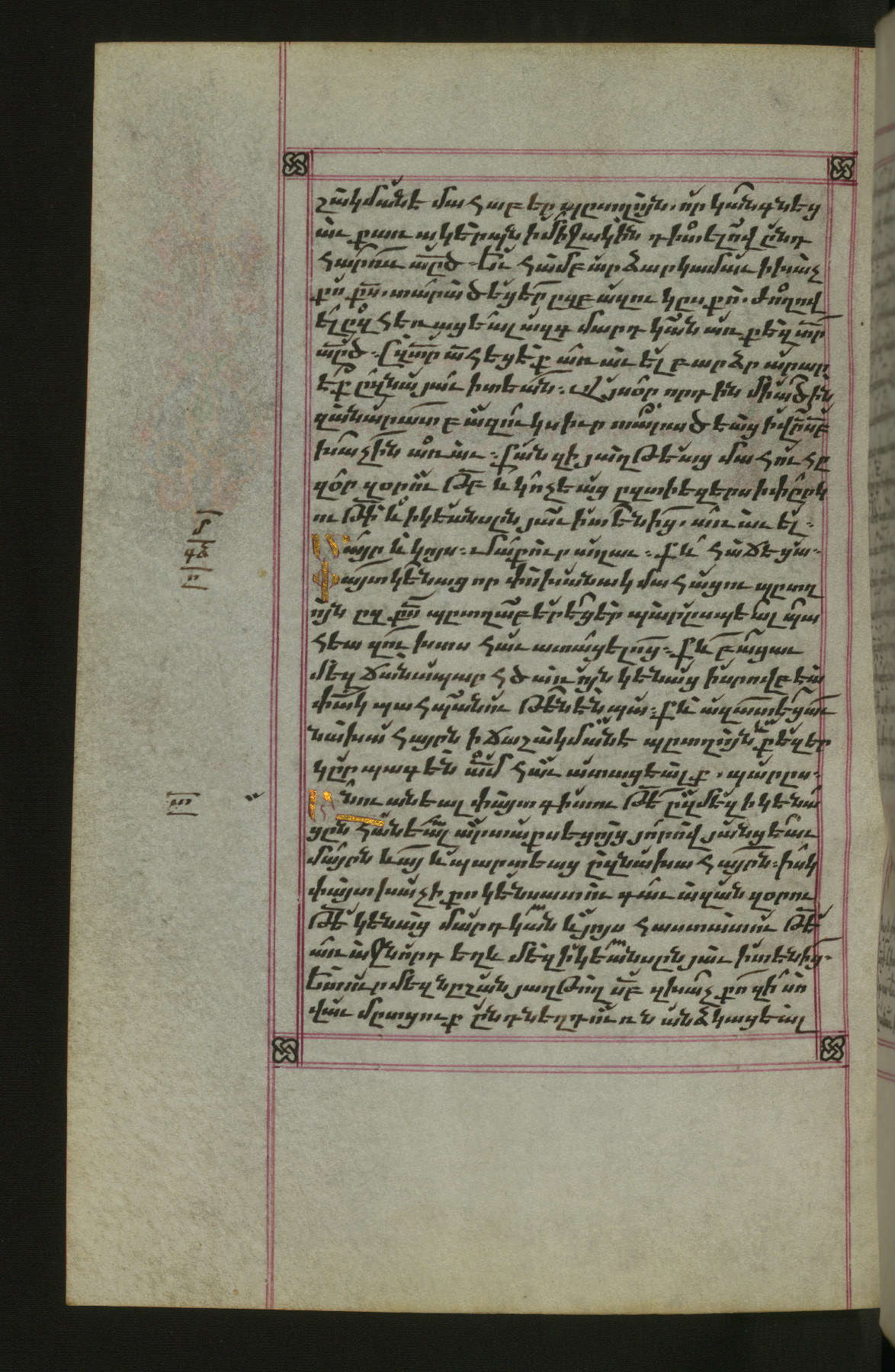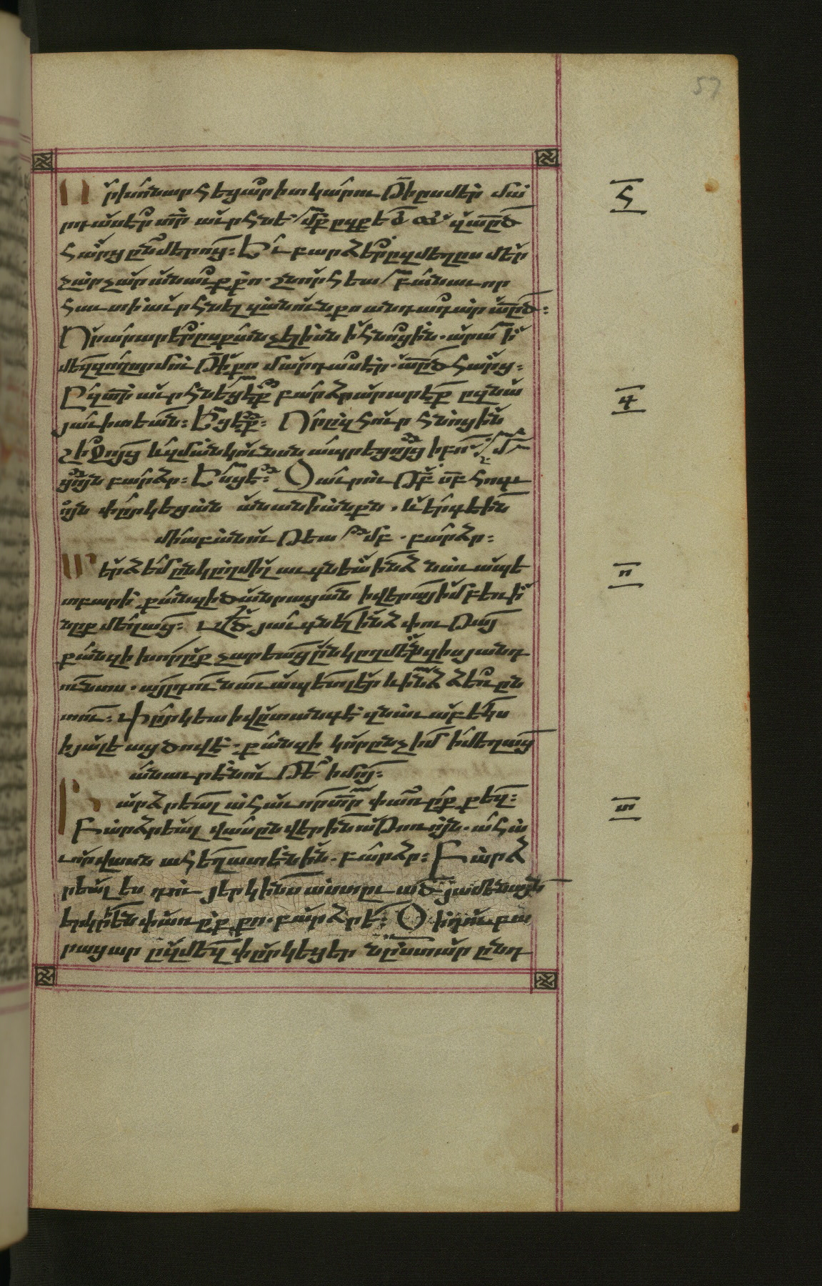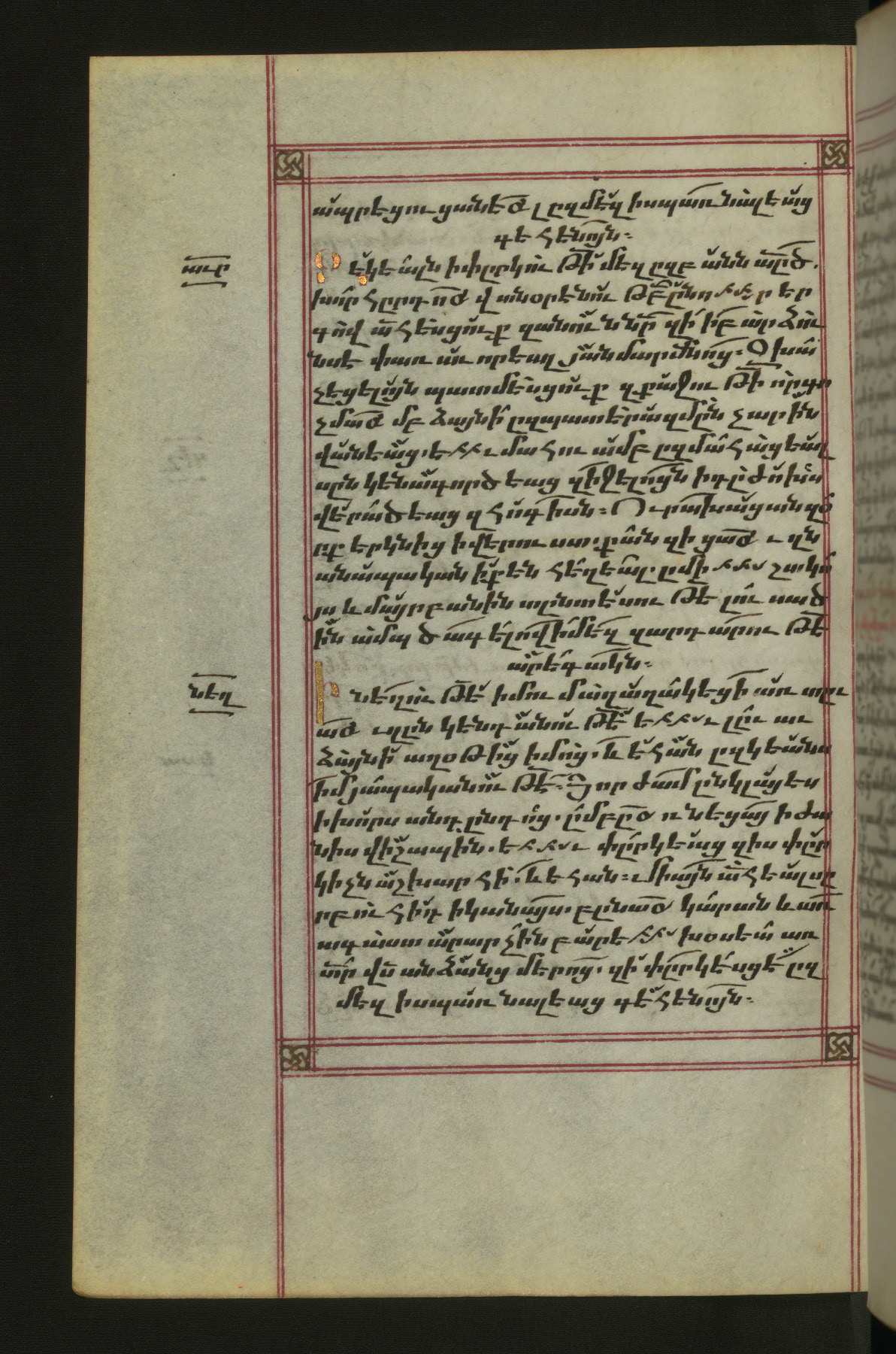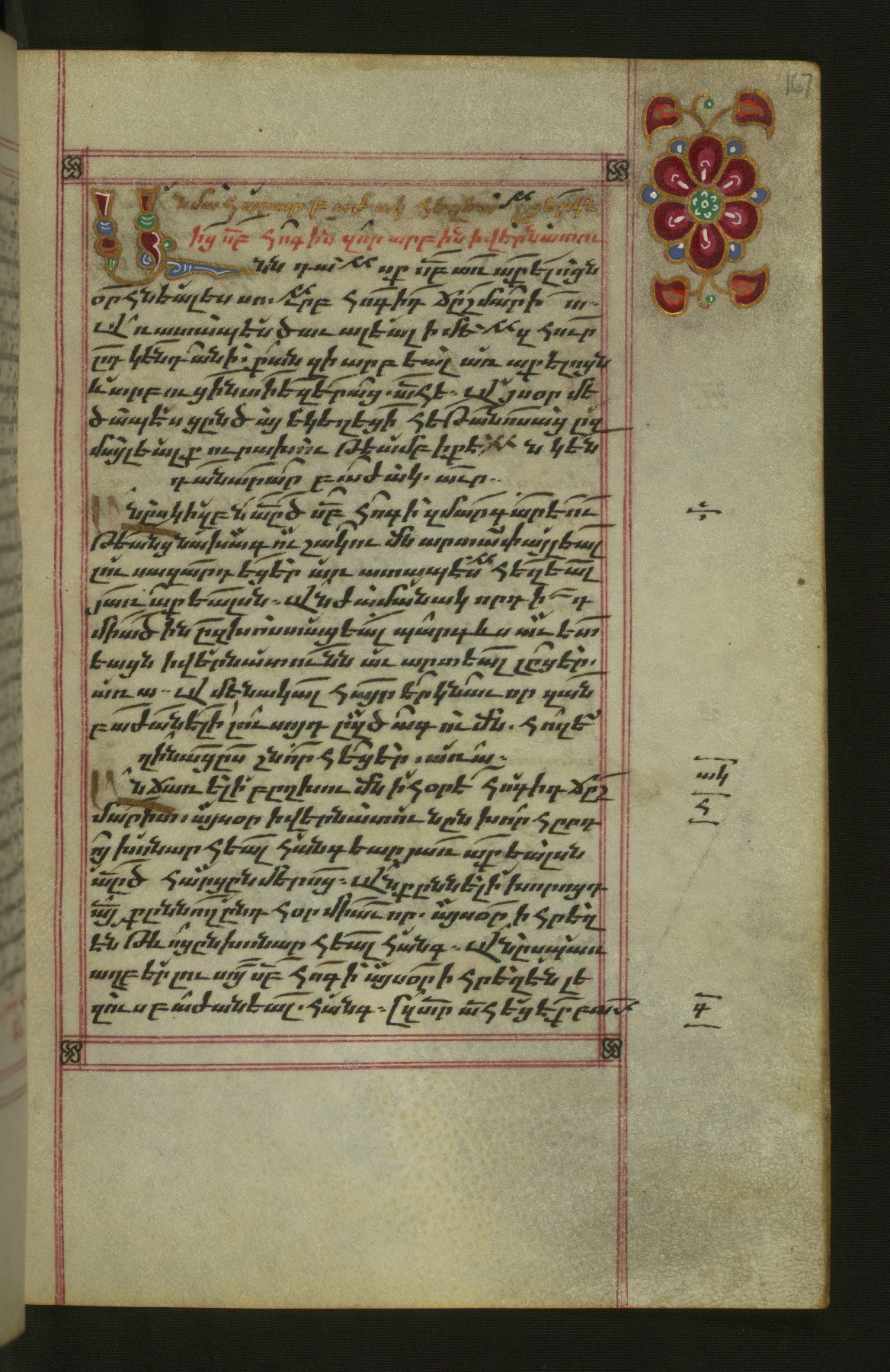 This hymnal was completed in Constantinople on August 15, 1678 [AE 1127], by the priest Yakob Pēligratc‘i, having been commissioned by Člav, son of Nawasard, as a dedication to his sons, Astuacatur and Sahak. The structure of the hymns adheres approximately to the standard Armenian hymnal (Շաբակնոց), with minor variations in order and a few substitutions (see Sanjian in the bibliography). The book is illuminated extensively, with thirty-eight full- and half-page polychrome miniatures against gold backgrounds, eight decorated head-pieces marking the principal divisions of the hymnal, and numerous marginal miniatures marking individual hymns, including biblical figures, saints, bishops, and vignettes. The style of the miniatures is largely in imitation of western European models, though more traditional Armenian and Byzantine influences stand out, such as the vibrant color palette, an iconic frontality for depictions of saints and bishops, and the highly abstracted floral motifs and zoomorphic incipits marking hymn divisions.