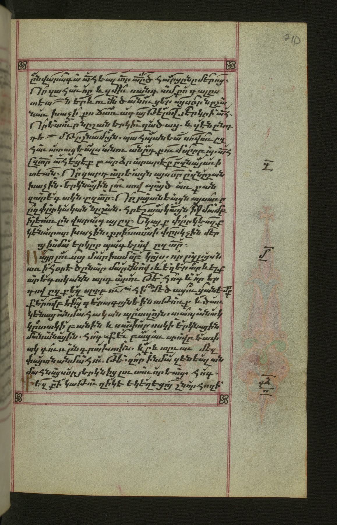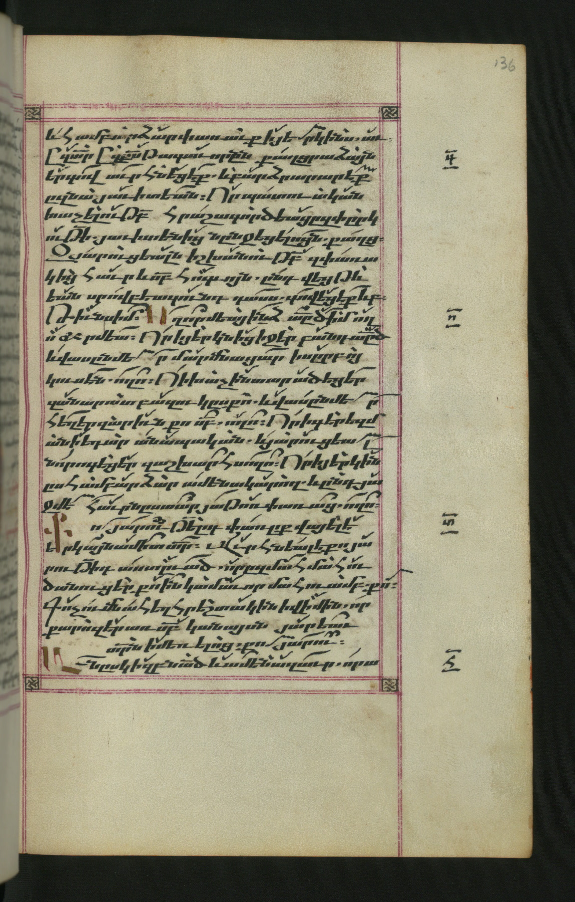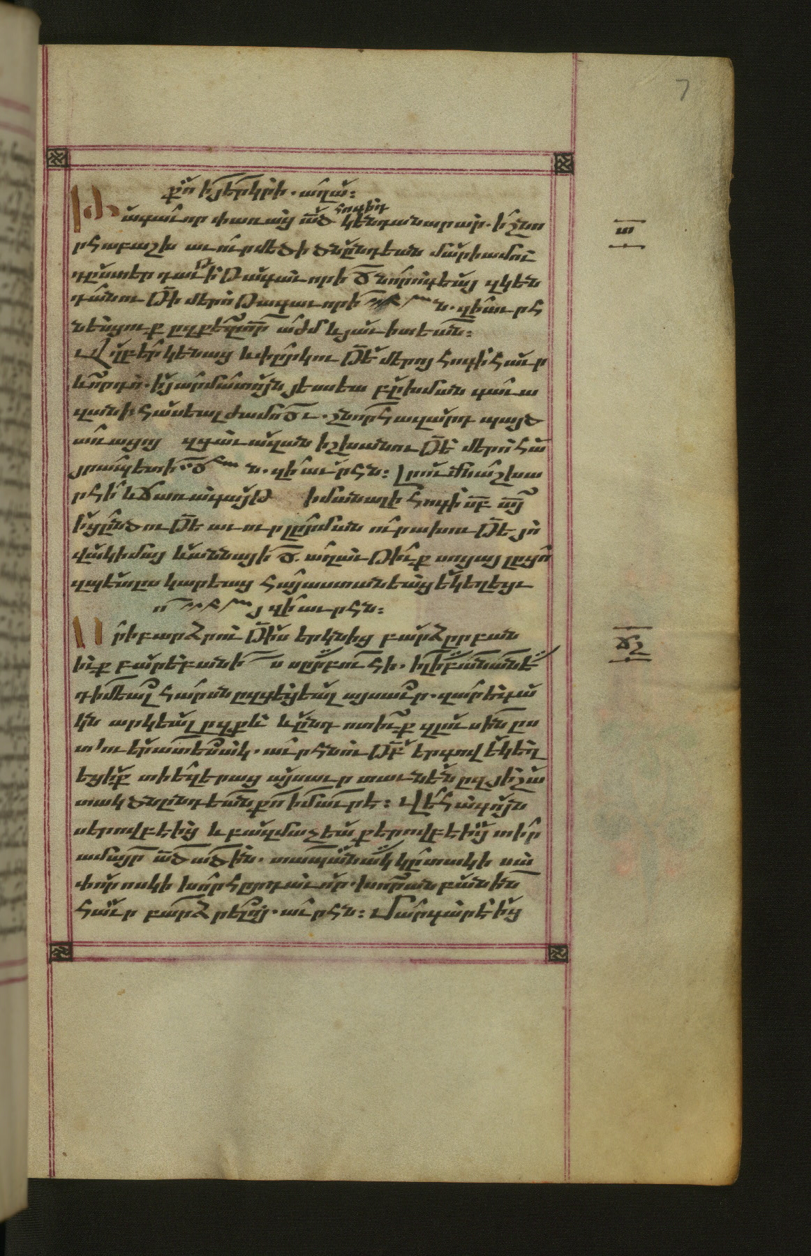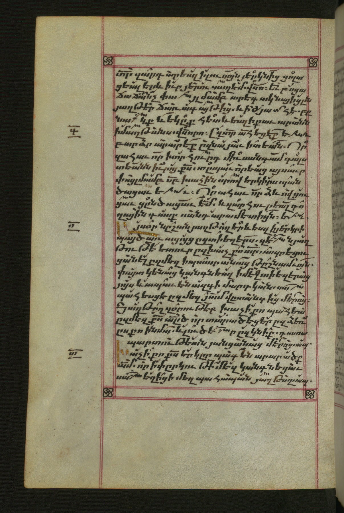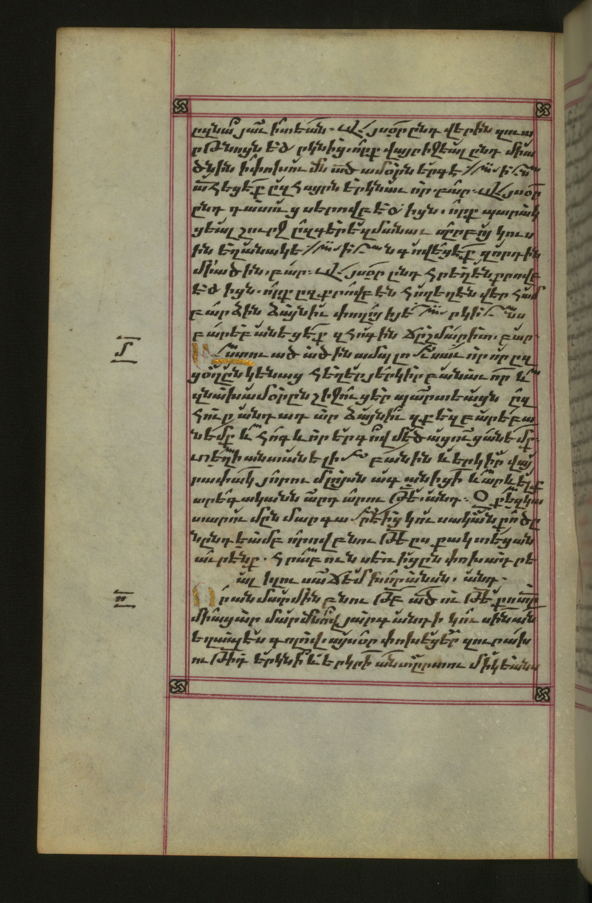 This hymnal was completed in Constantinople on August 15, 1678 [AE 1127], by the priest Yakob Pēligratc‘i, having been commissioned by Člav, son of Nawasard, as a dedication to his sons, Astuacatur and Sahak. The structure of the hymns adheres approximately to the standard Armenian hymnal (Շաբակնոց), with minor variations in order and a few substitutions (see Sanjian in the bibliography). The book is illuminated extensively, with thirty-eight full- and half-page polychrome miniatures against gold backgrounds, eight decorated head-pieces marking the principal divisions of the hymnal, and numerous marginal miniatures marking individual hymns, including biblical figures, saints, bishops, and vignettes. The style of the miniatures is largely in imitation of western European models, though more traditional Armenian and Byzantine influences stand out, such as the vibrant color palette, an iconic frontality for depictions of saints and bishops, and the highly abstracted floral motifs and zoomorphic incipits marking hymn divisions.