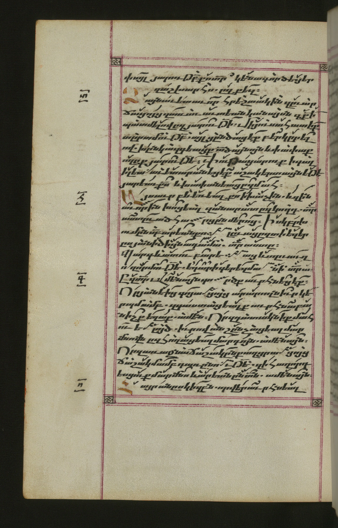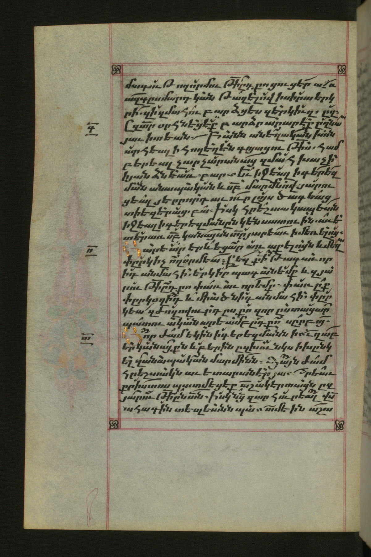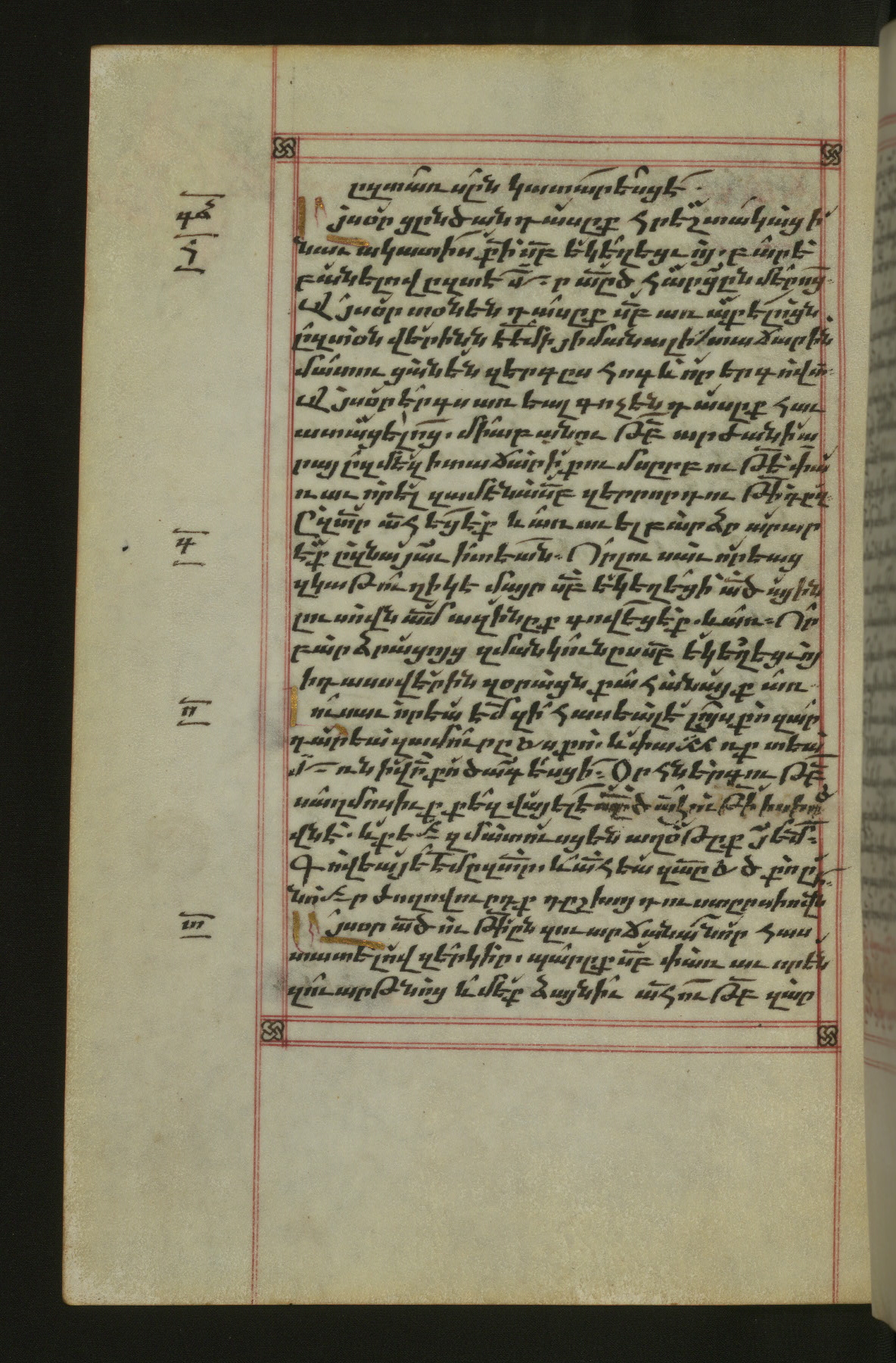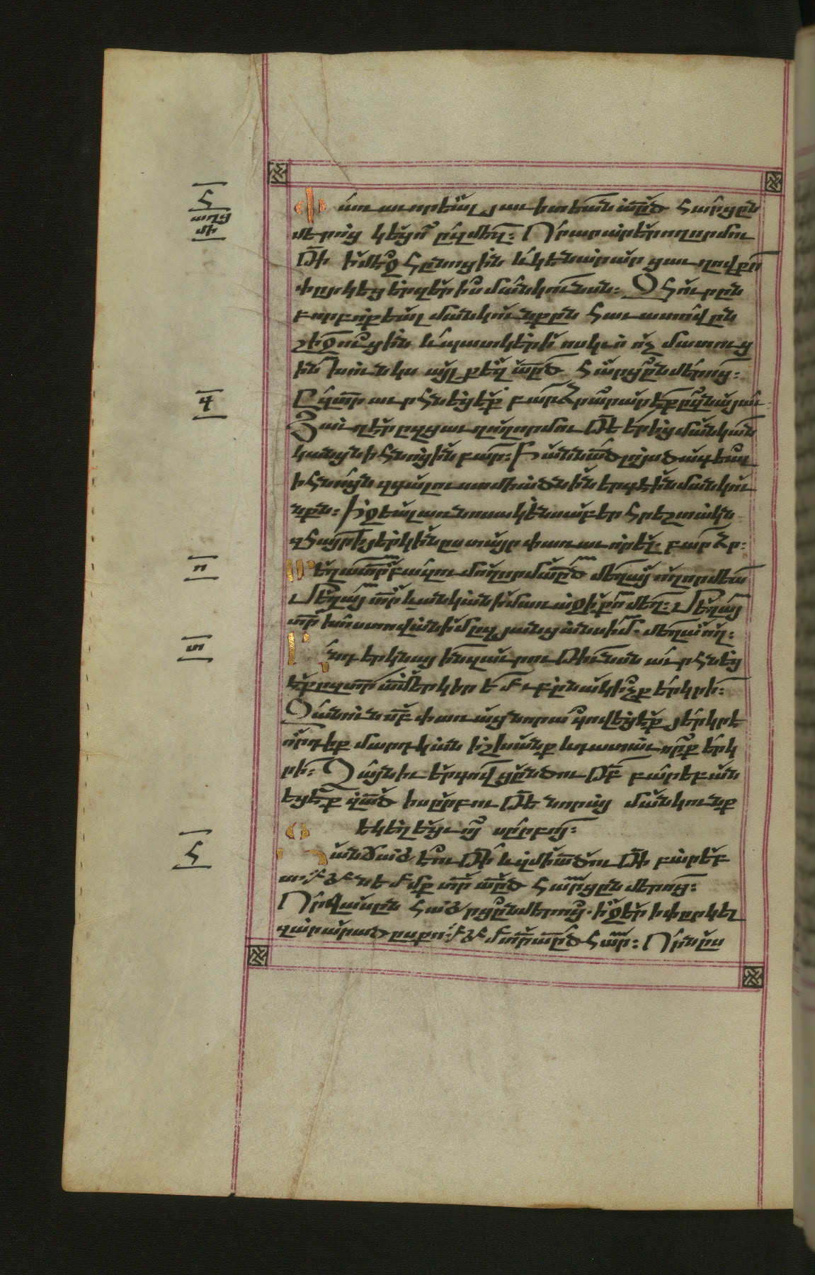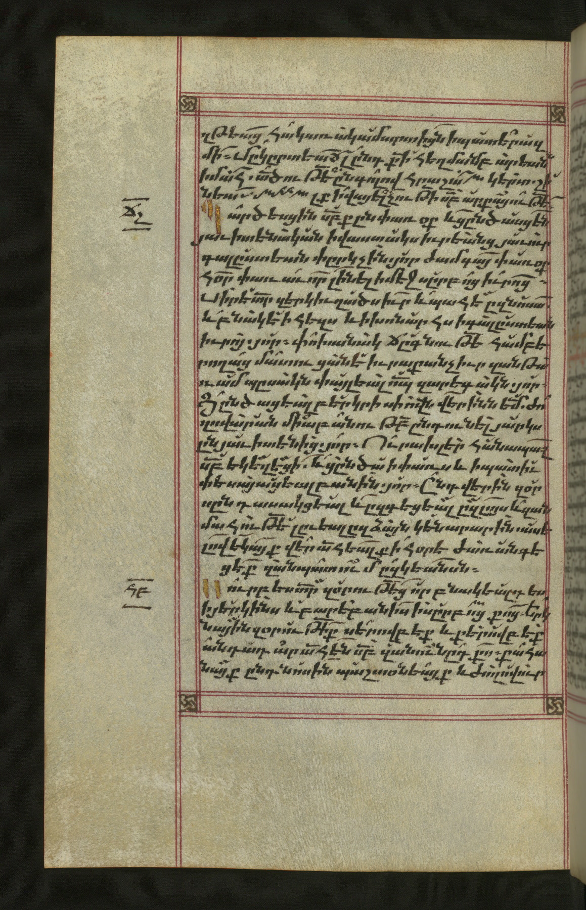 This hymnal was completed in Constantinople on August 15, 1678 [AE 1127], by the priest Yakob Pēligratc‘i, having been commissioned by Člav, son of Nawasard, as a dedication to his sons, Astuacatur and Sahak. The structure of the hymns adheres approximately to the standard Armenian hymnal (Շաբակնոց), with minor variations in order and a few substitutions (see Sanjian in the bibliography). The book is illuminated extensively, with thirty-eight full- and half-page polychrome miniatures against gold backgrounds, eight decorated head-pieces marking the principal divisions of the hymnal, and numerous marginal miniatures marking individual hymns, including biblical figures, saints, bishops, and vignettes. The style of the miniatures is largely in imitation of western European models, though more traditional Armenian and Byzantine influences stand out, such as the vibrant color palette, an iconic frontality for depictions of saints and bishops, and the highly abstracted floral motifs and zoomorphic incipits marking hymn divisions.