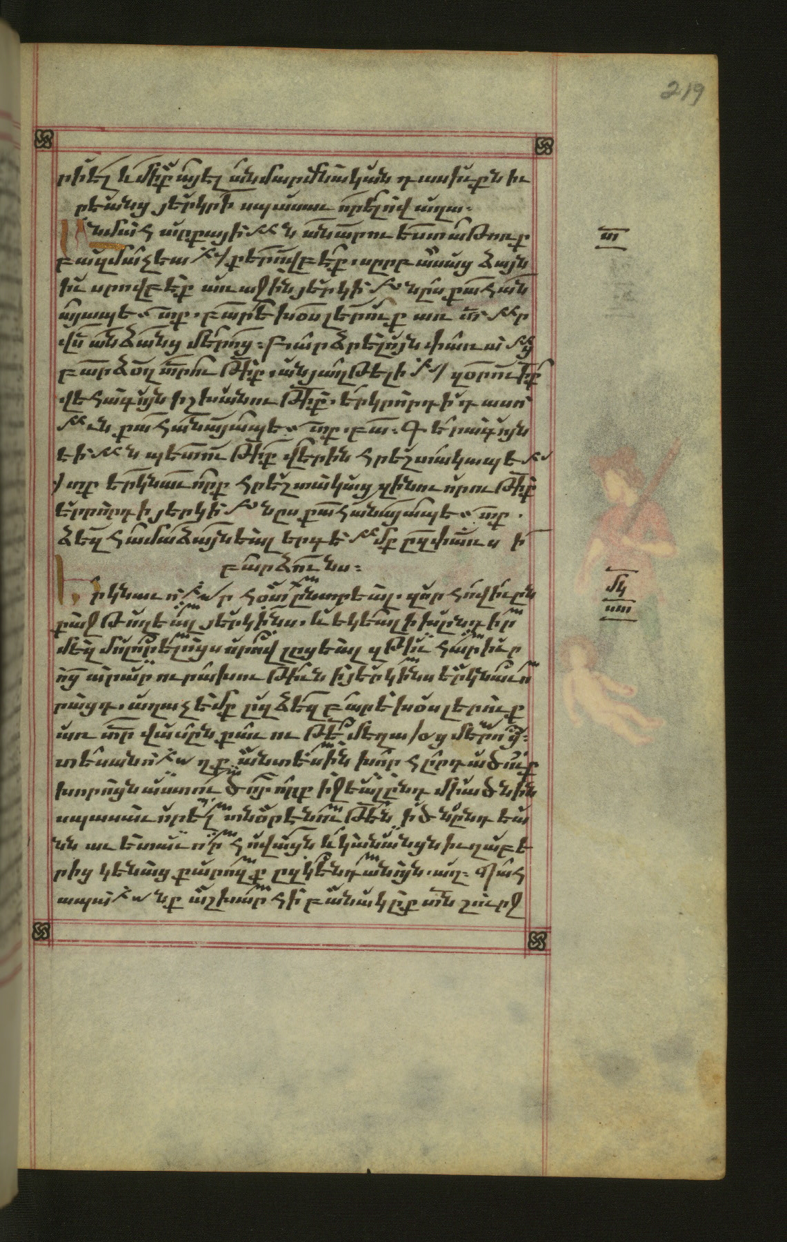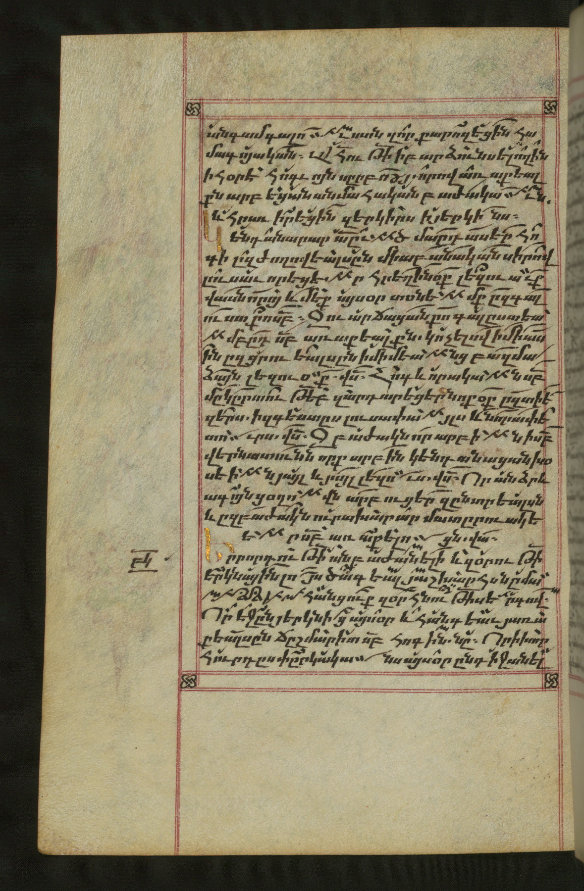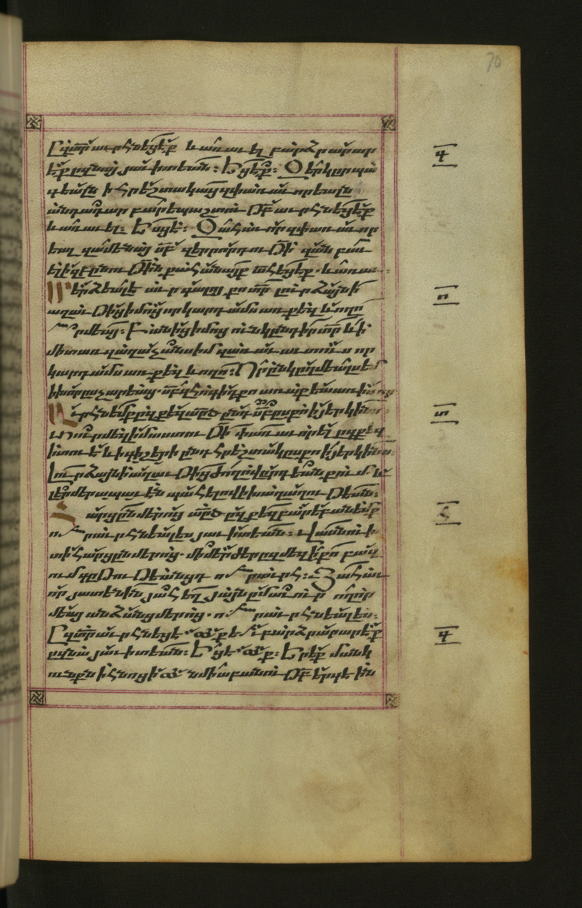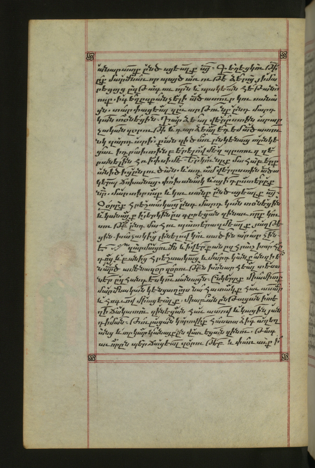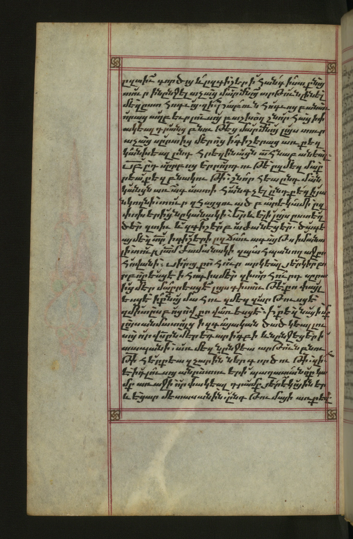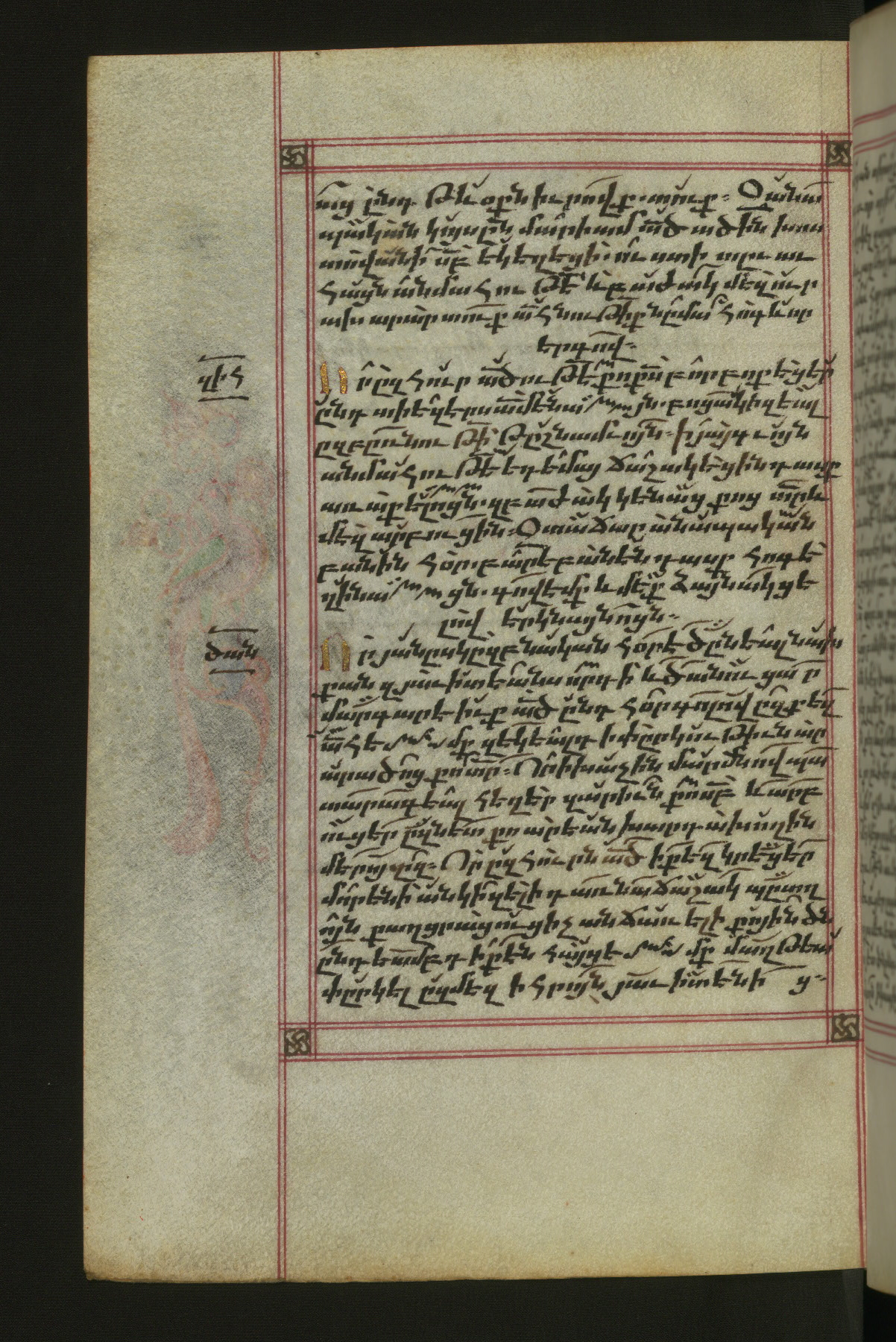 This hymnal was completed in Constantinople on August 15, 1678 [AE 1127], by the priest Yakob Pēligratc‘i, having been commissioned by Člav, son of Nawasard, as a dedication to his sons, Astuacatur and Sahak. The structure of the hymns adheres approximately to the standard Armenian hymnal (Շաբակնոց), with minor variations in order and a few substitutions (see Sanjian in the bibliography). The book is illuminated extensively, with thirty-eight full- and half-page polychrome miniatures against gold backgrounds, eight decorated head-pieces marking the principal divisions of the hymnal, and numerous marginal miniatures marking individual hymns, including biblical figures, saints, bishops, and vignettes. The style of the miniatures is largely in imitation of western European models, though more traditional Armenian and Byzantine influences stand out, such as the vibrant color palette, an iconic frontality for depictions of saints and bishops, and the highly abstracted floral motifs and zoomorphic incipits marking hymn divisions.
