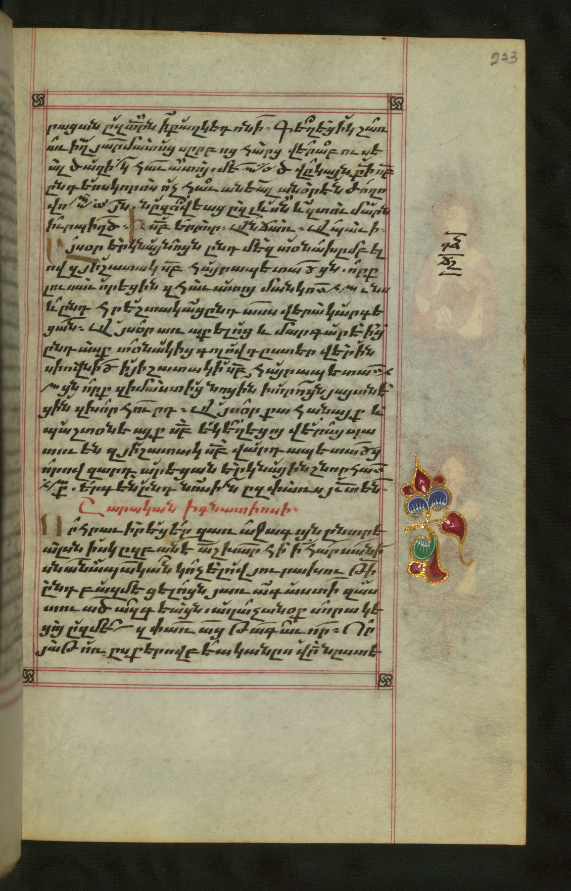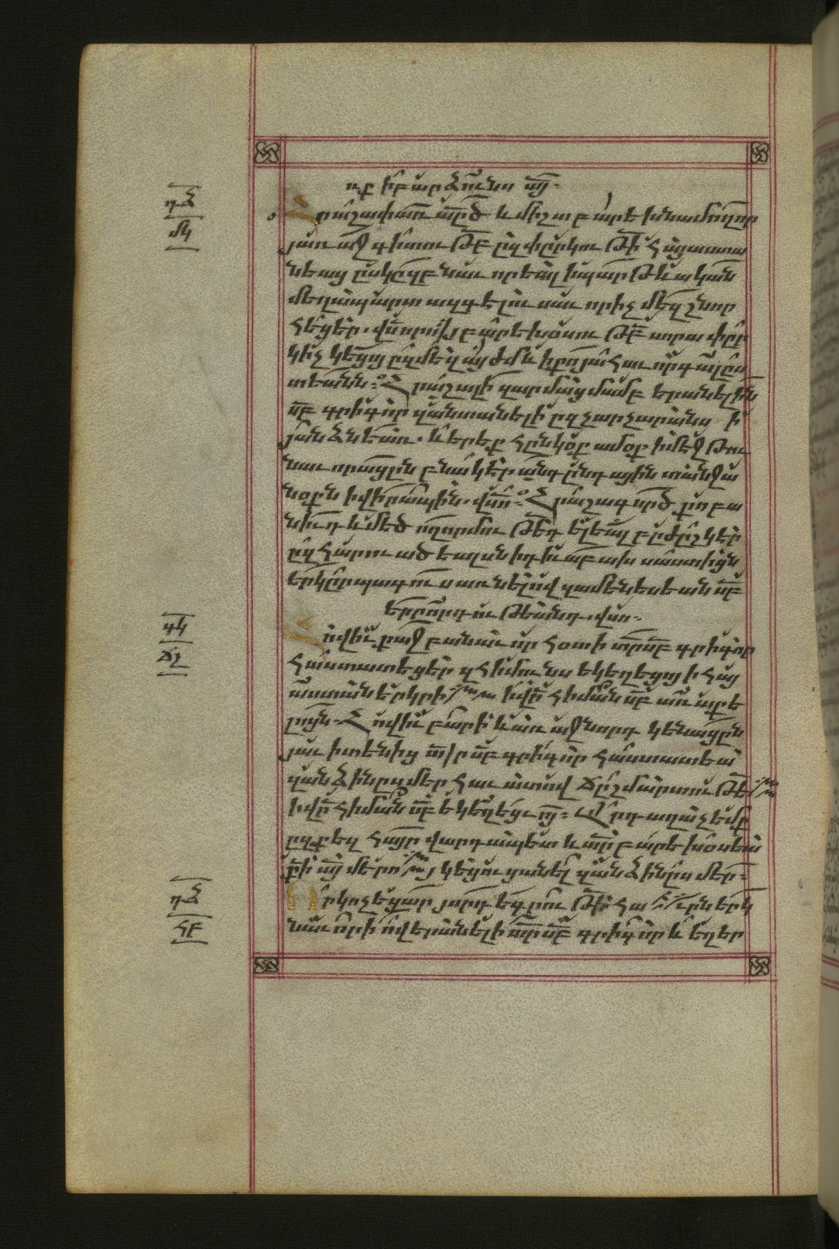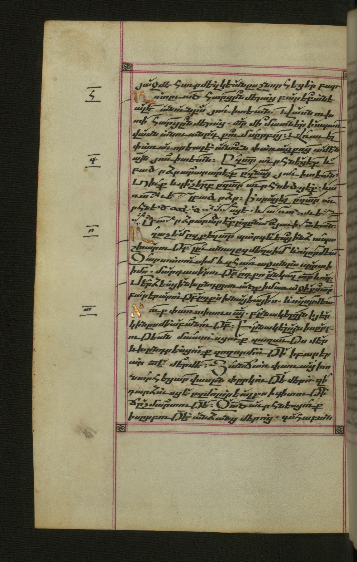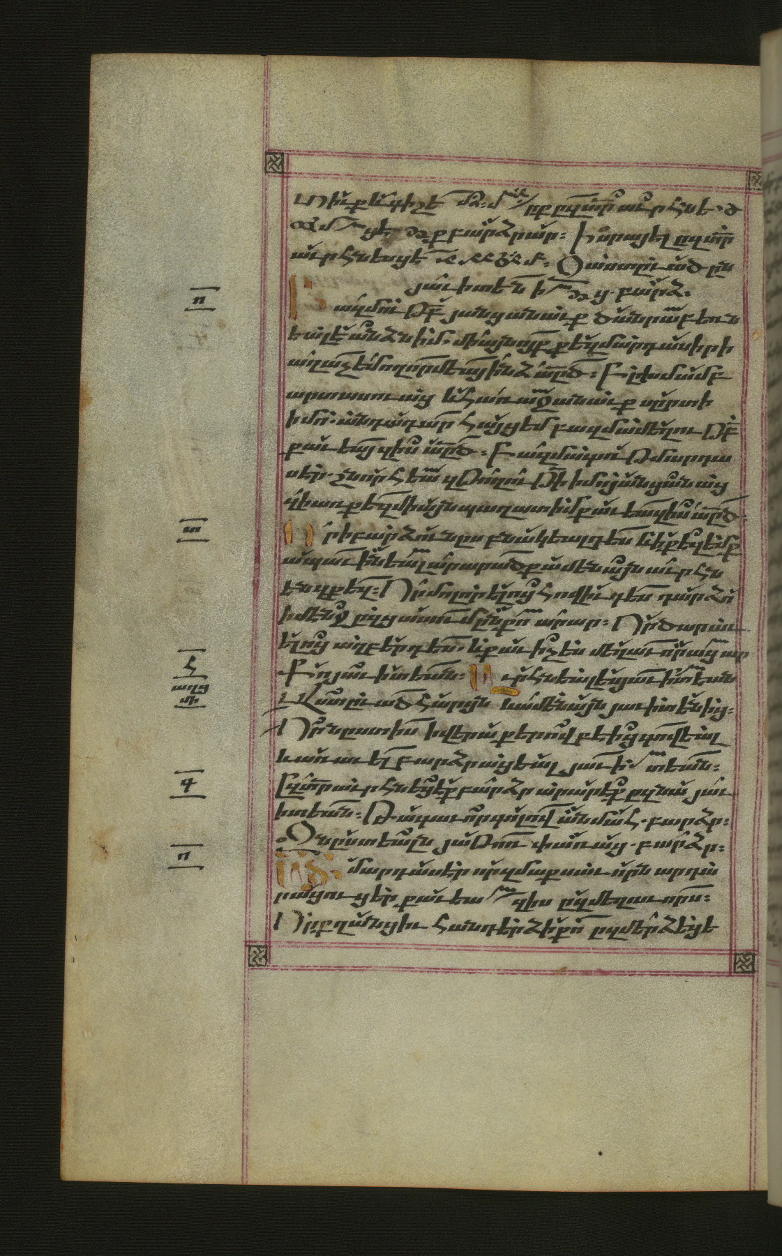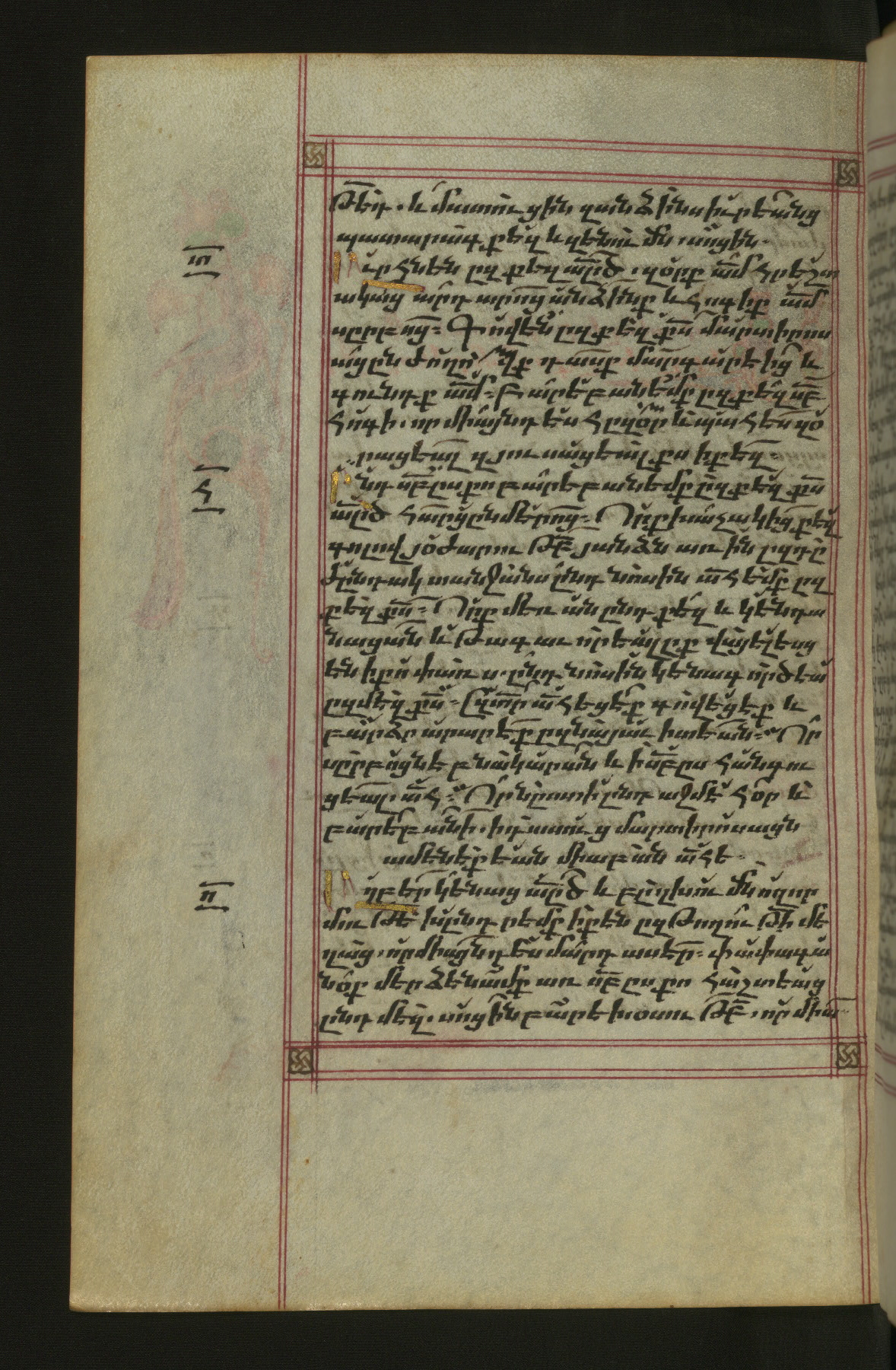This hymnal was completed in Constantinople on August 15, 1678 [AE 1127], by the priest Yakob Pēligratc‘i, having been commissioned by Člav, son of Nawasard, as a dedication to his sons, Astuacatur and Sahak. The structure of the hymns adheres approximately to the standard Armenian hymnal (Շաբակնոց), with minor variations in order and a few substitutions (see Sanjian in the bibliography). The book is illuminated extensively, with thirty-eight full- and half-page polychrome miniatures against gold backgrounds, eight decorated head-pieces marking the principal divisions of the hymnal, and numerous marginal miniatures marking individual hymns, including biblical figures, saints, bishops, and vignettes. The style of the miniatures is largely in imitation of western European models, though more traditional Armenian and Byzantine influences stand out, such as the vibrant color palette, an iconic frontality for depictions of saints and bishops, and the highly abstracted floral motifs and zoomorphic incipits marking hymn divisions.