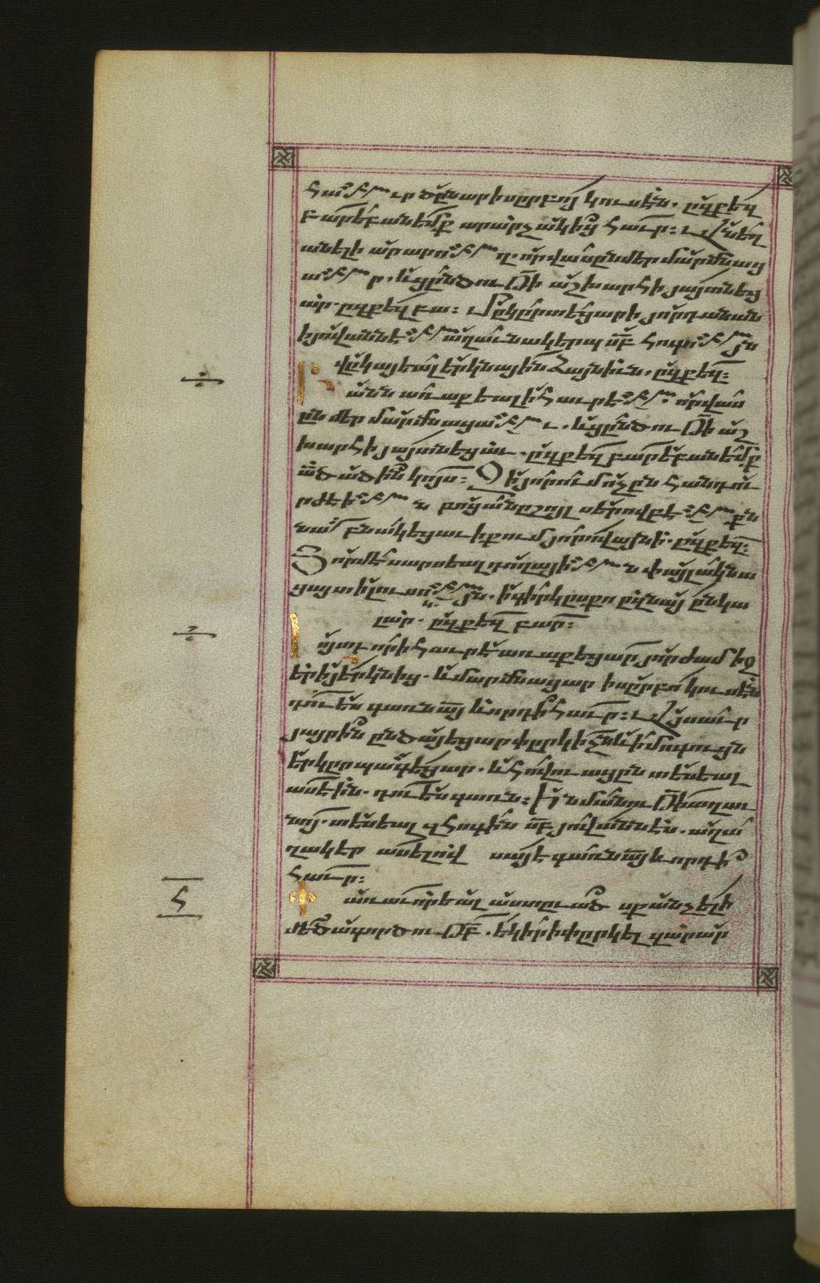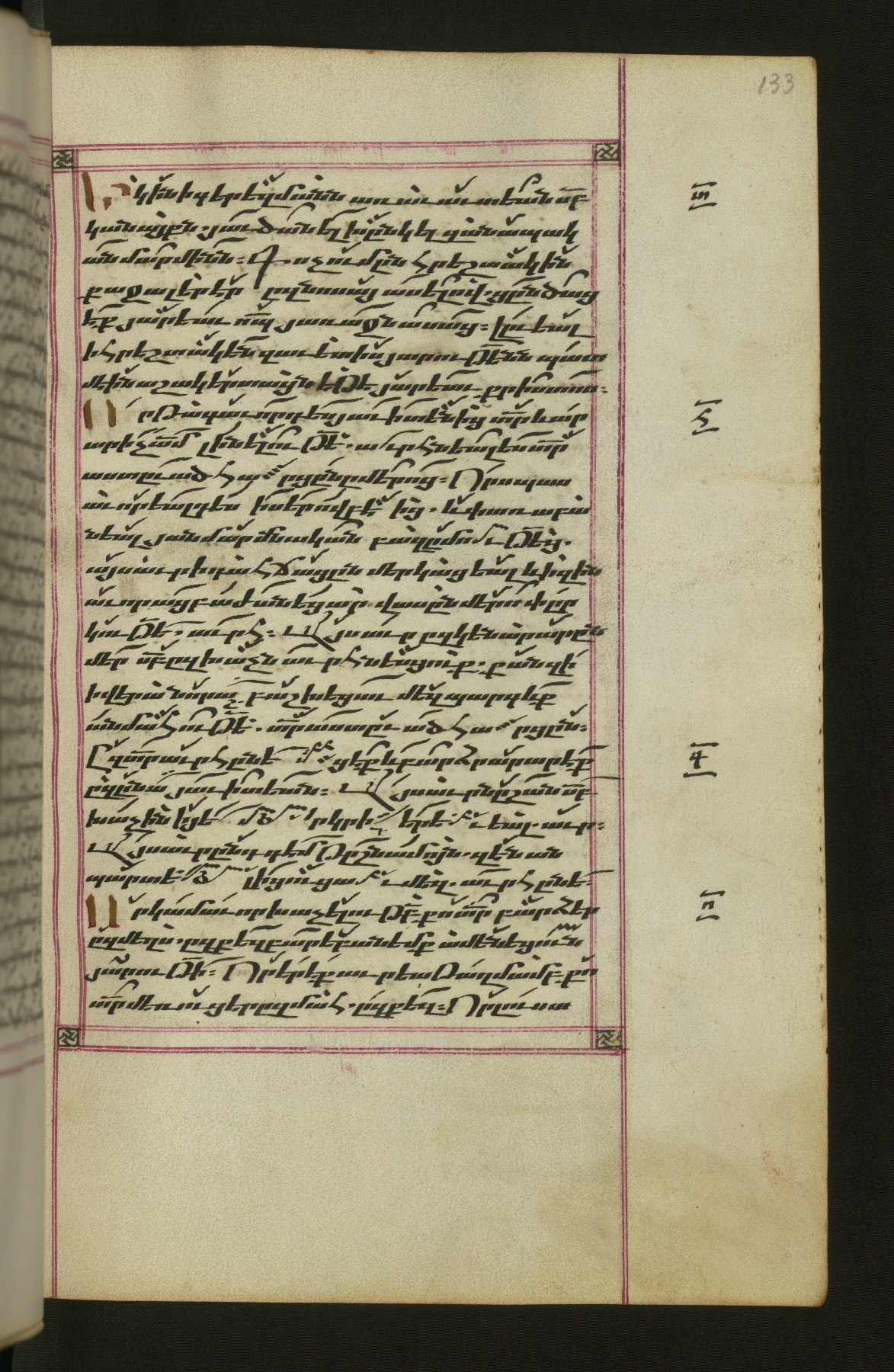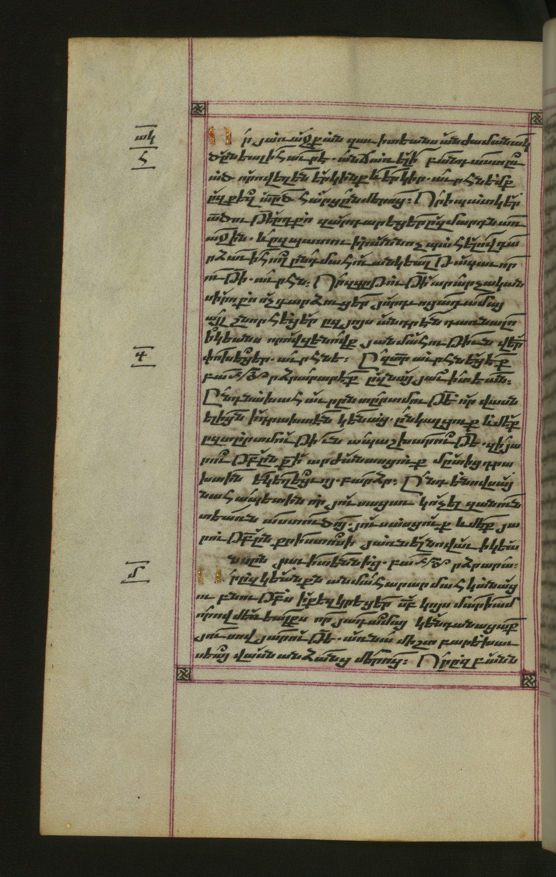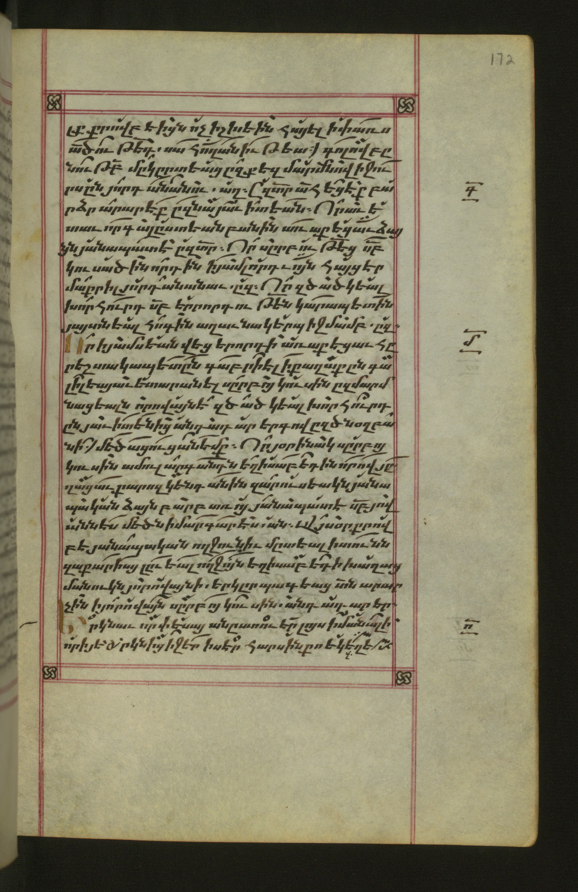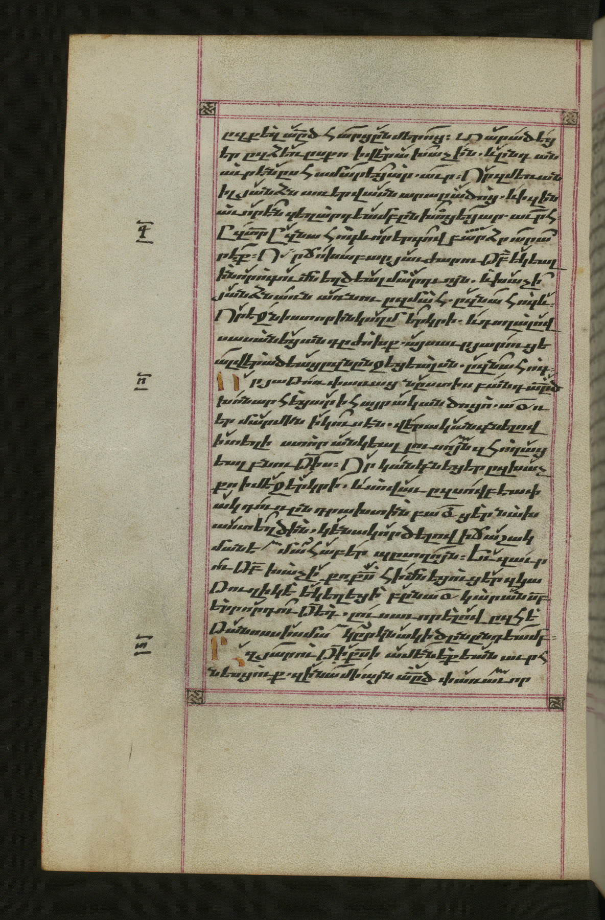 This hymnal was completed in Constantinople on August 15, 1678 [AE 1127], by the priest Yakob Pēligratc‘i, having been commissioned by Člav, son of Nawasard, as a dedication to his sons, Astuacatur and Sahak. The structure of the hymns adheres approximately to the standard Armenian hymnal (Շաբակնոց), with minor variations in order and a few substitutions (see Sanjian in the bibliography). The book is illuminated extensively, with thirty-eight full- and half-page polychrome miniatures against gold backgrounds, eight decorated head-pieces marking the principal divisions of the hymnal, and numerous marginal miniatures marking individual hymns, including biblical figures, saints, bishops, and vignettes. The style of the miniatures is largely in imitation of western European models, though more traditional Armenian and Byzantine influences stand out, such as the vibrant color palette, an iconic frontality for depictions of saints and bishops, and the highly abstracted floral motifs and zoomorphic incipits marking hymn divisions.