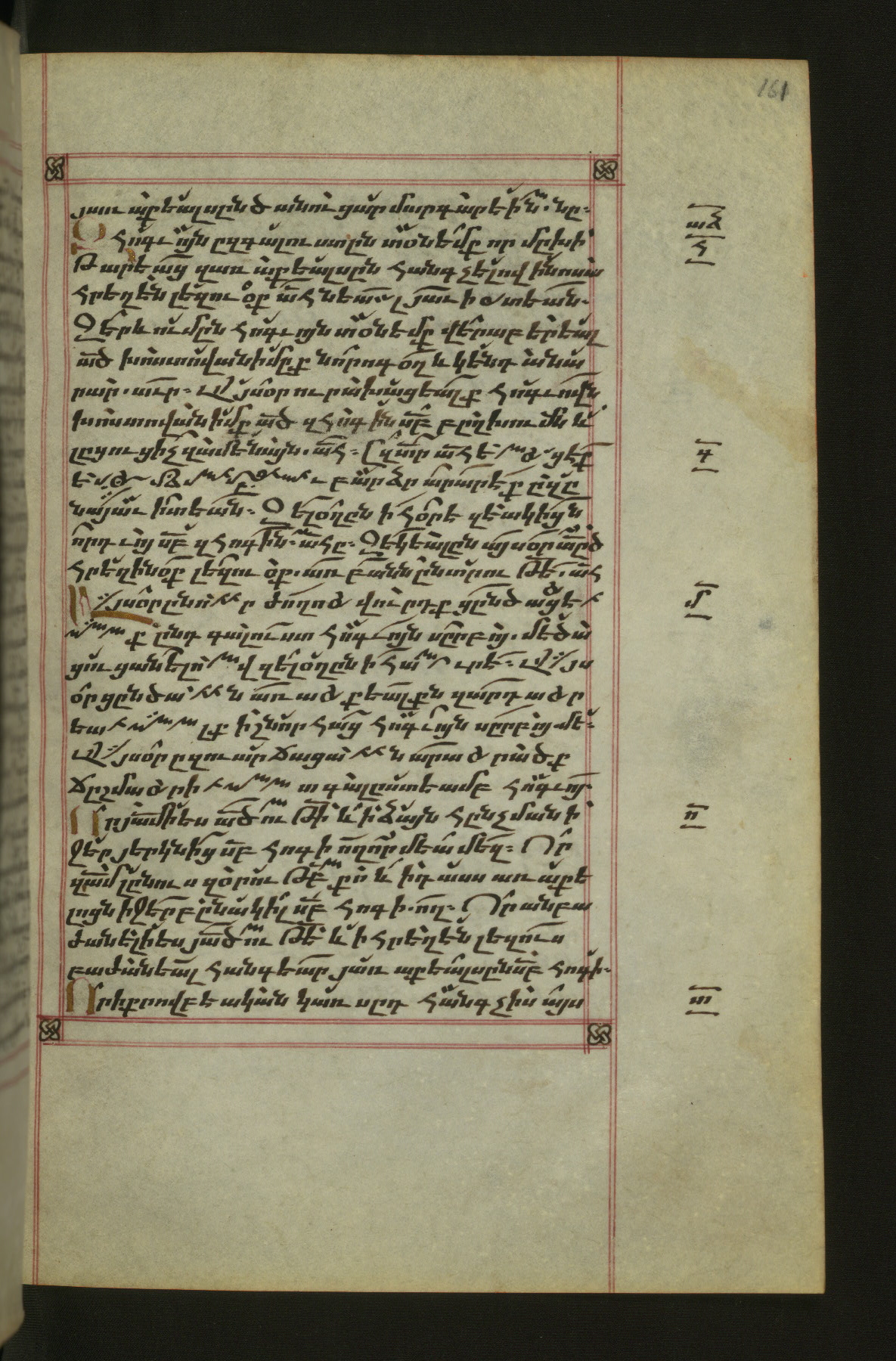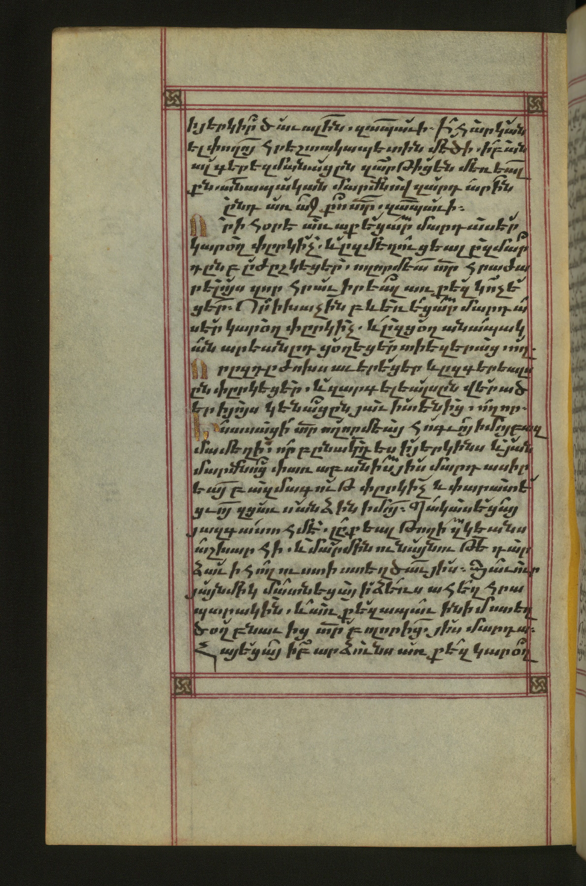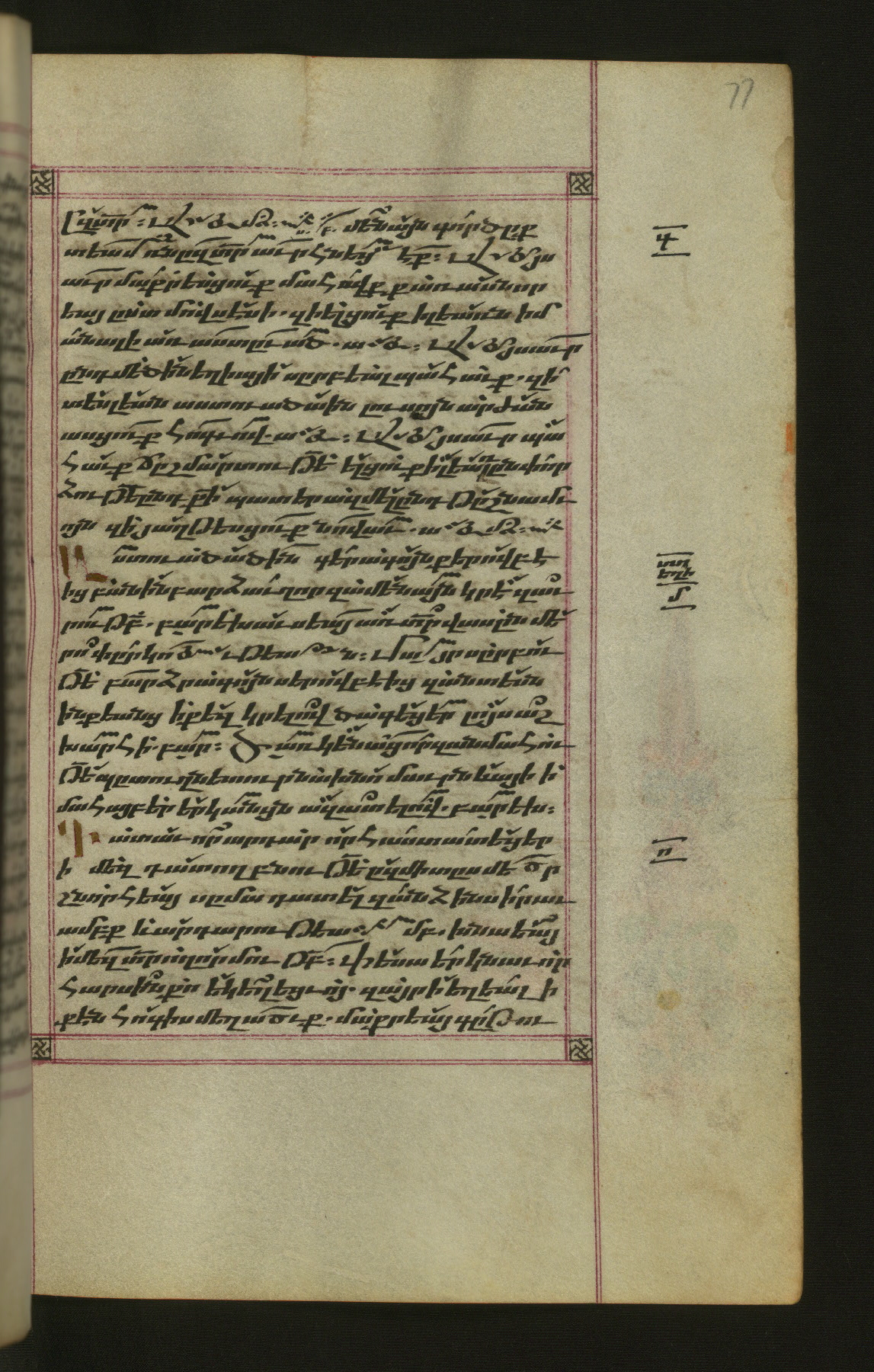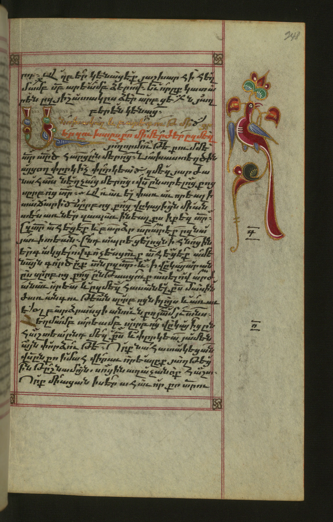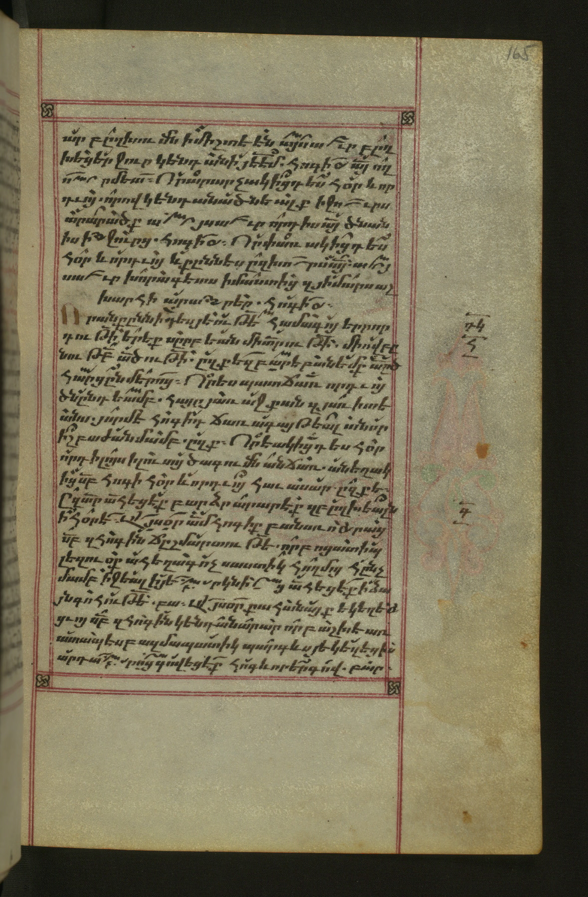 This hymnal was completed in Constantinople on August 15, 1678 [AE 1127], by the priest Yakob Pēligratc‘i, having been commissioned by Člav, son of Nawasard, as a dedication to his sons, Astuacatur and Sahak. The structure of the hymns adheres approximately to the standard Armenian hymnal (Շաբակնոց), with minor variations in order and a few substitutions (see Sanjian in the bibliography). The book is illuminated extensively, with thirty-eight full- and half-page polychrome miniatures against gold backgrounds, eight decorated head-pieces marking the principal divisions of the hymnal, and numerous marginal miniatures marking individual hymns, including biblical figures, saints, bishops, and vignettes. The style of the miniatures is largely in imitation of western European models, though more traditional Armenian and Byzantine influences stand out, such as the vibrant color palette, an iconic frontality for depictions of saints and bishops, and the highly abstracted floral motifs and zoomorphic incipits marking hymn divisions.