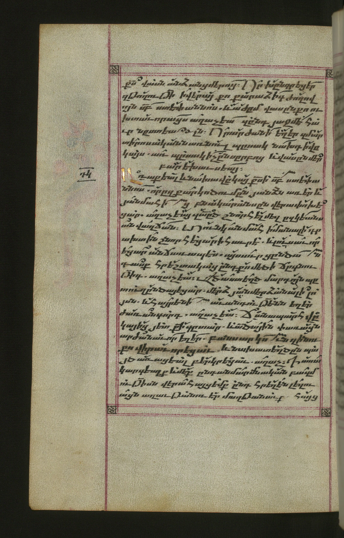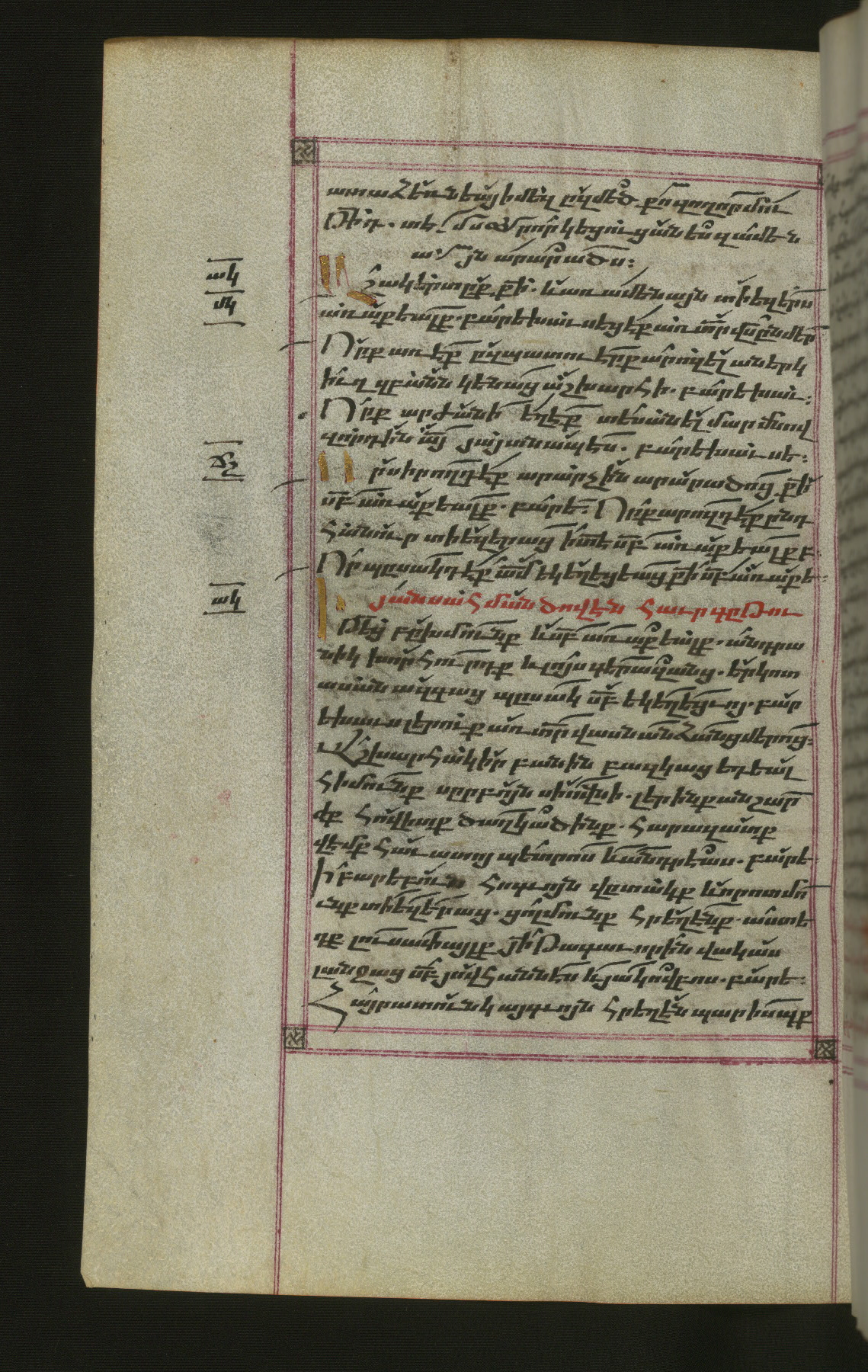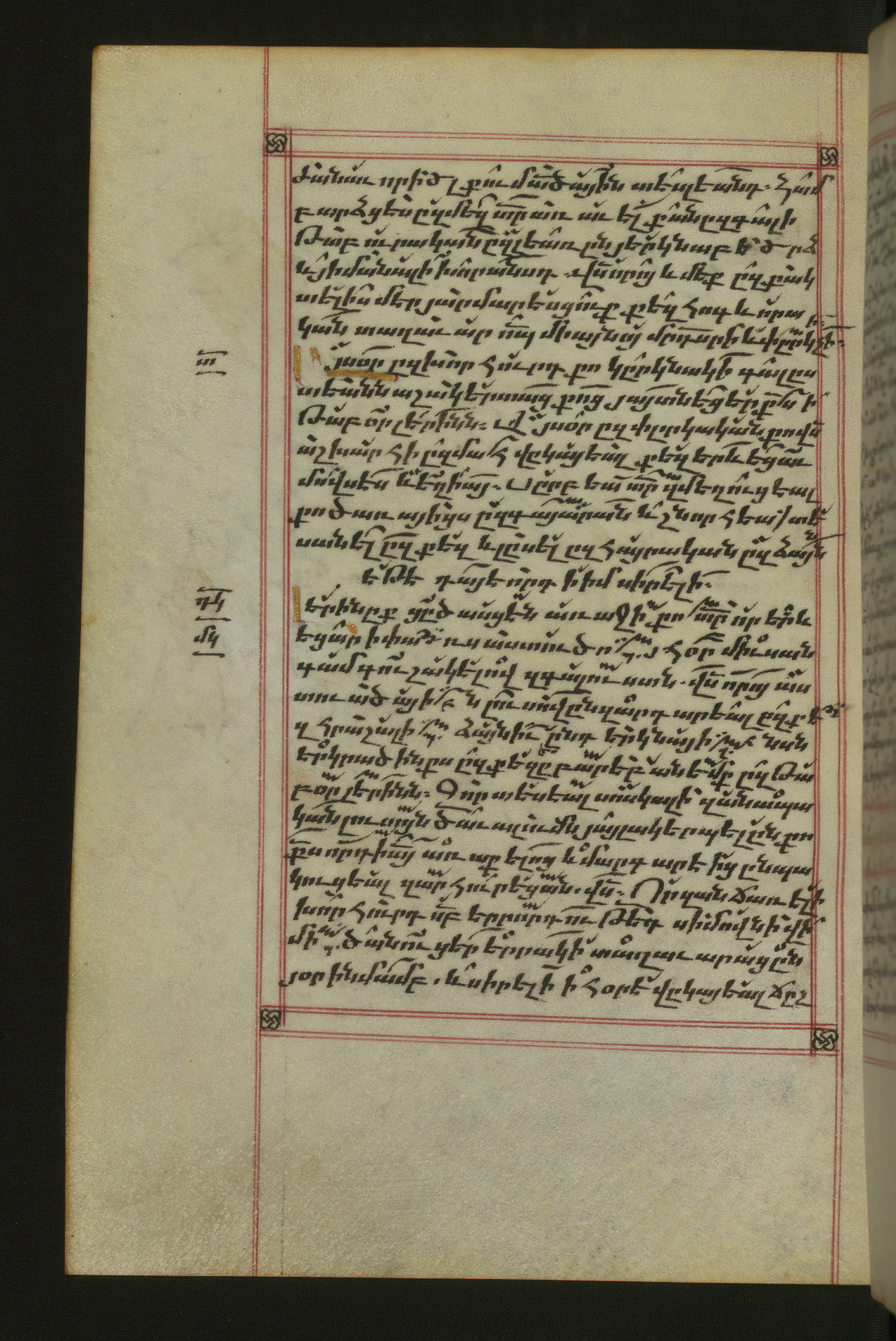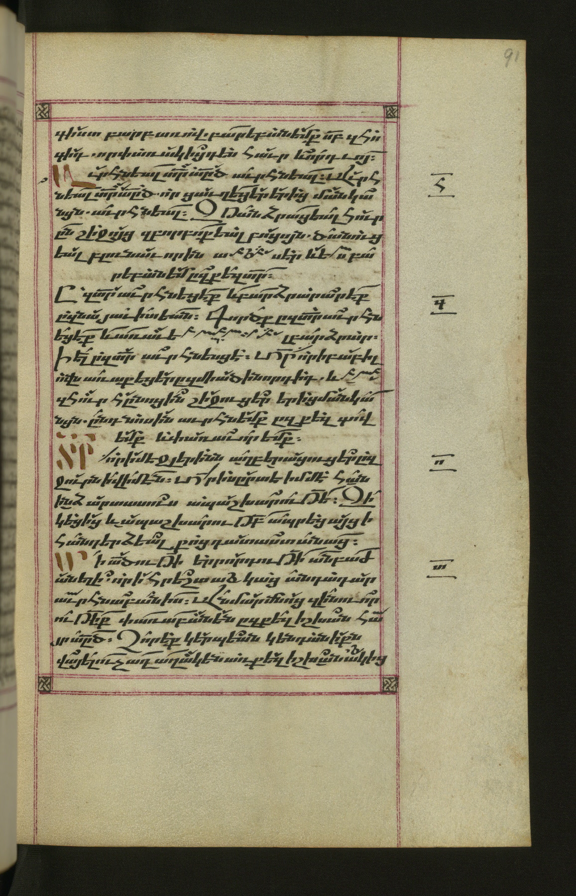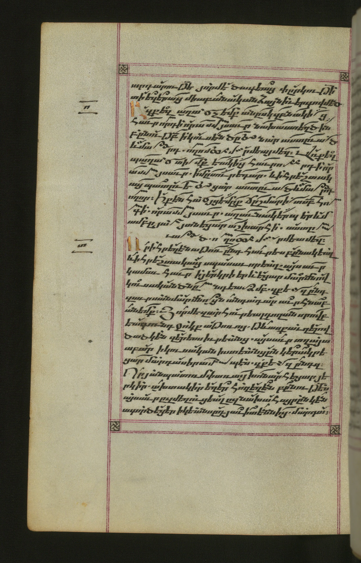 This hymnal was completed in Constantinople on August 15, 1678 [AE 1127], by the priest Yakob Pēligratc‘i, having been commissioned by Člav, son of Nawasard, as a dedication to his sons, Astuacatur and Sahak. The structure of the hymns adheres approximately to the standard Armenian hymnal (Շաբակնոց), with minor variations in order and a few substitutions (see Sanjian in the bibliography). The book is illuminated extensively, with thirty-eight full- and half-page polychrome miniatures against gold backgrounds, eight decorated head-pieces marking the principal divisions of the hymnal, and numerous marginal miniatures marking individual hymns, including biblical figures, saints, bishops, and vignettes. The style of the miniatures is largely in imitation of western European models, though more traditional Armenian and Byzantine influences stand out, such as the vibrant color palette, an iconic frontality for depictions of saints and bishops, and the highly abstracted floral motifs and zoomorphic incipits marking hymn divisions.