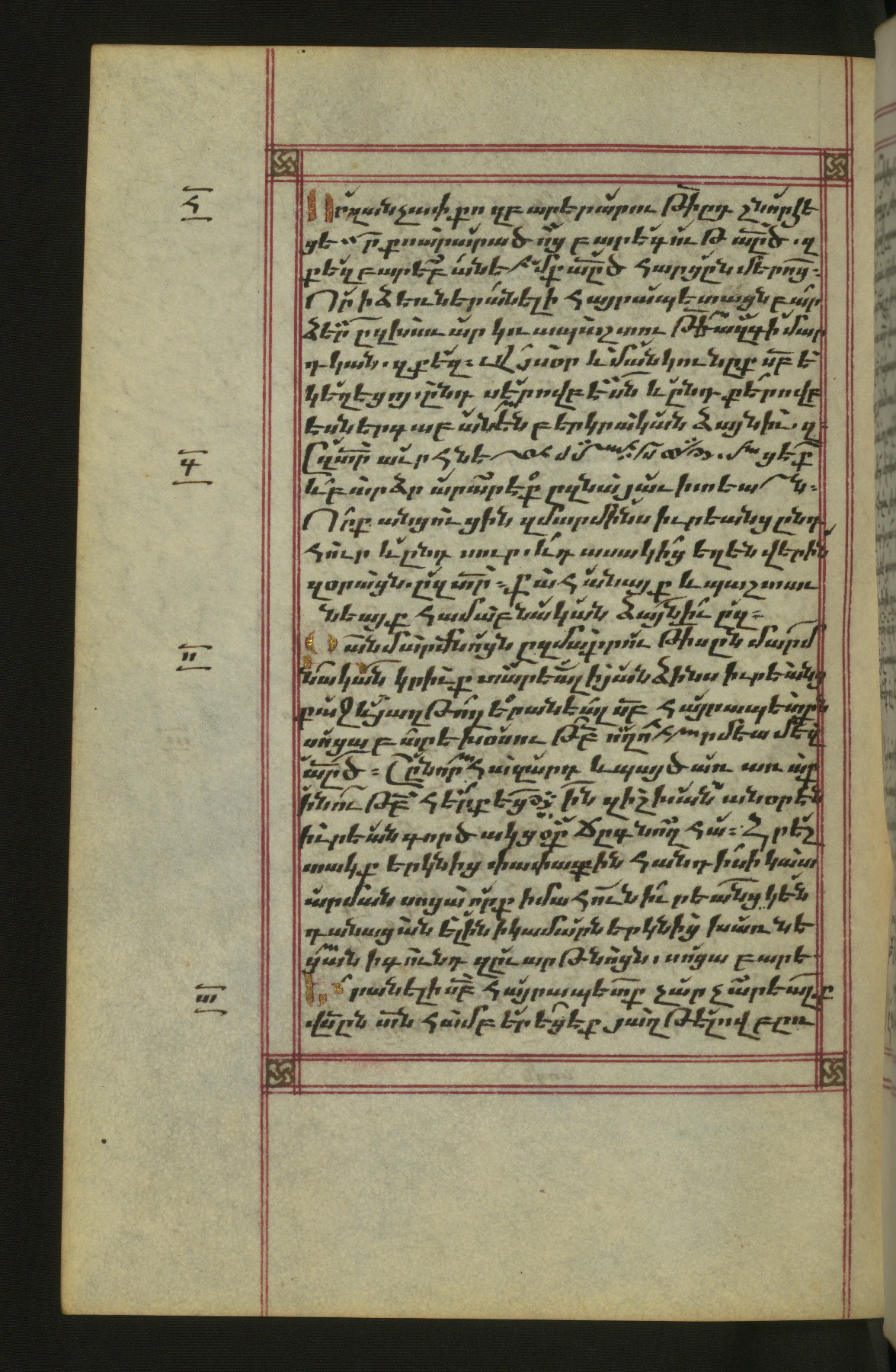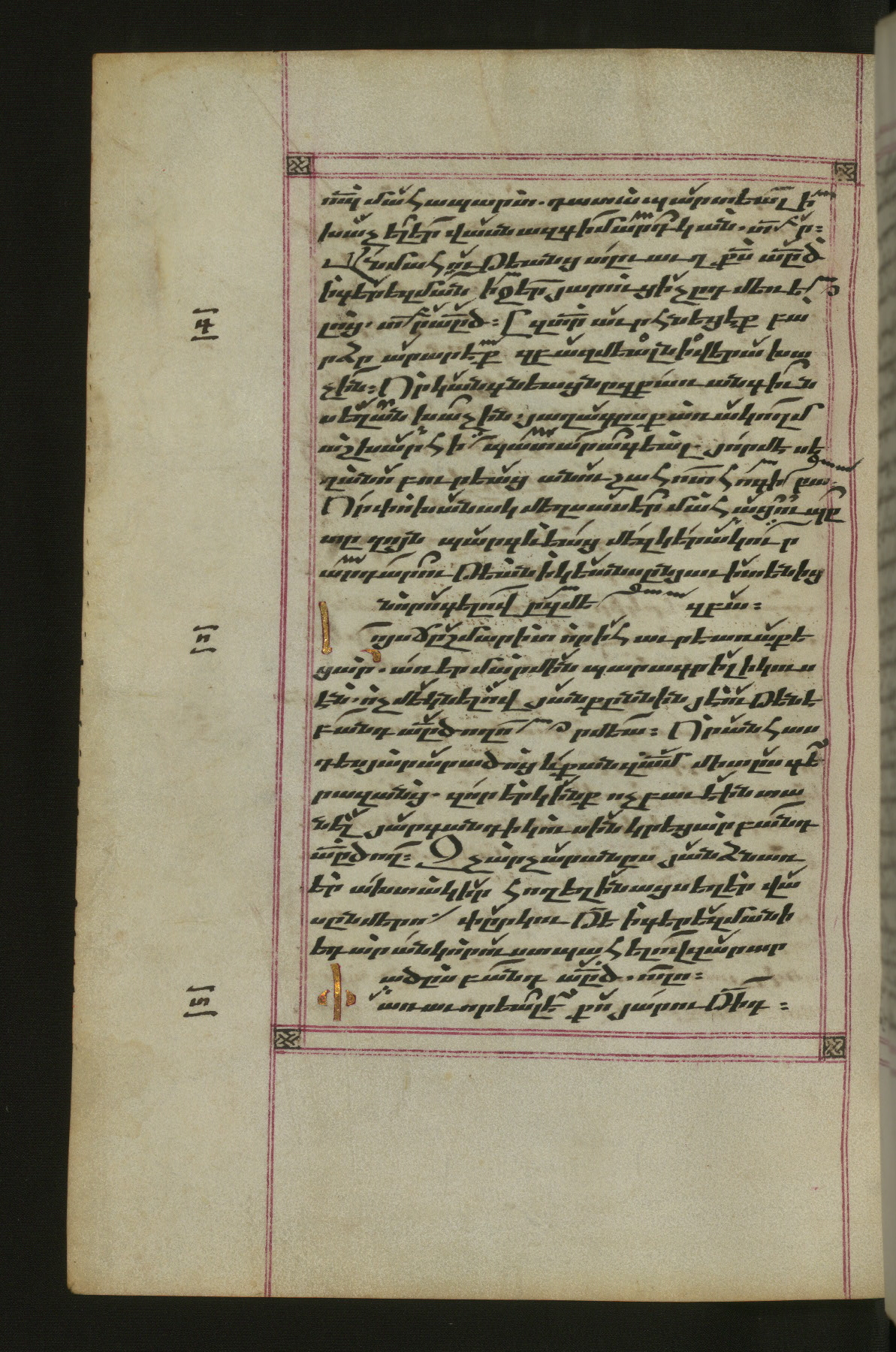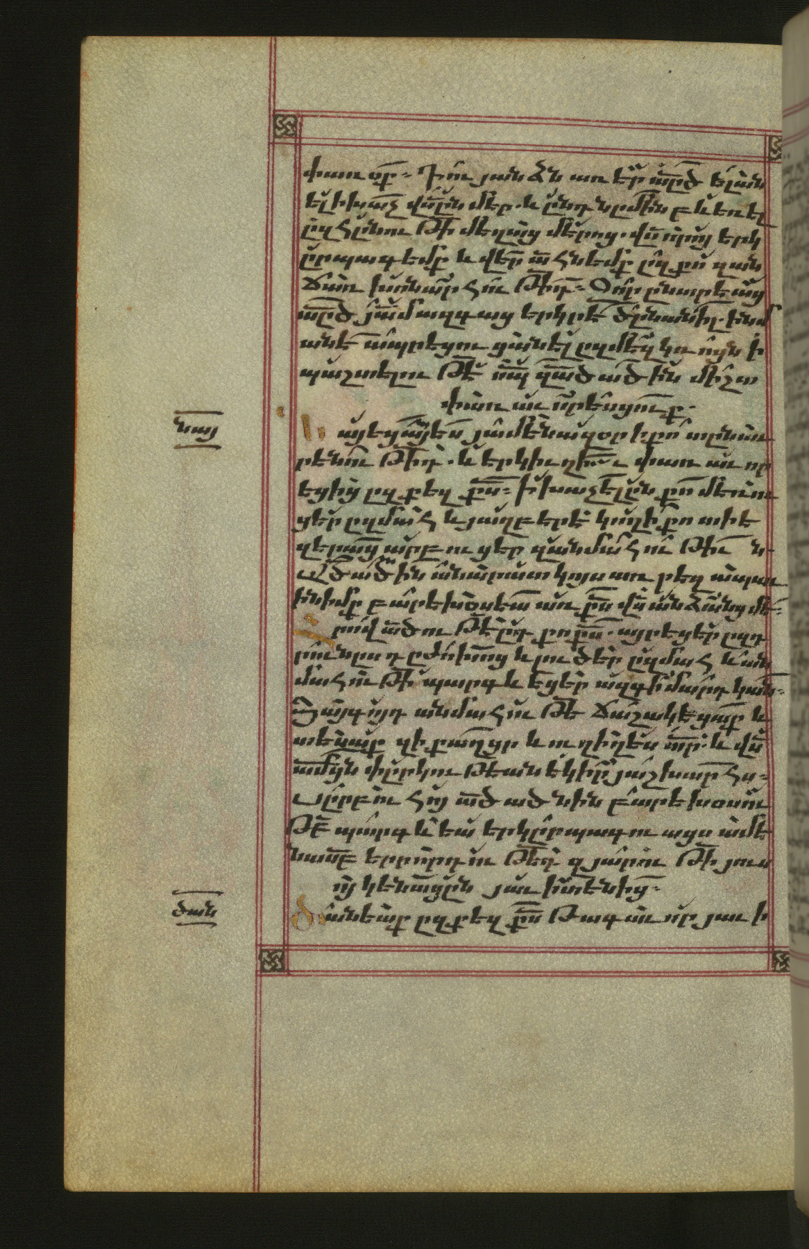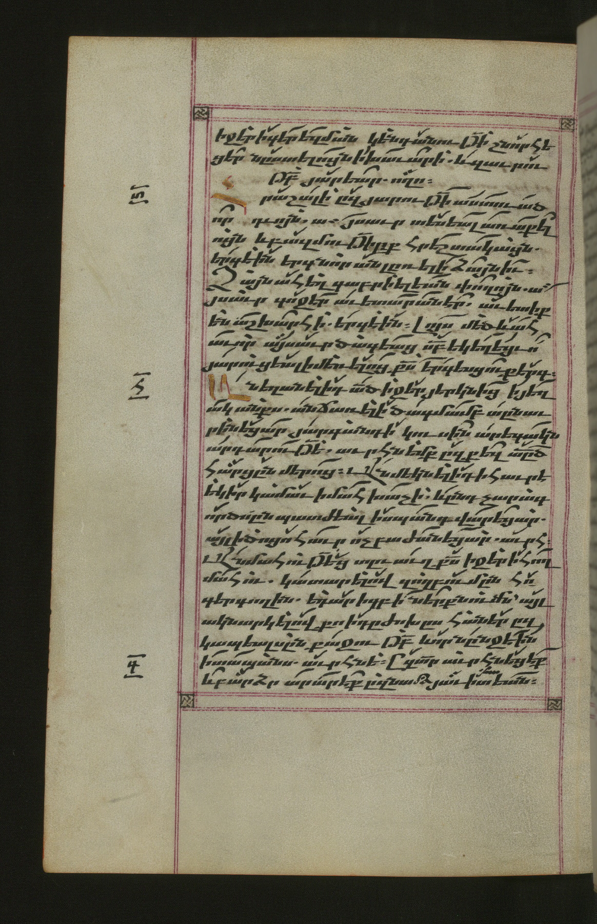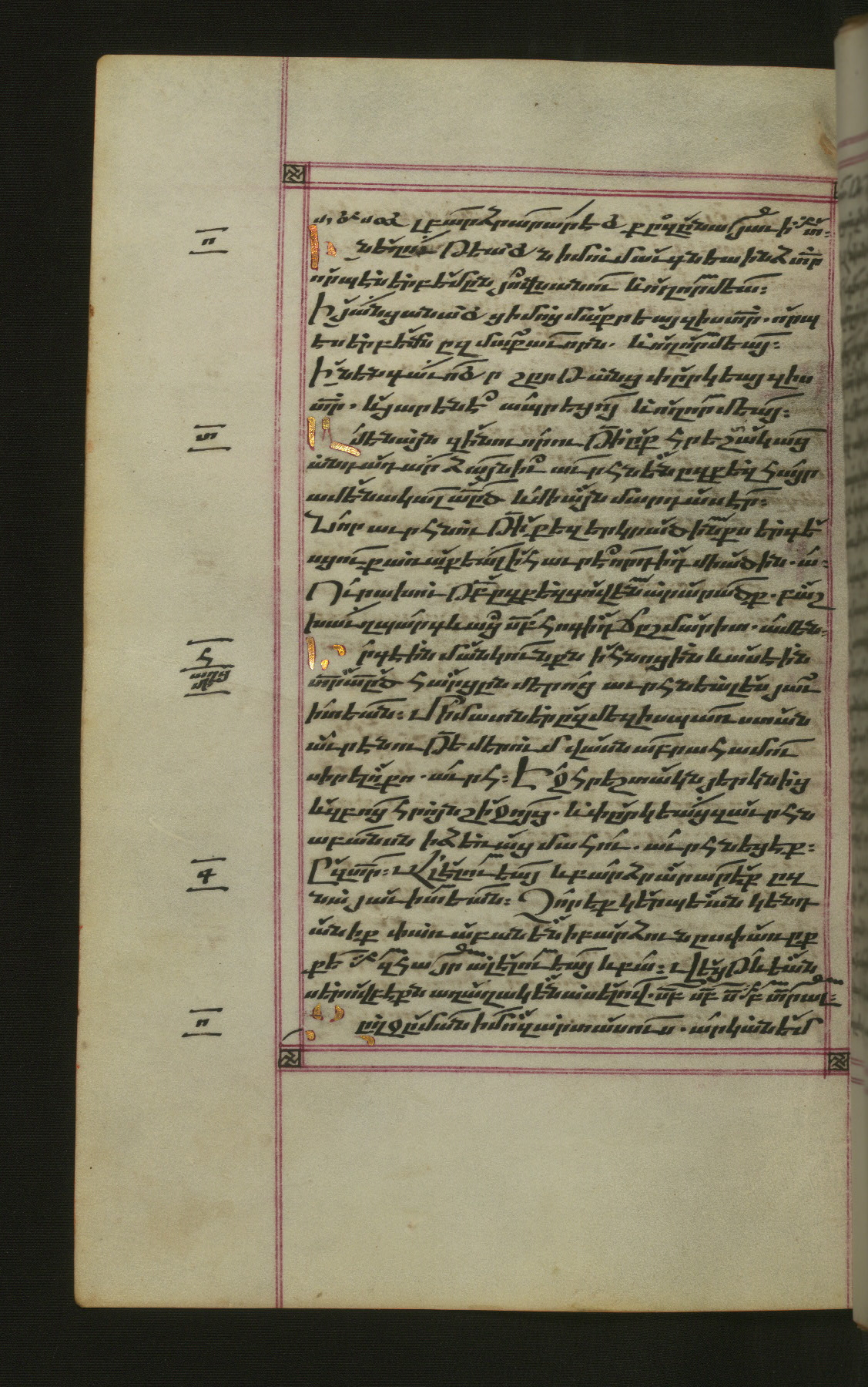 This hymnal was completed in Constantinople on August 15, 1678 [AE 1127], by the priest Yakob Pēligratc‘i, having been commissioned by Člav, son of Nawasard, as a dedication to his sons, Astuacatur and Sahak. The structure of the hymns adheres approximately to the standard Armenian hymnal (Շաբակնոց), with minor variations in order and a few substitutions (see Sanjian in the bibliography). The book is illuminated extensively, with thirty-eight full- and half-page polychrome miniatures against gold backgrounds, eight decorated head-pieces marking the principal divisions of the hymnal, and numerous marginal miniatures marking individual hymns, including biblical figures, saints, bishops, and vignettes. The style of the miniatures is largely in imitation of western European models, though more traditional Armenian and Byzantine influences stand out, such as the vibrant color palette, an iconic frontality for depictions of saints and bishops, and the highly abstracted floral motifs and zoomorphic incipits marking hymn divisions.