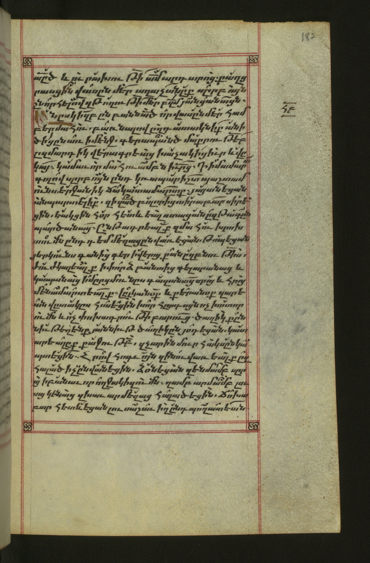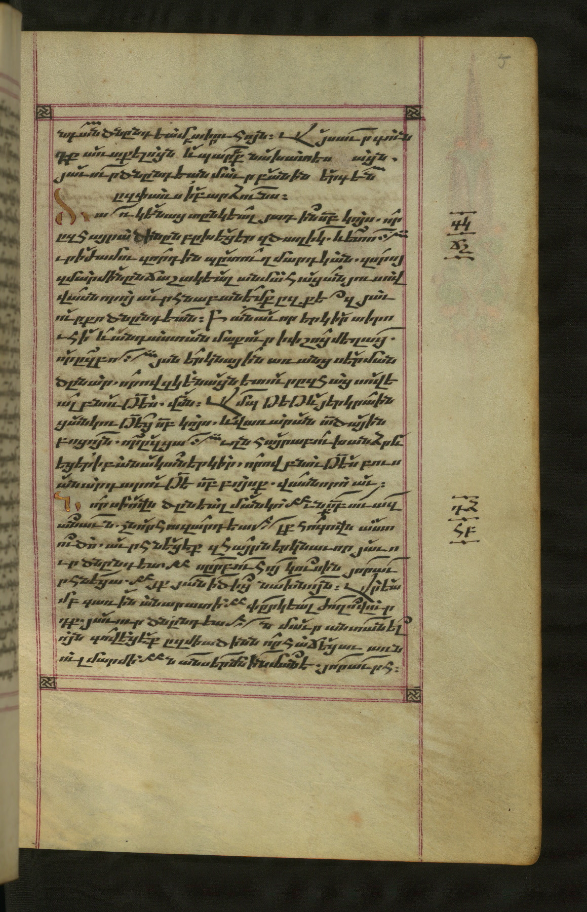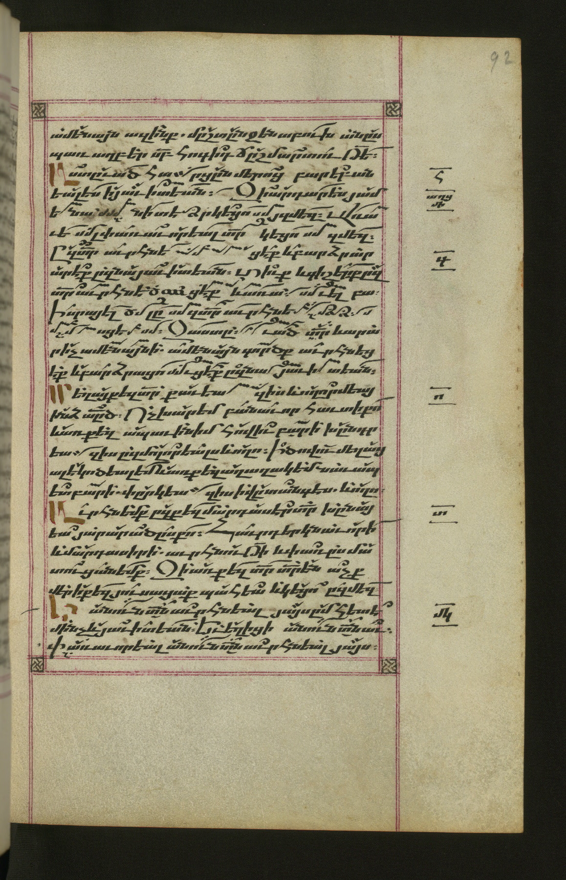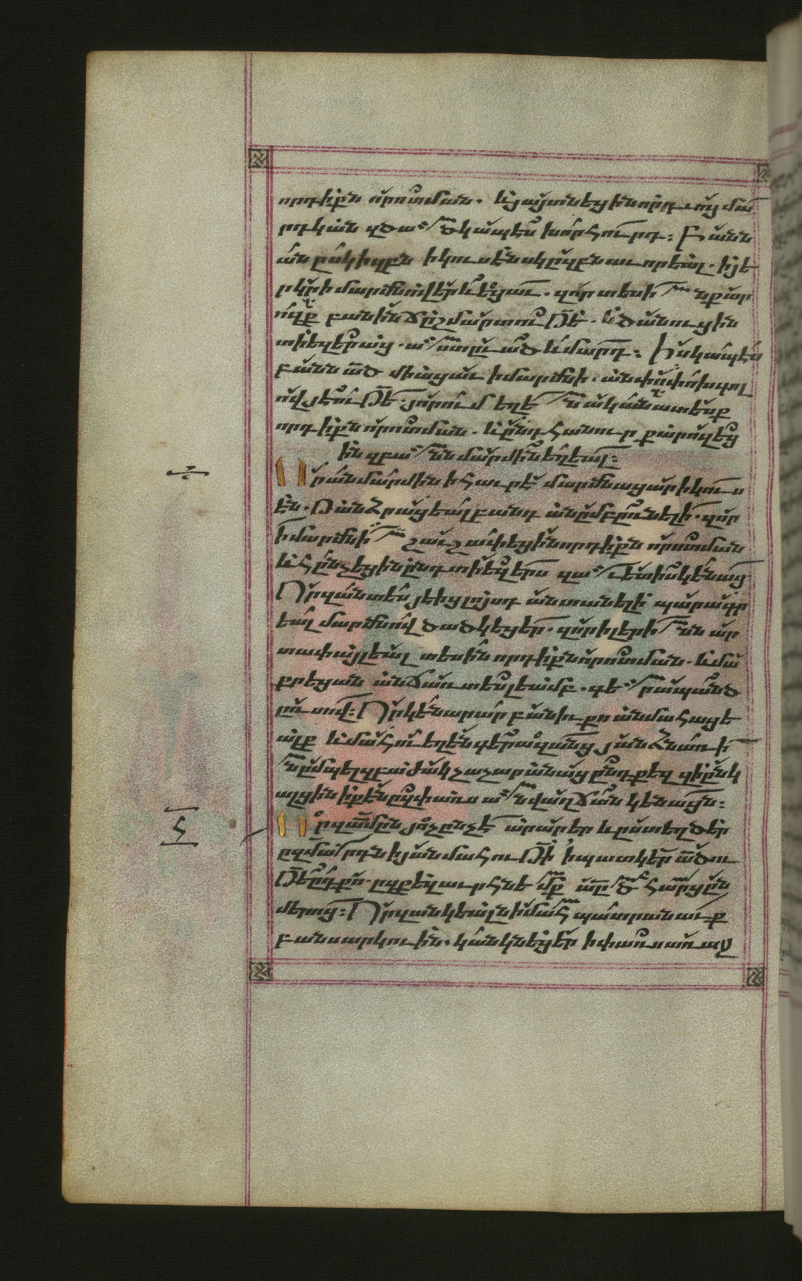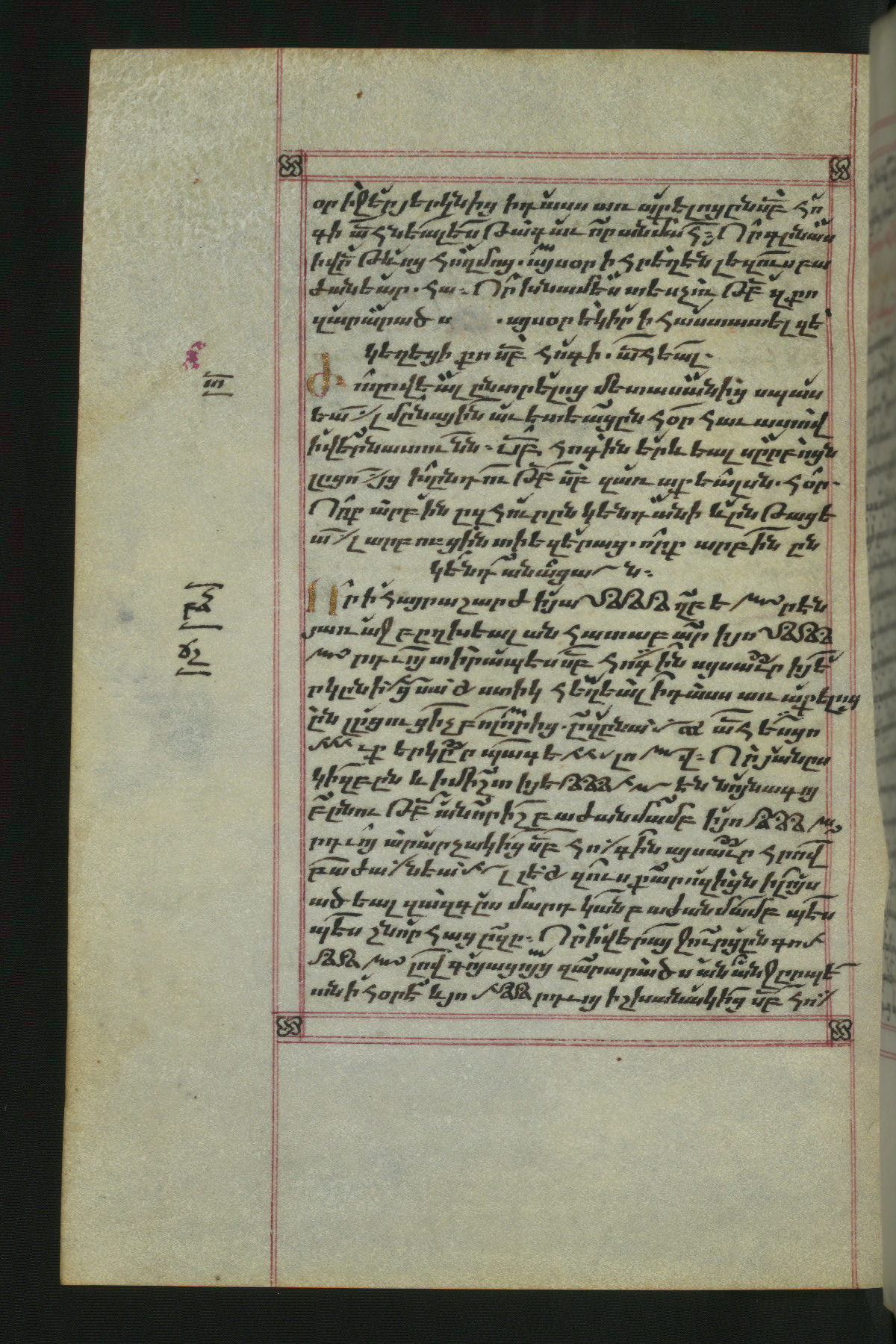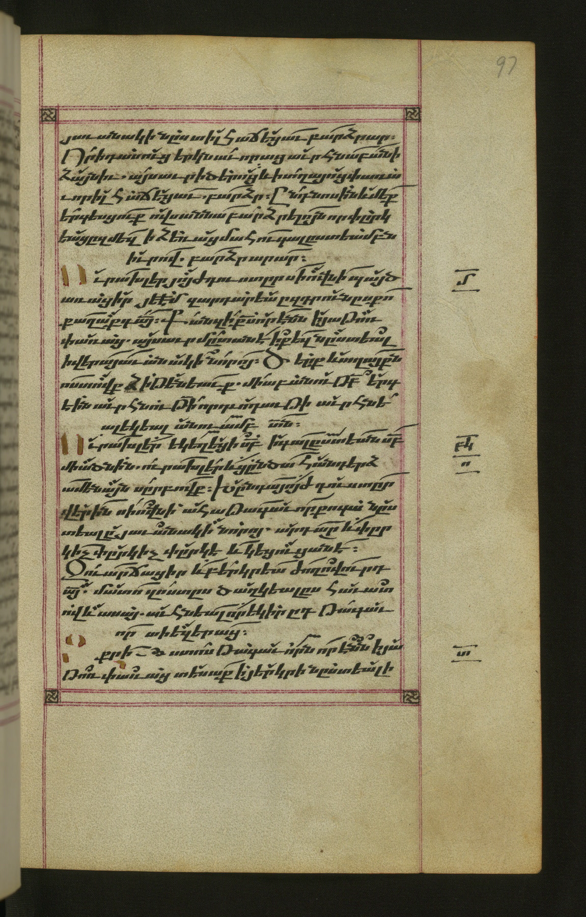 This hymnal was completed in Constantinople on August 15, 1678 [AE 1127], by the priest Yakob Pēligratc‘i, having been commissioned by Člav, son of Nawasard, as a dedication to his sons, Astuacatur and Sahak. The structure of the hymns adheres approximately to the standard Armenian hymnal (Շաբակնոց), with minor variations in order and a few substitutions (see Sanjian in the bibliography). The book is illuminated extensively, with thirty-eight full- and half-page polychrome miniatures against gold backgrounds, eight decorated head-pieces marking the principal divisions of the hymnal, and numerous marginal miniatures marking individual hymns, including biblical figures, saints, bishops, and vignettes. The style of the miniatures is largely in imitation of western European models, though more traditional Armenian and Byzantine influences stand out, such as the vibrant color palette, an iconic frontality for depictions of saints and bishops, and the highly abstracted floral motifs and zoomorphic incipits marking hymn divisions.