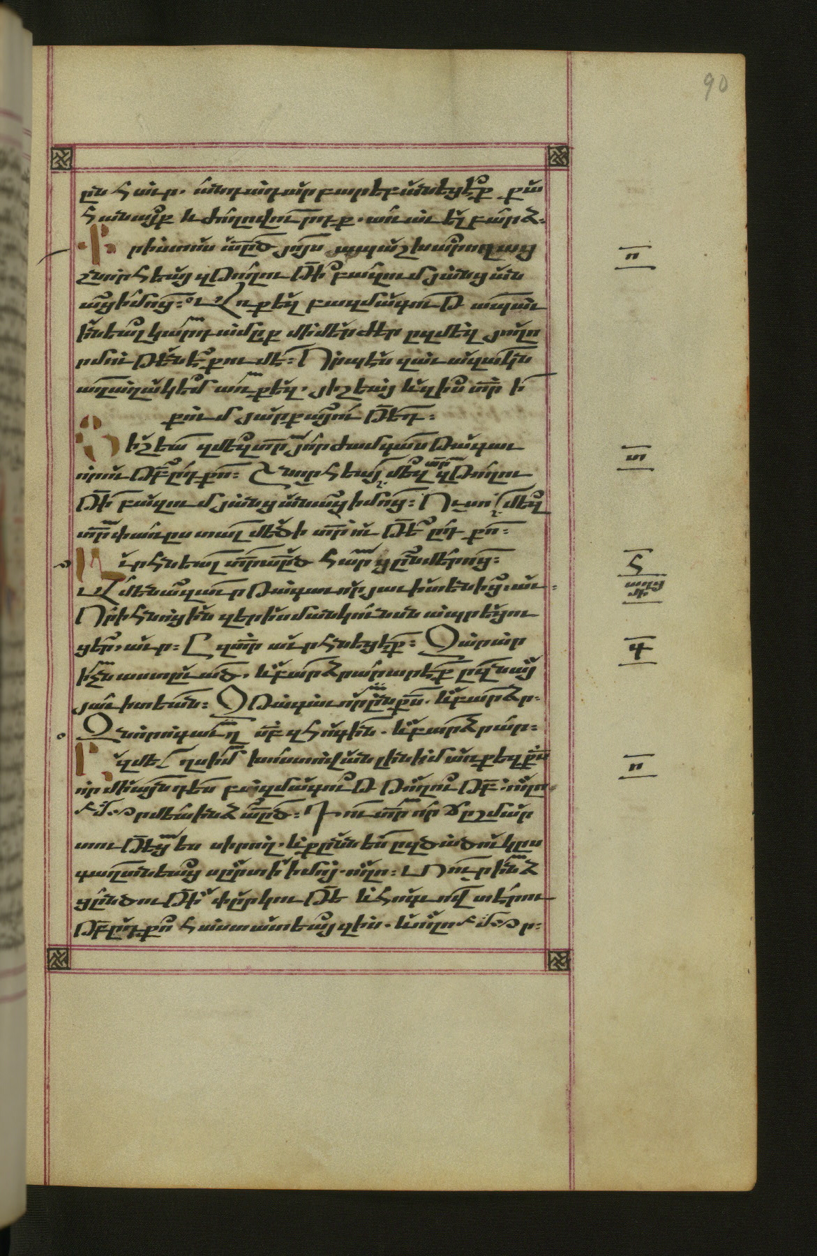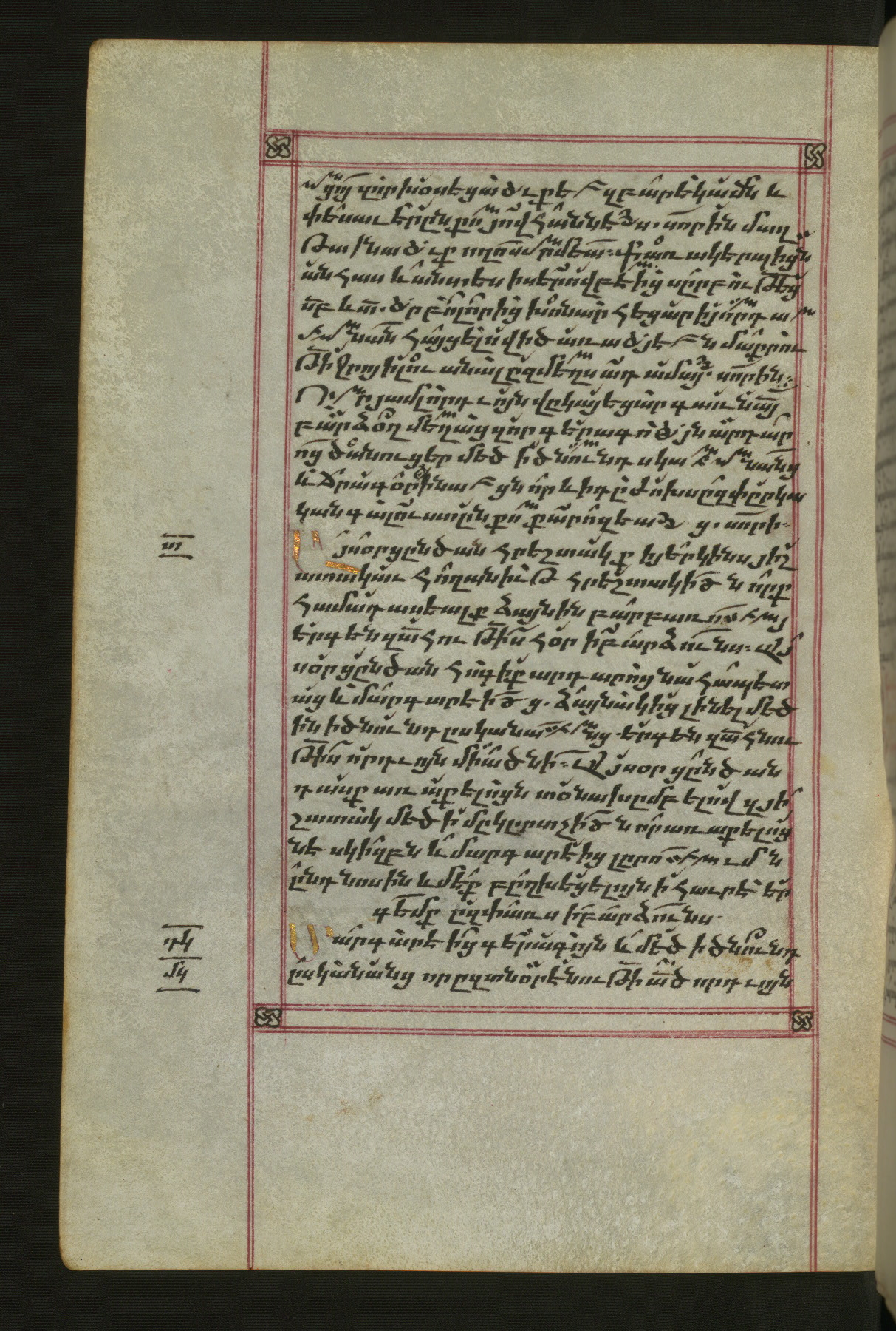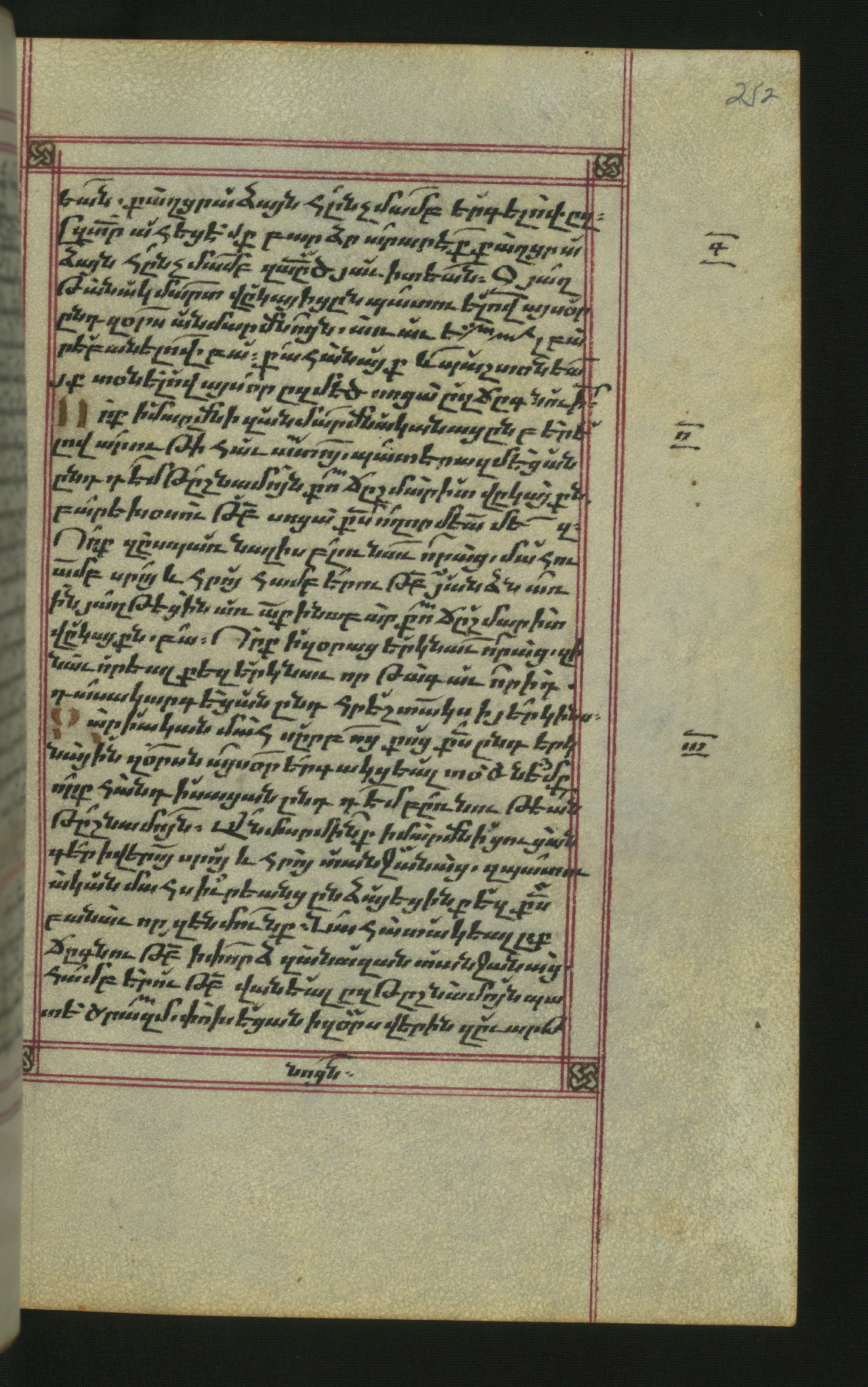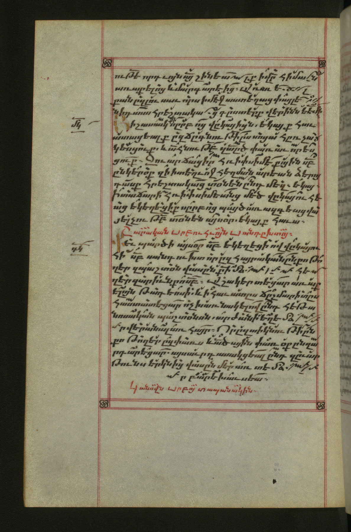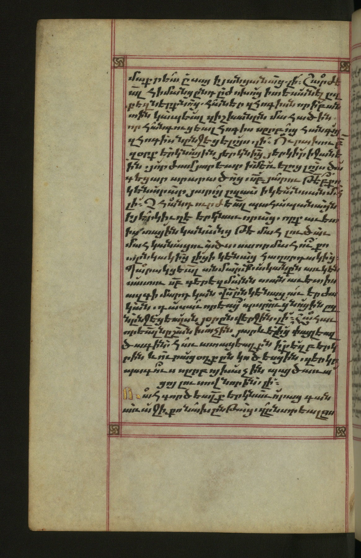 This hymnal was completed in Constantinople on August 15, 1678 [AE 1127], by the priest Yakob Pēligratc‘i, having been commissioned by Člav, son of Nawasard, as a dedication to his sons, Astuacatur and Sahak. The structure of the hymns adheres approximately to the standard Armenian hymnal (Շաբակնոց), with minor variations in order and a few substitutions (see Sanjian in the bibliography). The book is illuminated extensively, with thirty-eight full- and half-page polychrome miniatures against gold backgrounds, eight decorated head-pieces marking the principal divisions of the hymnal, and numerous marginal miniatures marking individual hymns, including biblical figures, saints, bishops, and vignettes. The style of the miniatures is largely in imitation of western European models, though more traditional Armenian and Byzantine influences stand out, such as the vibrant color palette, an iconic frontality for depictions of saints and bishops, and the highly abstracted floral motifs and zoomorphic incipits marking hymn divisions.