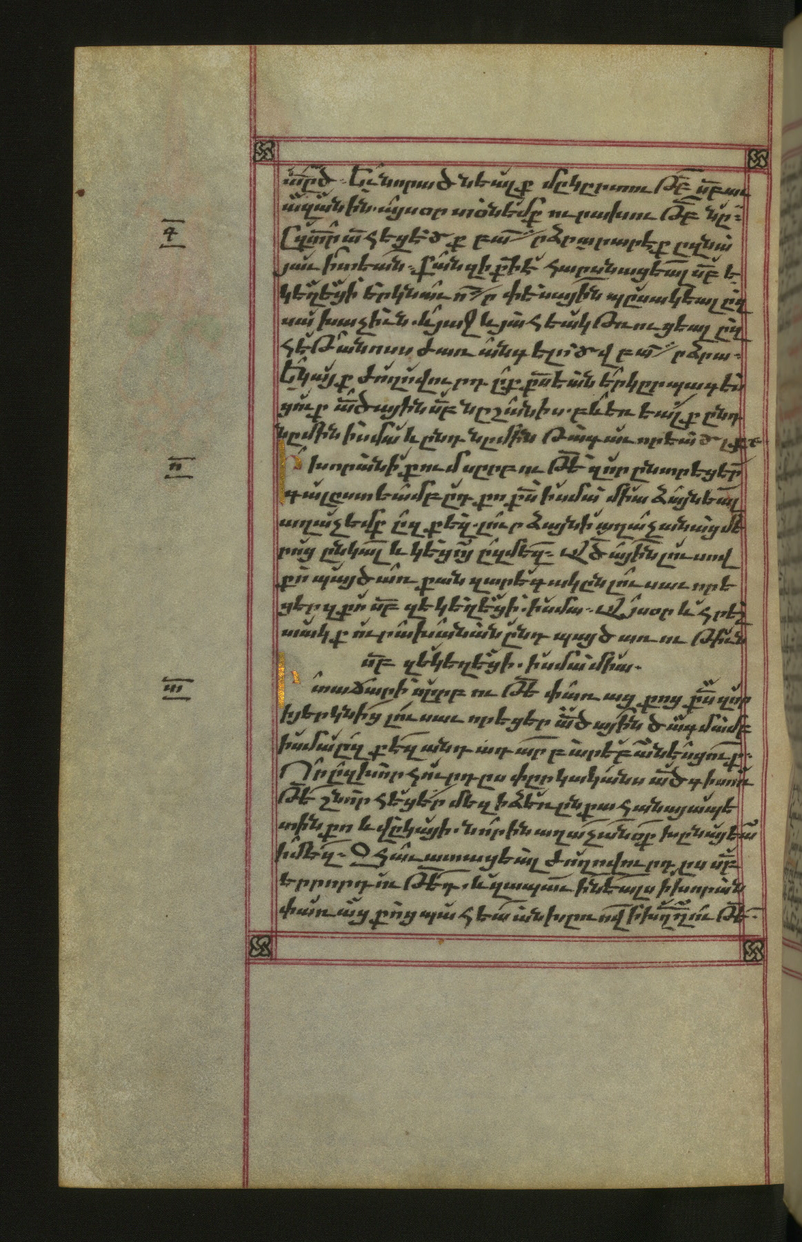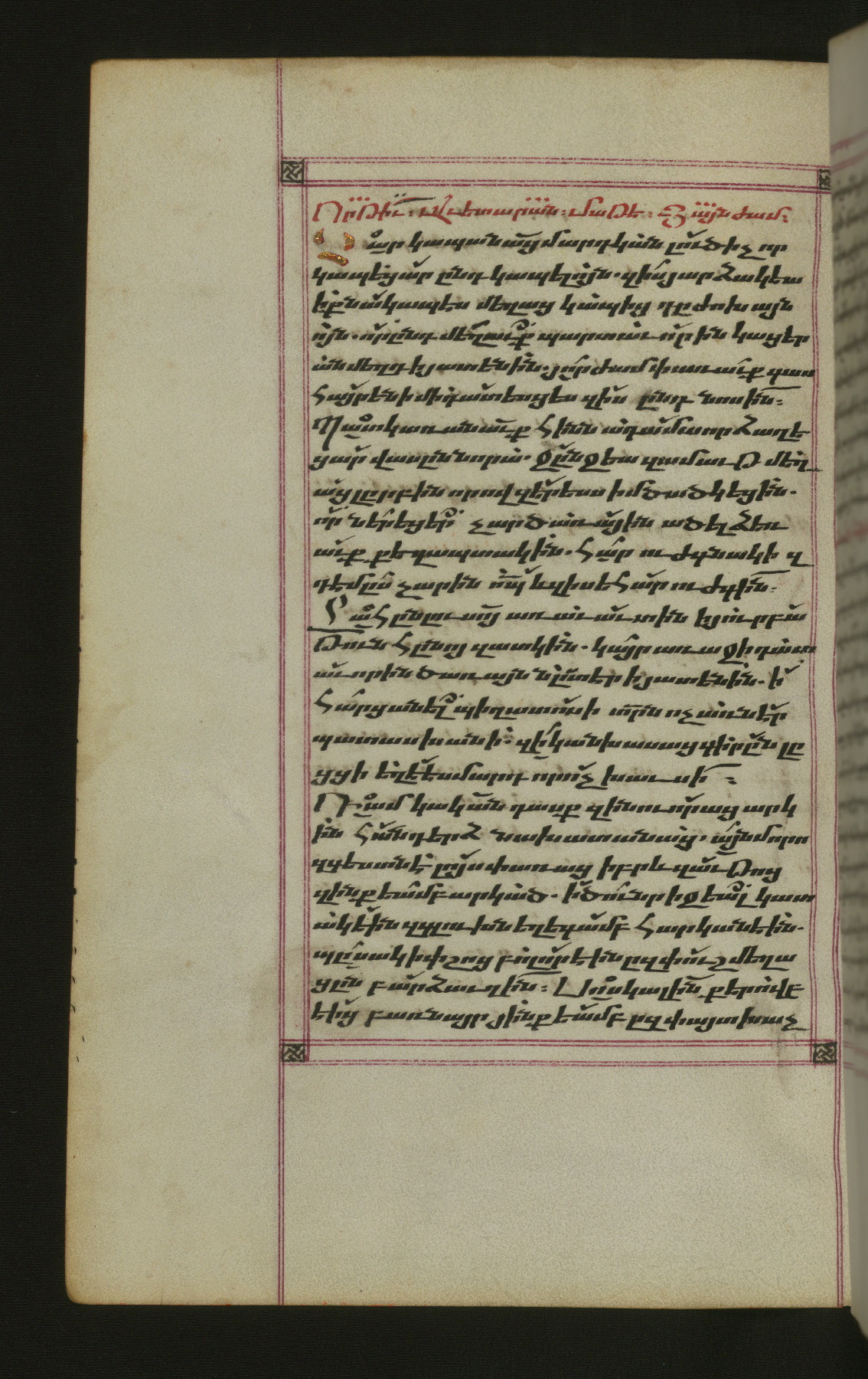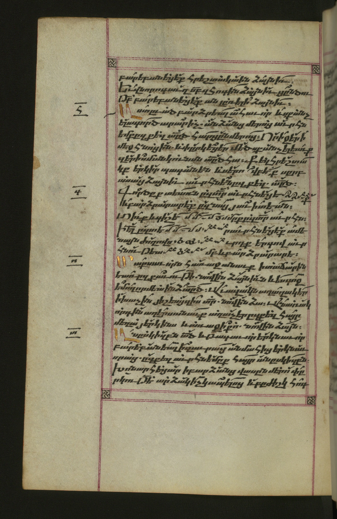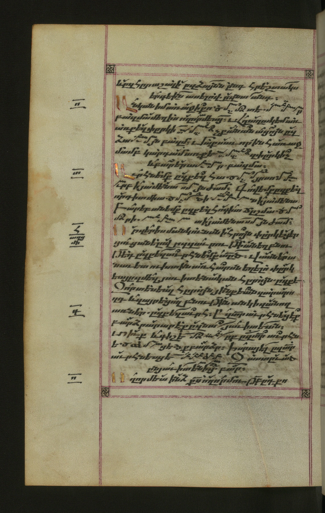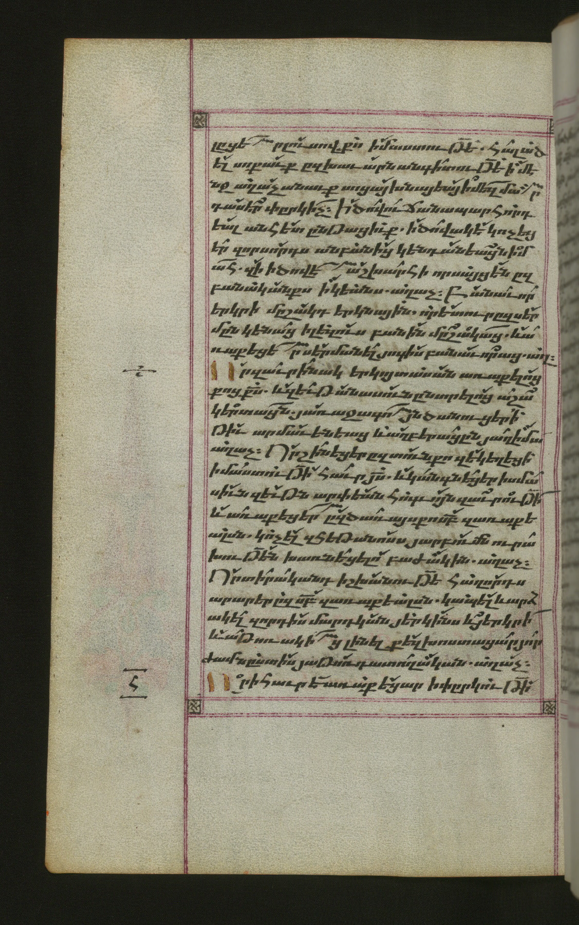 This hymnal was completed in Constantinople on August 15, 1678 [AE 1127], by the priest Yakob Pēligratc‘i, having been commissioned by Člav, son of Nawasard, as a dedication to his sons, Astuacatur and Sahak. The structure of the hymns adheres approximately to the standard Armenian hymnal (Շաբակնոց), with minor variations in order and a few substitutions (see Sanjian in the bibliography). The book is illuminated extensively, with thirty-eight full- and half-page polychrome miniatures against gold backgrounds, eight decorated head-pieces marking the principal divisions of the hymnal, and numerous marginal miniatures marking individual hymns, including biblical figures, saints, bishops, and vignettes. The style of the miniatures is largely in imitation of western European models, though more traditional Armenian and Byzantine influences stand out, such as the vibrant color palette, an iconic frontality for depictions of saints and bishops, and the highly abstracted floral motifs and zoomorphic incipits marking hymn divisions.