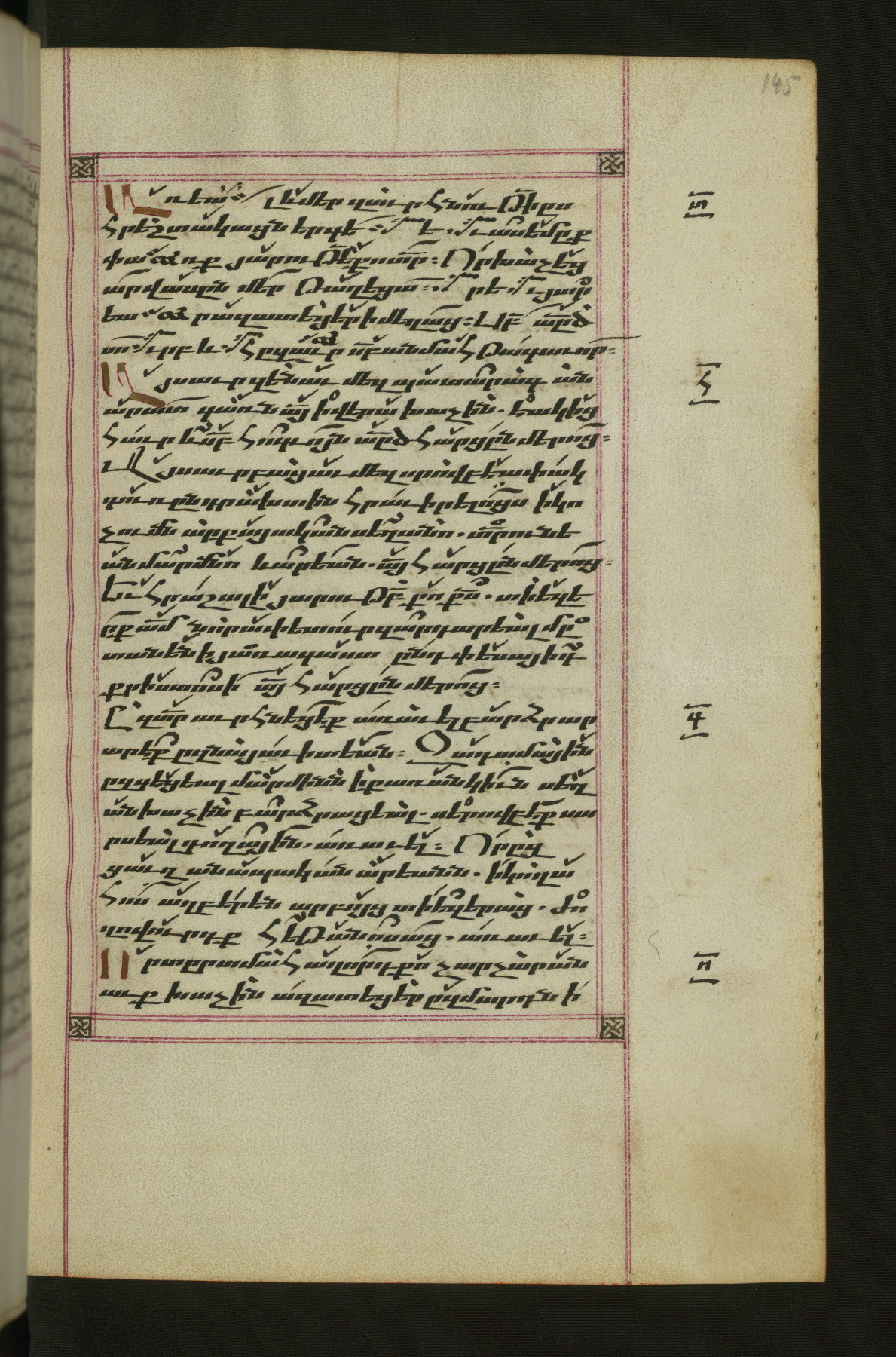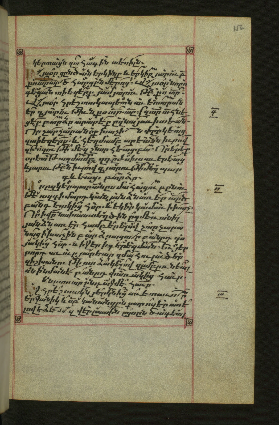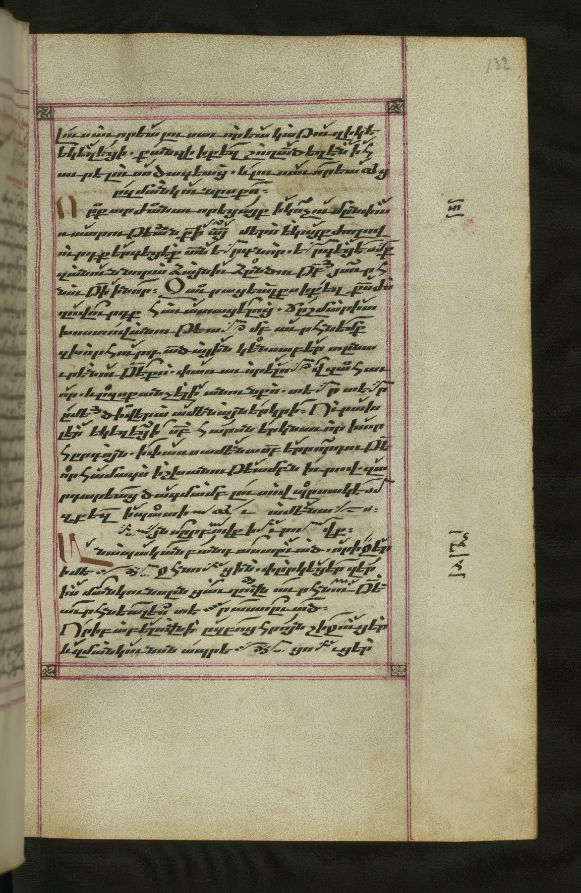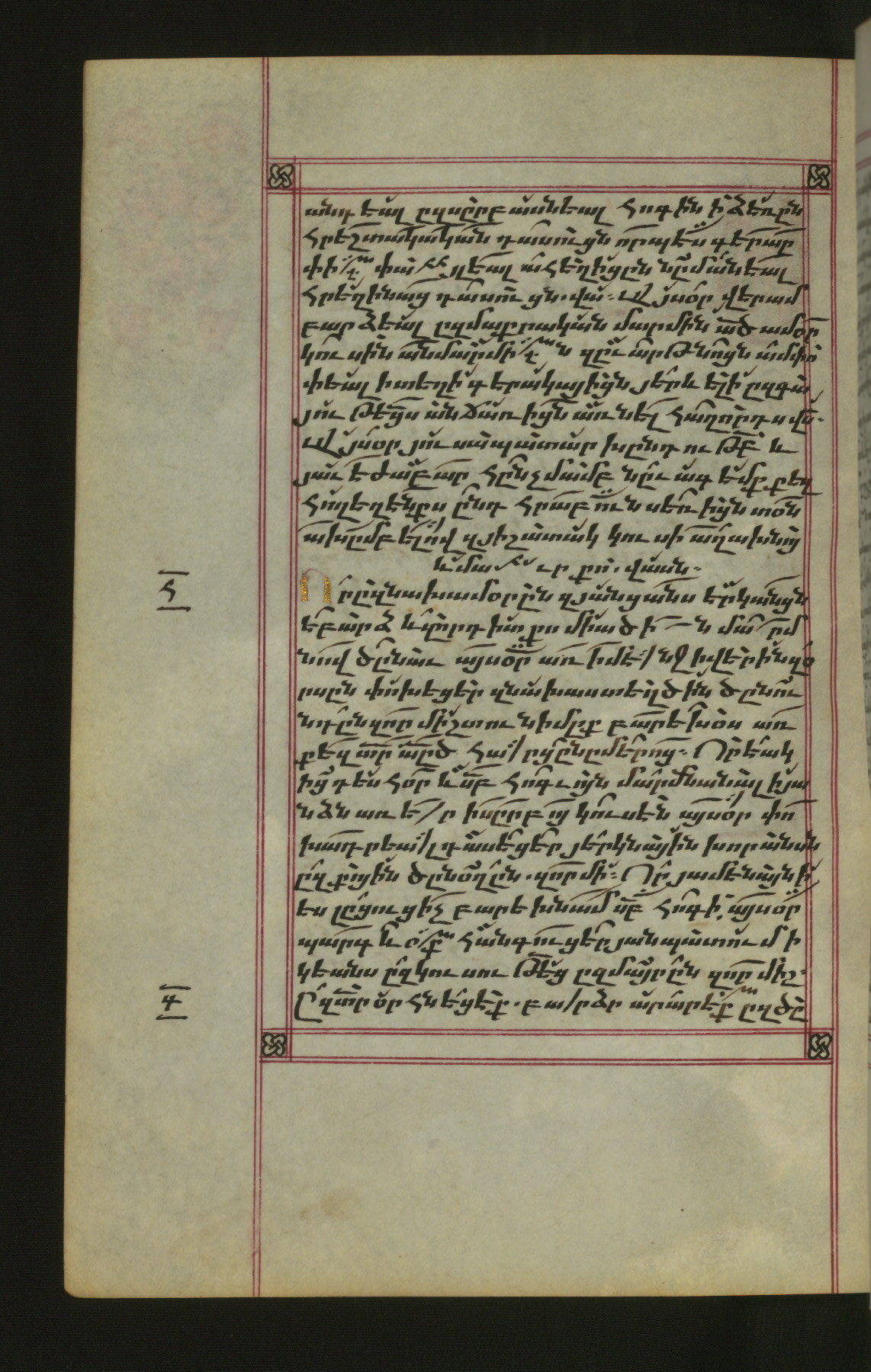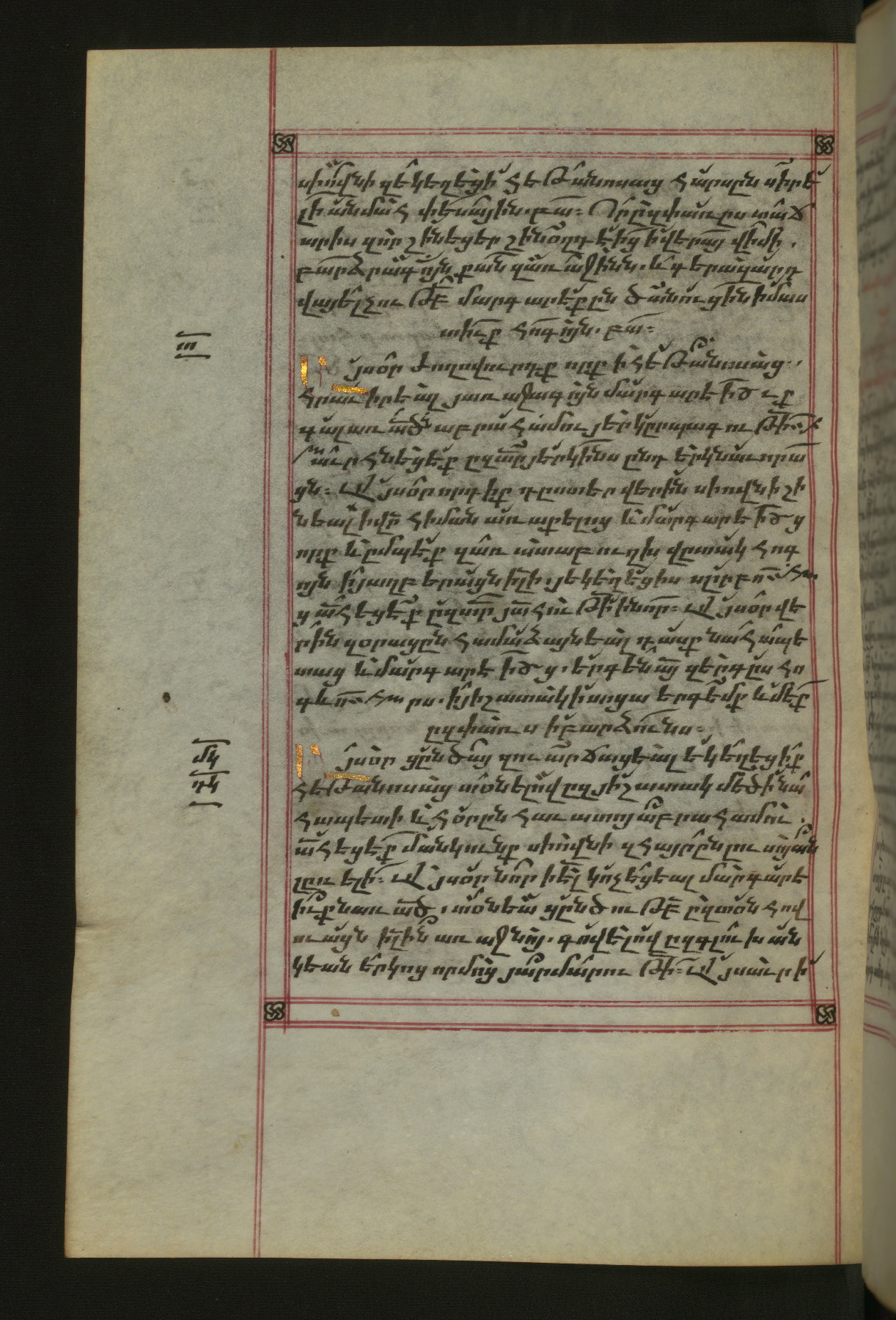 This hymnal was completed in Constantinople on August 15, 1678 [AE 1127], by the priest Yakob Pēligratc‘i, having been commissioned by Člav, son of Nawasard, as a dedication to his sons, Astuacatur and Sahak. The structure of the hymns adheres approximately to the standard Armenian hymnal (Շաբակնոց), with minor variations in order and a few substitutions (see Sanjian in the bibliography). The book is illuminated extensively, with thirty-eight full- and half-page polychrome miniatures against gold backgrounds, eight decorated head-pieces marking the principal divisions of the hymnal, and numerous marginal miniatures marking individual hymns, including biblical figures, saints, bishops, and vignettes. The style of the miniatures is largely in imitation of western European models, though more traditional Armenian and Byzantine influences stand out, such as the vibrant color palette, an iconic frontality for depictions of saints and bishops, and the highly abstracted floral motifs and zoomorphic incipits marking hymn divisions.