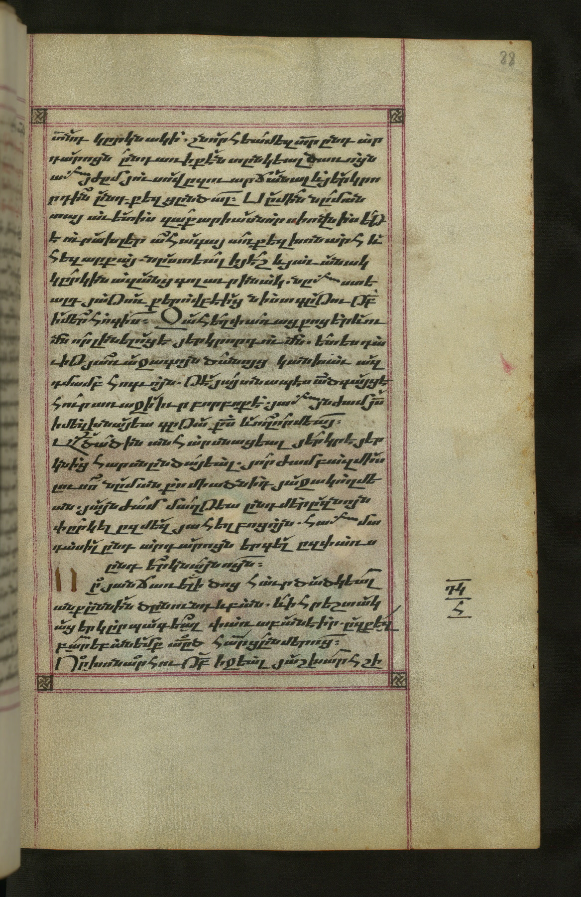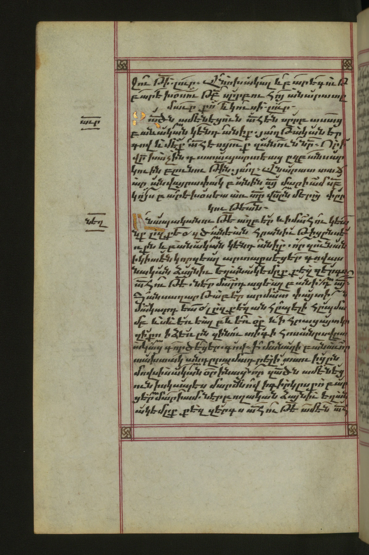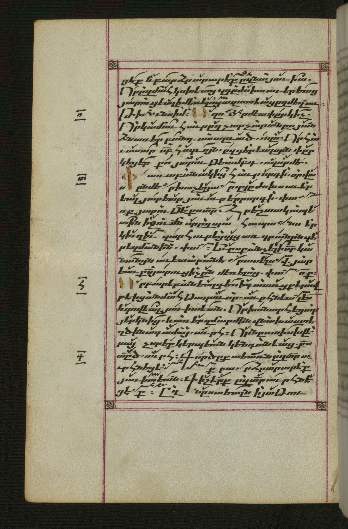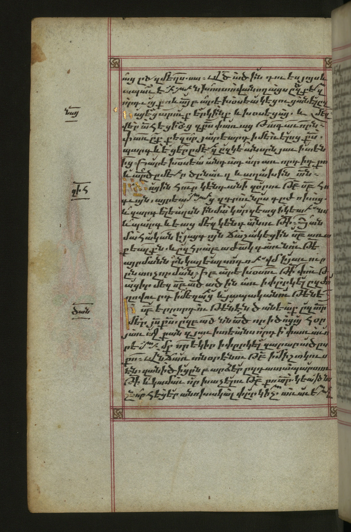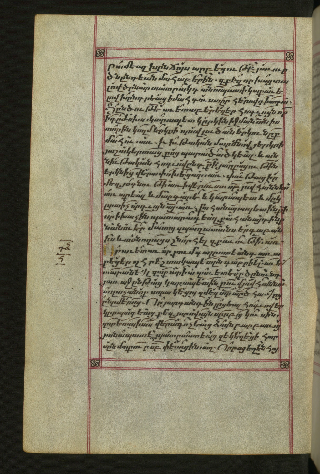 This hymnal was completed in Constantinople on August 15, 1678 [AE 1127], by the priest Yakob Pēligratc‘i, having been commissioned by Člav, son of Nawasard, as a dedication to his sons, Astuacatur and Sahak. The structure of the hymns adheres approximately to the standard Armenian hymnal (Շաբակնոց), with minor variations in order and a few substitutions (see Sanjian in the bibliography). The book is illuminated extensively, with thirty-eight full- and half-page polychrome miniatures against gold backgrounds, eight decorated head-pieces marking the principal divisions of the hymnal, and numerous marginal miniatures marking individual hymns, including biblical figures, saints, bishops, and vignettes. The style of the miniatures is largely in imitation of western European models, though more traditional Armenian and Byzantine influences stand out, such as the vibrant color palette, an iconic frontality for depictions of saints and bishops, and the highly abstracted floral motifs and zoomorphic incipits marking hymn divisions.