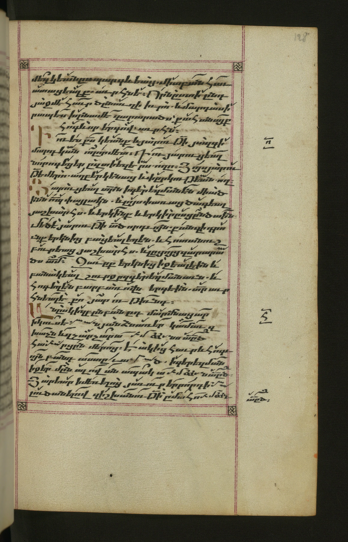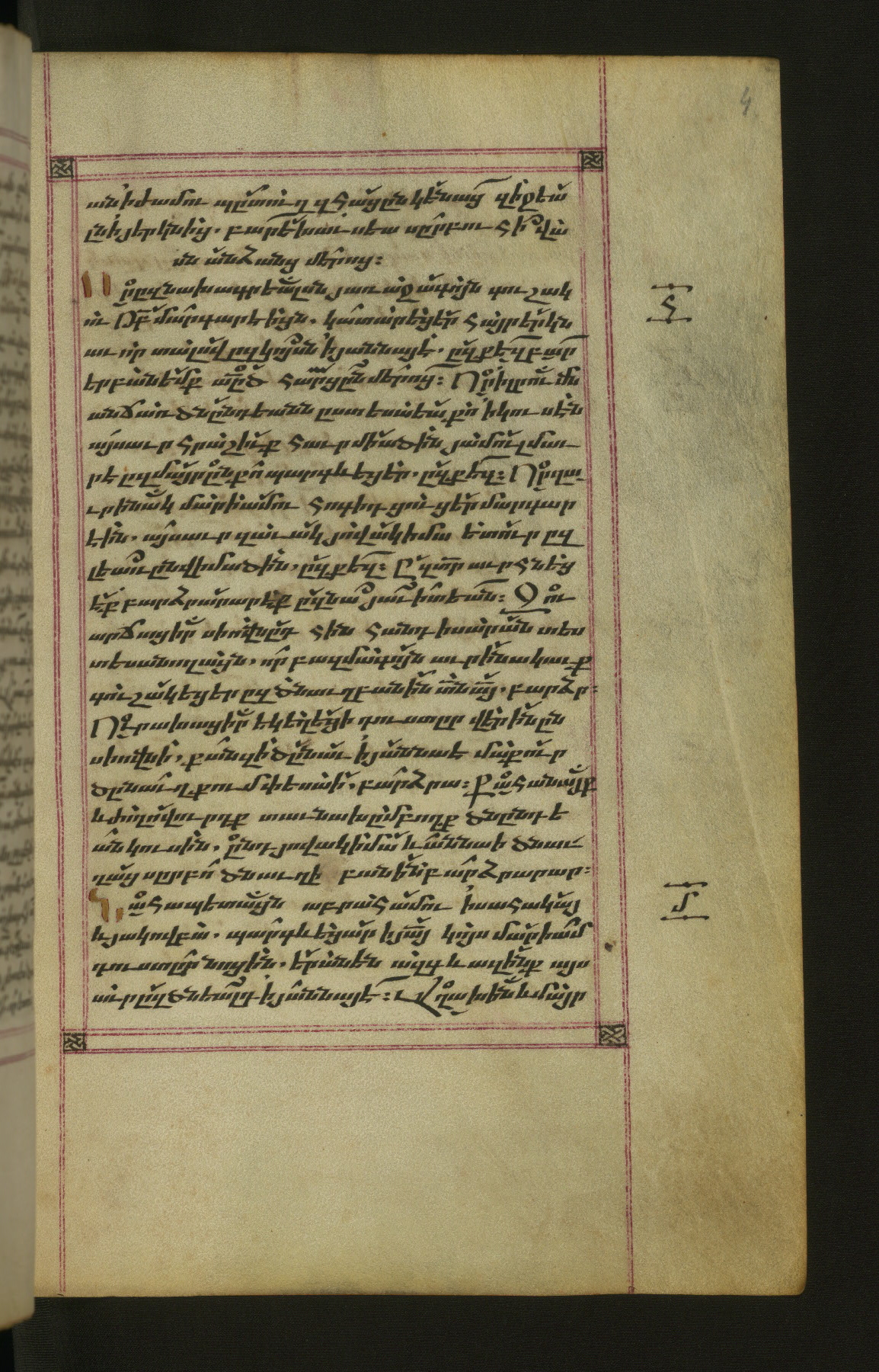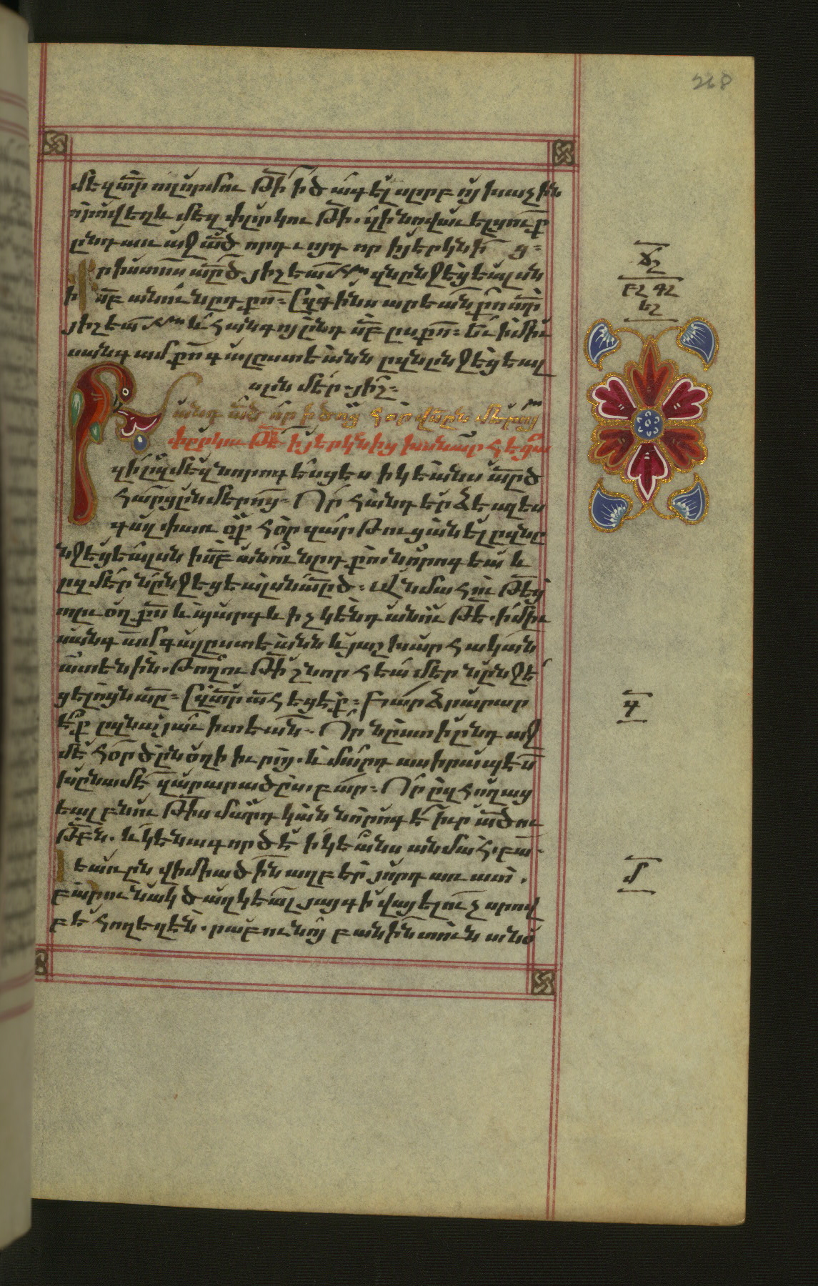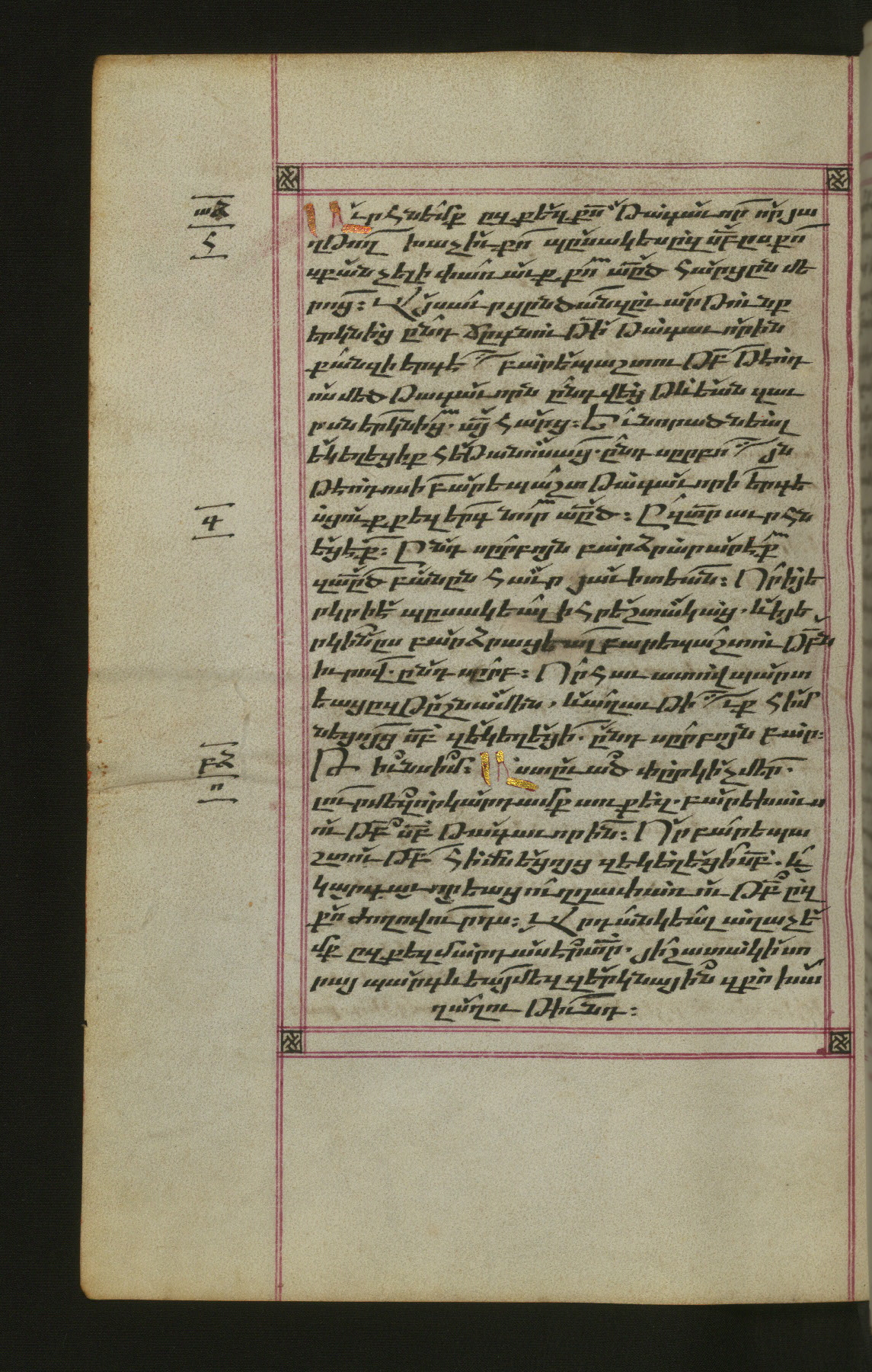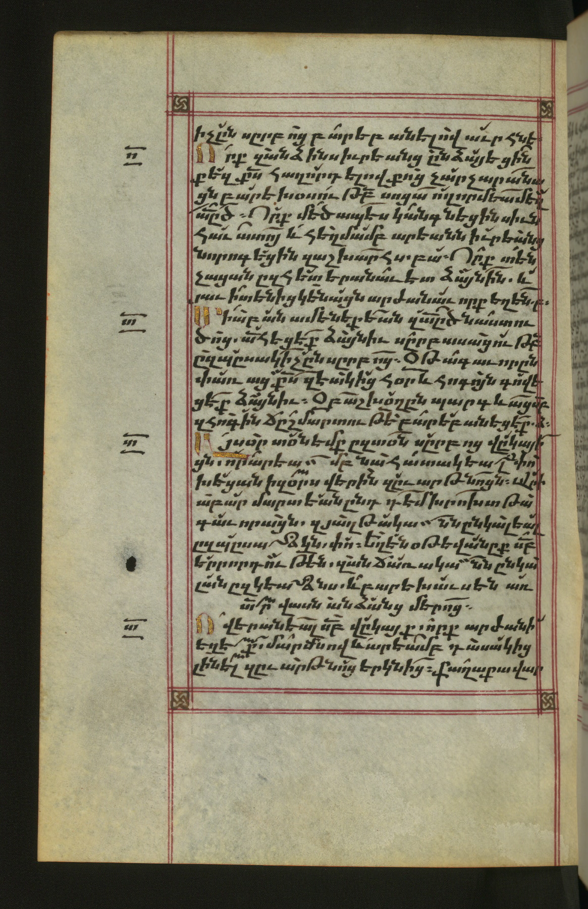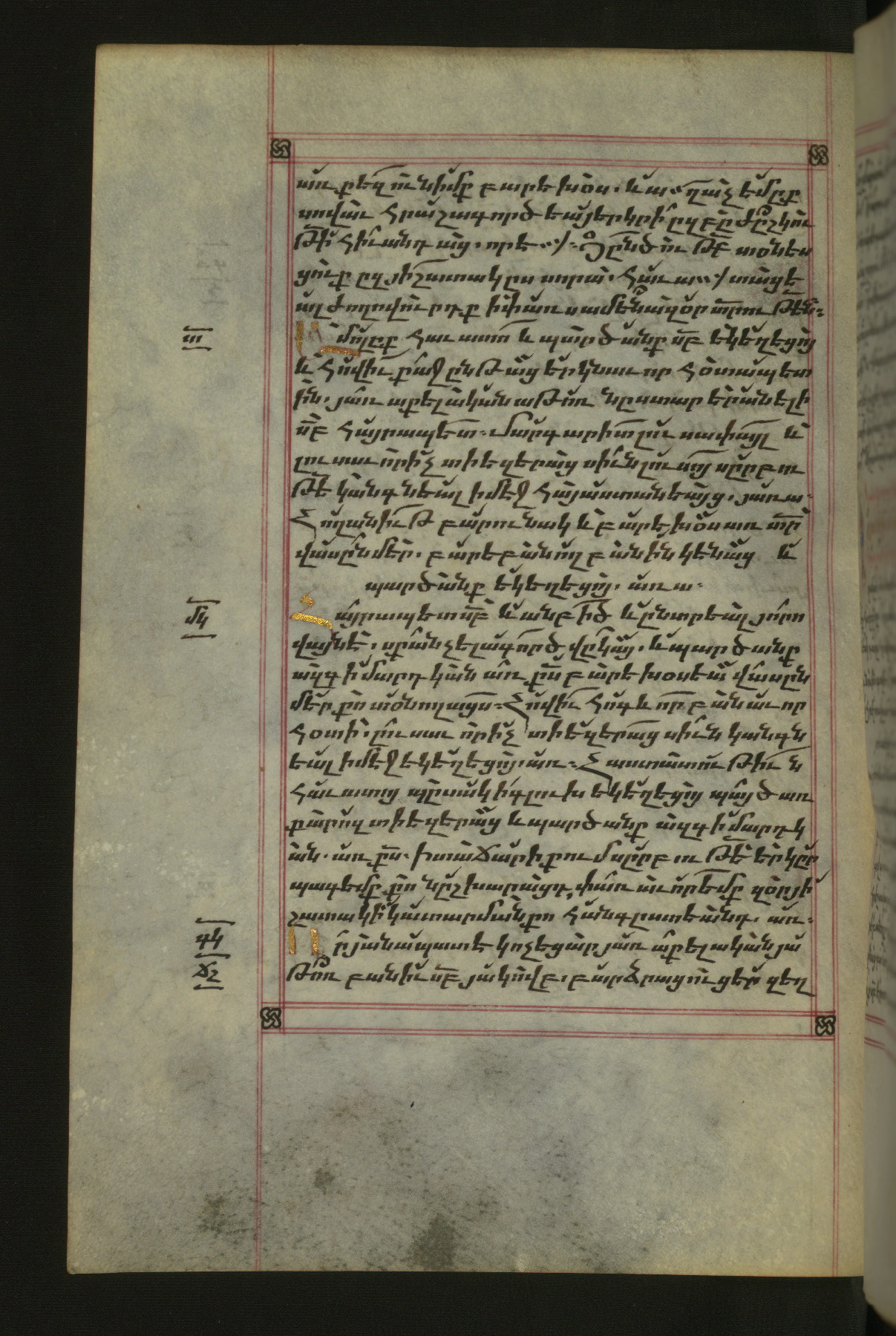 This hymnal was completed in Constantinople on August 15, 1678 [AE 1127], by the priest Yakob Pēligratc‘i, having been commissioned by Člav, son of Nawasard, as a dedication to his sons, Astuacatur and Sahak. The structure of the hymns adheres approximately to the standard Armenian hymnal (Շաբակնոց), with minor variations in order and a few substitutions (see Sanjian in the bibliography). The book is illuminated extensively, with thirty-eight full- and half-page polychrome miniatures against gold backgrounds, eight decorated head-pieces marking the principal divisions of the hymnal, and numerous marginal miniatures marking individual hymns, including biblical figures, saints, bishops, and vignettes. The style of the miniatures is largely in imitation of western European models, though more traditional Armenian and Byzantine influences stand out, such as the vibrant color palette, an iconic frontality for depictions of saints and bishops, and the highly abstracted floral motifs and zoomorphic incipits marking hymn divisions.