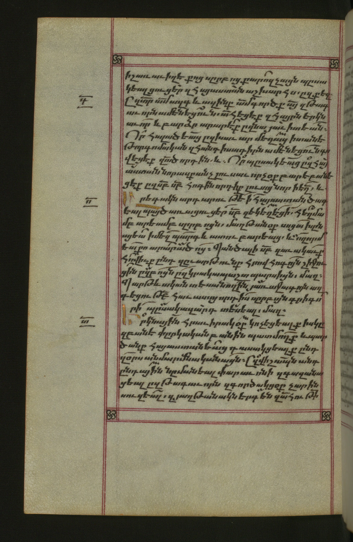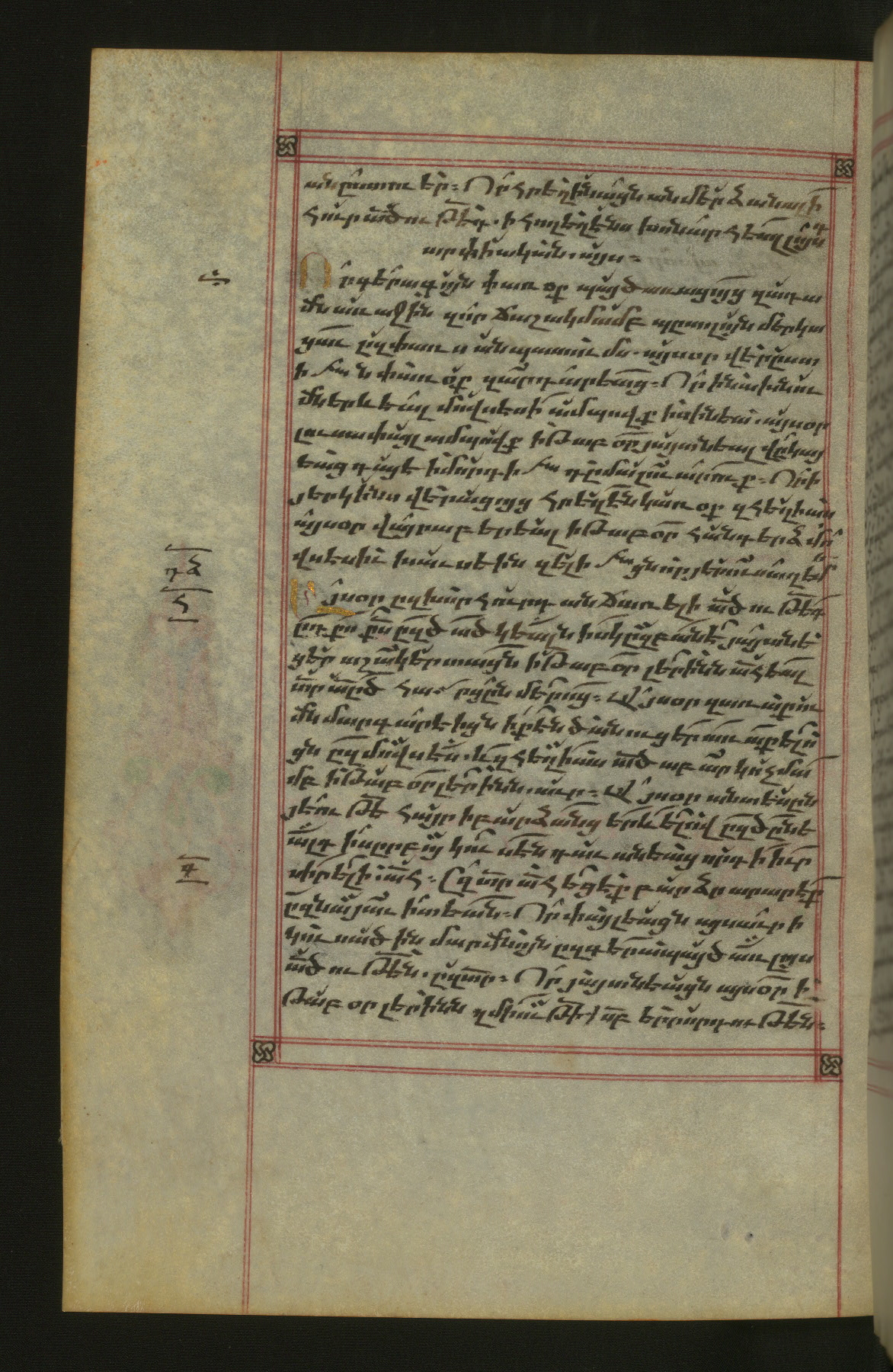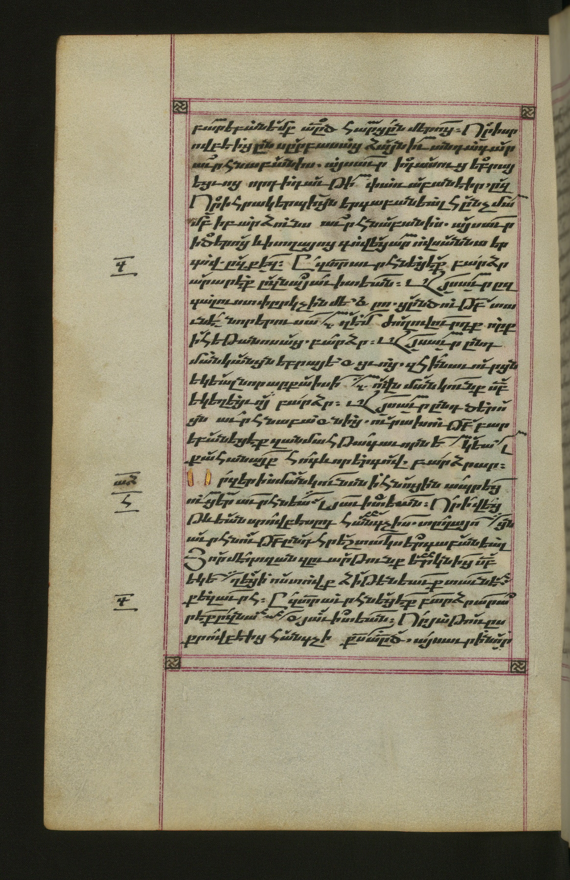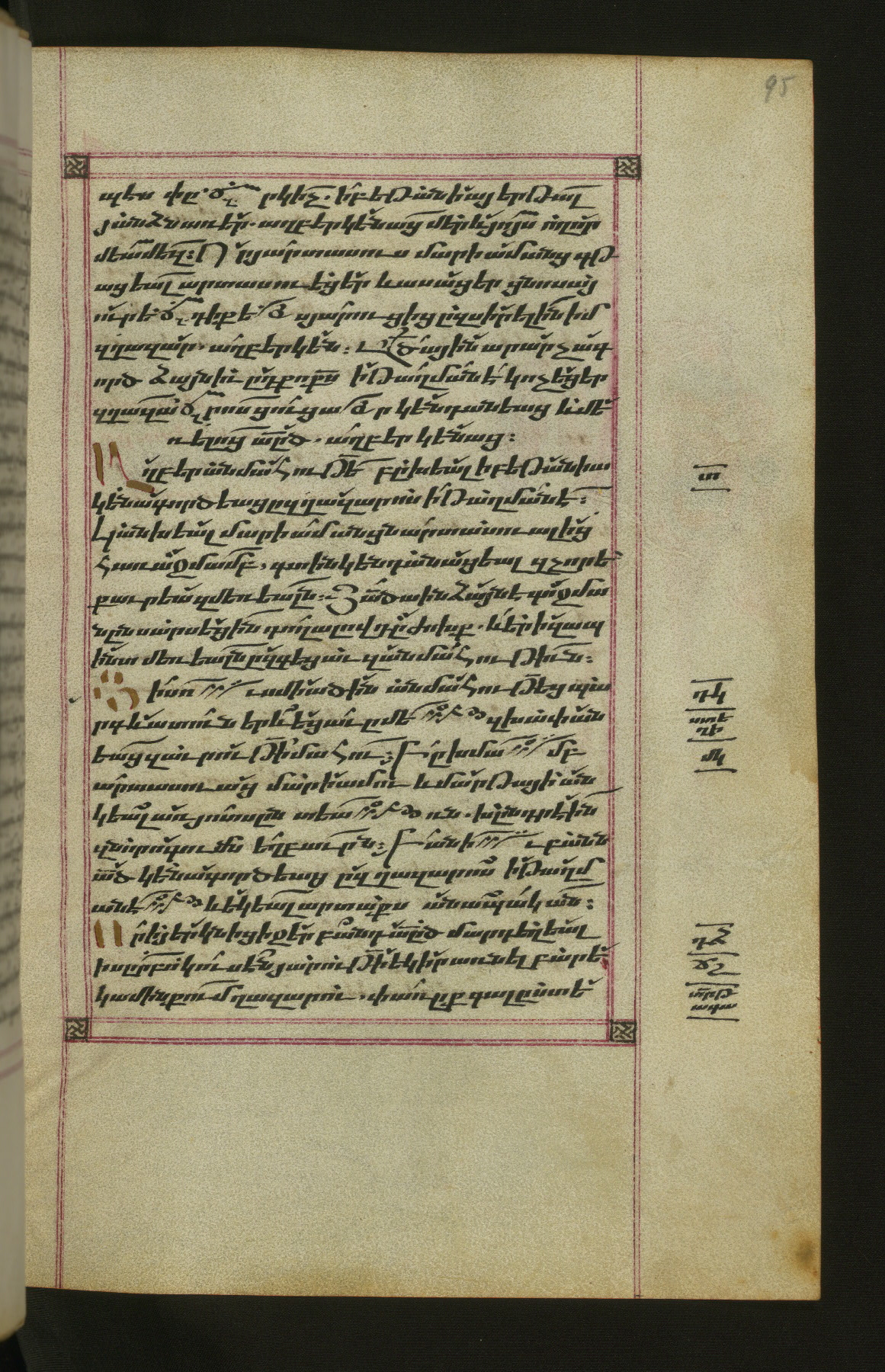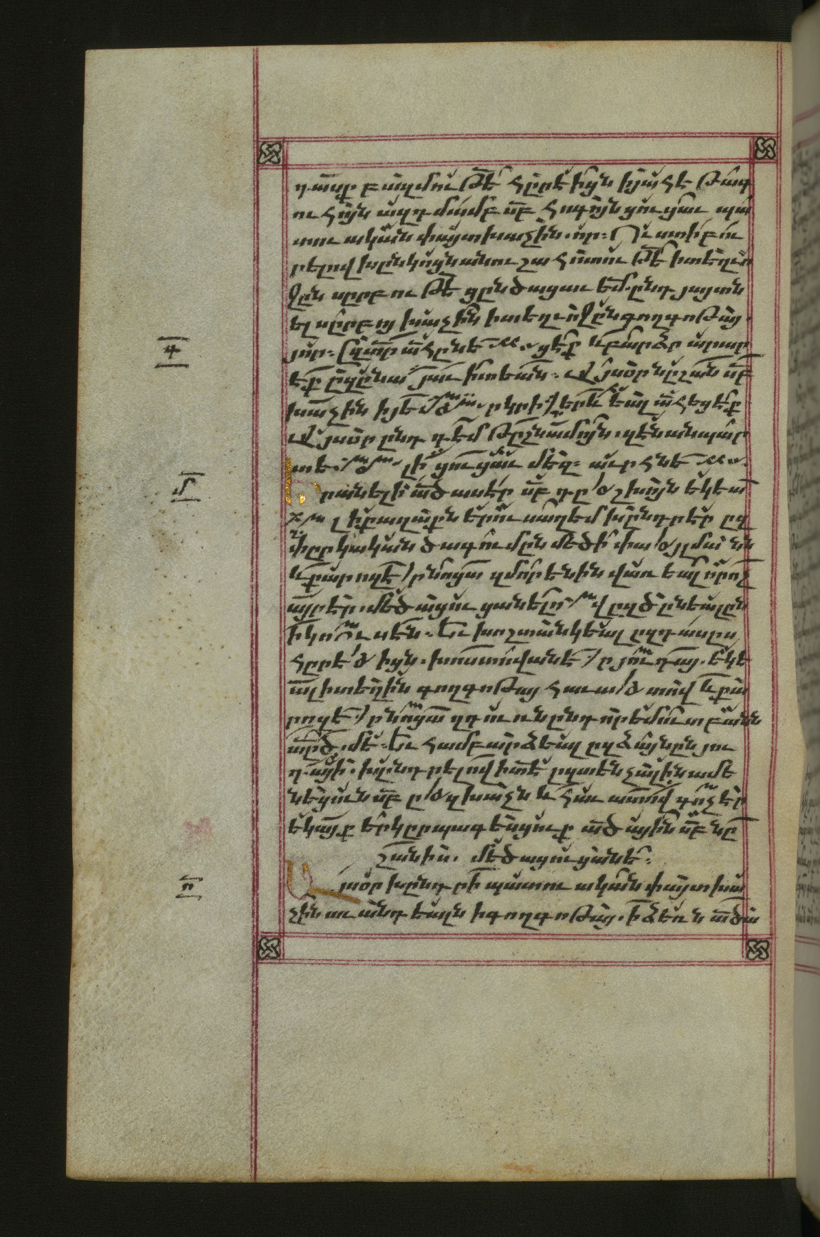 This hymnal was completed in Constantinople on August 15, 1678 [AE 1127], by the priest Yakob Pēligratc‘i, having been commissioned by Člav, son of Nawasard, as a dedication to his sons, Astuacatur and Sahak. The structure of the hymns adheres approximately to the standard Armenian hymnal (Շաբակնոց), with minor variations in order and a few substitutions (see Sanjian in the bibliography). The book is illuminated extensively, with thirty-eight full- and half-page polychrome miniatures against gold backgrounds, eight decorated head-pieces marking the principal divisions of the hymnal, and numerous marginal miniatures marking individual hymns, including biblical figures, saints, bishops, and vignettes. The style of the miniatures is largely in imitation of western European models, though more traditional Armenian and Byzantine influences stand out, such as the vibrant color palette, an iconic frontality for depictions of saints and bishops, and the highly abstracted floral motifs and zoomorphic incipits marking hymn divisions.