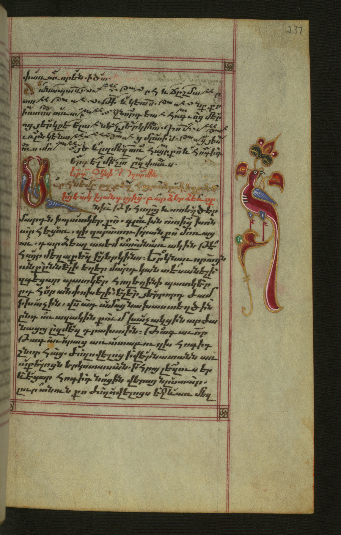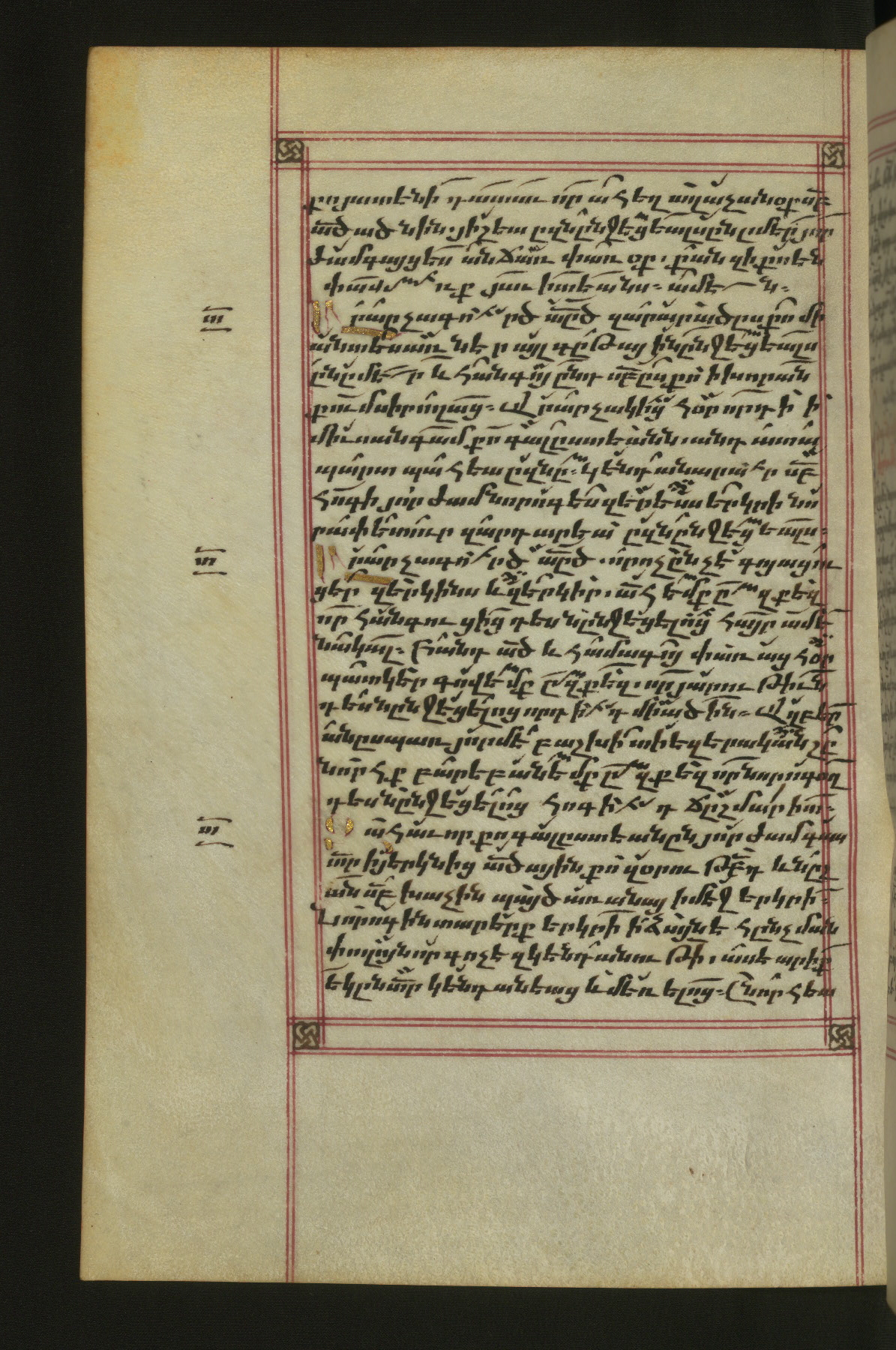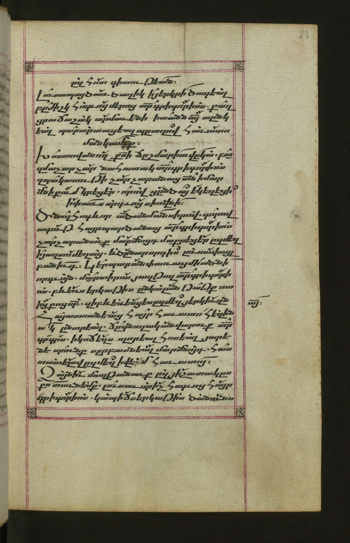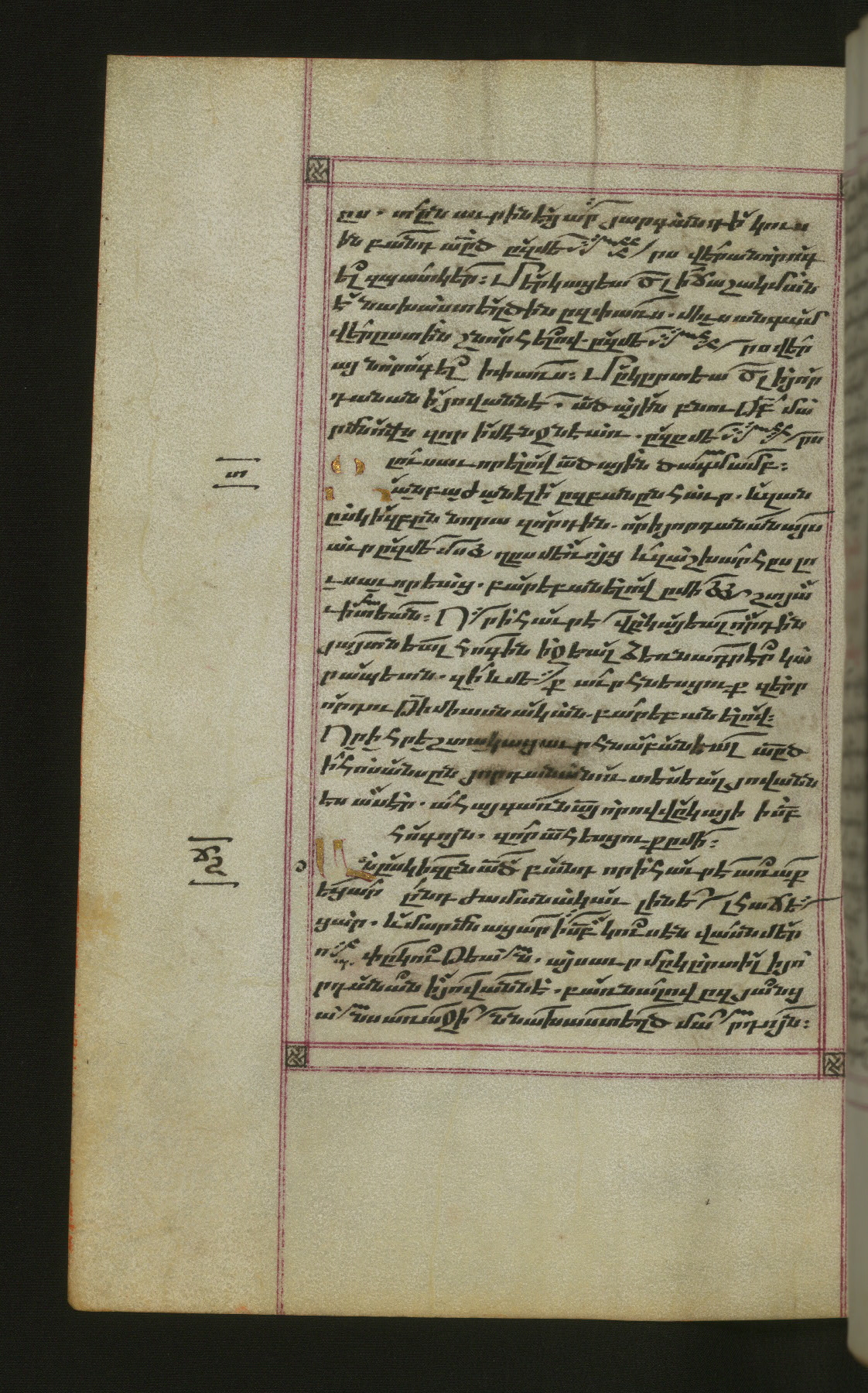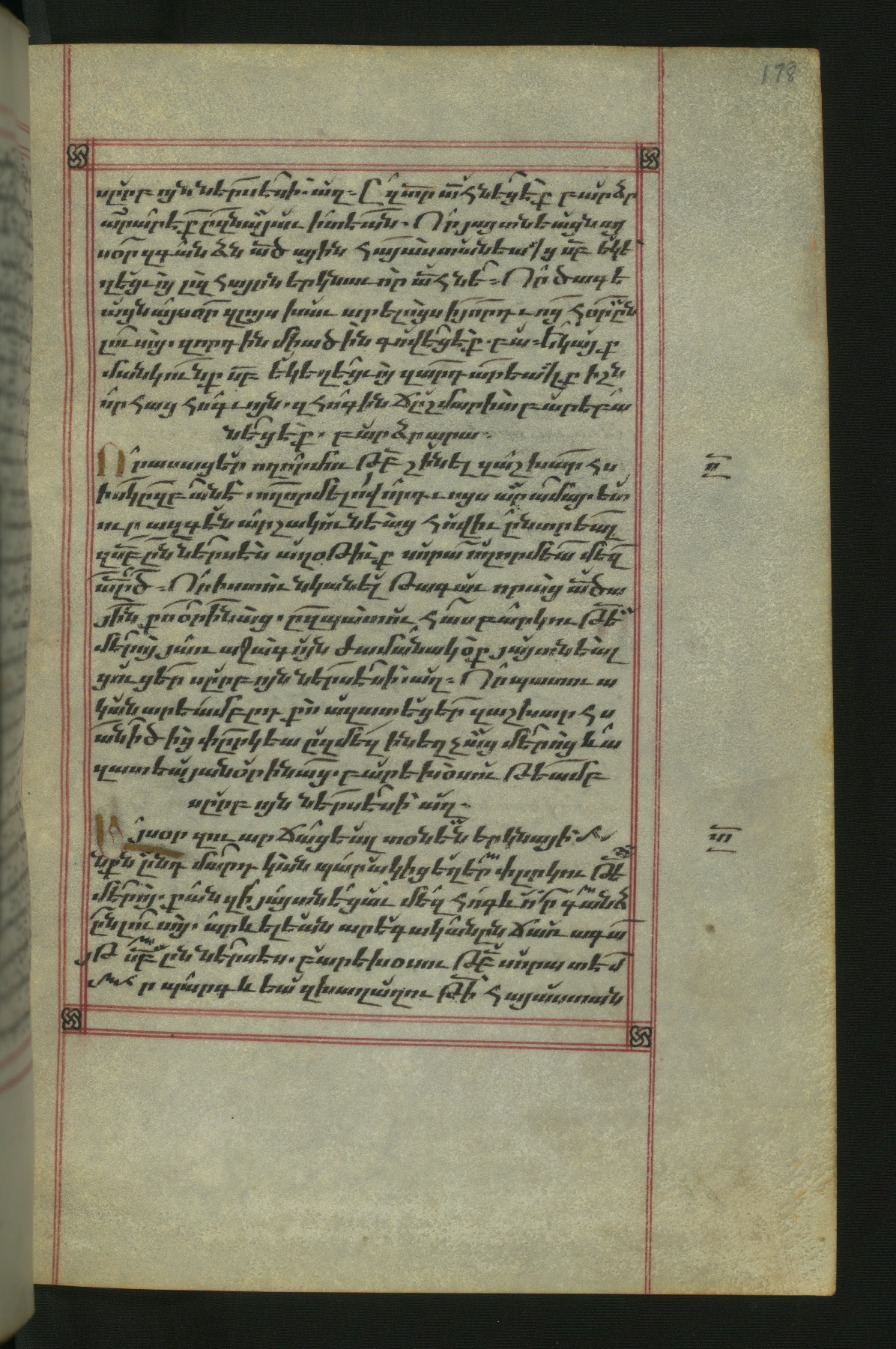 This hymnal was completed in Constantinople on August 15, 1678 [AE 1127], by the priest Yakob Pēligratc‘i, having been commissioned by Člav, son of Nawasard, as a dedication to his sons, Astuacatur and Sahak. The structure of the hymns adheres approximately to the standard Armenian hymnal (Շաբակնոց), with minor variations in order and a few substitutions (see Sanjian in the bibliography). The book is illuminated extensively, with thirty-eight full- and half-page polychrome miniatures against gold backgrounds, eight decorated head-pieces marking the principal divisions of the hymnal, and numerous marginal miniatures marking individual hymns, including biblical figures, saints, bishops, and vignettes. The style of the miniatures is largely in imitation of western European models, though more traditional Armenian and Byzantine influences stand out, such as the vibrant color palette, an iconic frontality for depictions of saints and bishops, and the highly abstracted floral motifs and zoomorphic incipits marking hymn divisions.