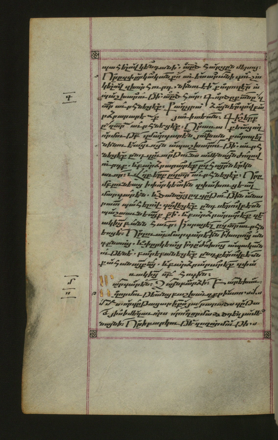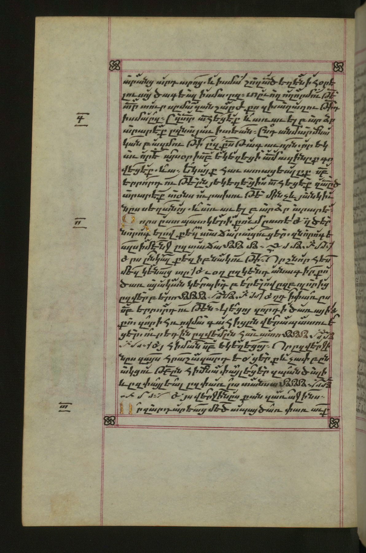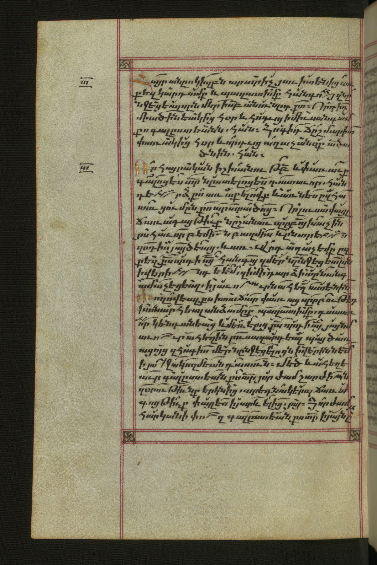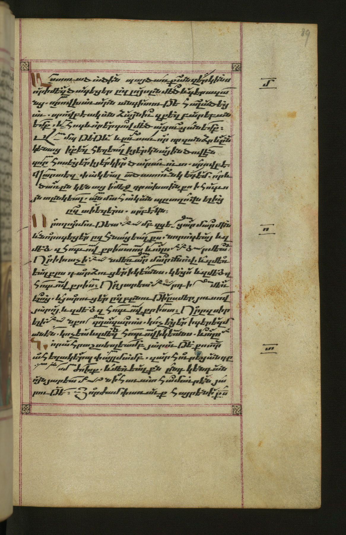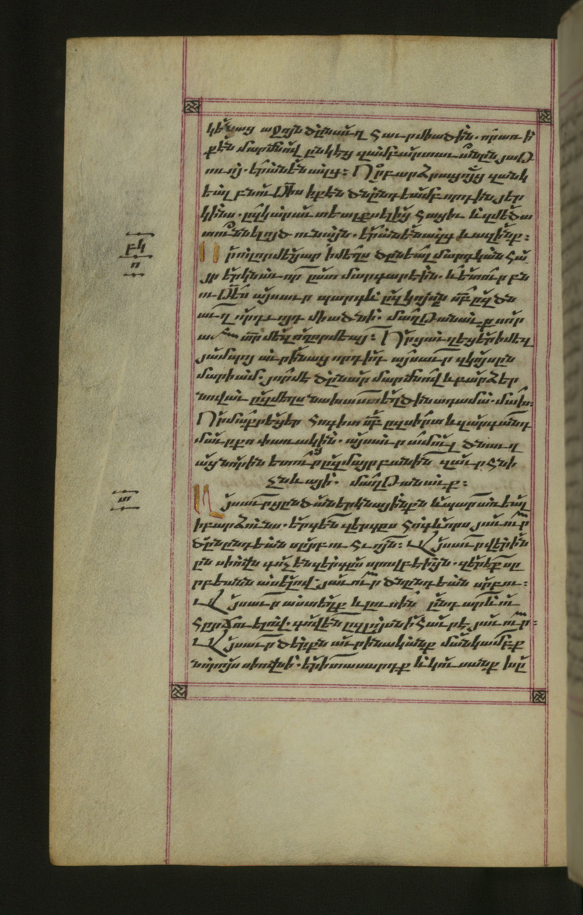 This hymnal was completed in Constantinople on August 15, 1678 [AE 1127], by the priest Yakob Pēligratc‘i, having been commissioned by Člav, son of Nawasard, as a dedication to his sons, Astuacatur and Sahak. The structure of the hymns adheres approximately to the standard Armenian hymnal (Շաբակնոց), with minor variations in order and a few substitutions (see Sanjian in the bibliography). The book is illuminated extensively, with thirty-eight full- and half-page polychrome miniatures against gold backgrounds, eight decorated head-pieces marking the principal divisions of the hymnal, and numerous marginal miniatures marking individual hymns, including biblical figures, saints, bishops, and vignettes. The style of the miniatures is largely in imitation of western European models, though more traditional Armenian and Byzantine influences stand out, such as the vibrant color palette, an iconic frontality for depictions of saints and bishops, and the highly abstracted floral motifs and zoomorphic incipits marking hymn divisions.