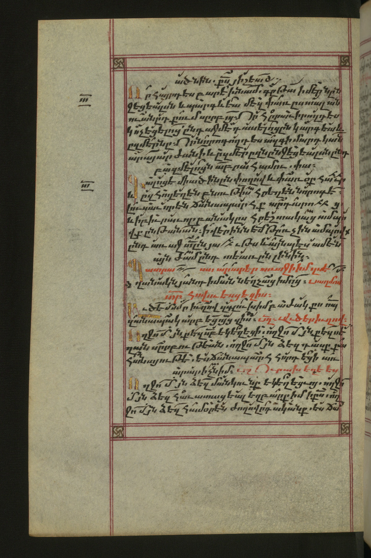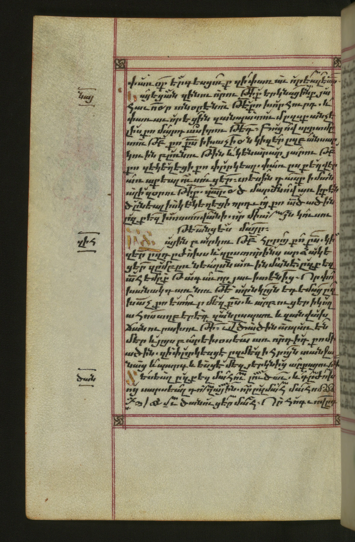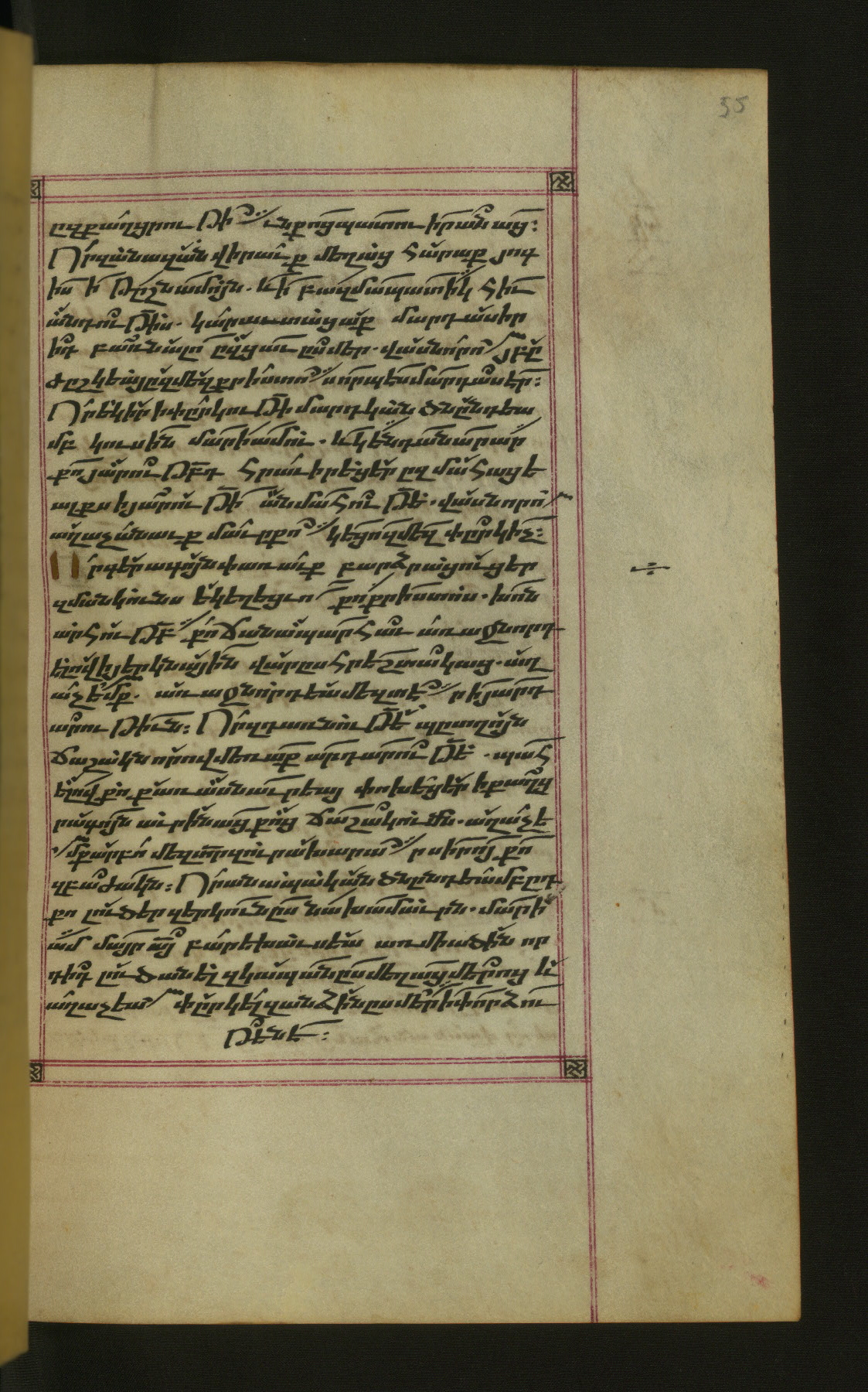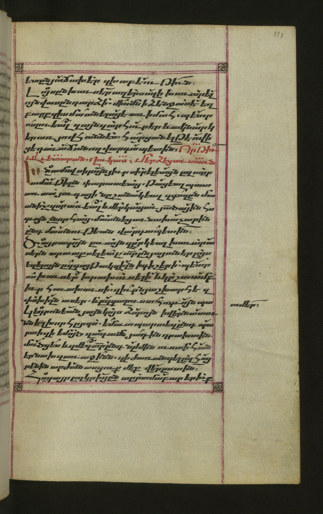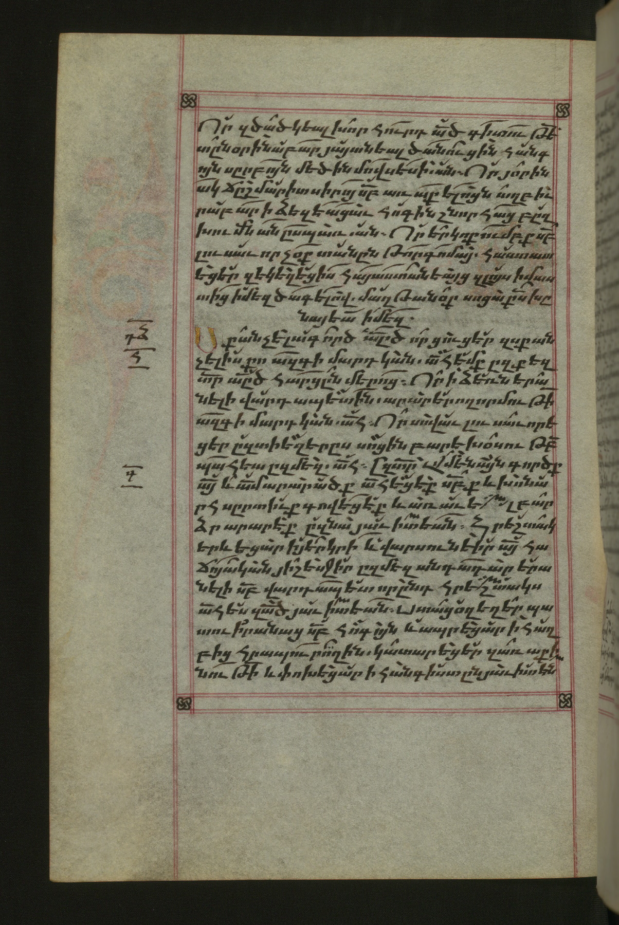 This hymnal was completed in Constantinople on August 15, 1678 [AE 1127], by the priest Yakob Pēligratc‘i, having been commissioned by Člav, son of Nawasard, as a dedication to his sons, Astuacatur and Sahak. The structure of the hymns adheres approximately to the standard Armenian hymnal (Շաբակնոց), with minor variations in order and a few substitutions (see Sanjian in the bibliography). The book is illuminated extensively, with thirty-eight full- and half-page polychrome miniatures against gold backgrounds, eight decorated head-pieces marking the principal divisions of the hymnal, and numerous marginal miniatures marking individual hymns, including biblical figures, saints, bishops, and vignettes. The style of the miniatures is largely in imitation of western European models, though more traditional Armenian and Byzantine influences stand out, such as the vibrant color palette, an iconic frontality for depictions of saints and bishops, and the highly abstracted floral motifs and zoomorphic incipits marking hymn divisions.