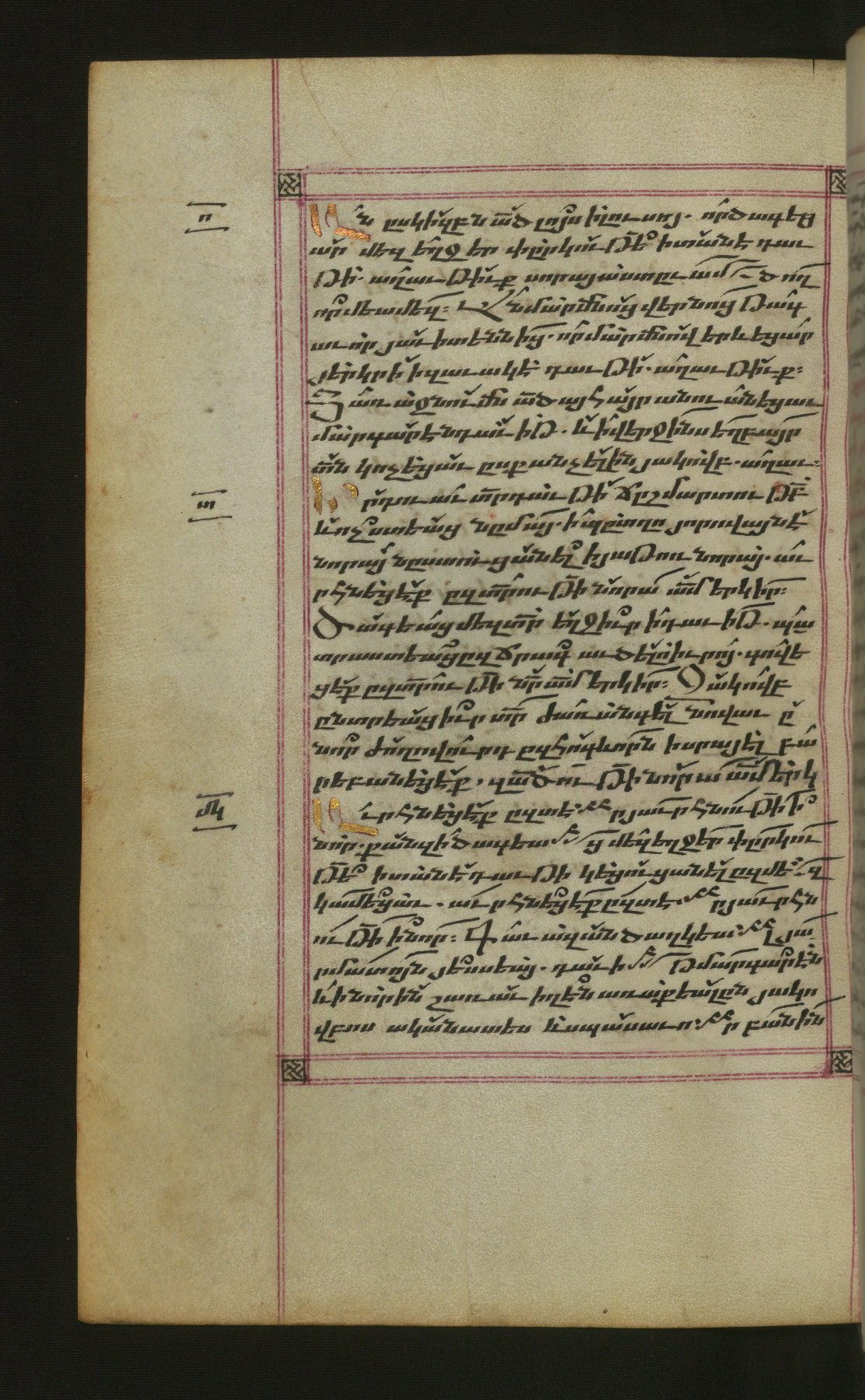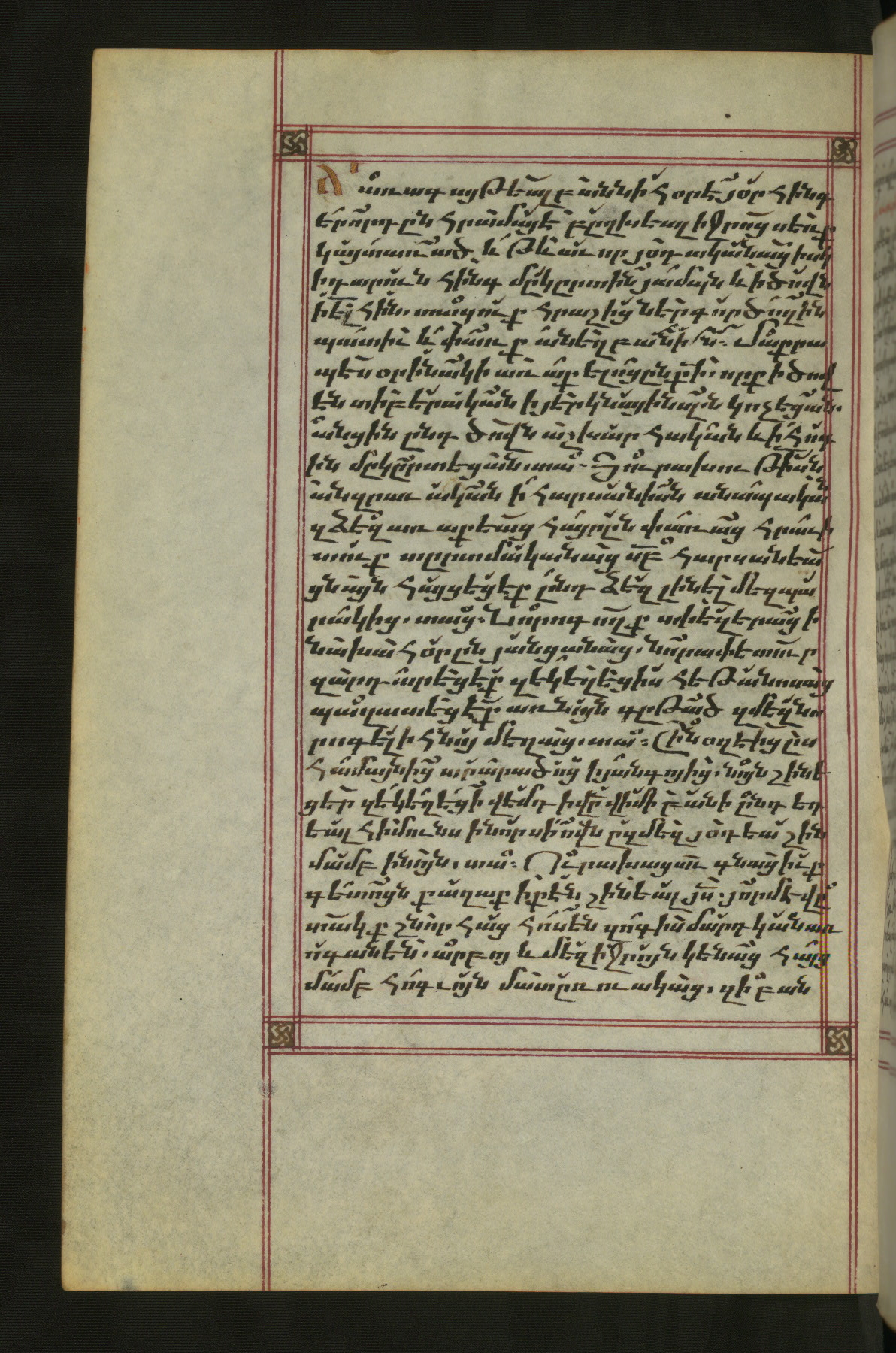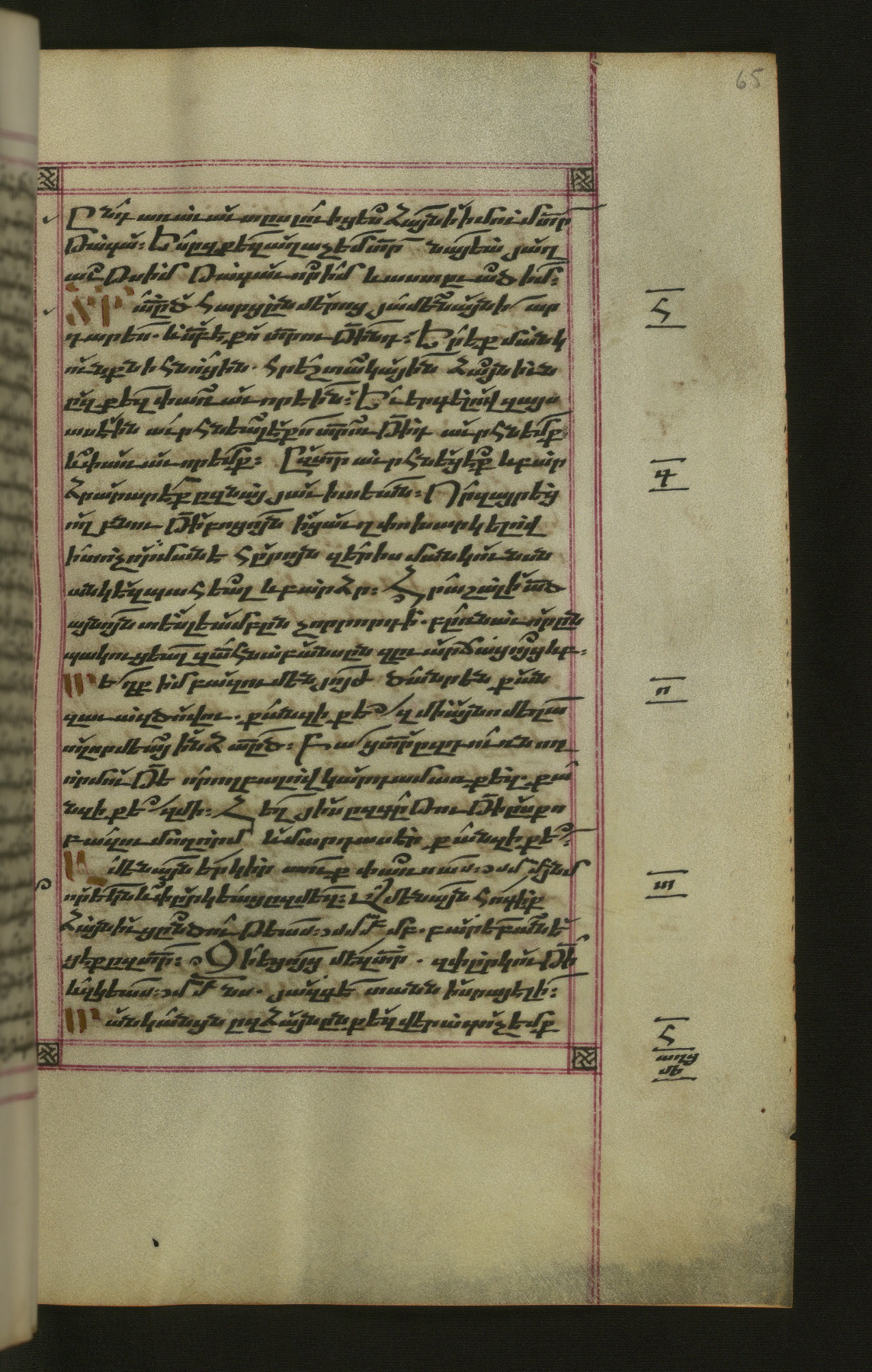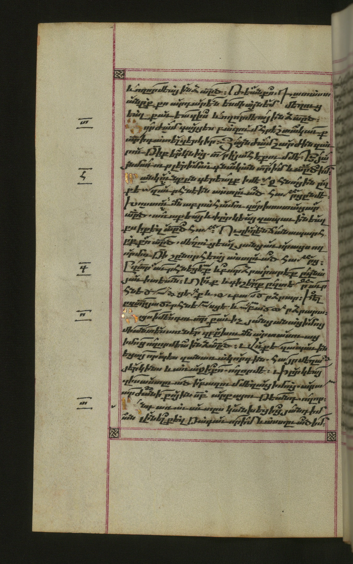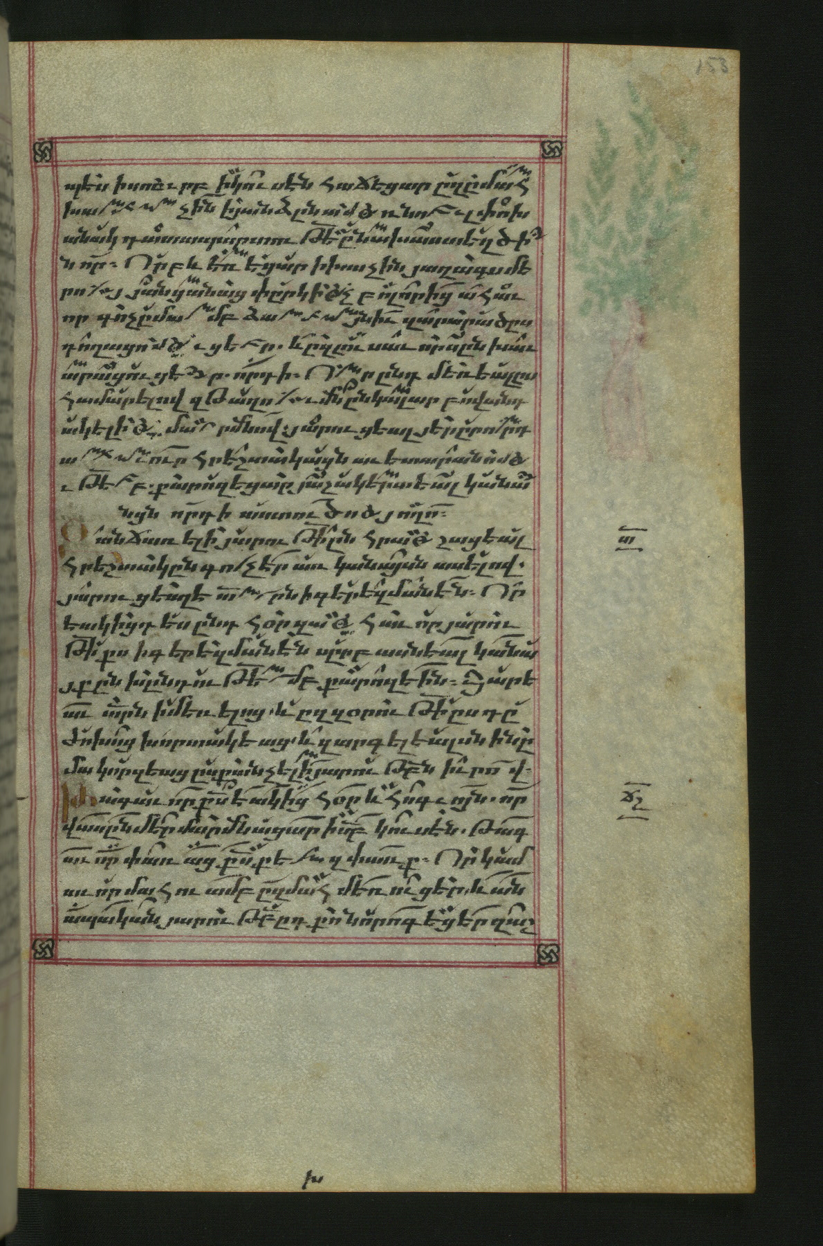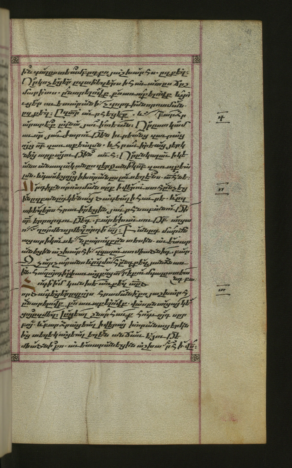 This hymnal was completed in Constantinople on August 15, 1678 [AE 1127], by the priest Yakob Pēligratc‘i, having been commissioned by Člav, son of Nawasard, as a dedication to his sons, Astuacatur and Sahak. The structure of the hymns adheres approximately to the standard Armenian hymnal (Շաբակնոց), with minor variations in order and a few substitutions (see Sanjian in the bibliography). The book is illuminated extensively, with thirty-eight full- and half-page polychrome miniatures against gold backgrounds, eight decorated head-pieces marking the principal divisions of the hymnal, and numerous marginal miniatures marking individual hymns, including biblical figures, saints, bishops, and vignettes. The style of the miniatures is largely in imitation of western European models, though more traditional Armenian and Byzantine influences stand out, such as the vibrant color palette, an iconic frontality for depictions of saints and bishops, and the highly abstracted floral motifs and zoomorphic incipits marking hymn divisions.