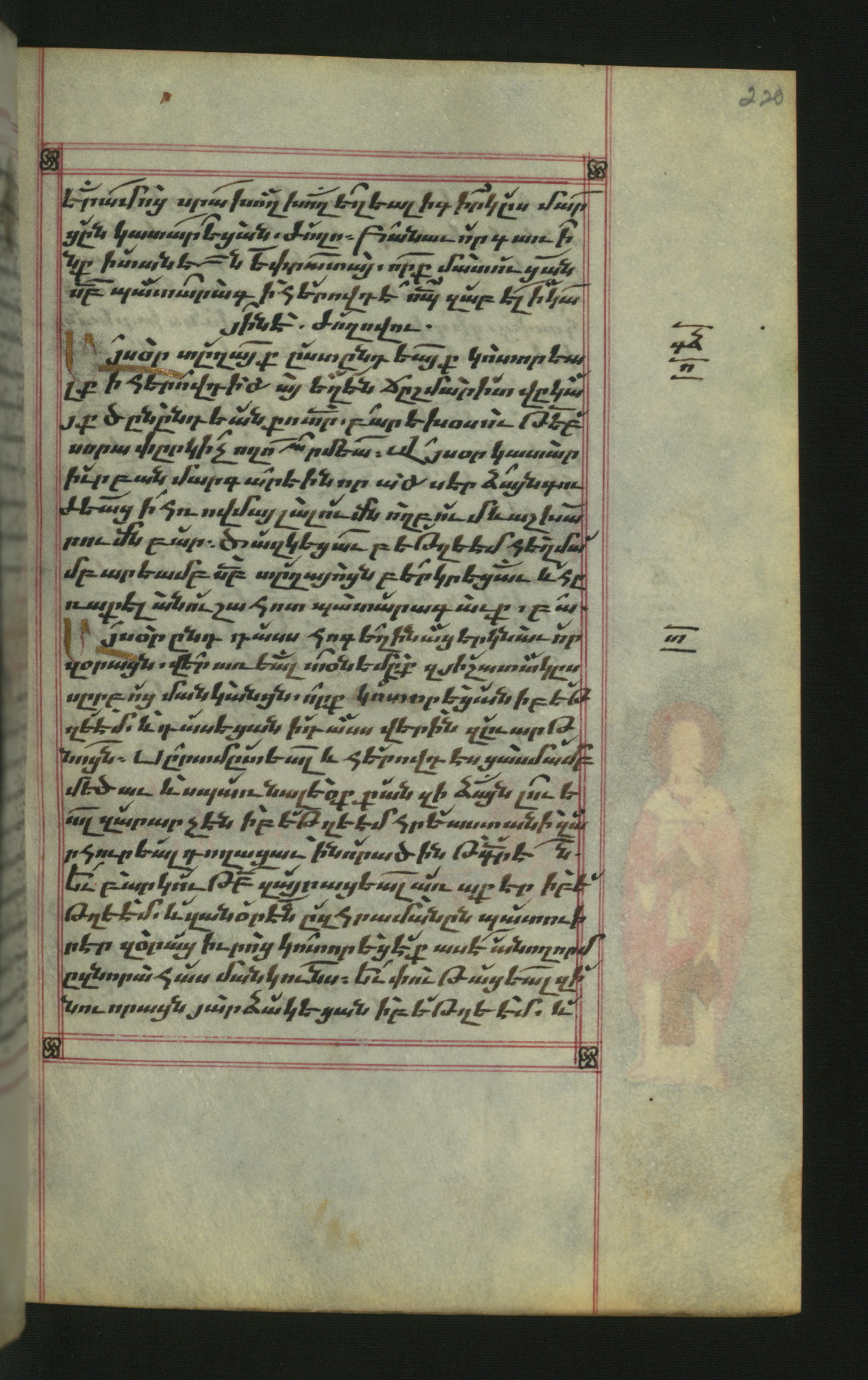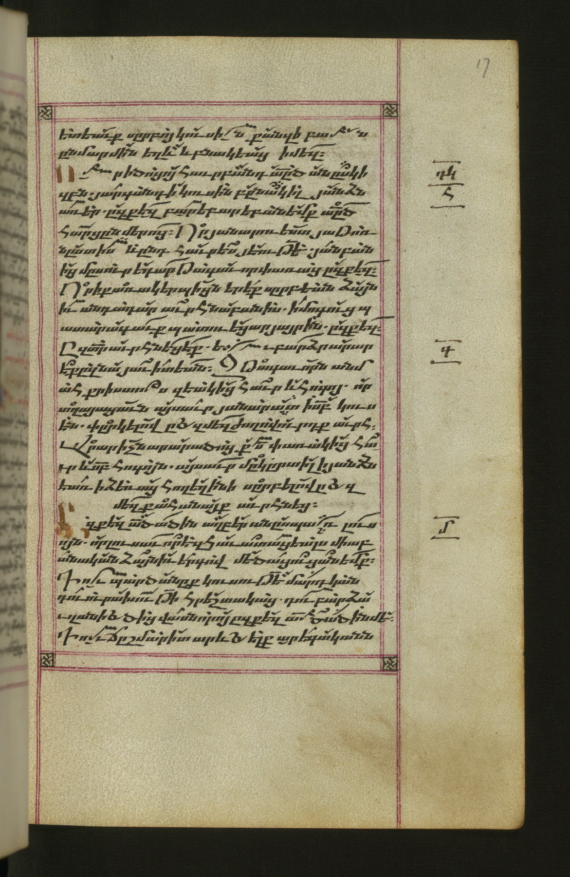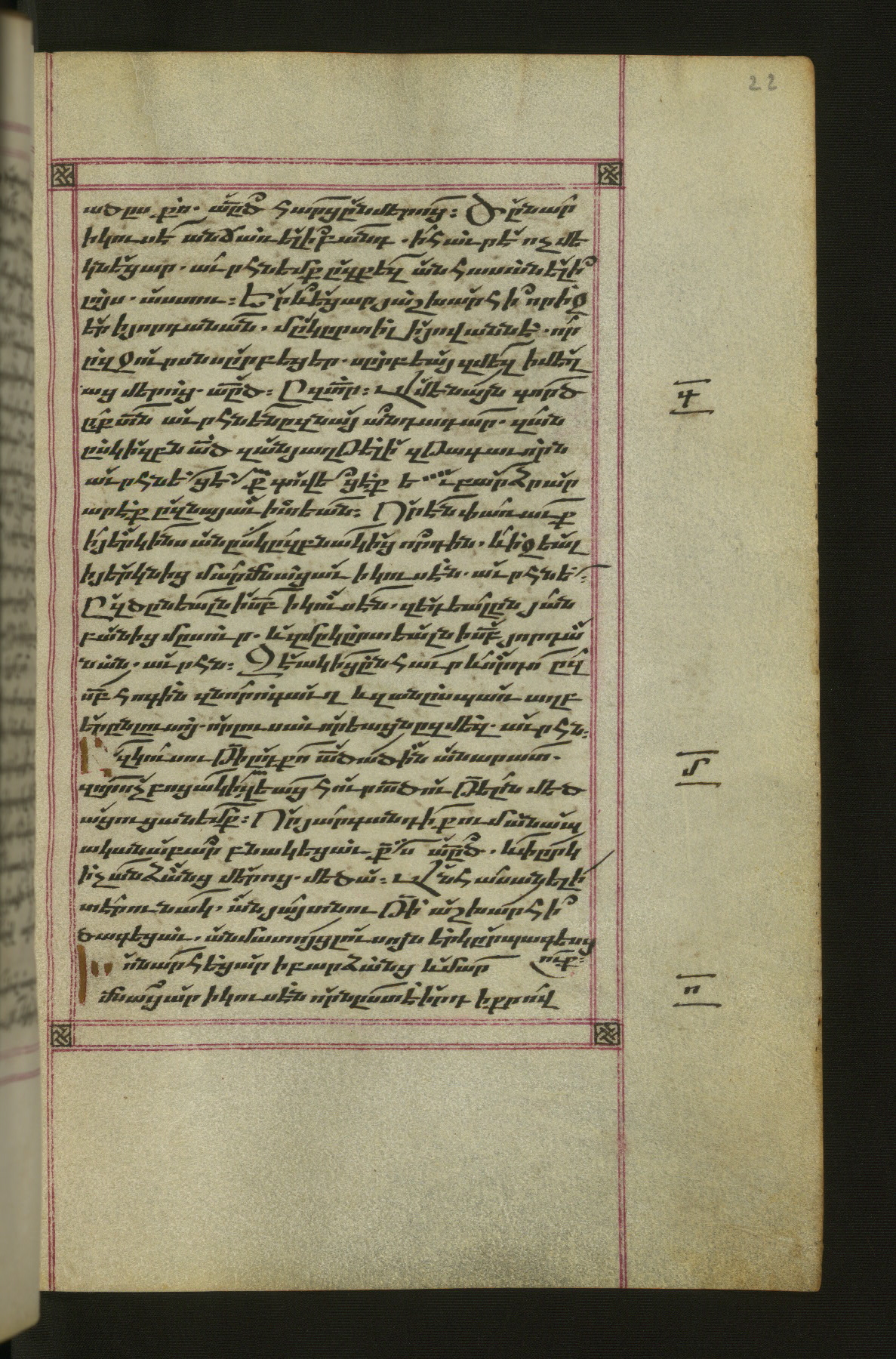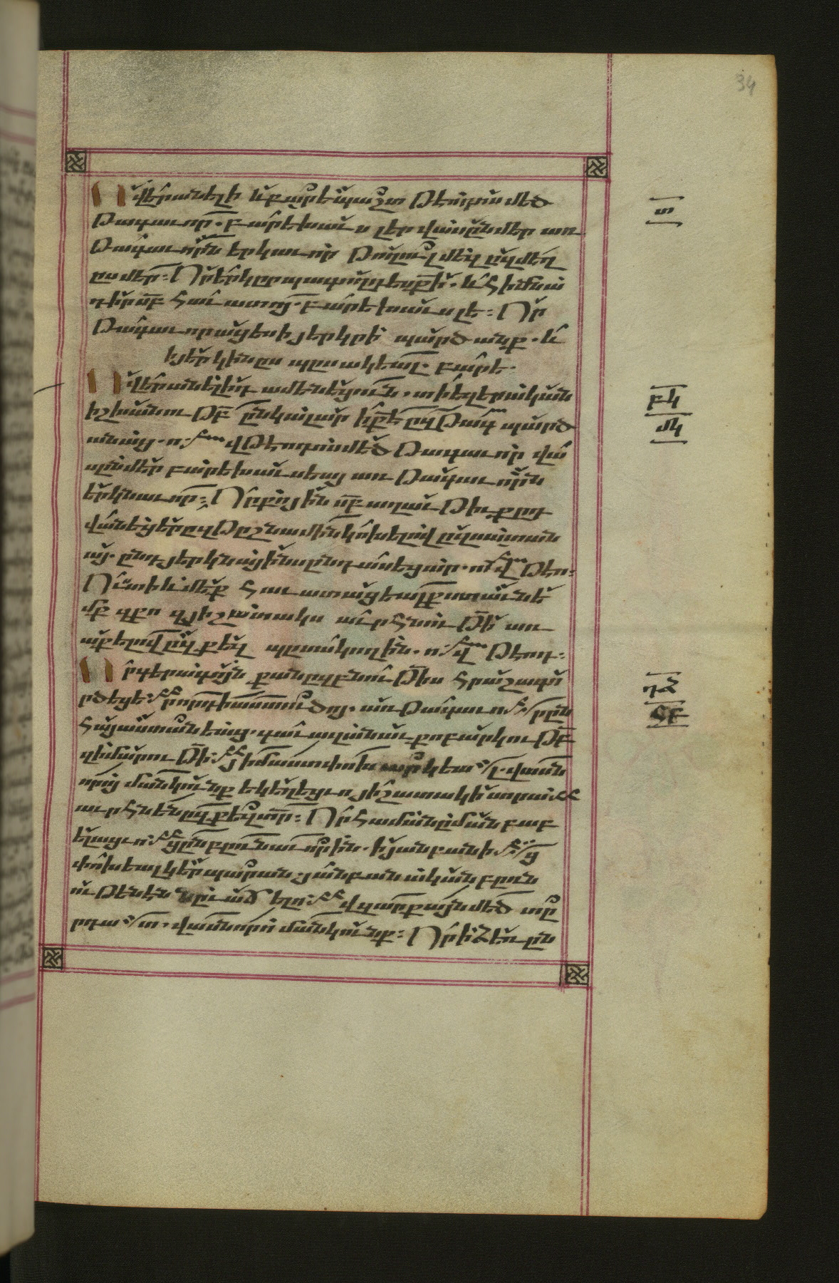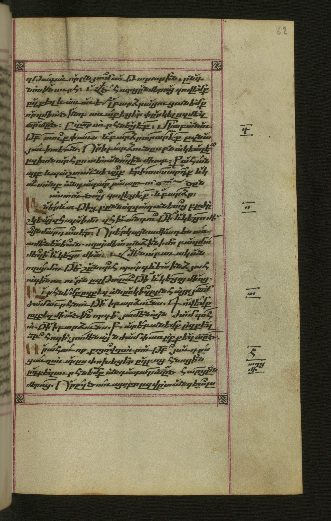 This hymnal was completed in Constantinople on August 15, 1678 [AE 1127], by the priest Yakob Pēligratc‘i, having been commissioned by Člav, son of Nawasard, as a dedication to his sons, Astuacatur and Sahak. The structure of the hymns adheres approximately to the standard Armenian hymnal (Շաբակնոց), with minor variations in order and a few substitutions (see Sanjian in the bibliography). The book is illuminated extensively, with thirty-eight full- and half-page polychrome miniatures against gold backgrounds, eight decorated head-pieces marking the principal divisions of the hymnal, and numerous marginal miniatures marking individual hymns, including biblical figures, saints, bishops, and vignettes. The style of the miniatures is largely in imitation of western European models, though more traditional Armenian and Byzantine influences stand out, such as the vibrant color palette, an iconic frontality for depictions of saints and bishops, and the highly abstracted floral motifs and zoomorphic incipits marking hymn divisions.