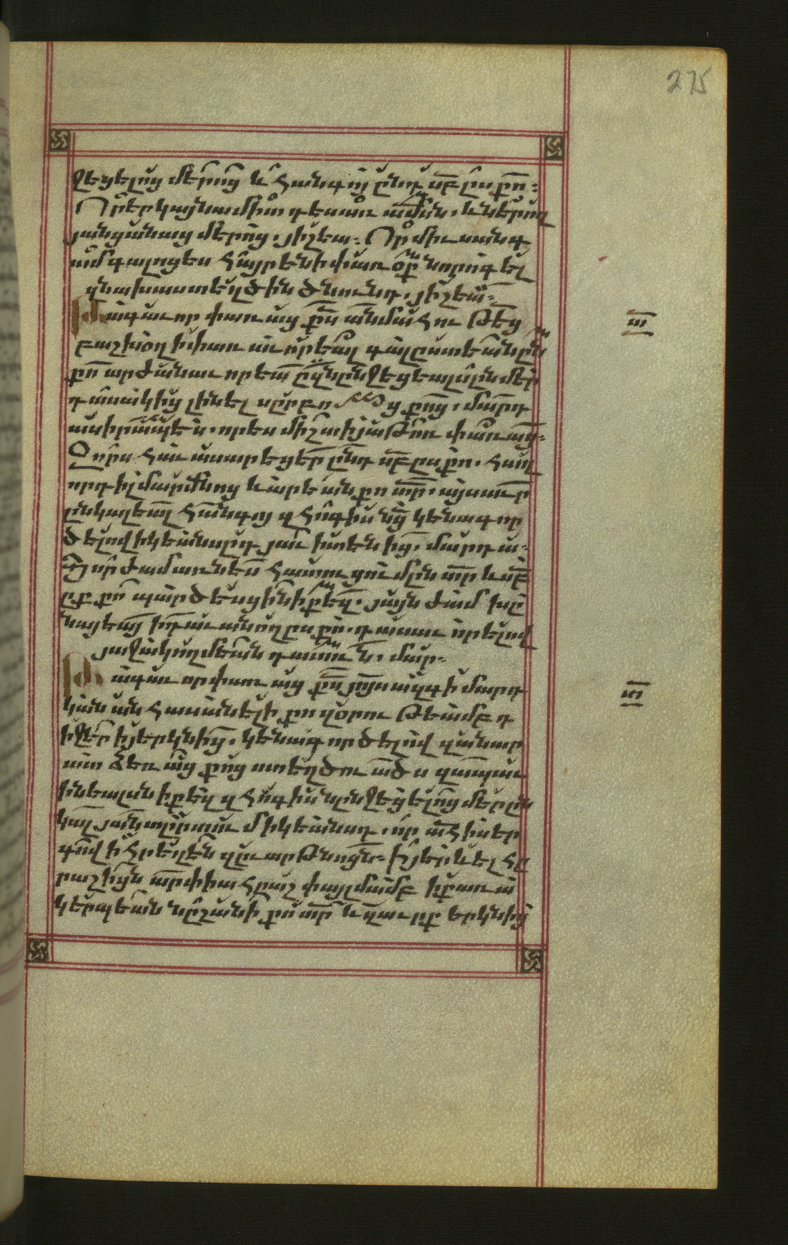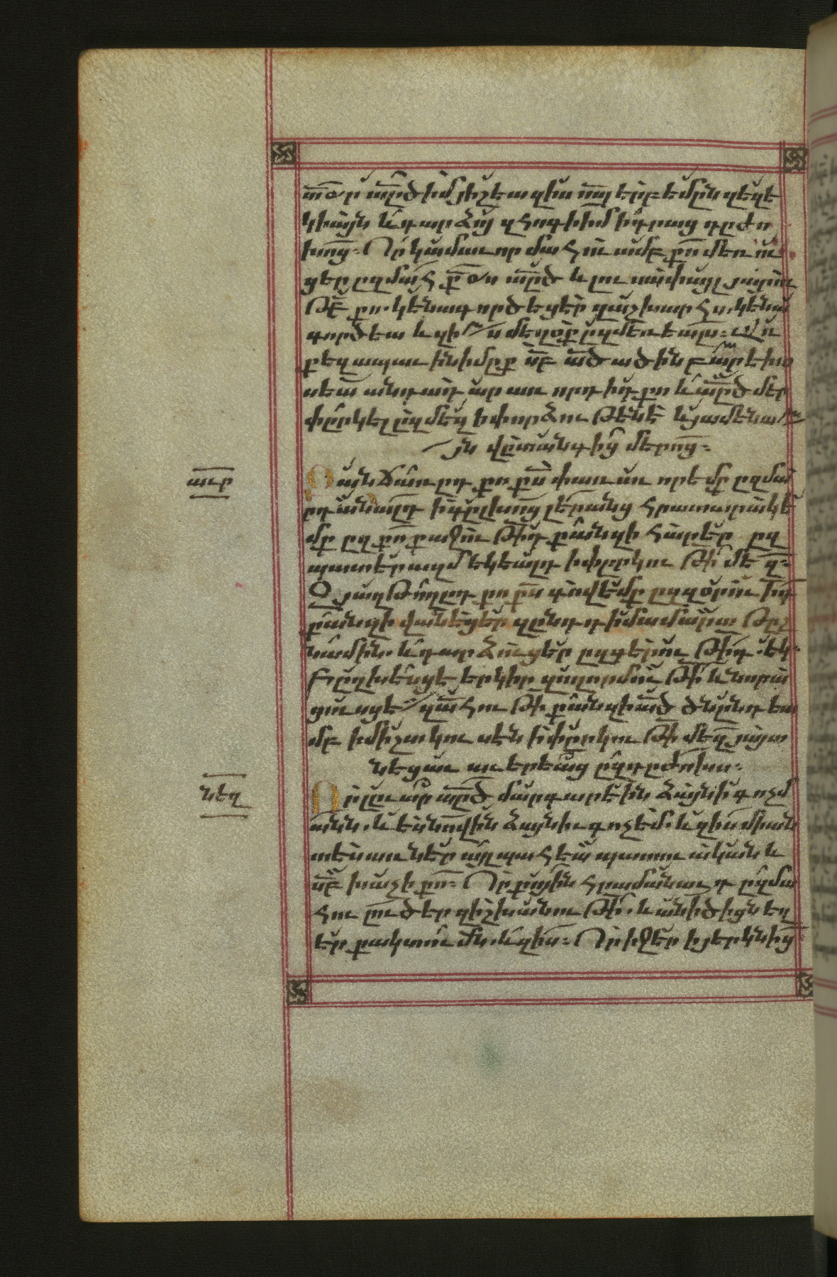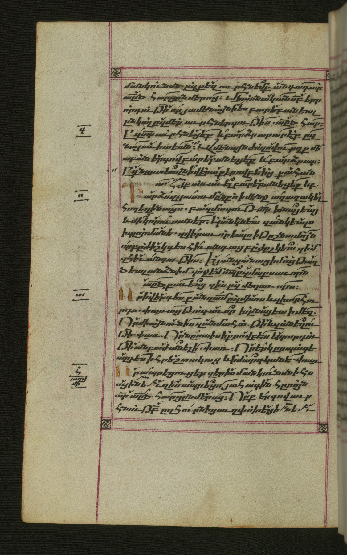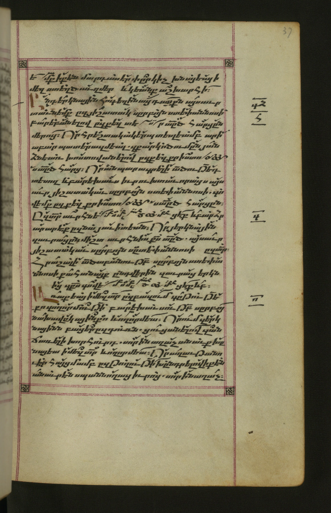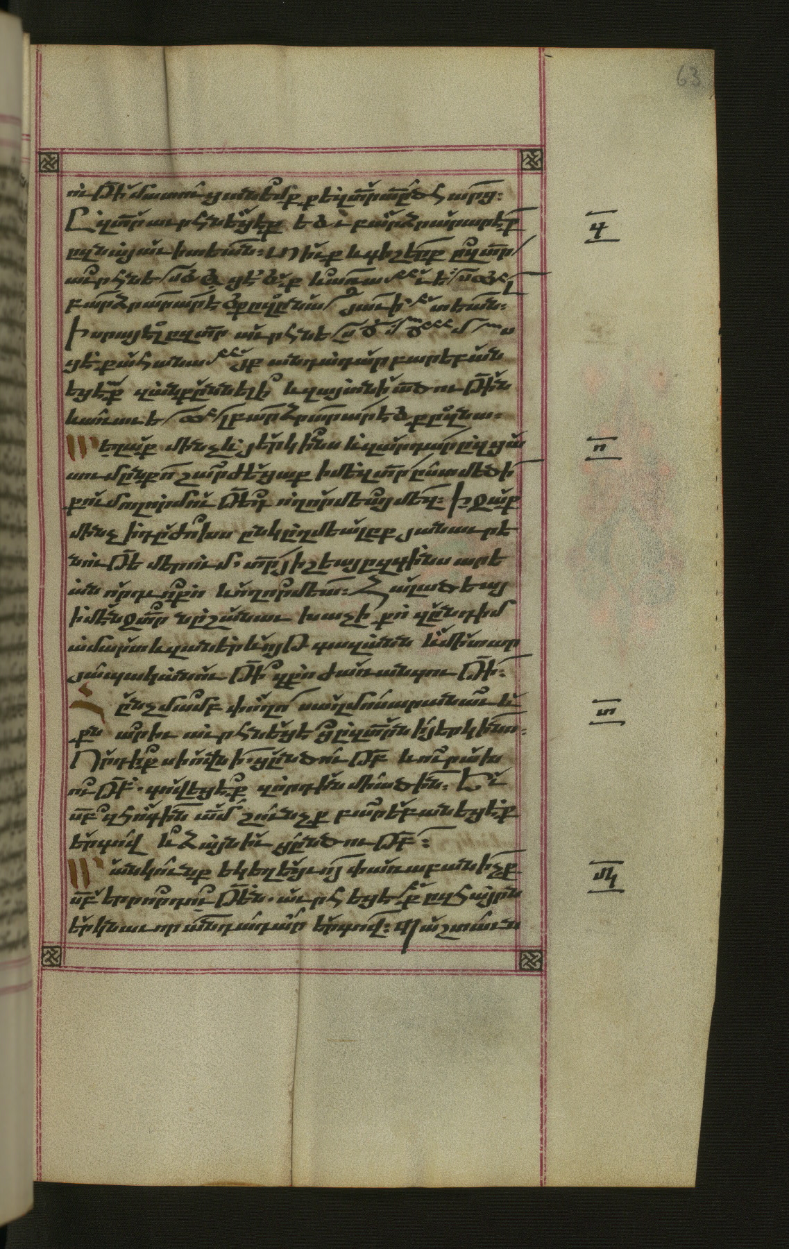 This hymnal was completed in Constantinople on August 15, 1678 [AE 1127], by the priest Yakob Pēligratc‘i, having been commissioned by Člav, son of Nawasard, as a dedication to his sons, Astuacatur and Sahak. The structure of the hymns adheres approximately to the standard Armenian hymnal (Շաբակնոց), with minor variations in order and a few substitutions (see Sanjian in the bibliography). The book is illuminated extensively, with thirty-eight full- and half-page polychrome miniatures against gold backgrounds, eight decorated head-pieces marking the principal divisions of the hymnal, and numerous marginal miniatures marking individual hymns, including biblical figures, saints, bishops, and vignettes. The style of the miniatures is largely in imitation of western European models, though more traditional Armenian and Byzantine influences stand out, such as the vibrant color palette, an iconic frontality for depictions of saints and bishops, and the highly abstracted floral motifs and zoomorphic incipits marking hymn divisions.