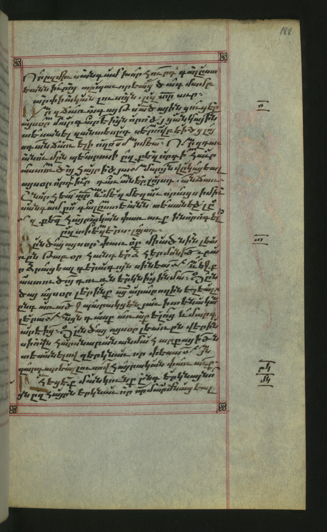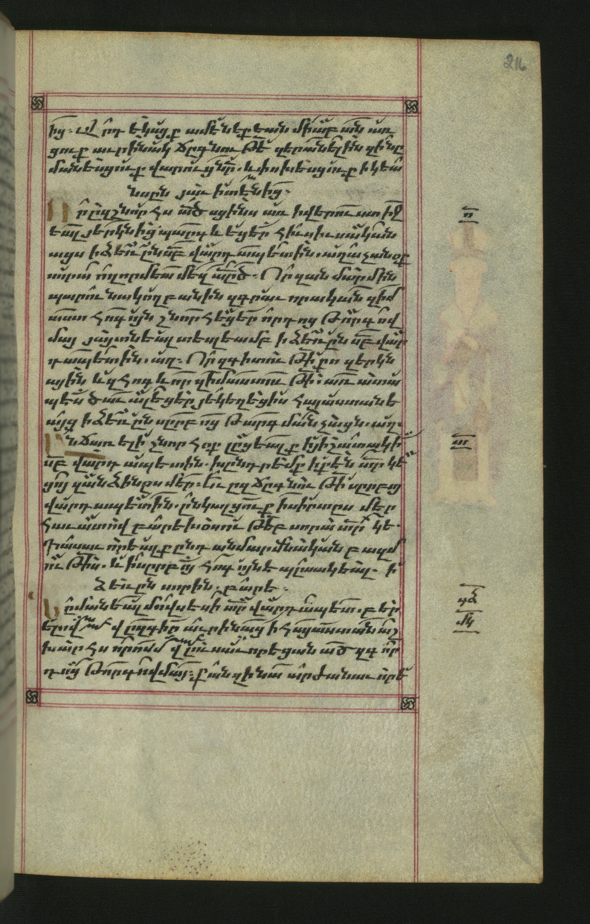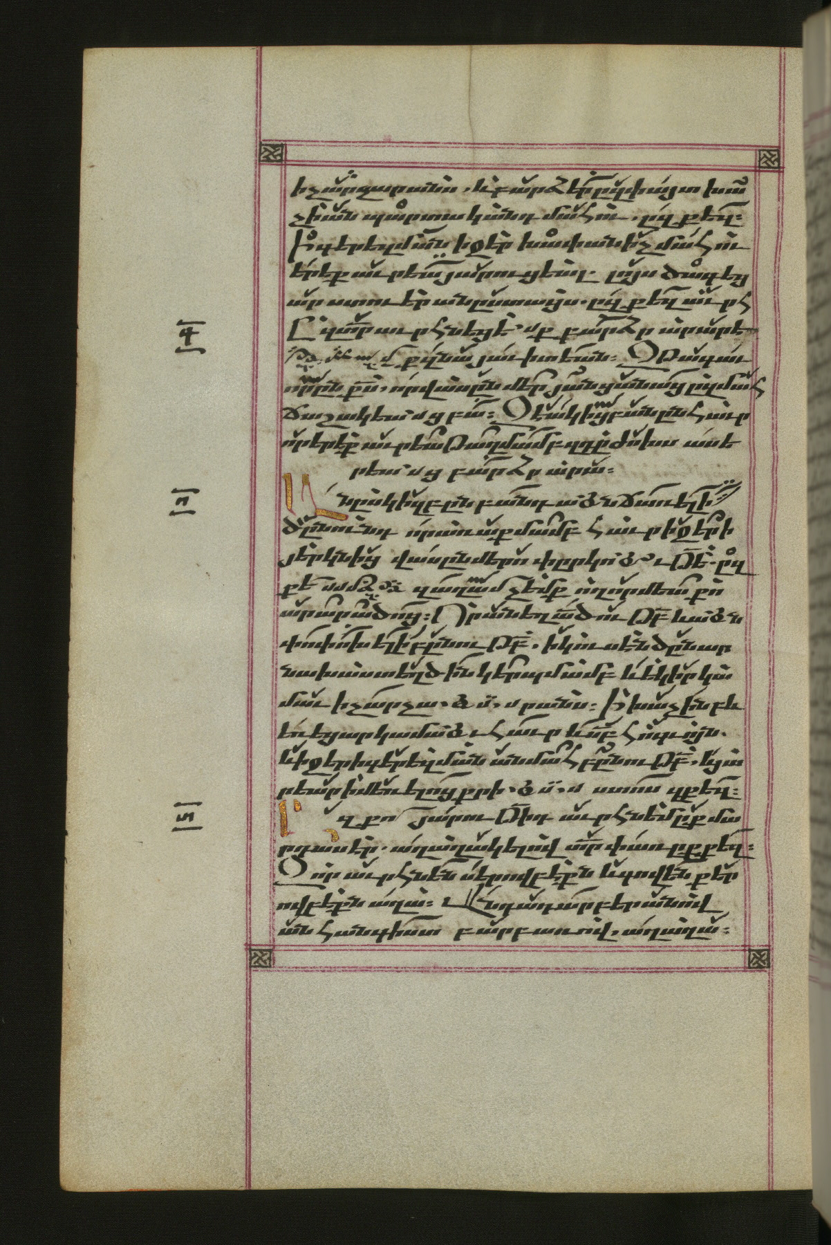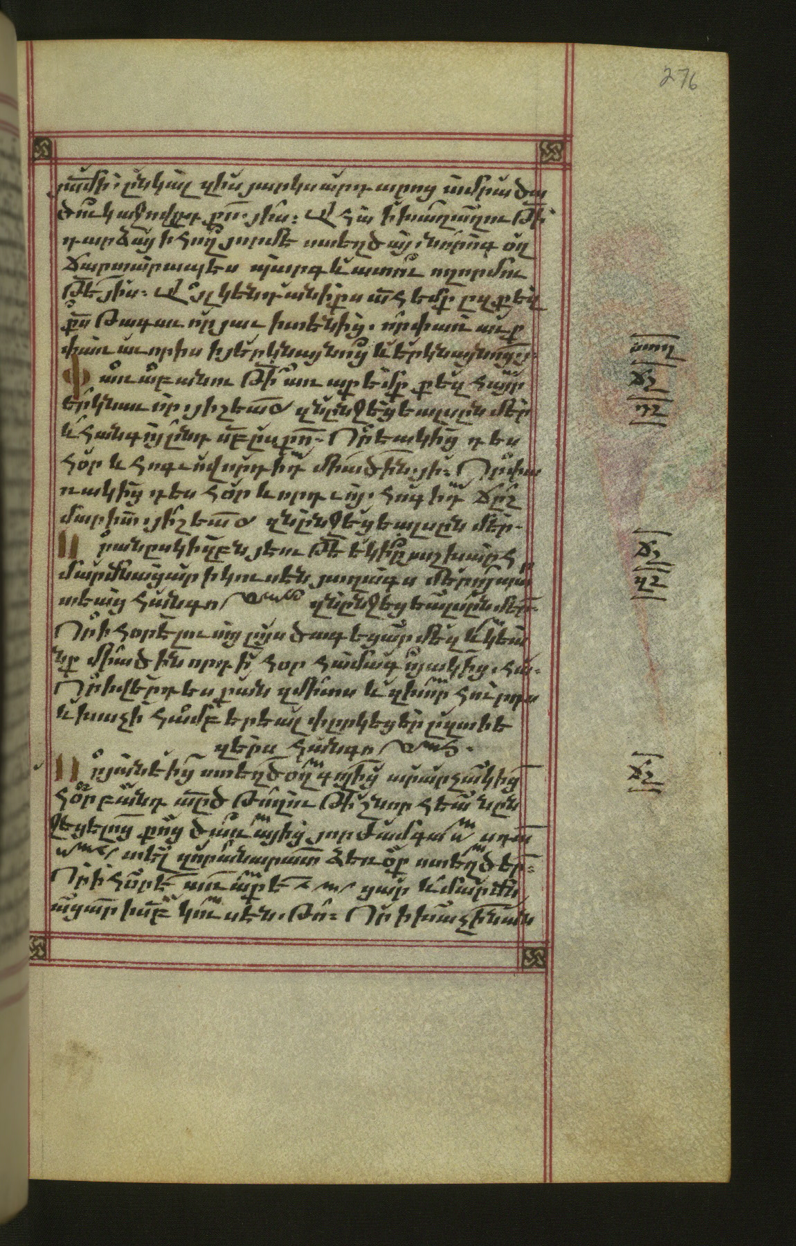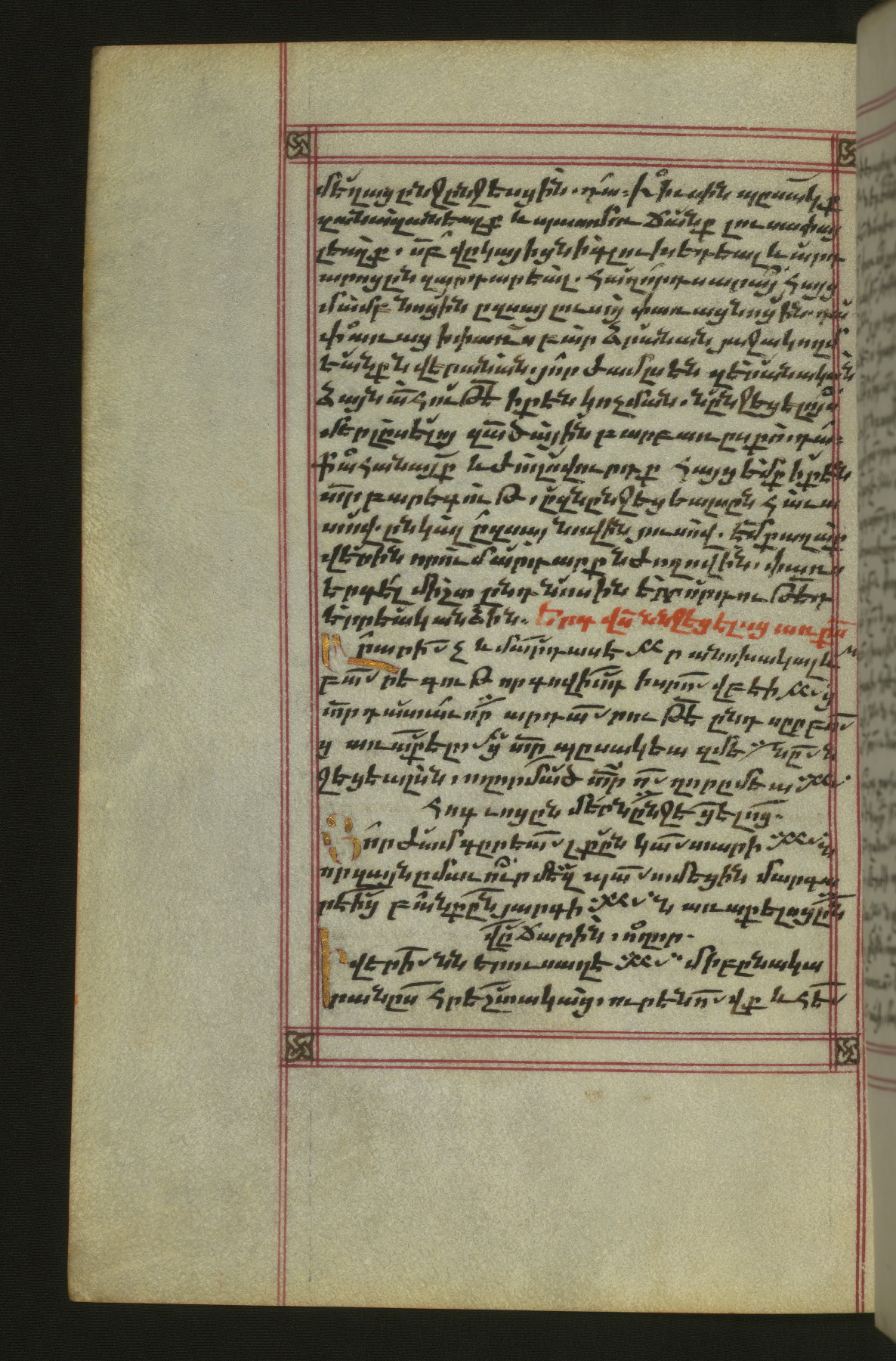 This hymnal was completed in Constantinople on August 15, 1678 [AE 1127], by the priest Yakob Pēligratc‘i, having been commissioned by Člav, son of Nawasard, as a dedication to his sons, Astuacatur and Sahak. The structure of the hymns adheres approximately to the standard Armenian hymnal (Շաբակնոց), with minor variations in order and a few substitutions (see Sanjian in the bibliography). The book is illuminated extensively, with thirty-eight full- and half-page polychrome miniatures against gold backgrounds, eight decorated head-pieces marking the principal divisions of the hymnal, and numerous marginal miniatures marking individual hymns, including biblical figures, saints, bishops, and vignettes. The style of the miniatures is largely in imitation of western European models, though more traditional Armenian and Byzantine influences stand out, such as the vibrant color palette, an iconic frontality for depictions of saints and bishops, and the highly abstracted floral motifs and zoomorphic incipits marking hymn divisions.