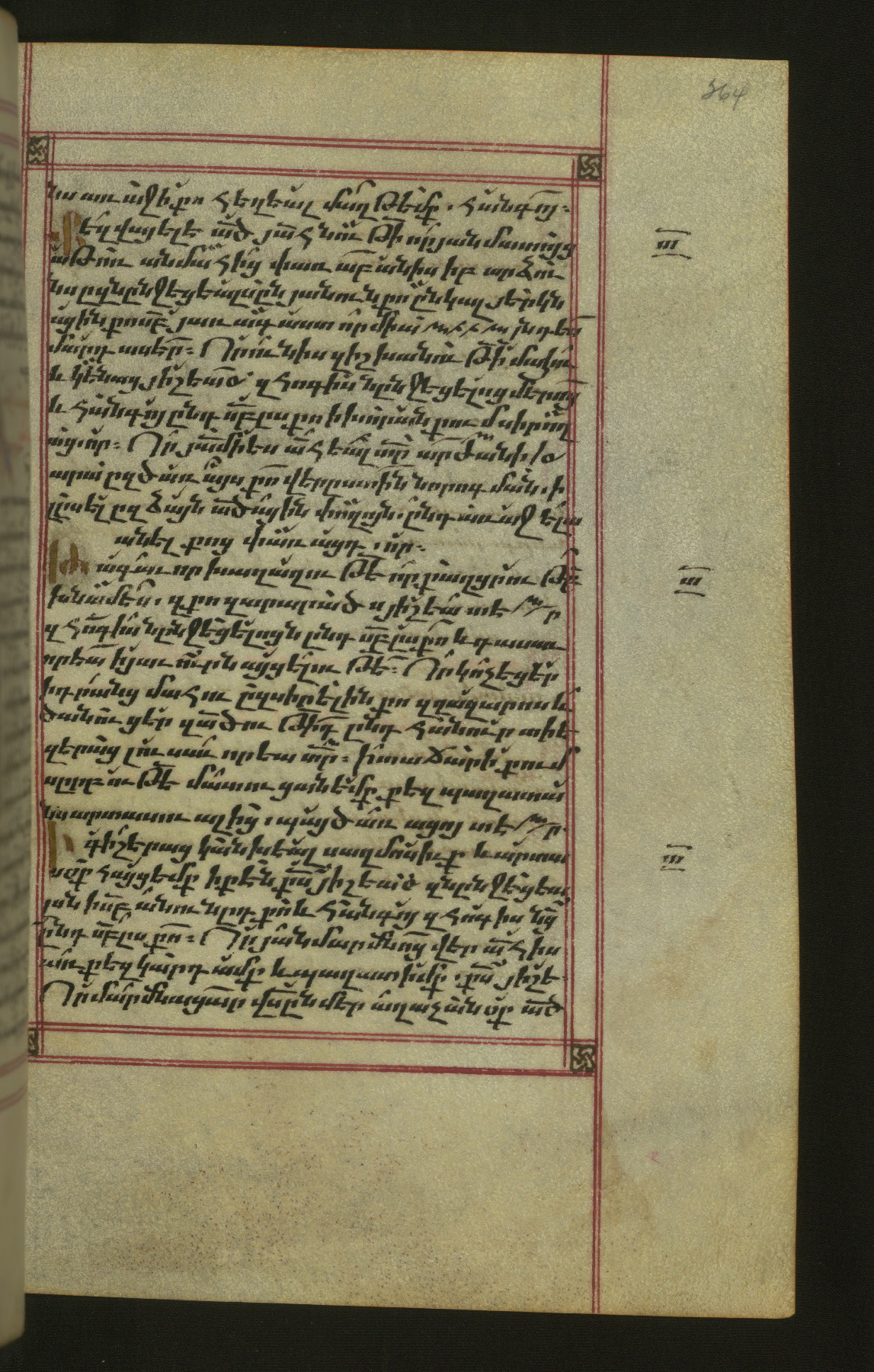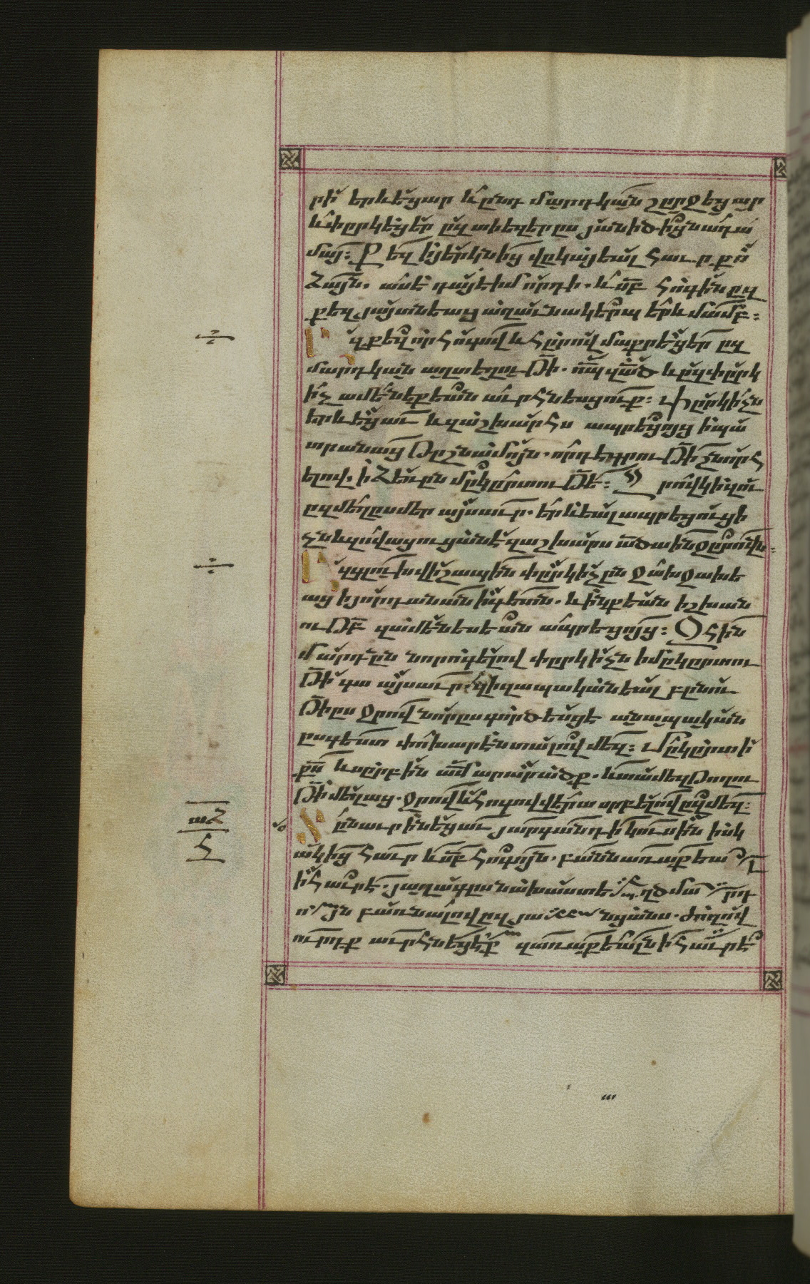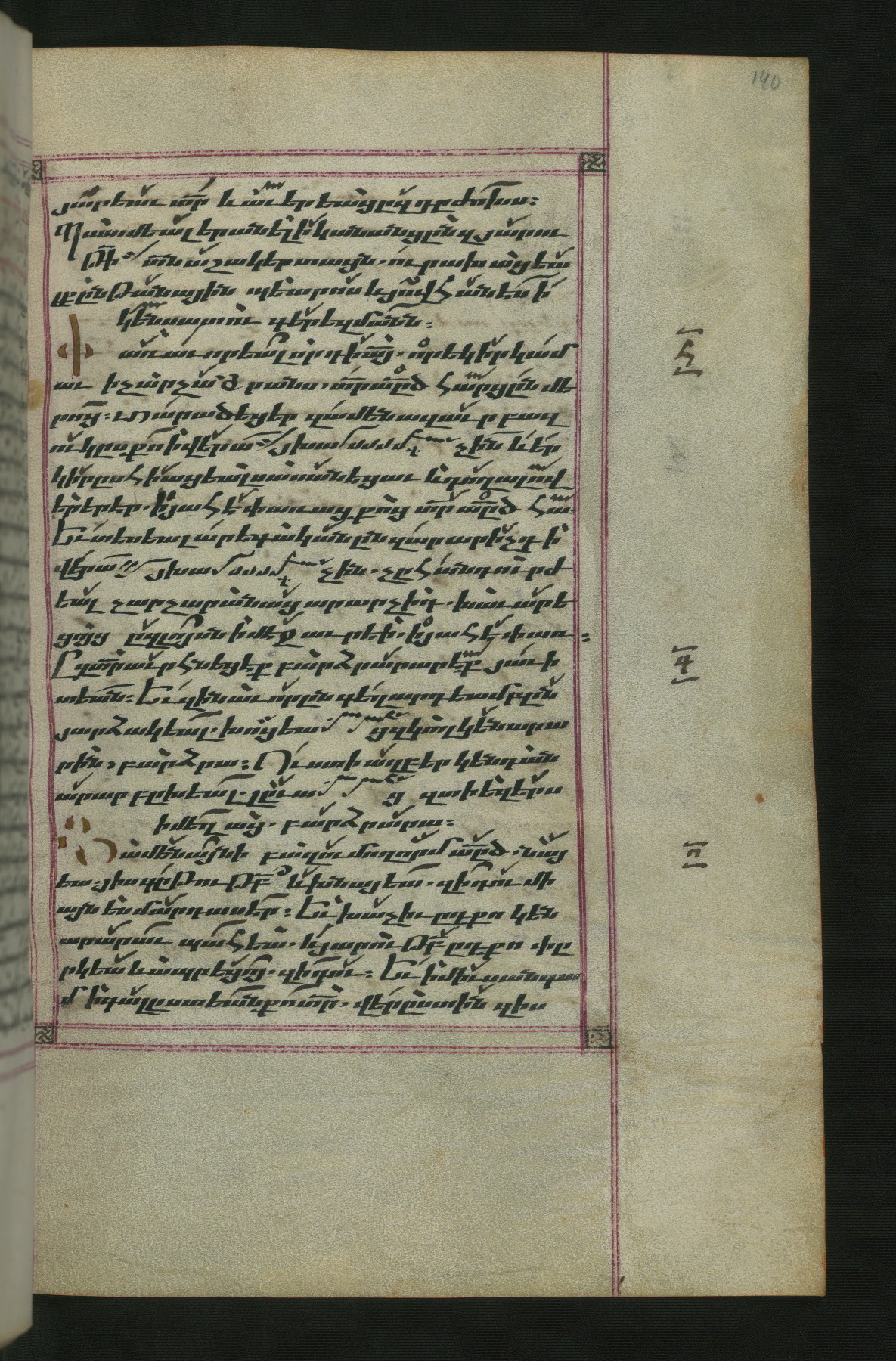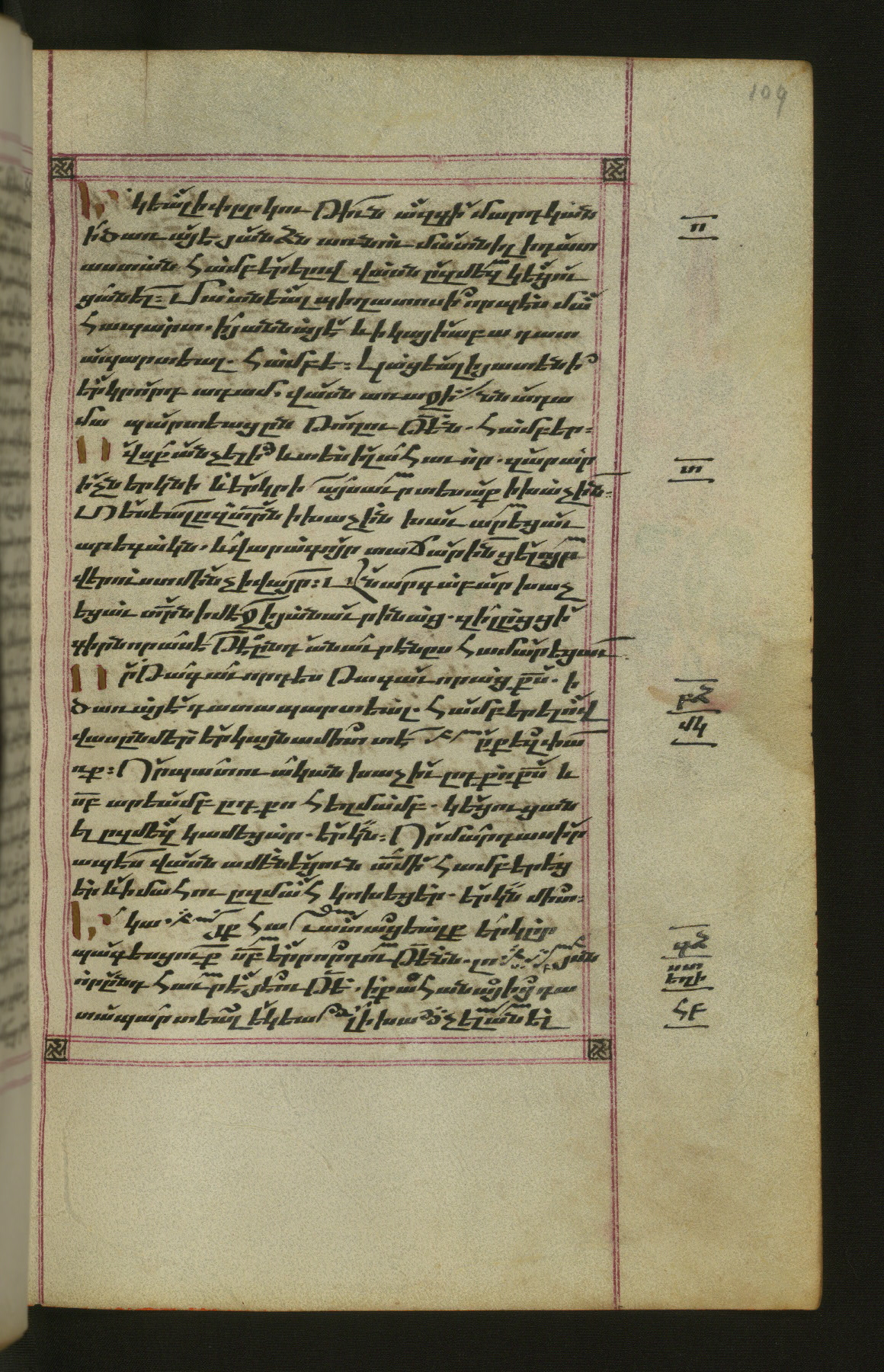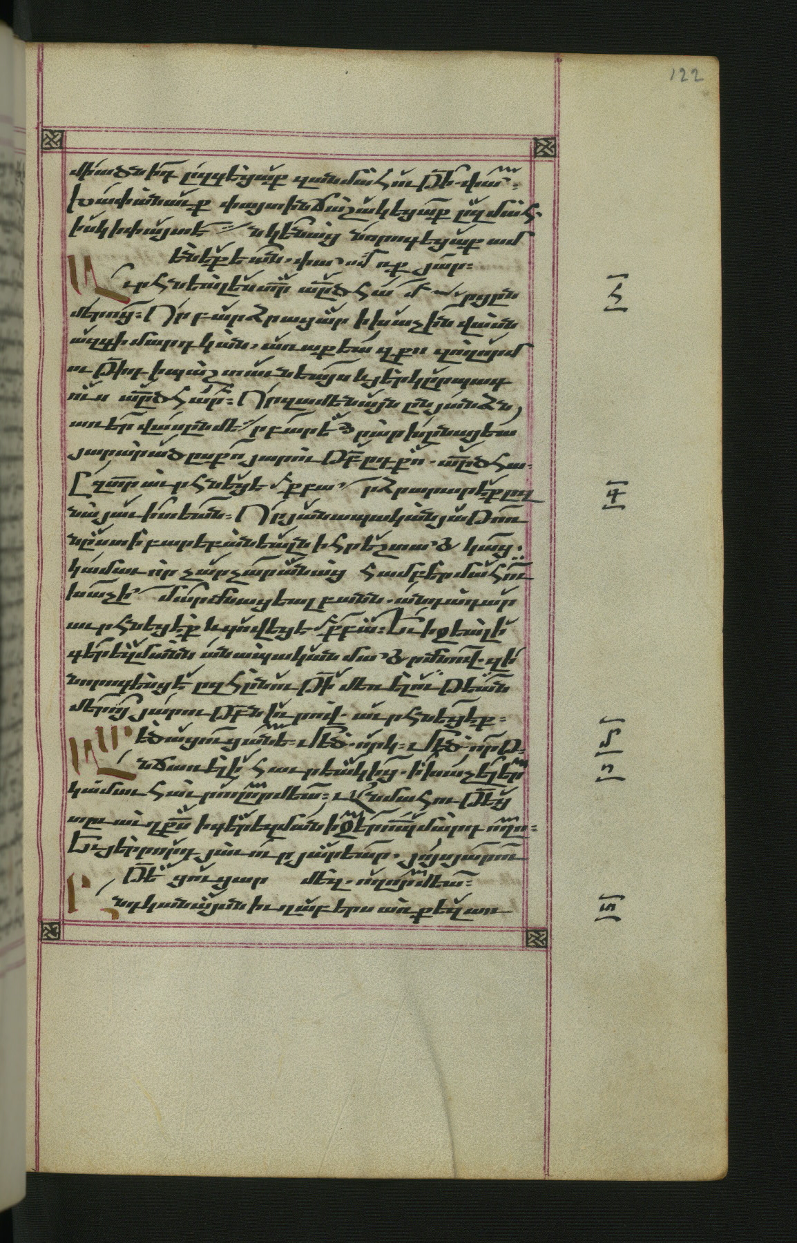 This hymnal was completed in Constantinople on August 15, 1678 [AE 1127], by the priest Yakob Pēligratc‘i, having been commissioned by Člav, son of Nawasard, as a dedication to his sons, Astuacatur and Sahak. The structure of the hymns adheres approximately to the standard Armenian hymnal (Շաբակնոց), with minor variations in order and a few substitutions (see Sanjian in the bibliography). The book is illuminated extensively, with thirty-eight full- and half-page polychrome miniatures against gold backgrounds, eight decorated head-pieces marking the principal divisions of the hymnal, and numerous marginal miniatures marking individual hymns, including biblical figures, saints, bishops, and vignettes. The style of the miniatures is largely in imitation of western European models, though more traditional Armenian and Byzantine influences stand out, such as the vibrant color palette, an iconic frontality for depictions of saints and bishops, and the highly abstracted floral motifs and zoomorphic incipits marking hymn divisions.