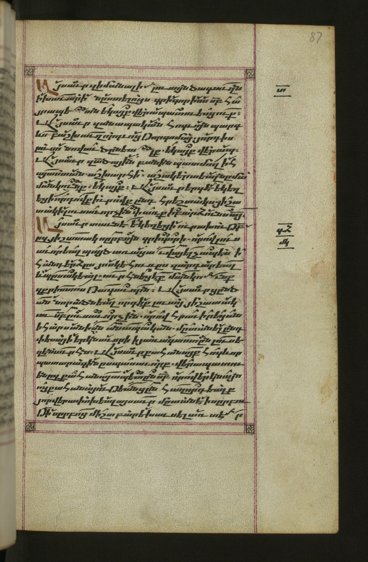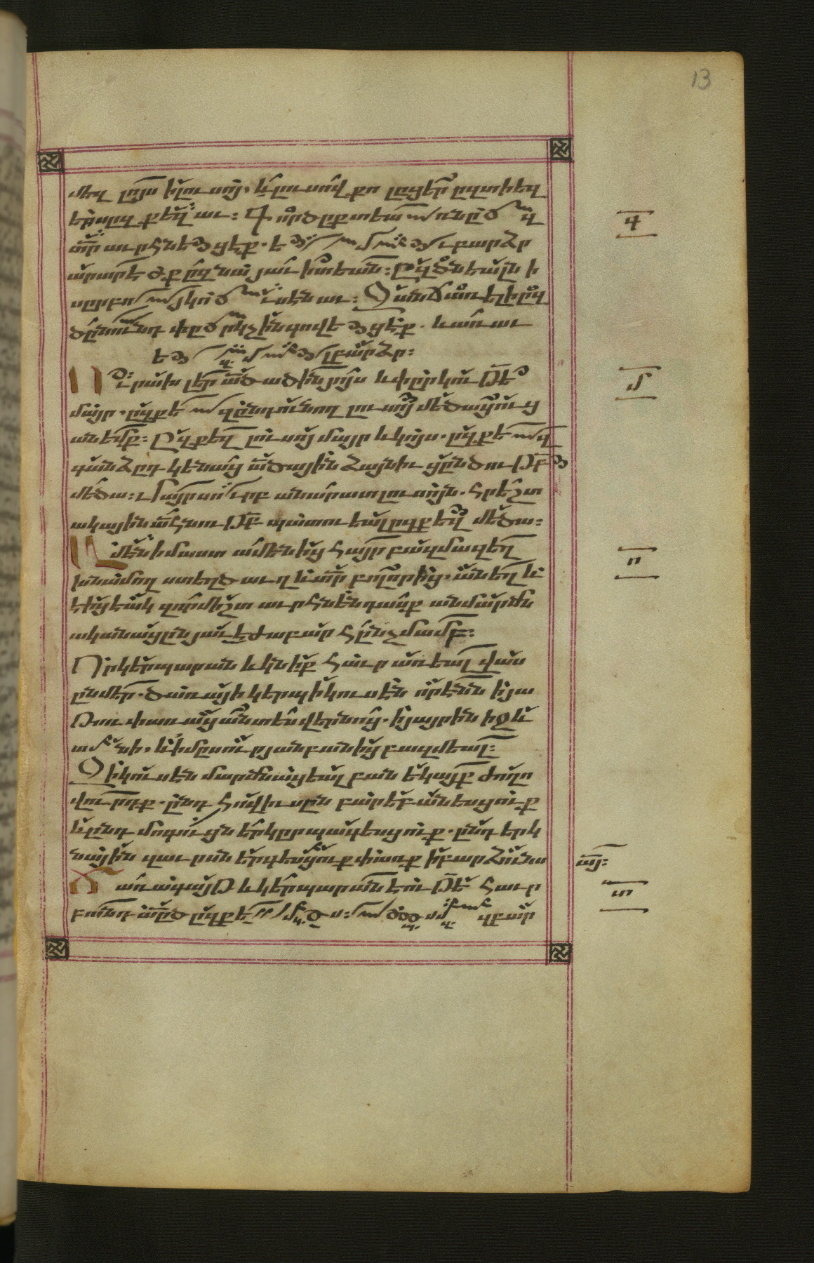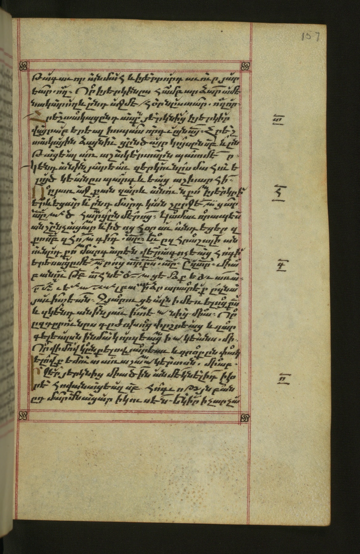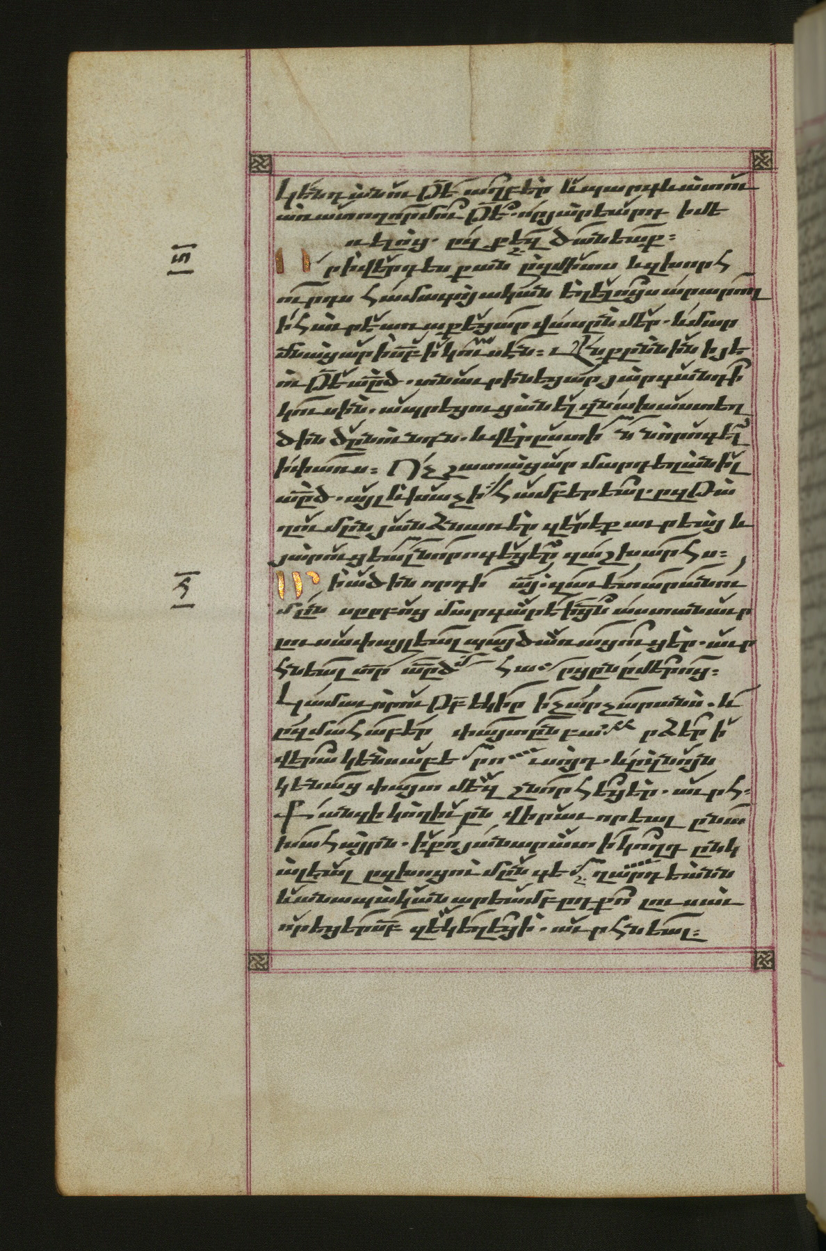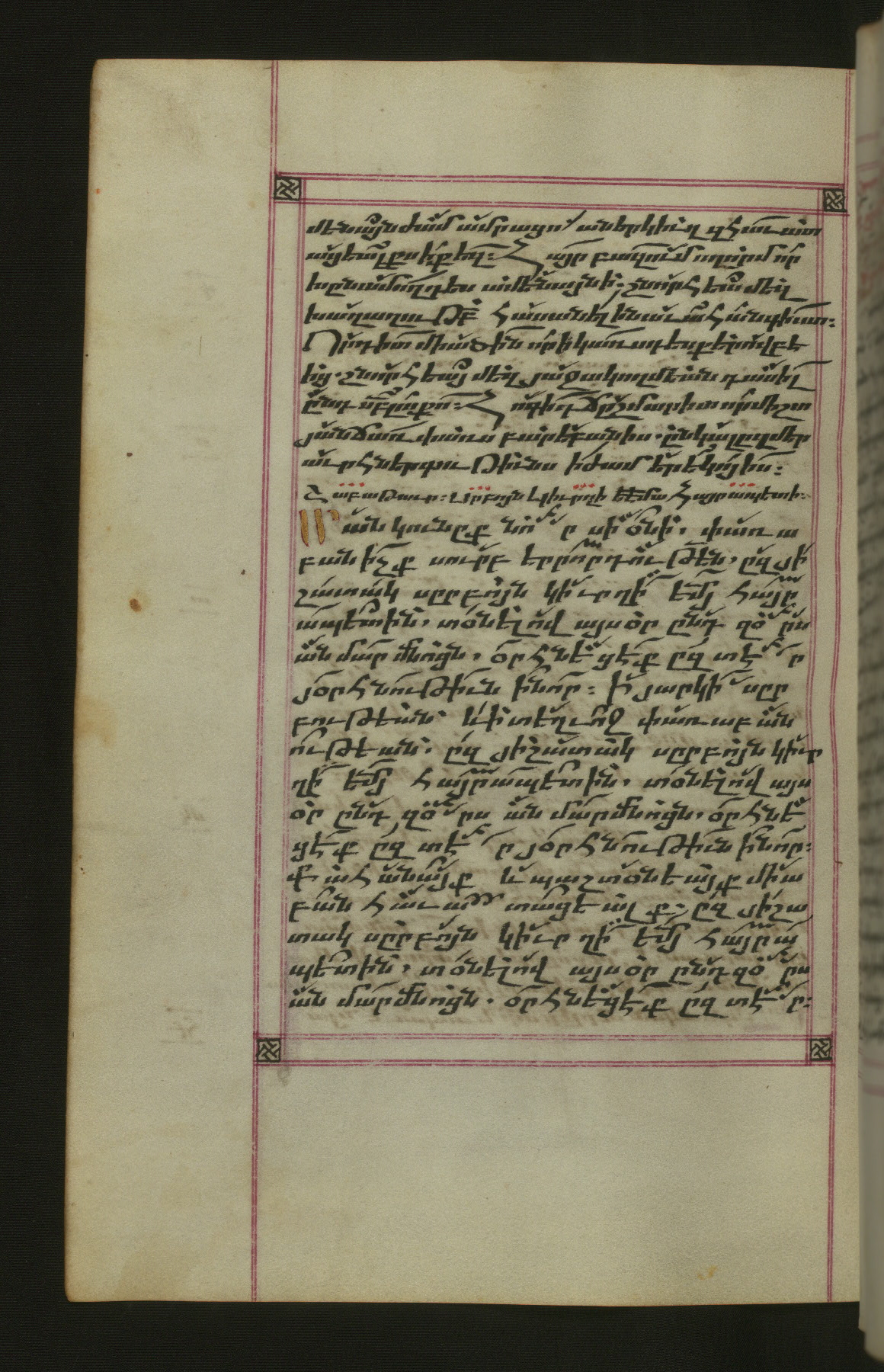 This hymnal was completed in Constantinople on August 15, 1678 [AE 1127], by the priest Yakob Pēligratc‘i, having been commissioned by Člav, son of Nawasard, as a dedication to his sons, Astuacatur and Sahak. The structure of the hymns adheres approximately to the standard Armenian hymnal (Շաբակնոց), with minor variations in order and a few substitutions (see Sanjian in the bibliography). The book is illuminated extensively, with thirty-eight full- and half-page polychrome miniatures against gold backgrounds, eight decorated head-pieces marking the principal divisions of the hymnal, and numerous marginal miniatures marking individual hymns, including biblical figures, saints, bishops, and vignettes. The style of the miniatures is largely in imitation of western European models, though more traditional Armenian and Byzantine influences stand out, such as the vibrant color palette, an iconic frontality for depictions of saints and bishops, and the highly abstracted floral motifs and zoomorphic incipits marking hymn divisions.