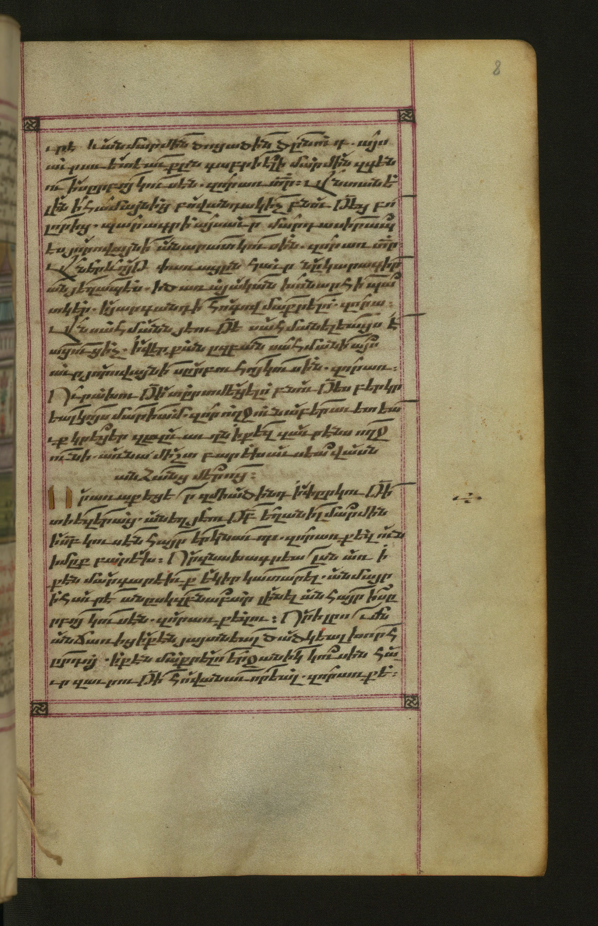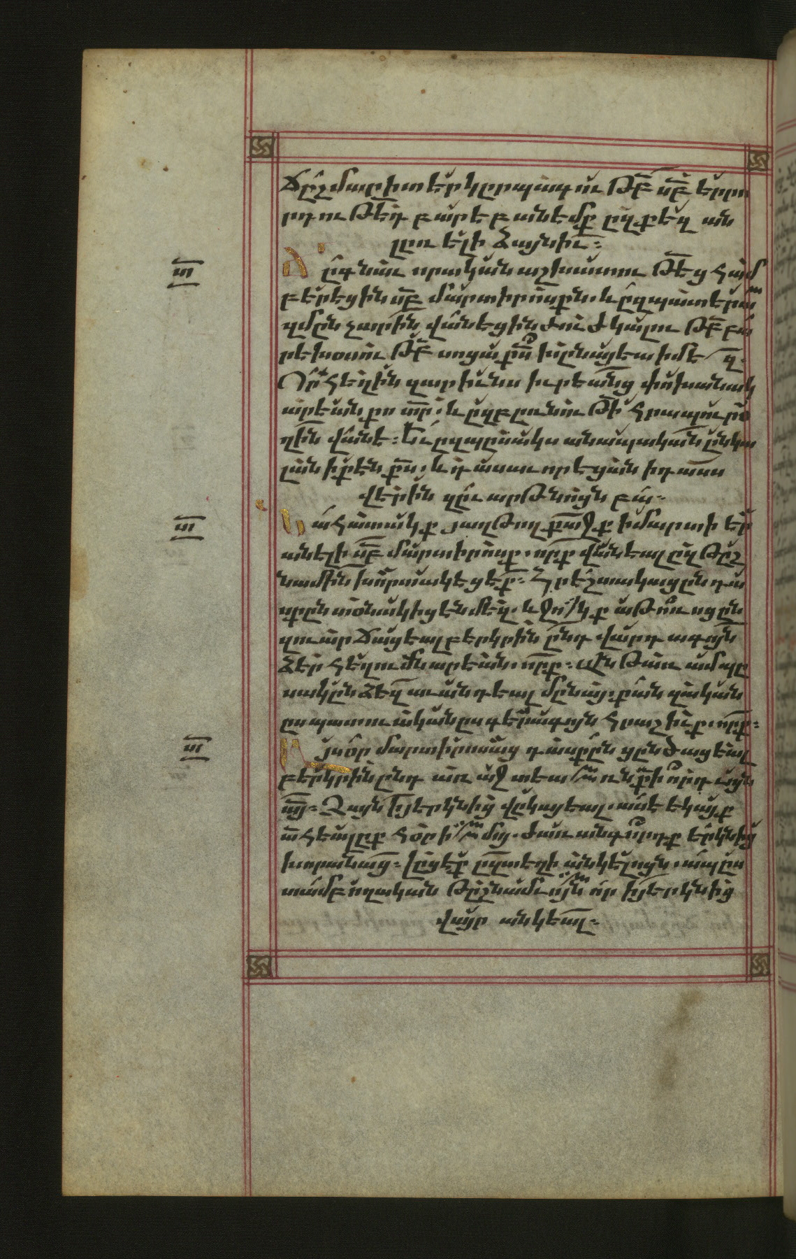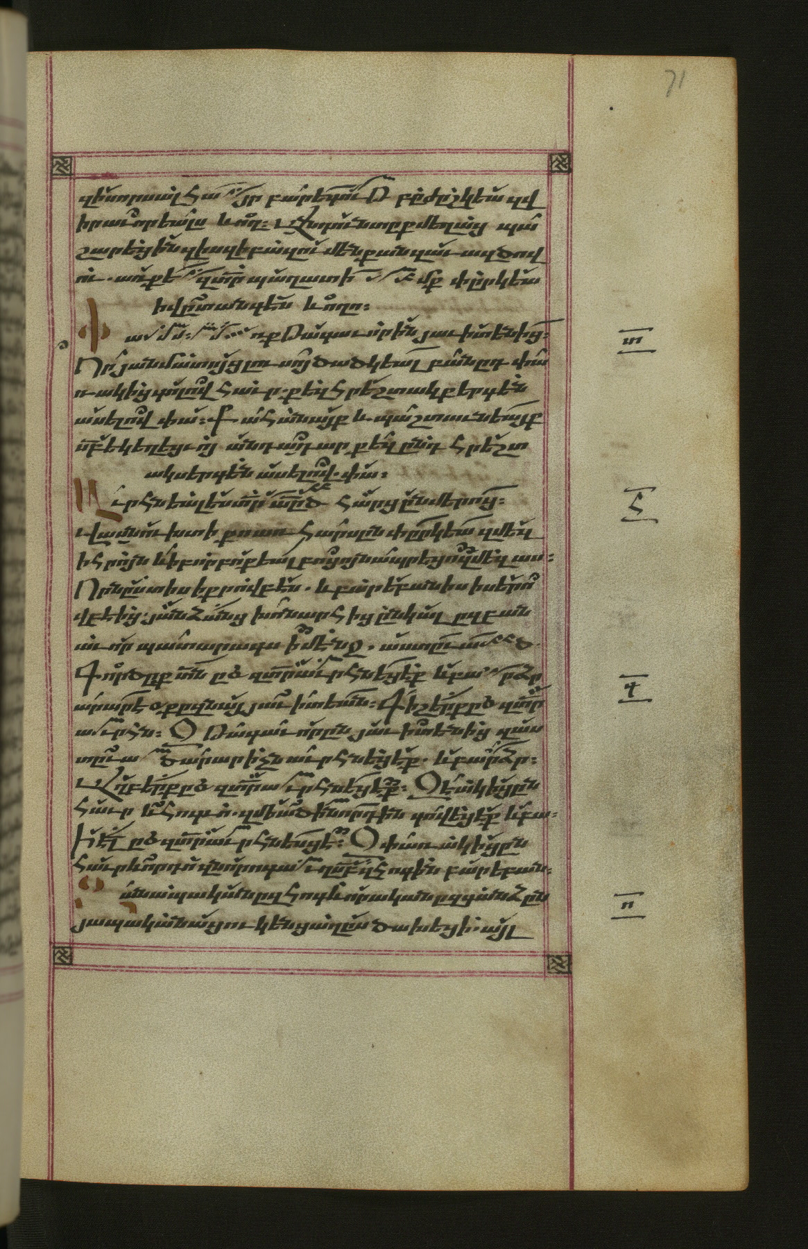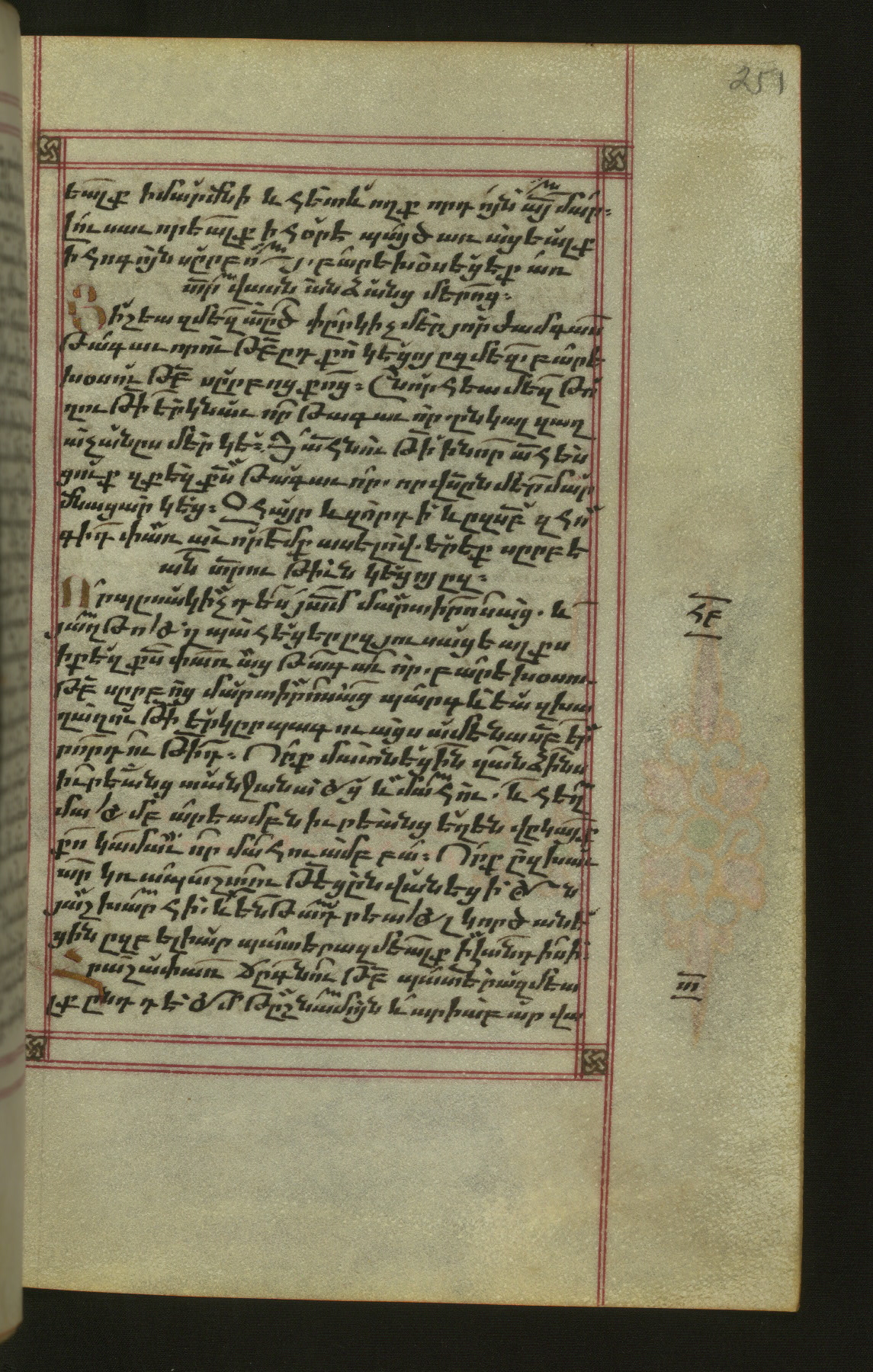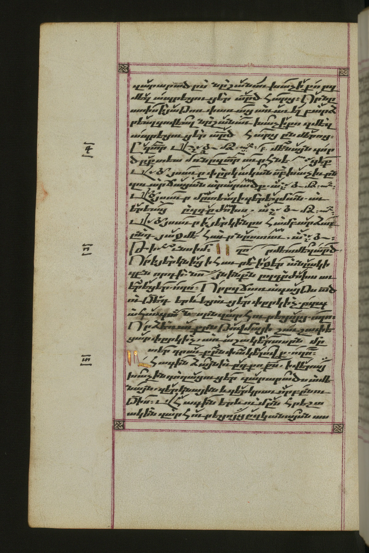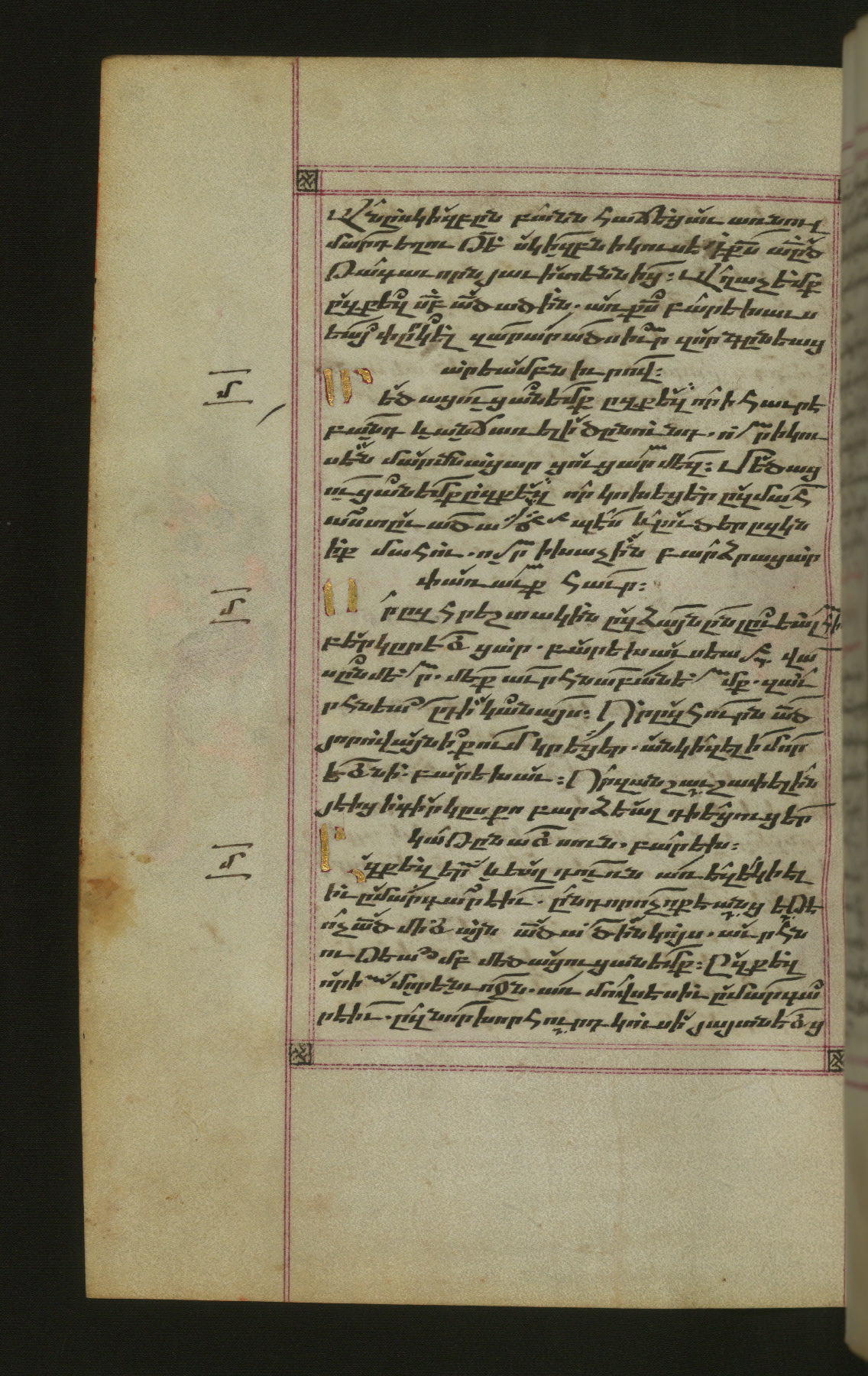 This hymnal was completed in Constantinople on August 15, 1678 [AE 1127], by the priest Yakob Pēligratc‘i, having been commissioned by Člav, son of Nawasard, as a dedication to his sons, Astuacatur and Sahak. The structure of the hymns adheres approximately to the standard Armenian hymnal (Շաբակնոց), with minor variations in order and a few substitutions (see Sanjian in the bibliography). The book is illuminated extensively, with thirty-eight full- and half-page polychrome miniatures against gold backgrounds, eight decorated head-pieces marking the principal divisions of the hymnal, and numerous marginal miniatures marking individual hymns, including biblical figures, saints, bishops, and vignettes. The style of the miniatures is largely in imitation of western European models, though more traditional Armenian and Byzantine influences stand out, such as the vibrant color palette, an iconic frontality for depictions of saints and bishops, and the highly abstracted floral motifs and zoomorphic incipits marking hymn divisions.