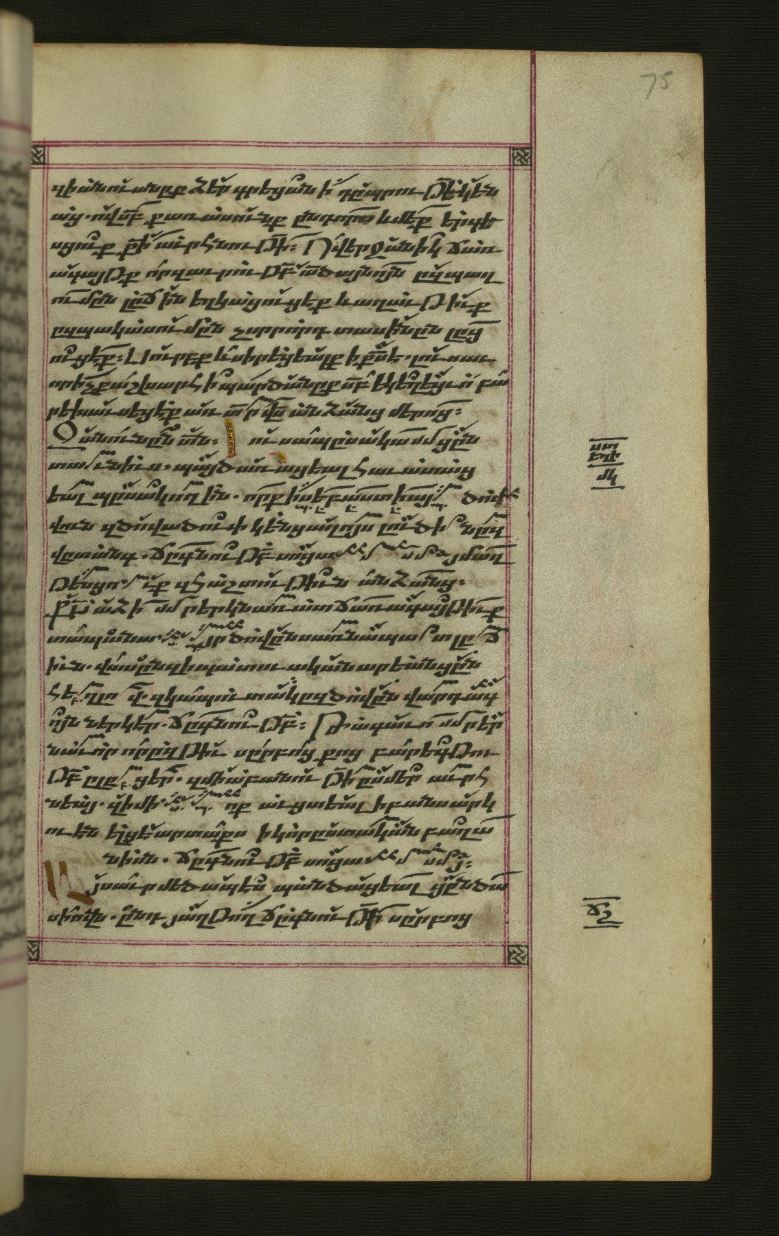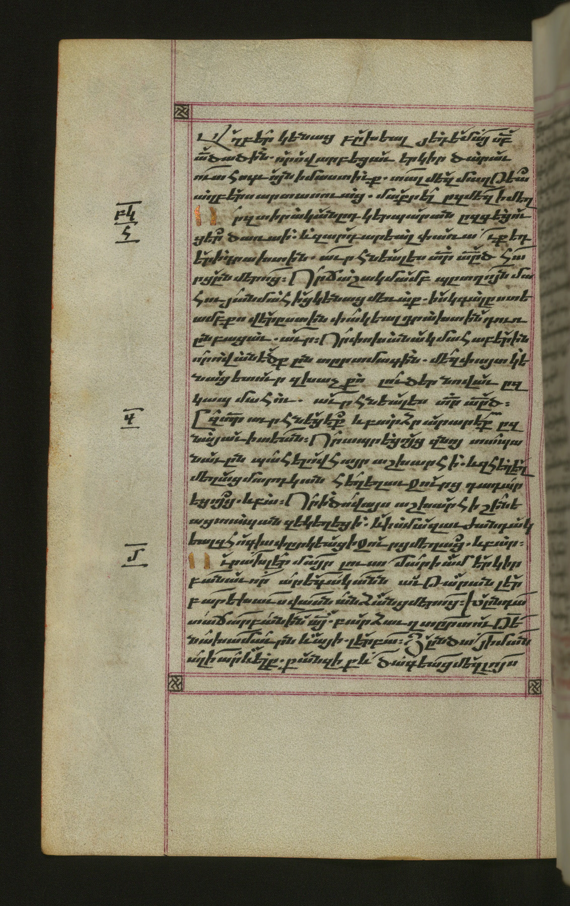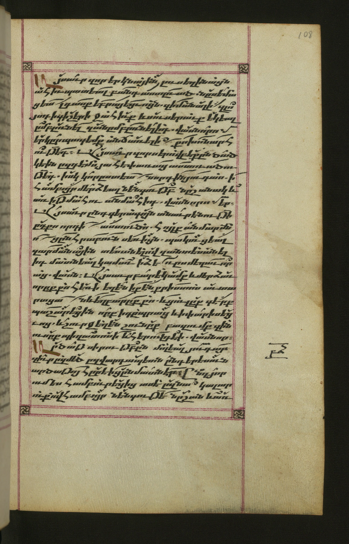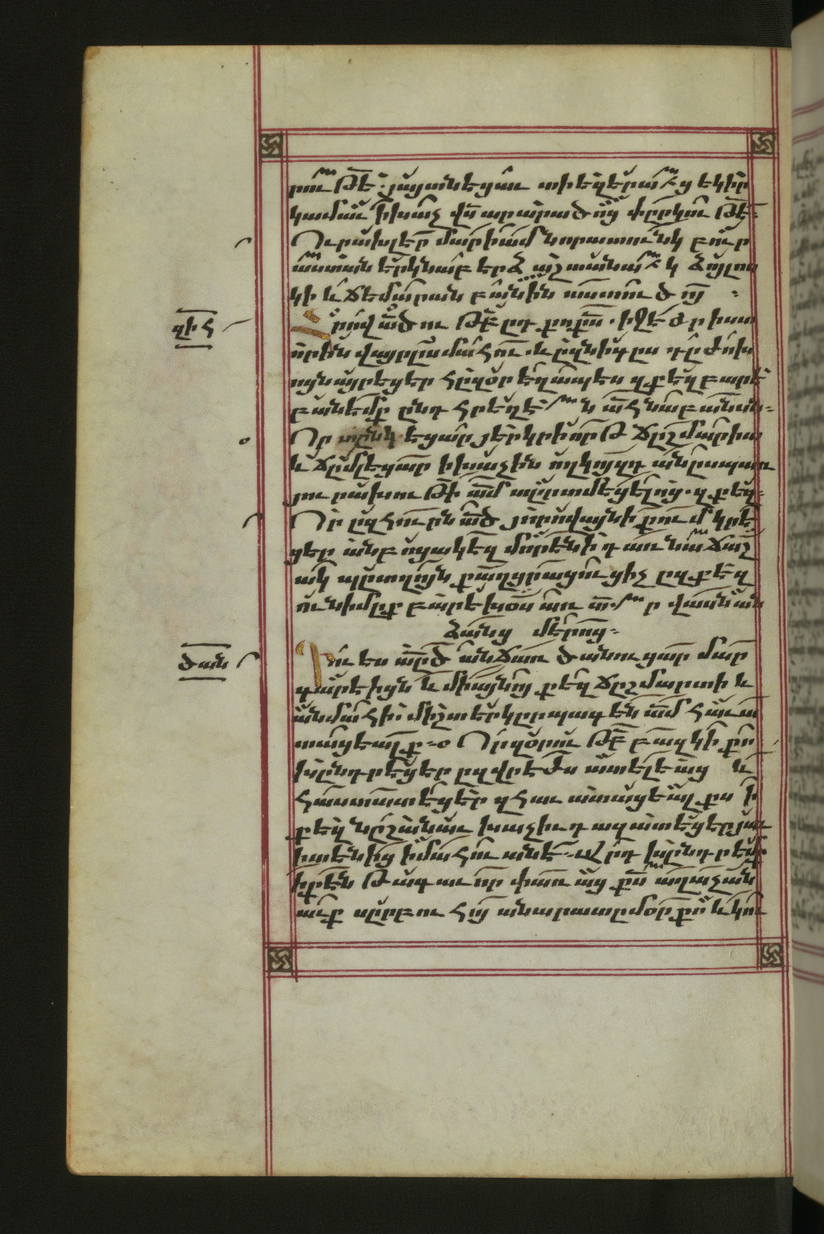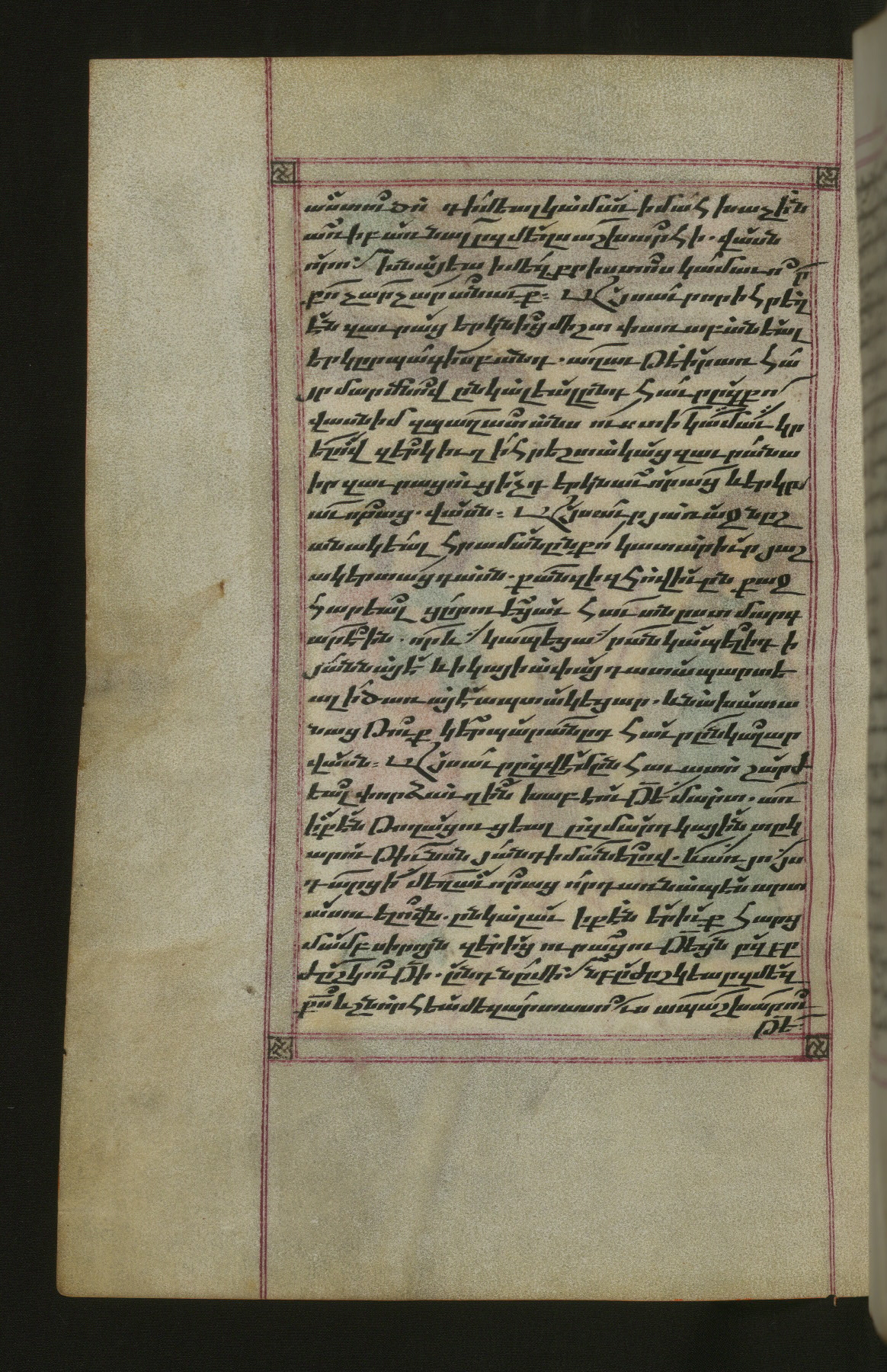 This hymnal was completed in Constantinople on August 15, 1678 [AE 1127], by the priest Yakob Pēligratc‘i, having been commissioned by Člav, son of Nawasard, as a dedication to his sons, Astuacatur and Sahak. The structure of the hymns adheres approximately to the standard Armenian hymnal (Շաբակնոց), with minor variations in order and a few substitutions (see Sanjian in the bibliography). The book is illuminated extensively, with thirty-eight full- and half-page polychrome miniatures against gold backgrounds, eight decorated head-pieces marking the principal divisions of the hymnal, and numerous marginal miniatures marking individual hymns, including biblical figures, saints, bishops, and vignettes. The style of the miniatures is largely in imitation of western European models, though more traditional Armenian and Byzantine influences stand out, such as the vibrant color palette, an iconic frontality for depictions of saints and bishops, and the highly abstracted floral motifs and zoomorphic incipits marking hymn divisions.