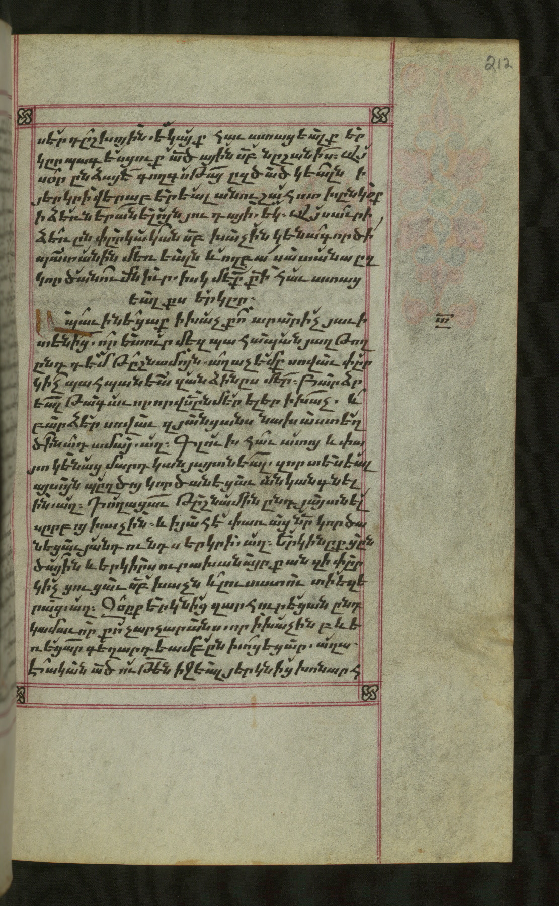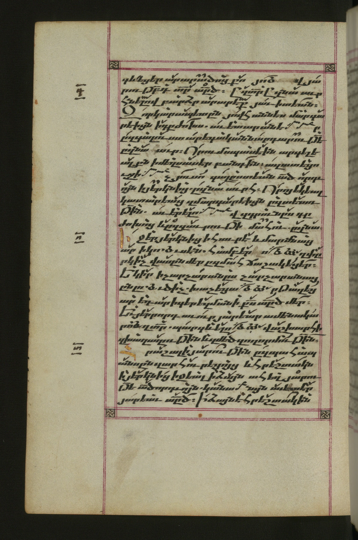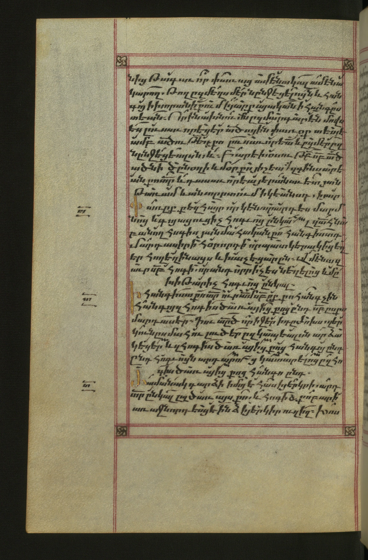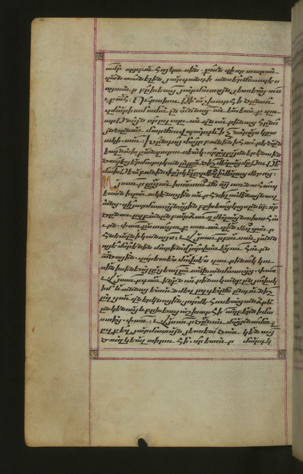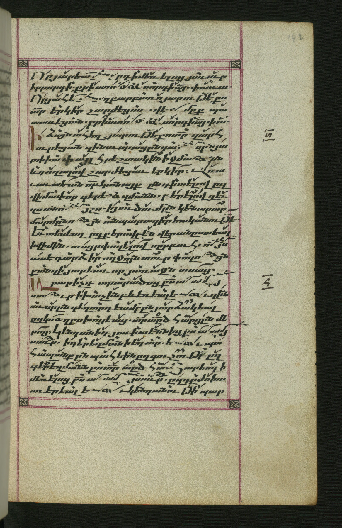 This hymnal was completed in Constantinople on August 15, 1678 [AE 1127], by the priest Yakob Pēligratc‘i, having been commissioned by Člav, son of Nawasard, as a dedication to his sons, Astuacatur and Sahak. The structure of the hymns adheres approximately to the standard Armenian hymnal (Շաբակնոց), with minor variations in order and a few substitutions (see Sanjian in the bibliography). The book is illuminated extensively, with thirty-eight full- and half-page polychrome miniatures against gold backgrounds, eight decorated head-pieces marking the principal divisions of the hymnal, and numerous marginal miniatures marking individual hymns, including biblical figures, saints, bishops, and vignettes. The style of the miniatures is largely in imitation of western European models, though more traditional Armenian and Byzantine influences stand out, such as the vibrant color palette, an iconic frontality for depictions of saints and bishops, and the highly abstracted floral motifs and zoomorphic incipits marking hymn divisions.