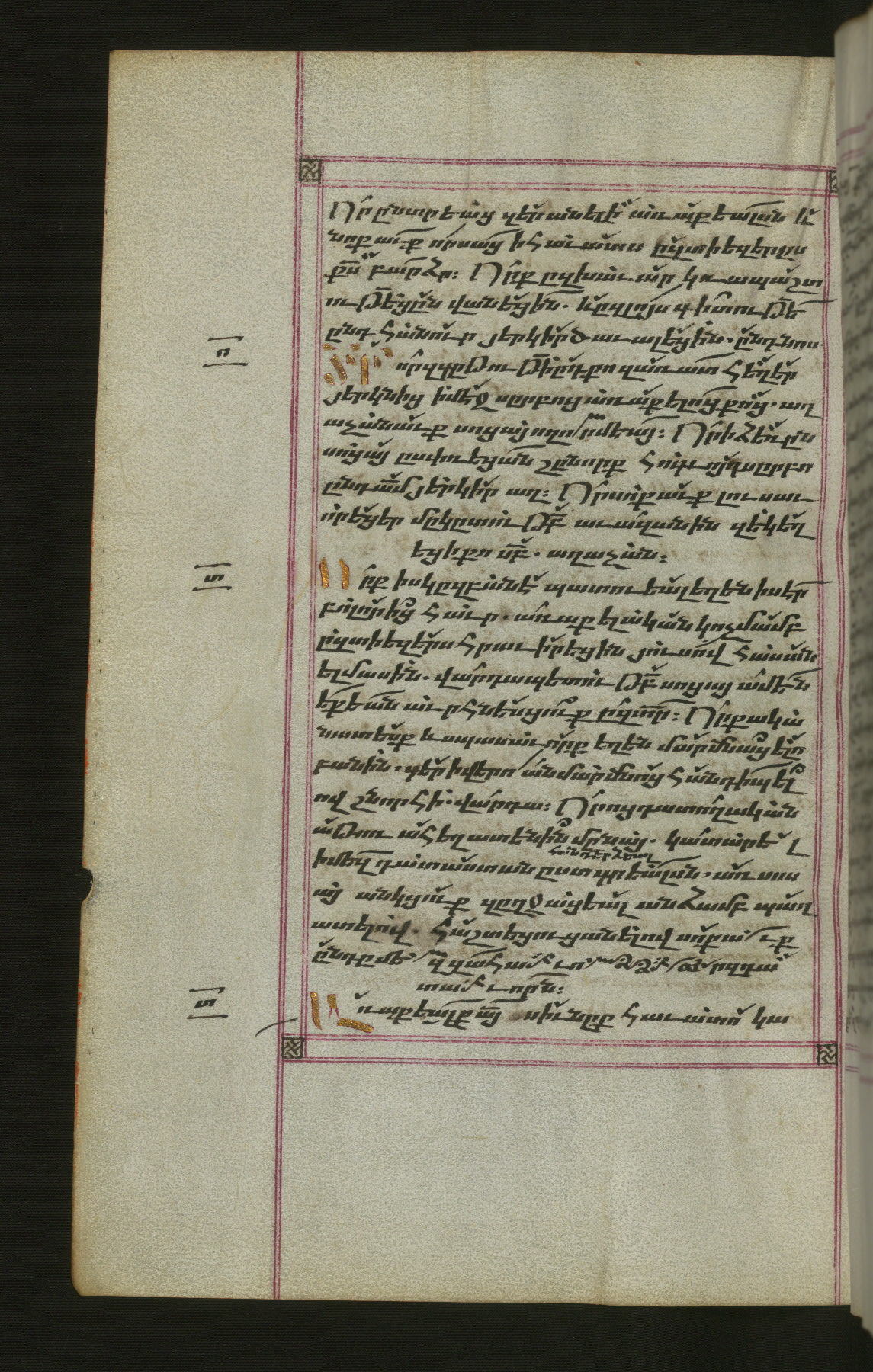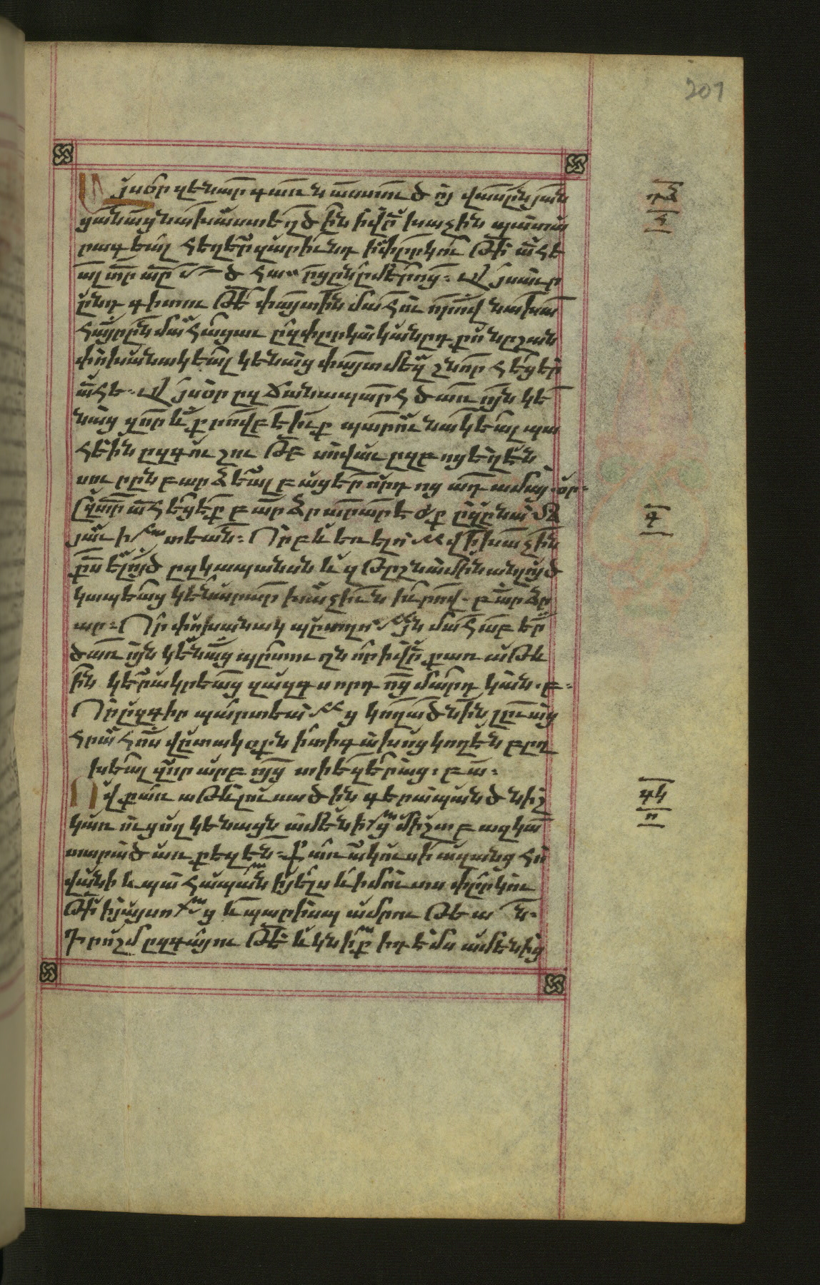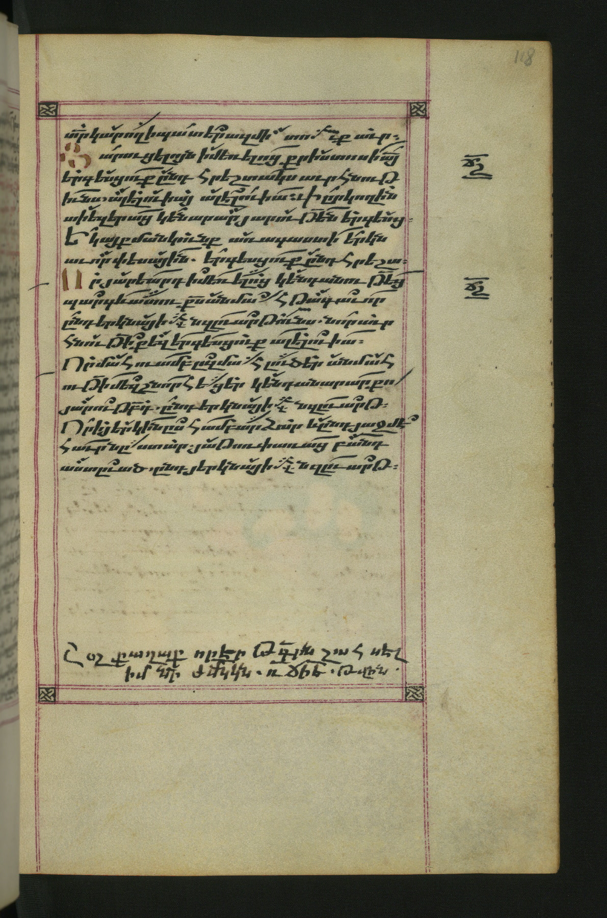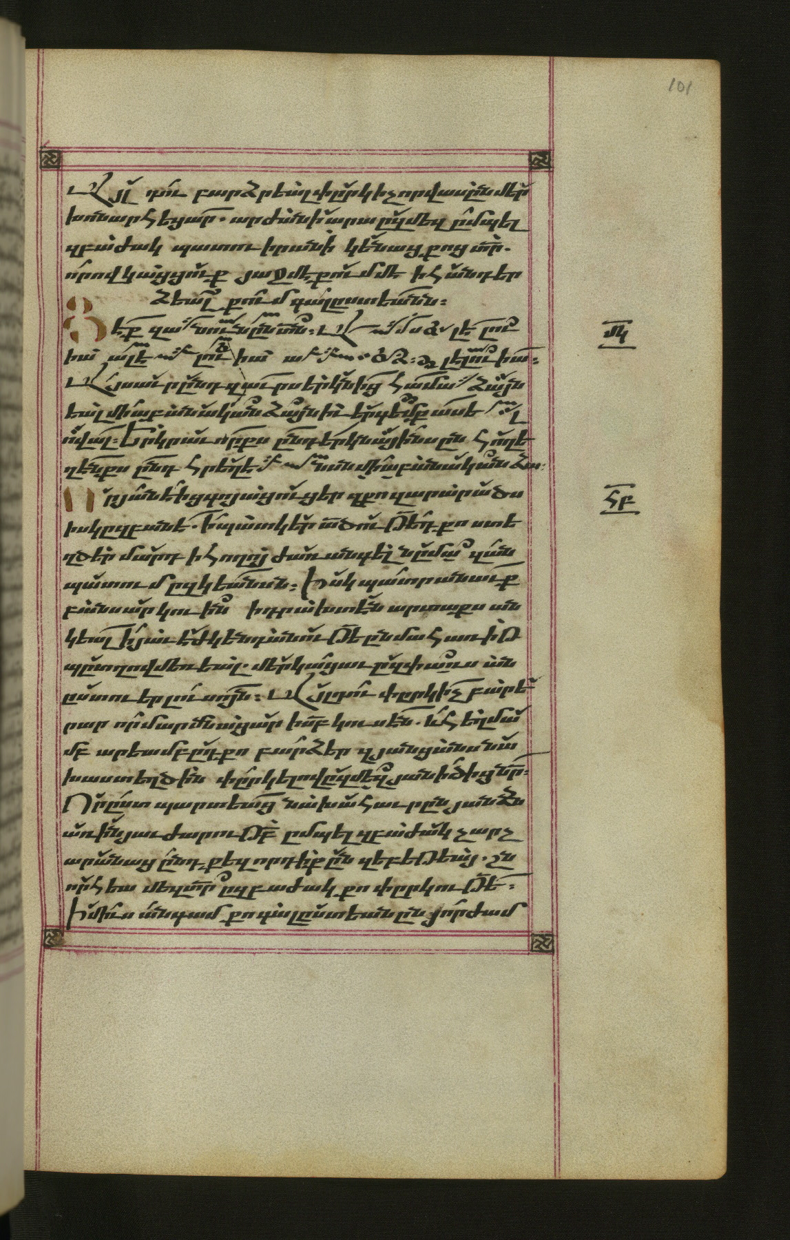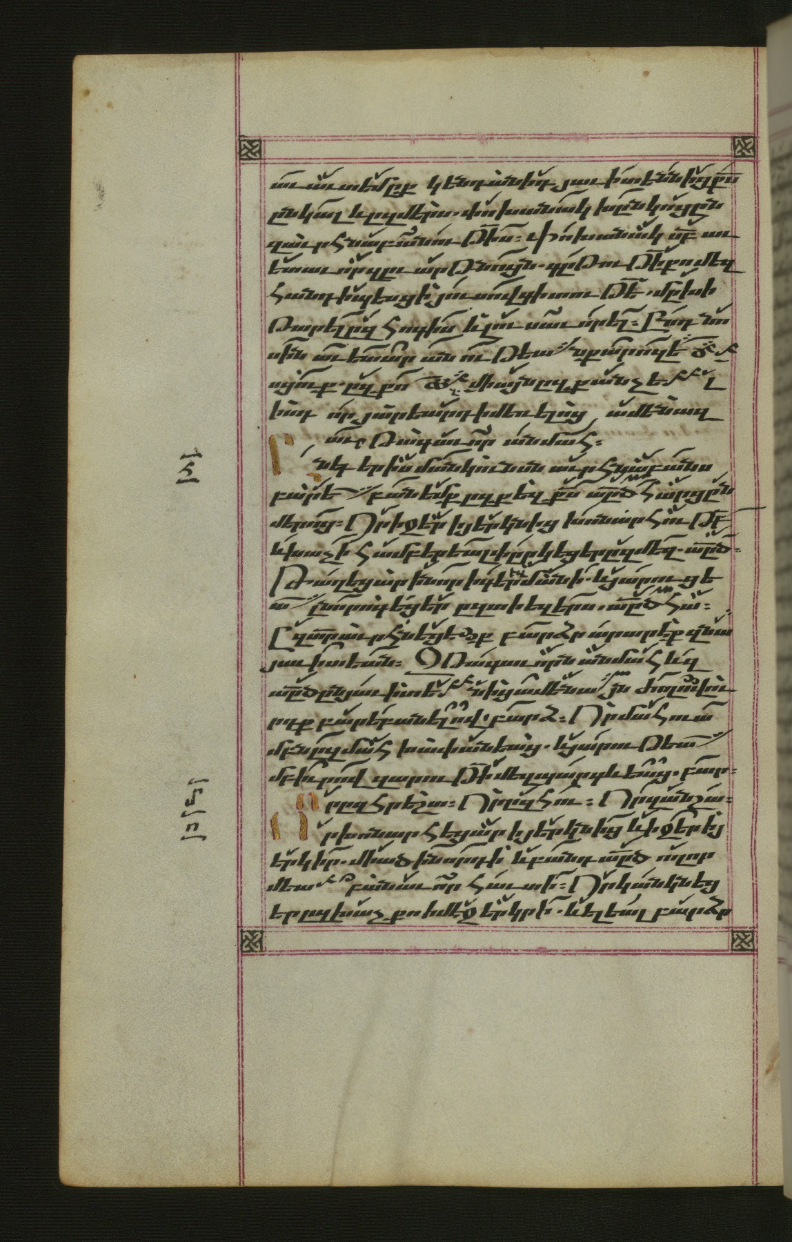 This hymnal was completed in Constantinople on August 15, 1678 [AE 1127], by the priest Yakob Pēligratc‘i, having been commissioned by Člav, son of Nawasard, as a dedication to his sons, Astuacatur and Sahak. The structure of the hymns adheres approximately to the standard Armenian hymnal (Շաբակնոց), with minor variations in order and a few substitutions (see Sanjian in the bibliography). The book is illuminated extensively, with thirty-eight full- and half-page polychrome miniatures against gold backgrounds, eight decorated head-pieces marking the principal divisions of the hymnal, and numerous marginal miniatures marking individual hymns, including biblical figures, saints, bishops, and vignettes. The style of the miniatures is largely in imitation of western European models, though more traditional Armenian and Byzantine influences stand out, such as the vibrant color palette, an iconic frontality for depictions of saints and bishops, and the highly abstracted floral motifs and zoomorphic incipits marking hymn divisions.