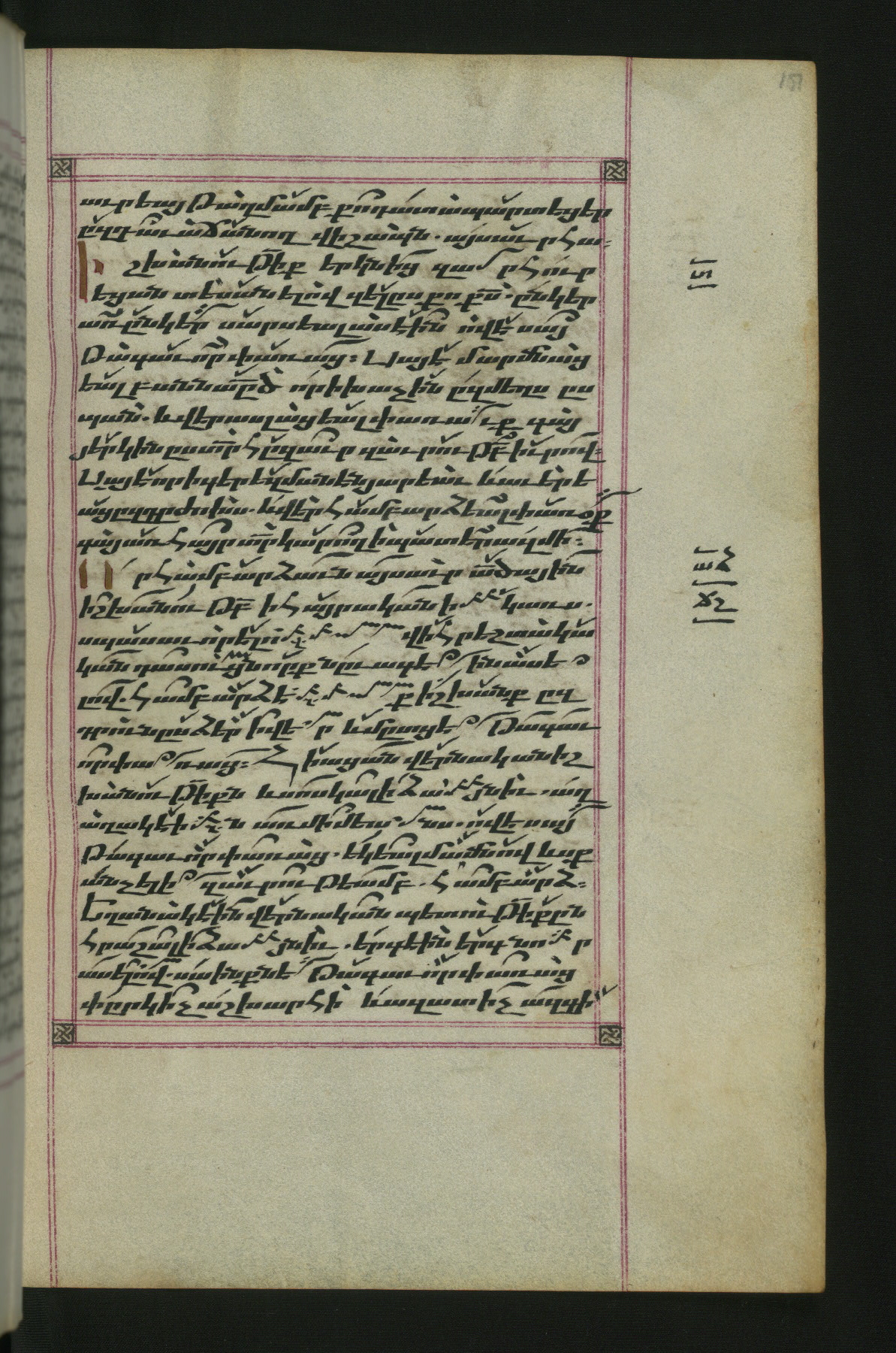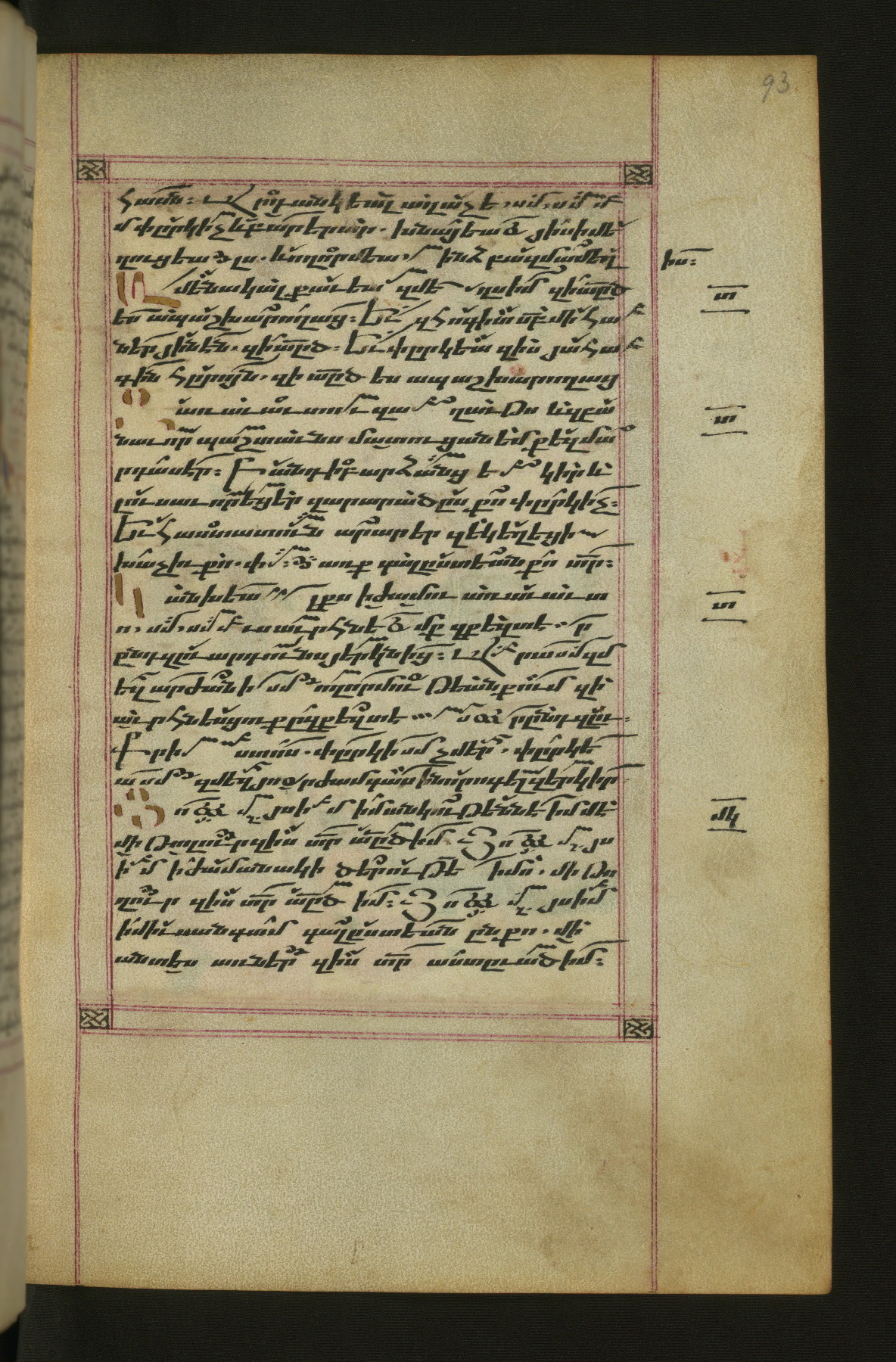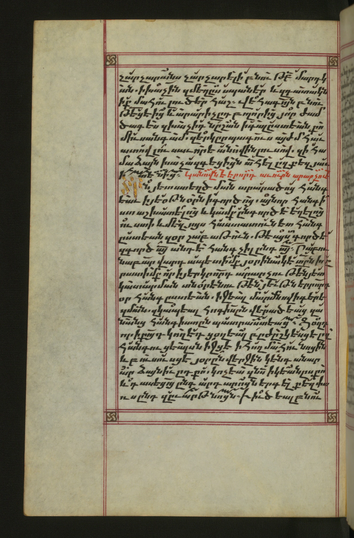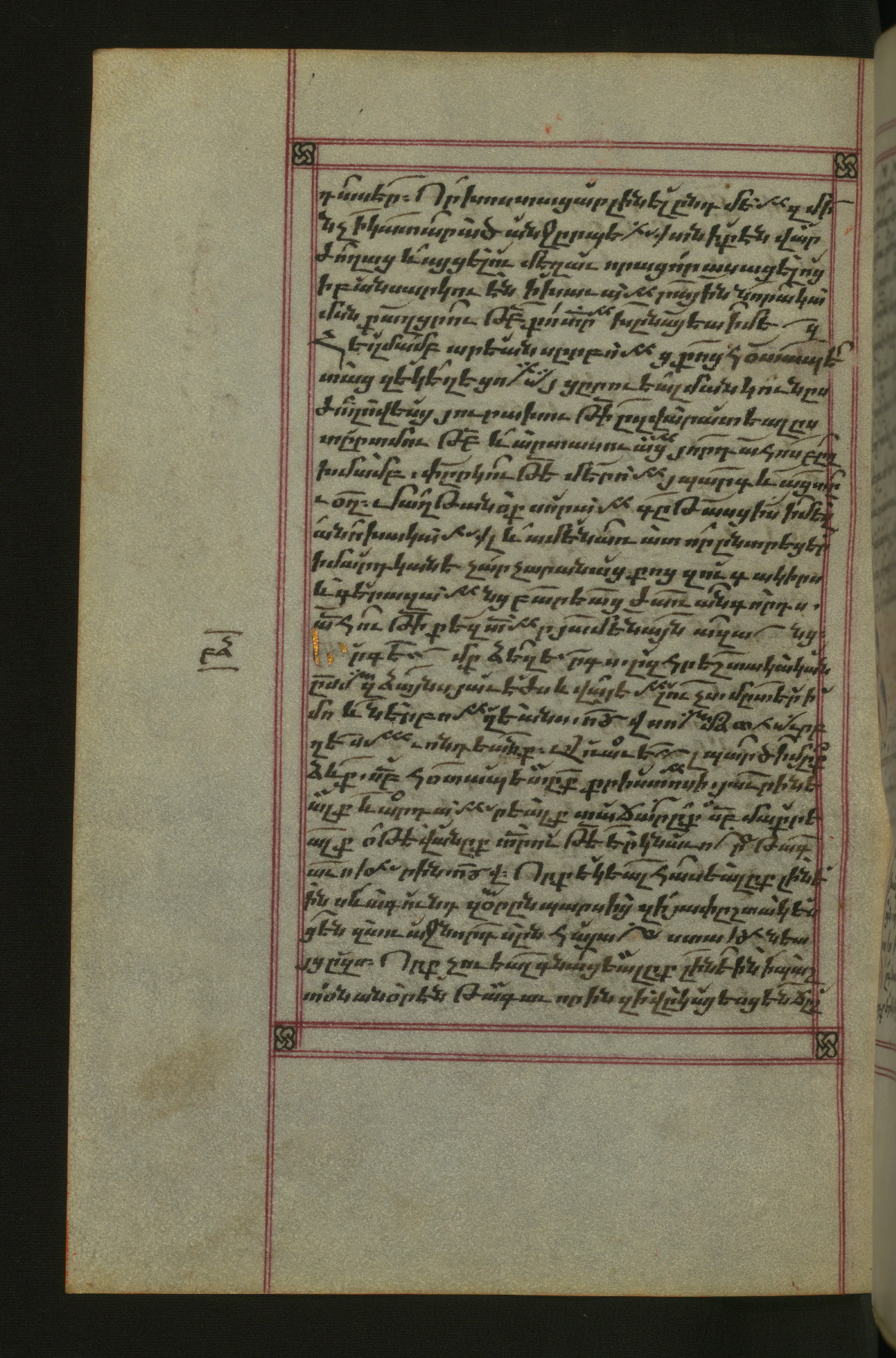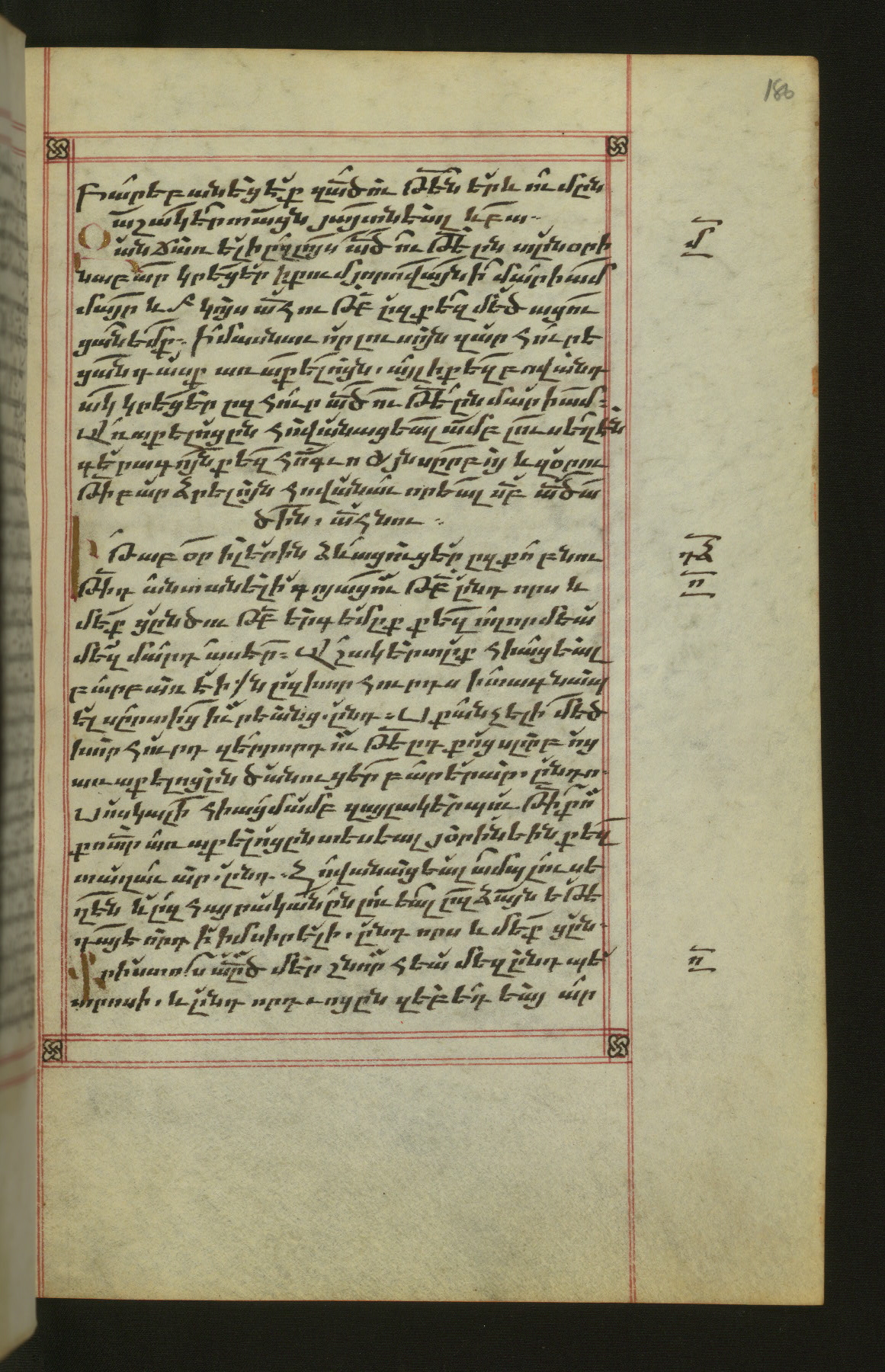 This hymnal was completed in Constantinople on August 15, 1678 [AE 1127], by the priest Yakob Pēligratc‘i, having been commissioned by Člav, son of Nawasard, as a dedication to his sons, Astuacatur and Sahak. The structure of the hymns adheres approximately to the standard Armenian hymnal (Շաբակնոց), with minor variations in order and a few substitutions (see Sanjian in the bibliography). The book is illuminated extensively, with thirty-eight full- and half-page polychrome miniatures against gold backgrounds, eight decorated head-pieces marking the principal divisions of the hymnal, and numerous marginal miniatures marking individual hymns, including biblical figures, saints, bishops, and vignettes. The style of the miniatures is largely in imitation of western European models, though more traditional Armenian and Byzantine influences stand out, such as the vibrant color palette, an iconic frontality for depictions of saints and bishops, and the highly abstracted floral motifs and zoomorphic incipits marking hymn divisions.
