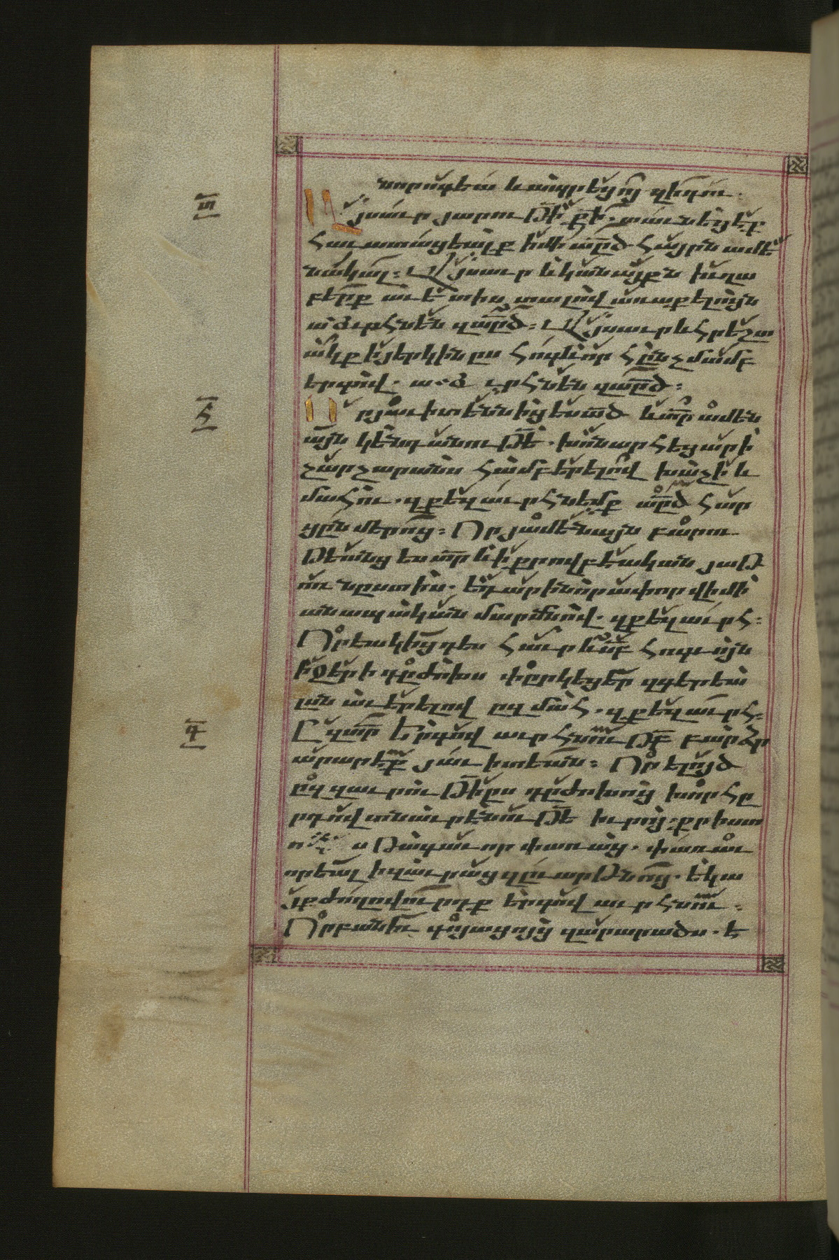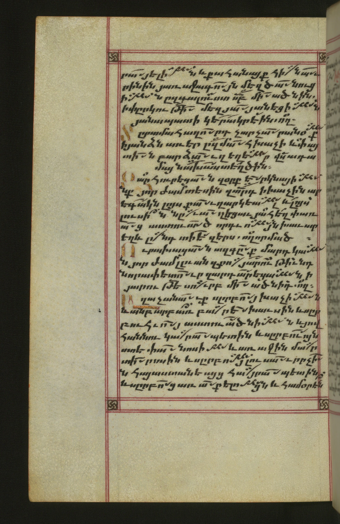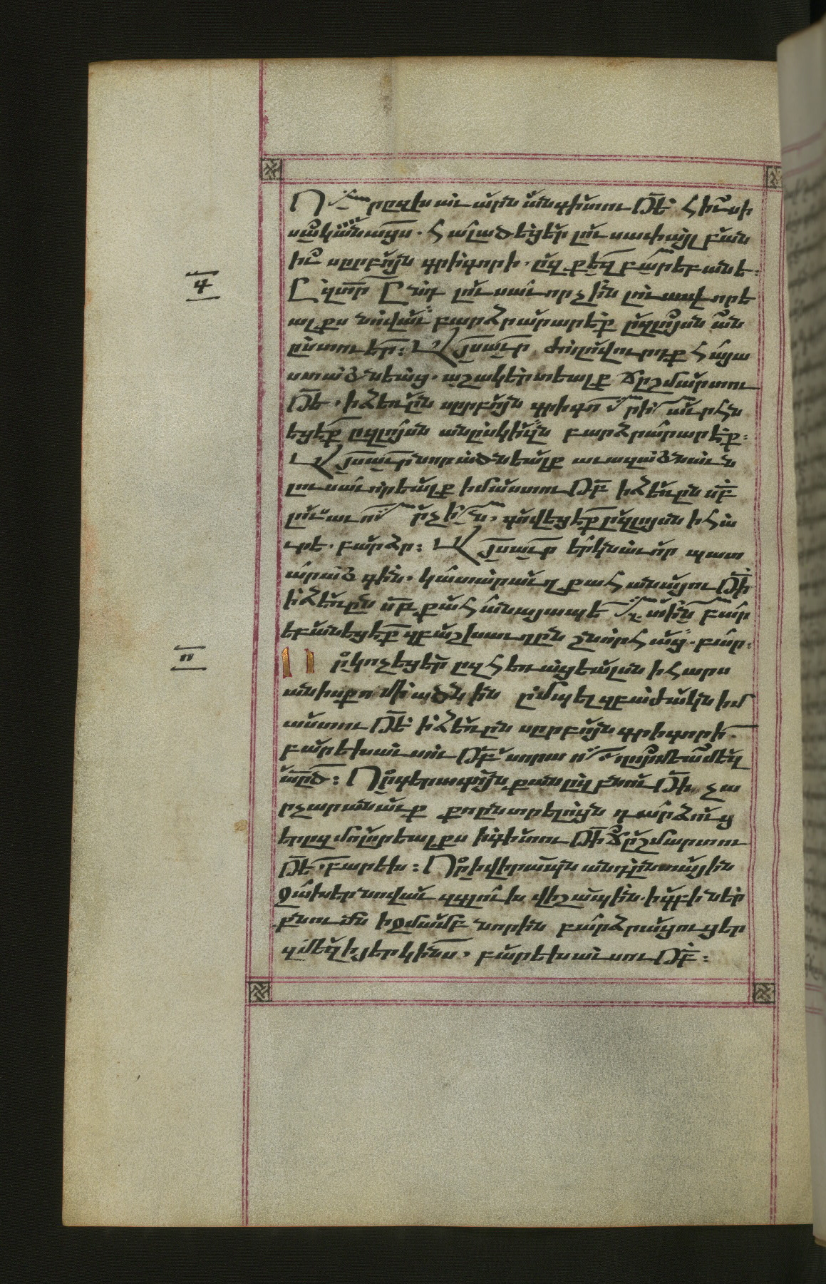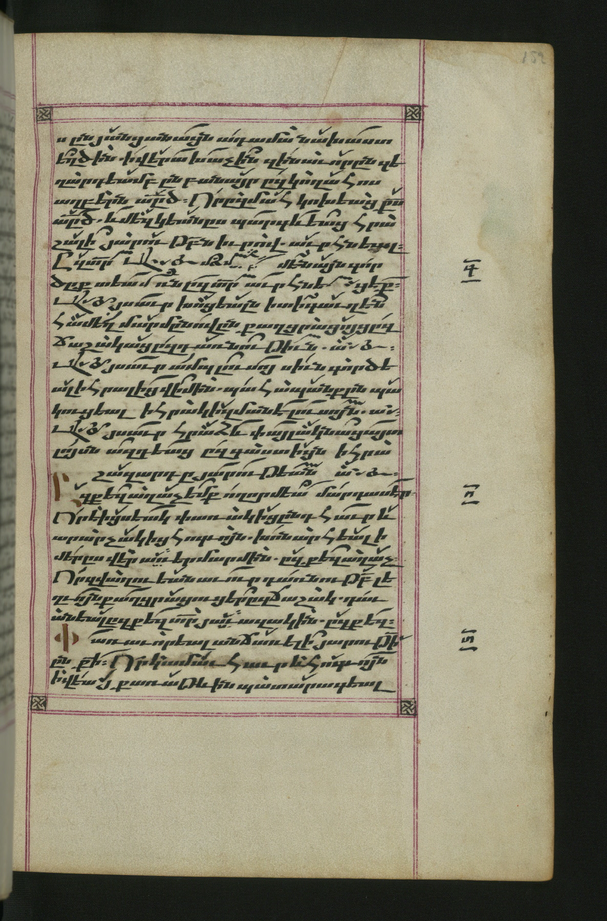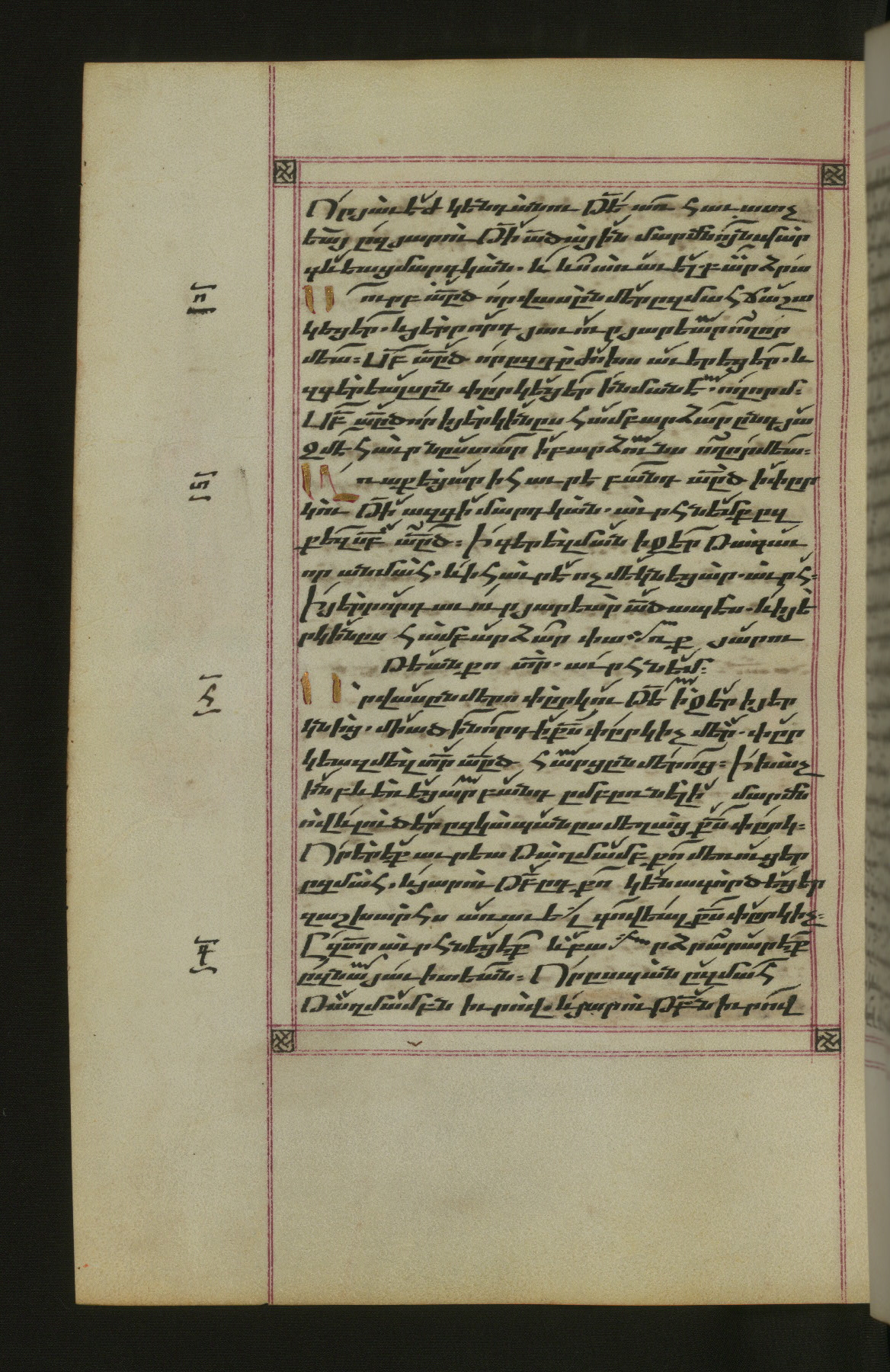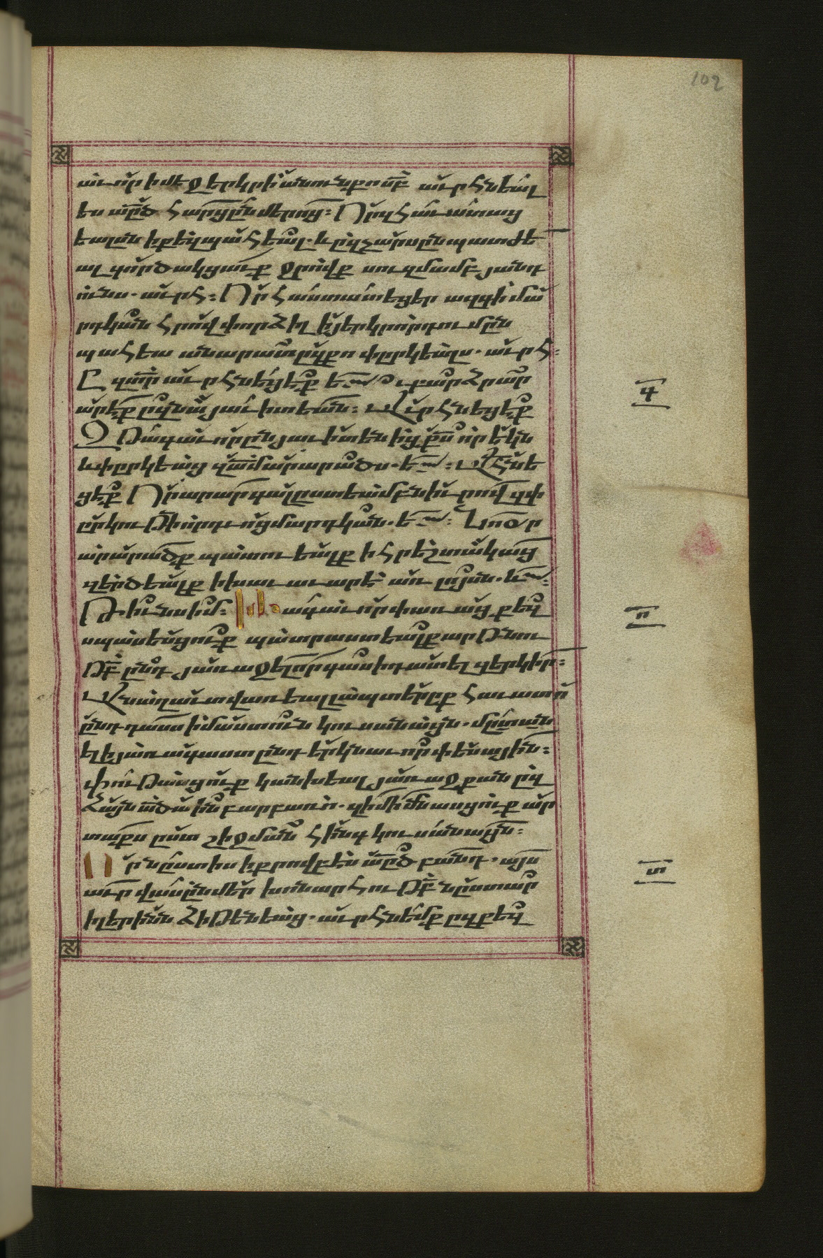 This hymnal was completed in Constantinople on August 15, 1678 [AE 1127], by the priest Yakob Pēligratc‘i, having been commissioned by Člav, son of Nawasard, as a dedication to his sons, Astuacatur and Sahak. The structure of the hymns adheres approximately to the standard Armenian hymnal (Շաբակնոց), with minor variations in order and a few substitutions (see Sanjian in the bibliography). The book is illuminated extensively, with thirty-eight full- and half-page polychrome miniatures against gold backgrounds, eight decorated head-pieces marking the principal divisions of the hymnal, and numerous marginal miniatures marking individual hymns, including biblical figures, saints, bishops, and vignettes. The style of the miniatures is largely in imitation of western European models, though more traditional Armenian and Byzantine influences stand out, such as the vibrant color palette, an iconic frontality for depictions of saints and bishops, and the highly abstracted floral motifs and zoomorphic incipits marking hymn divisions.