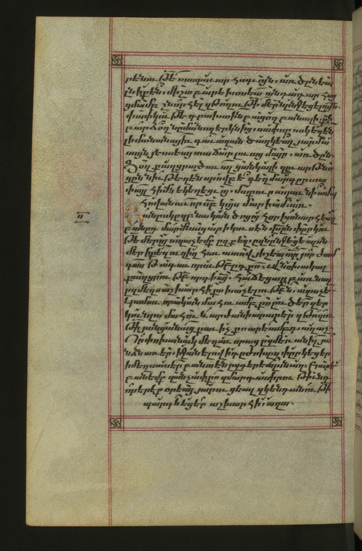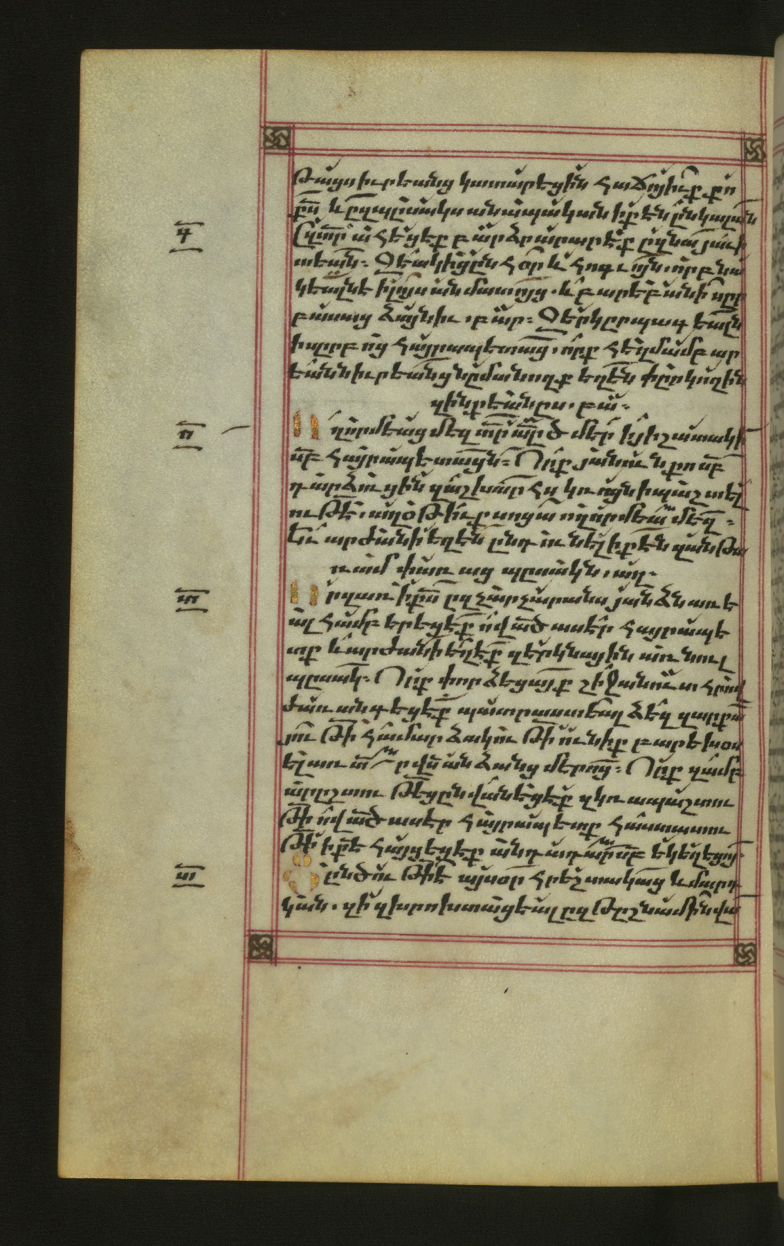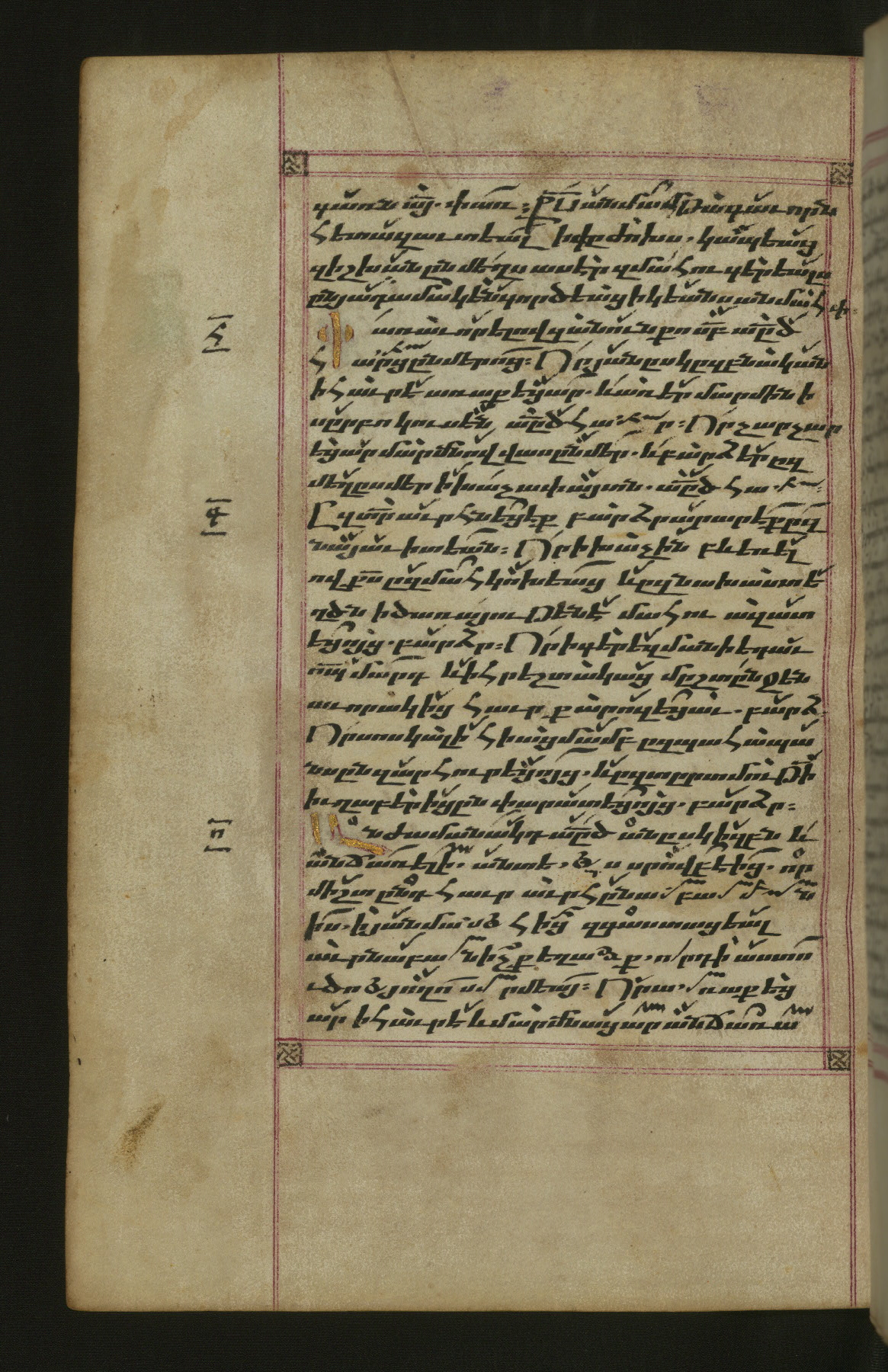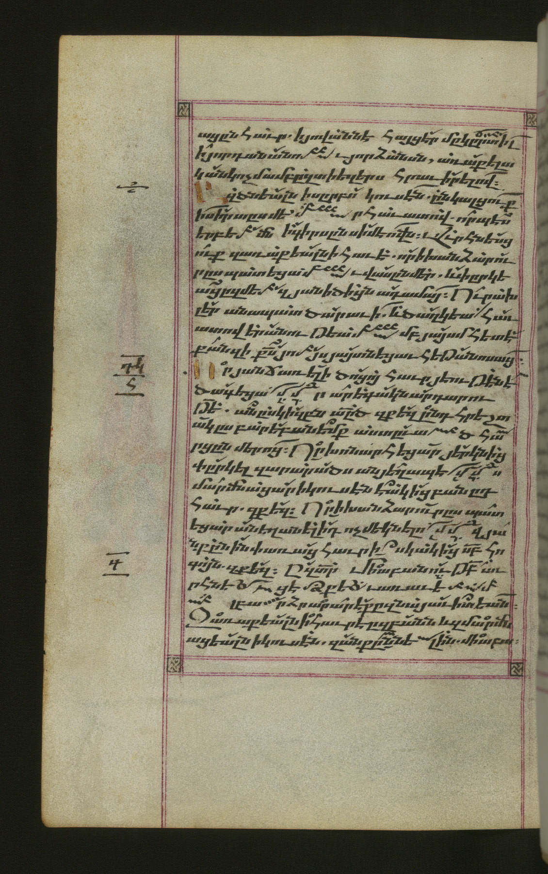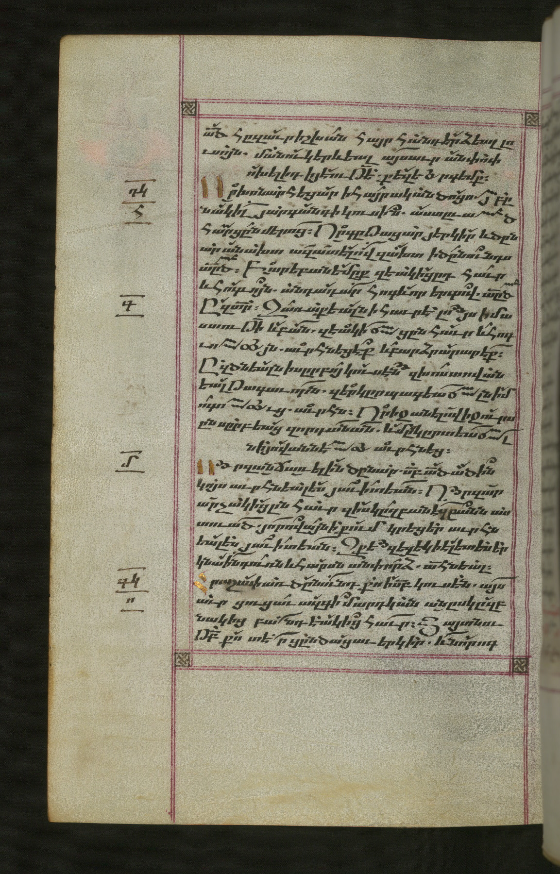 This hymnal was completed in Constantinople on August 15, 1678 [AE 1127], by the priest Yakob Pēligratc‘i, having been commissioned by Člav, son of Nawasard, as a dedication to his sons, Astuacatur and Sahak. The structure of the hymns adheres approximately to the standard Armenian hymnal (Շաբակնոց), with minor variations in order and a few substitutions (see Sanjian in the bibliography). The book is illuminated extensively, with thirty-eight full- and half-page polychrome miniatures against gold backgrounds, eight decorated head-pieces marking the principal divisions of the hymnal, and numerous marginal miniatures marking individual hymns, including biblical figures, saints, bishops, and vignettes. The style of the miniatures is largely in imitation of western European models, though more traditional Armenian and Byzantine influences stand out, such as the vibrant color palette, an iconic frontality for depictions of saints and bishops, and the highly abstracted floral motifs and zoomorphic incipits marking hymn divisions.
