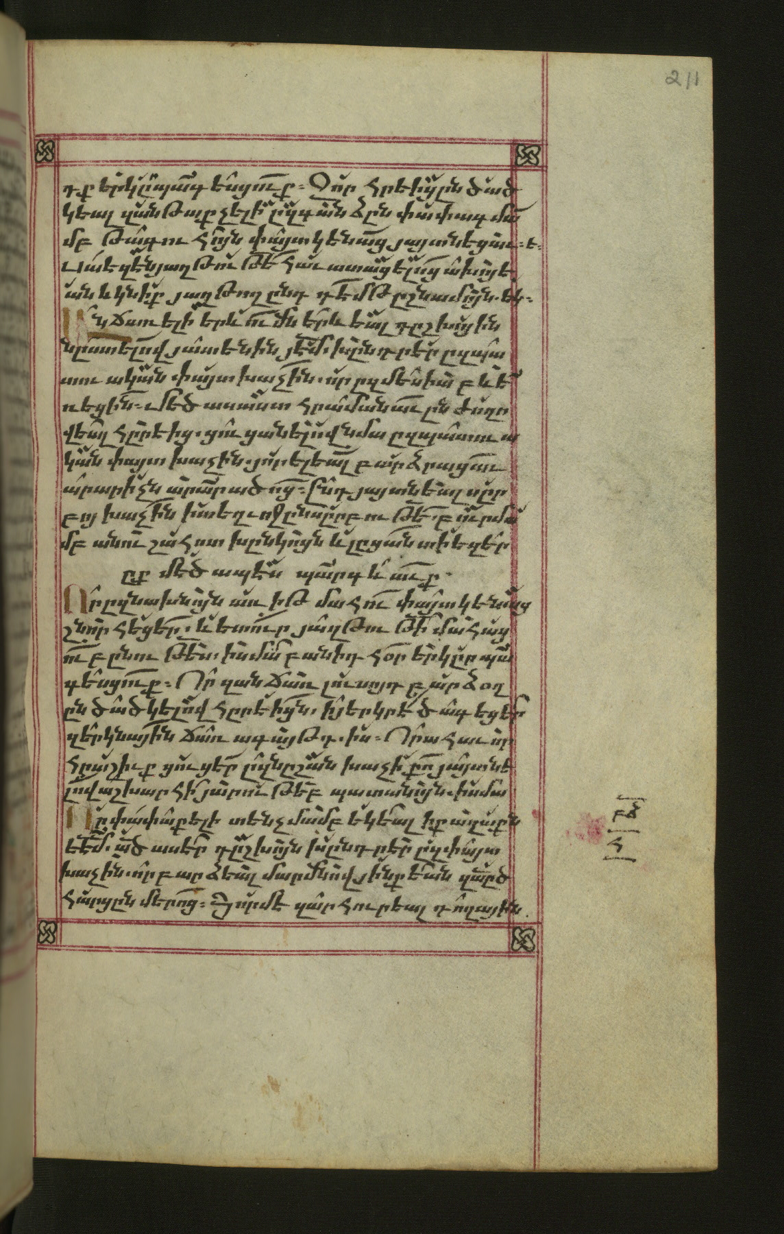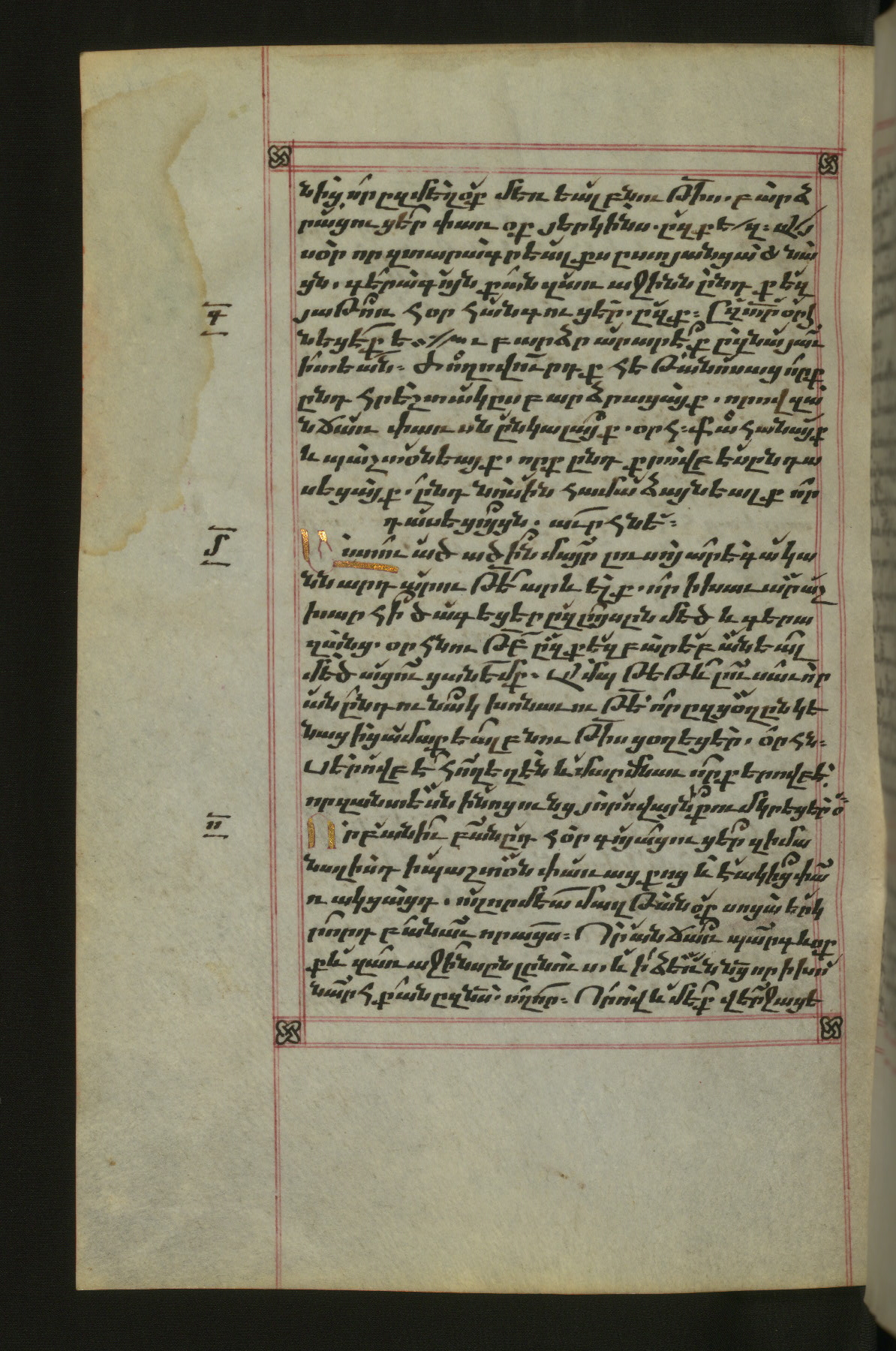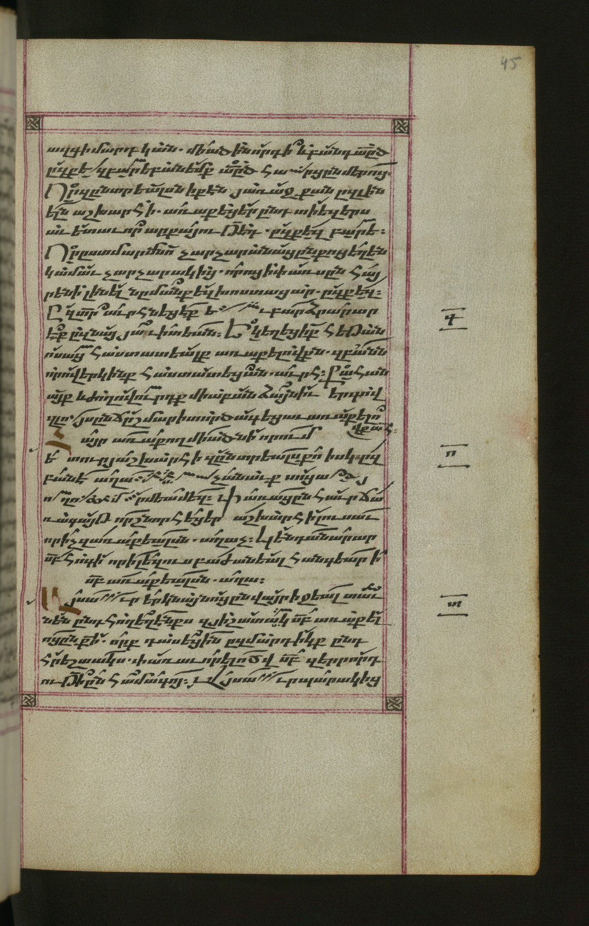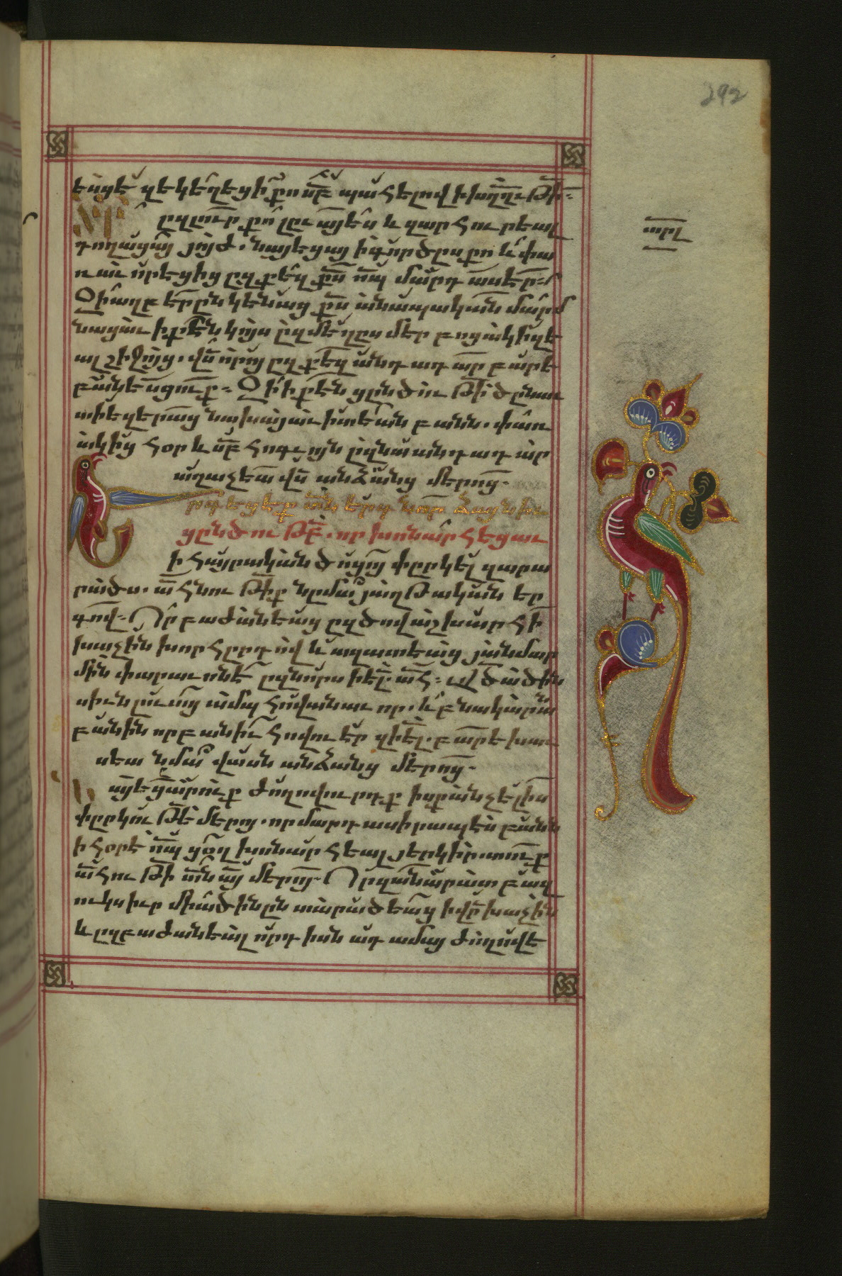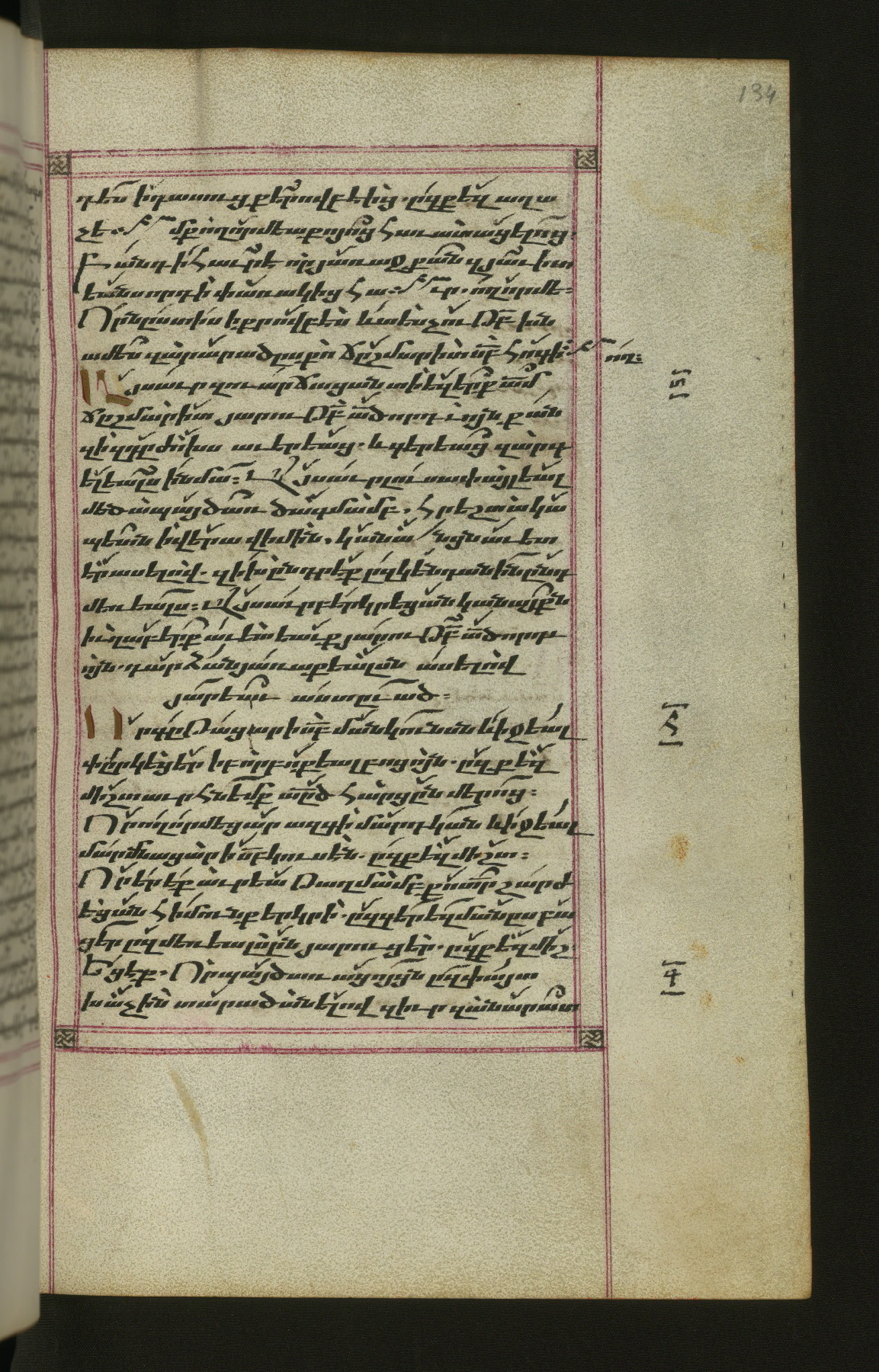 This hymnal was completed in Constantinople on August 15, 1678 [AE 1127], by the priest Yakob Pēligratc‘i, having been commissioned by Člav, son of Nawasard, as a dedication to his sons, Astuacatur and Sahak. The structure of the hymns adheres approximately to the standard Armenian hymnal (Շաբակնոց), with minor variations in order and a few substitutions (see Sanjian in the bibliography). The book is illuminated extensively, with thirty-eight full- and half-page polychrome miniatures against gold backgrounds, eight decorated head-pieces marking the principal divisions of the hymnal, and numerous marginal miniatures marking individual hymns, including biblical figures, saints, bishops, and vignettes. The style of the miniatures is largely in imitation of western European models, though more traditional Armenian and Byzantine influences stand out, such as the vibrant color palette, an iconic frontality for depictions of saints and bishops, and the highly abstracted floral motifs and zoomorphic incipits marking hymn divisions.