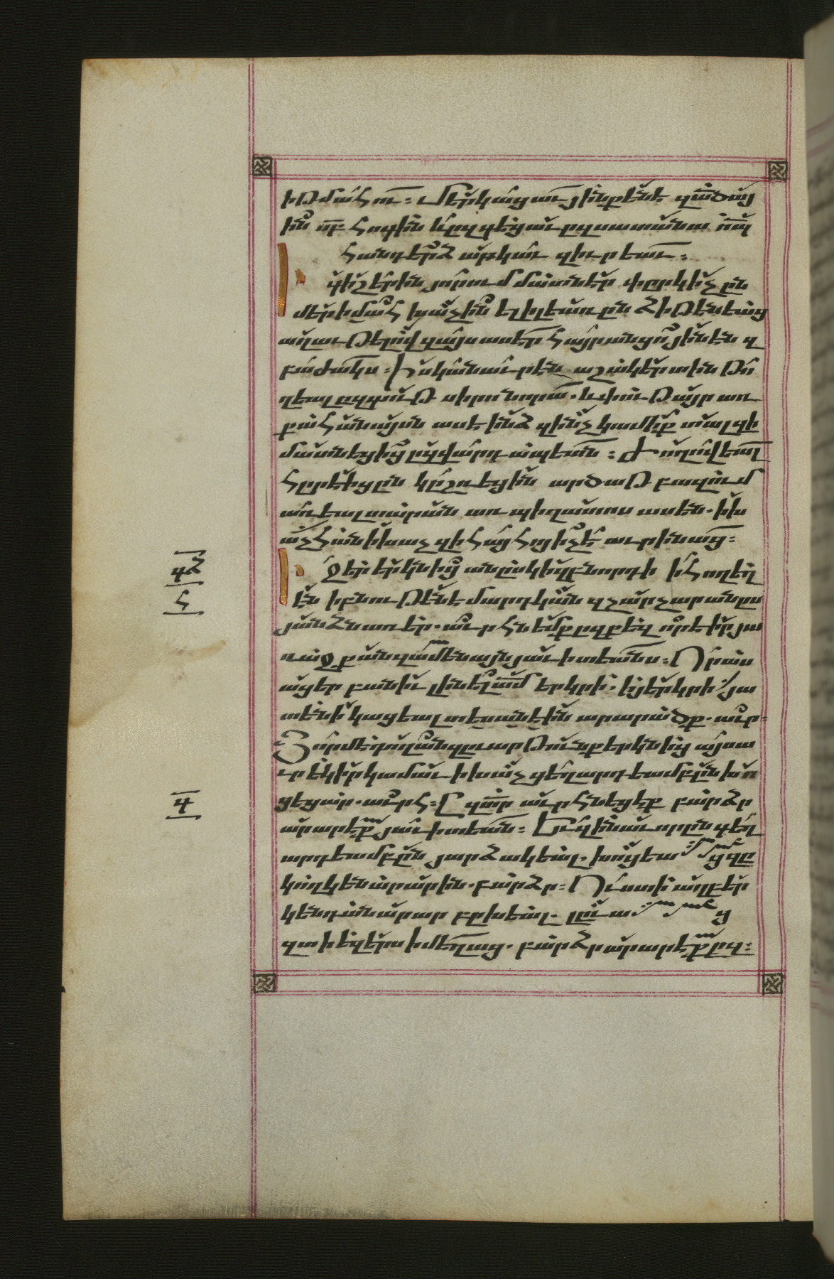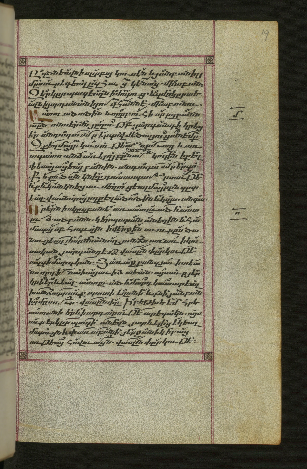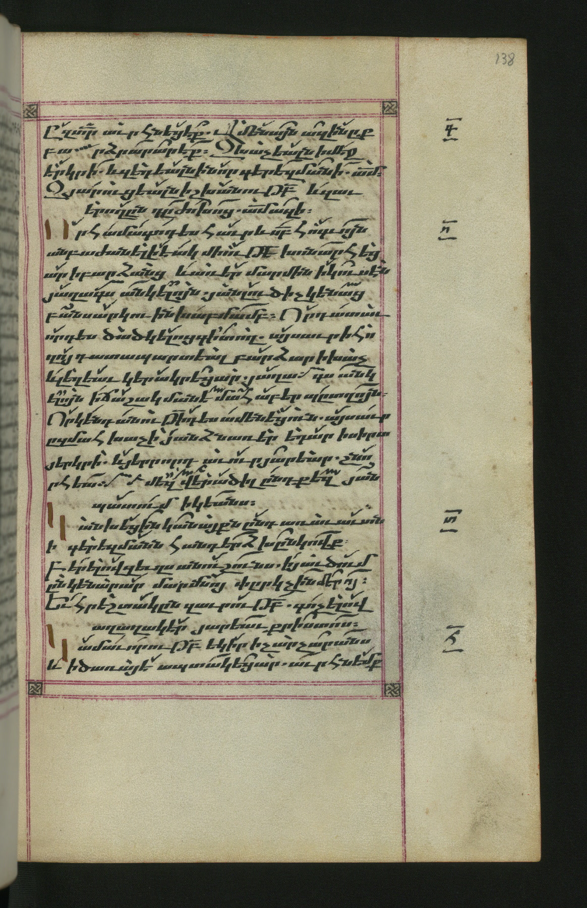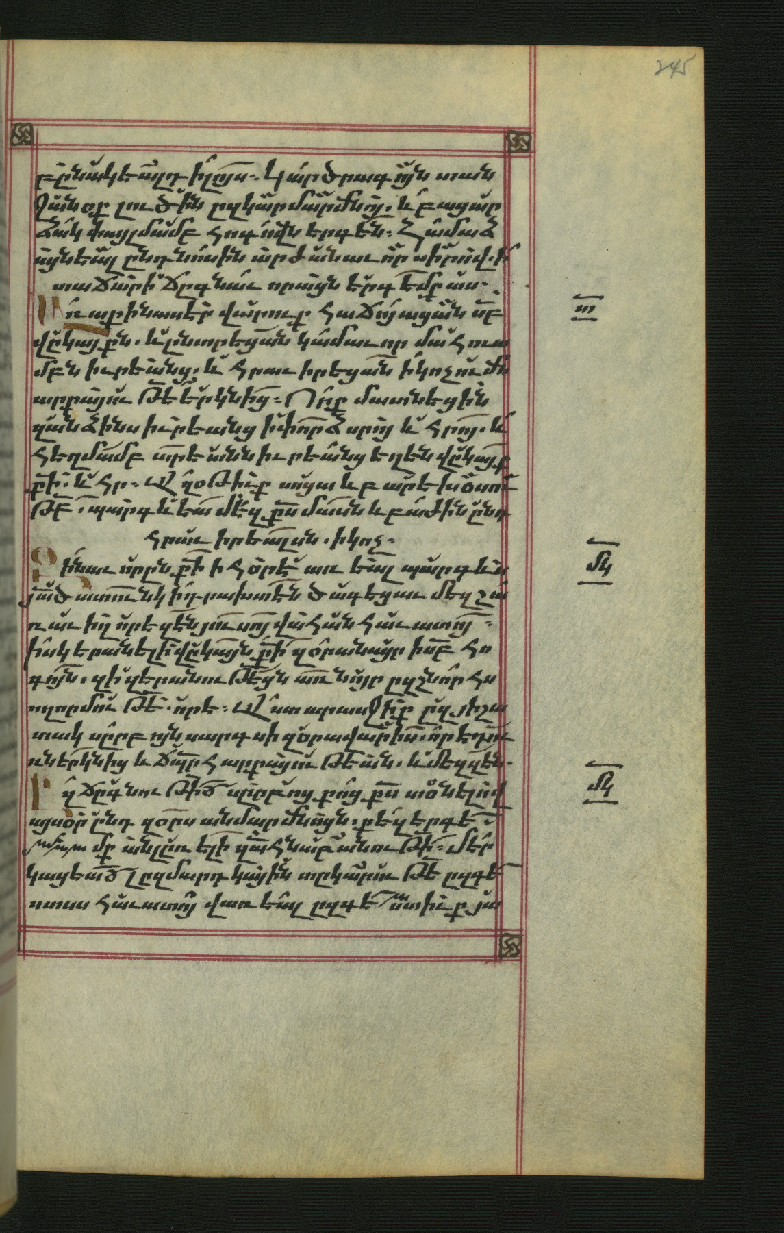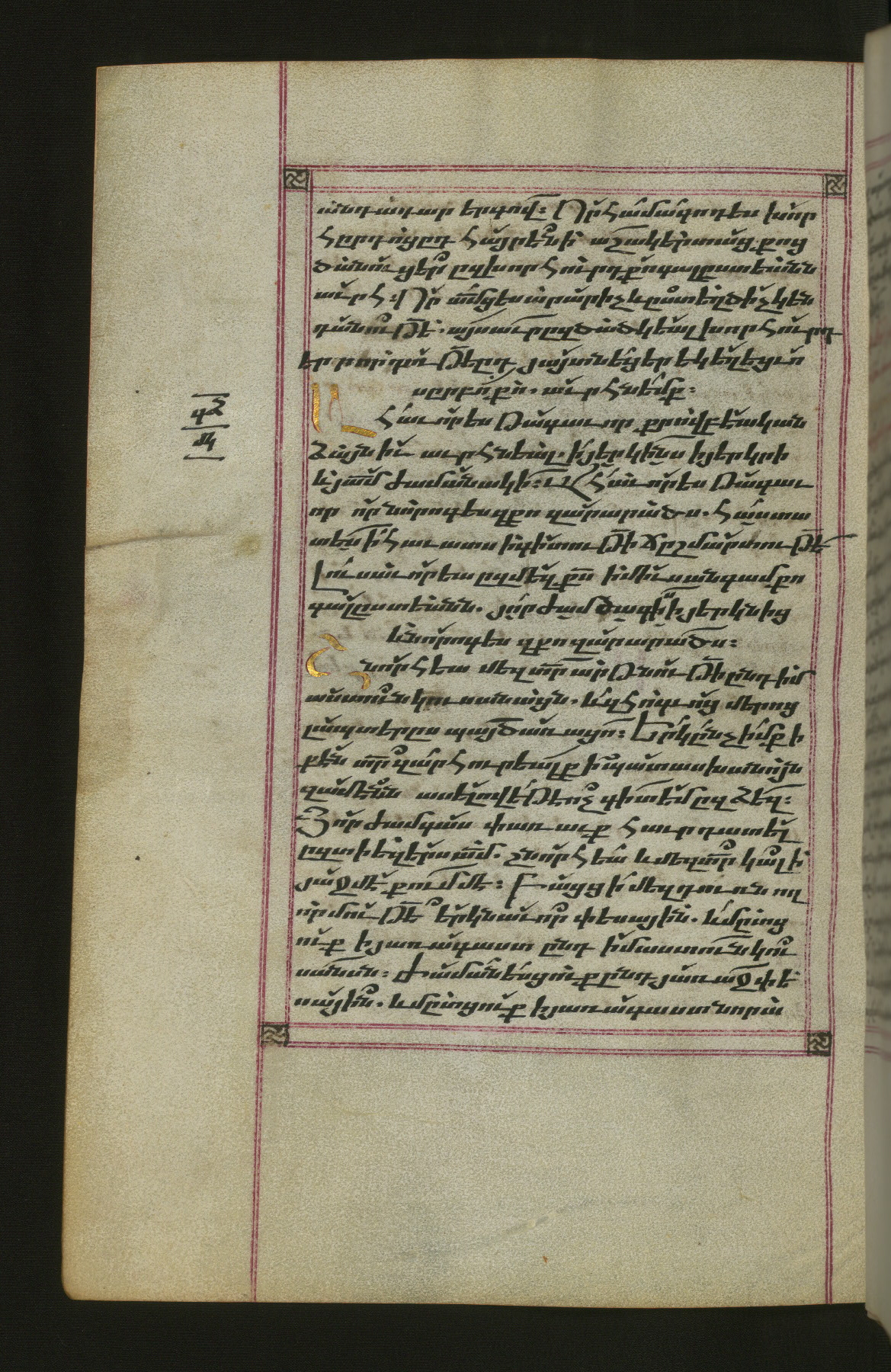 This hymnal was completed in Constantinople on August 15, 1678 [AE 1127], by the priest Yakob Pēligratc‘i, having been commissioned by Člav, son of Nawasard, as a dedication to his sons, Astuacatur and Sahak. The structure of the hymns adheres approximately to the standard Armenian hymnal (Շաբակնոց), with minor variations in order and a few substitutions (see Sanjian in the bibliography). The book is illuminated extensively, with thirty-eight full- and half-page polychrome miniatures against gold backgrounds, eight decorated head-pieces marking the principal divisions of the hymnal, and numerous marginal miniatures marking individual hymns, including biblical figures, saints, bishops, and vignettes. The style of the miniatures is largely in imitation of western European models, though more traditional Armenian and Byzantine influences stand out, such as the vibrant color palette, an iconic frontality for depictions of saints and bishops, and the highly abstracted floral motifs and zoomorphic incipits marking hymn divisions.