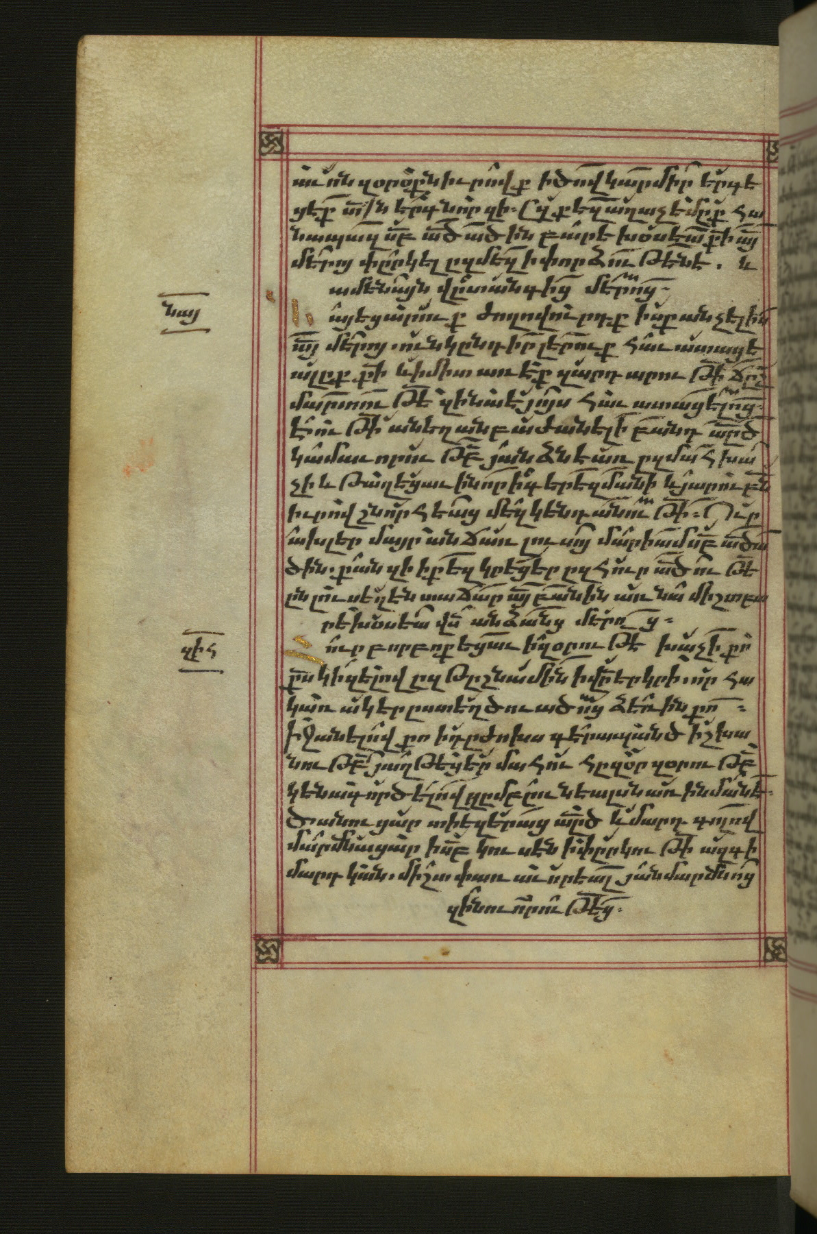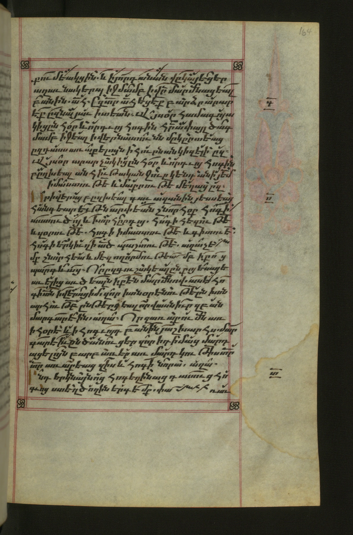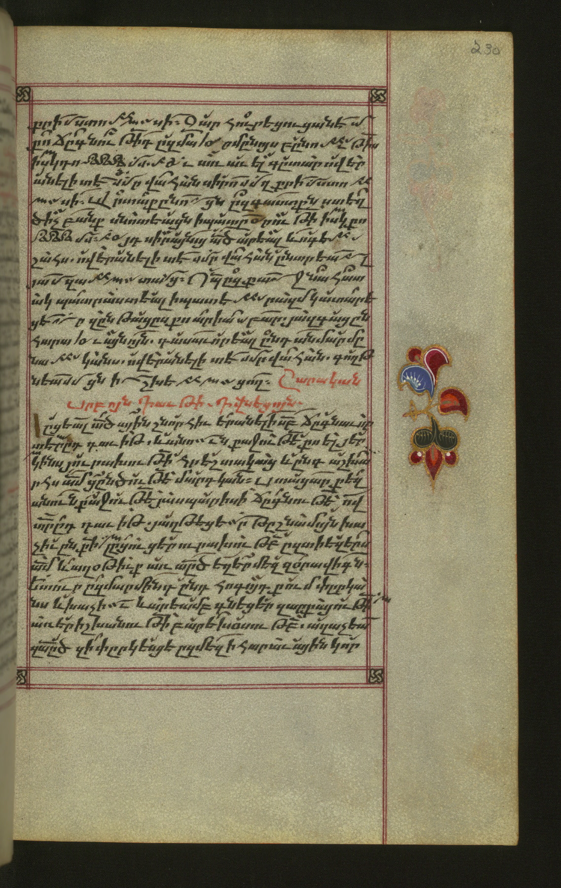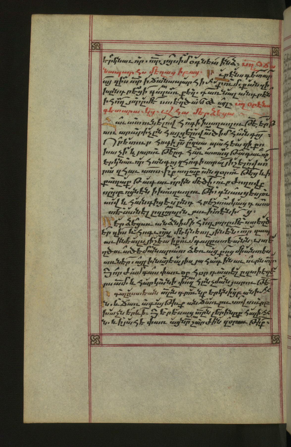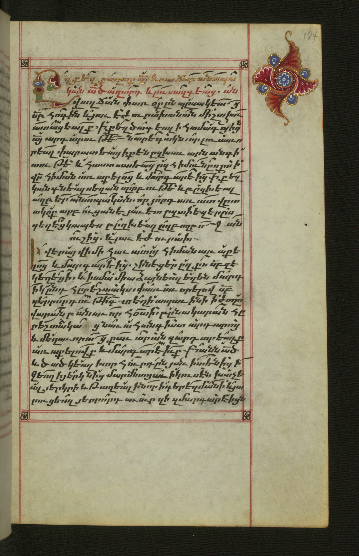 This hymnal was completed in Constantinople on August 15, 1678 [AE 1127], by the priest Yakob Pēligratc‘i, having been commissioned by Člav, son of Nawasard, as a dedication to his sons, Astuacatur and Sahak. The structure of the hymns adheres approximately to the standard Armenian hymnal (Շաբակնոց), with minor variations in order and a few substitutions (see Sanjian in the bibliography). The book is illuminated extensively, with thirty-eight full- and half-page polychrome miniatures against gold backgrounds, eight decorated head-pieces marking the principal divisions of the hymnal, and numerous marginal miniatures marking individual hymns, including biblical figures, saints, bishops, and vignettes. The style of the miniatures is largely in imitation of western European models, though more traditional Armenian and Byzantine influences stand out, such as the vibrant color palette, an iconic frontality for depictions of saints and bishops, and the highly abstracted floral motifs and zoomorphic incipits marking hymn divisions.