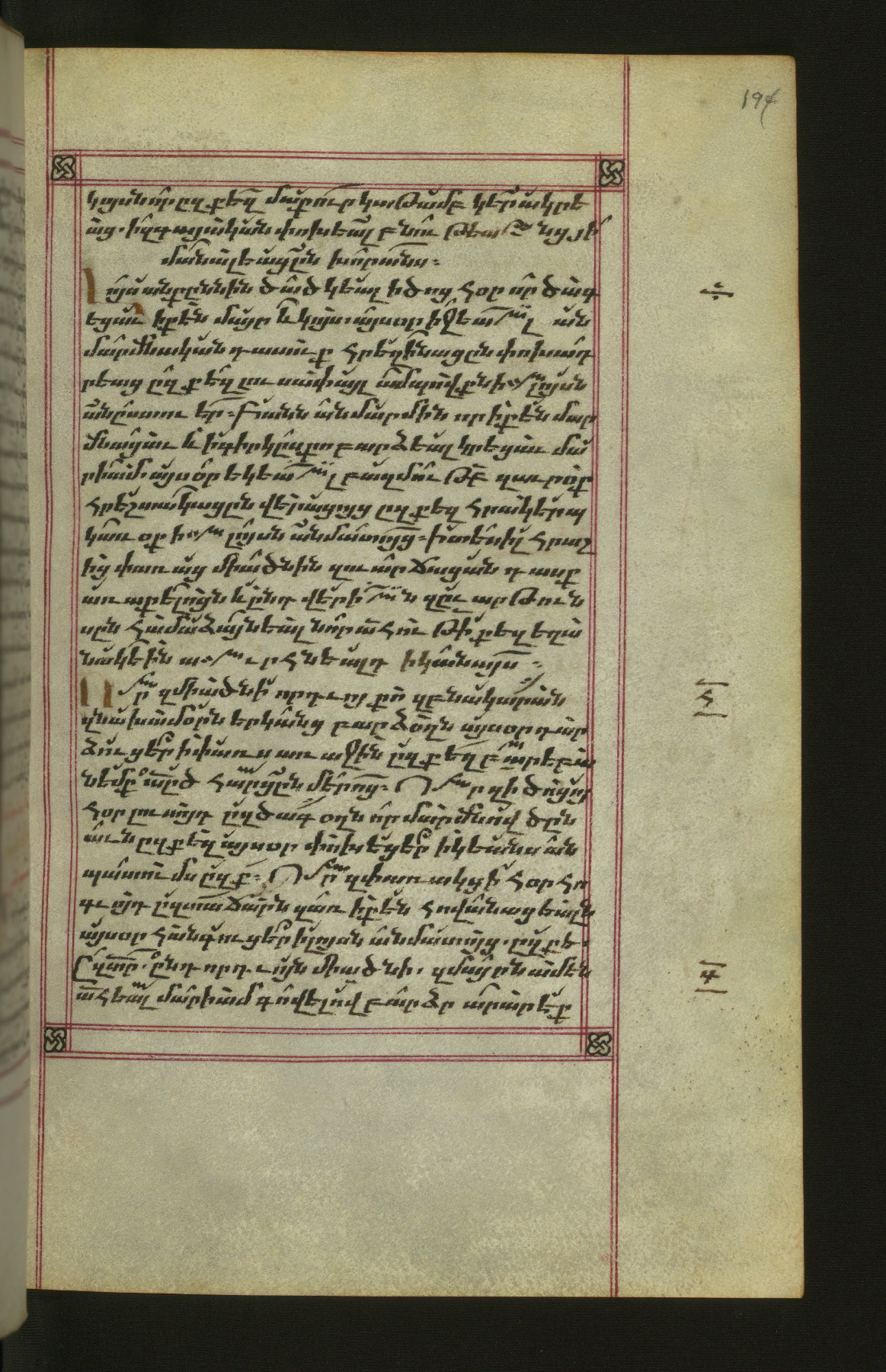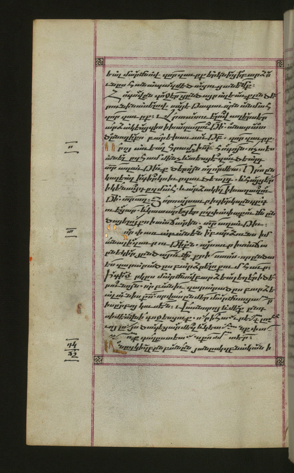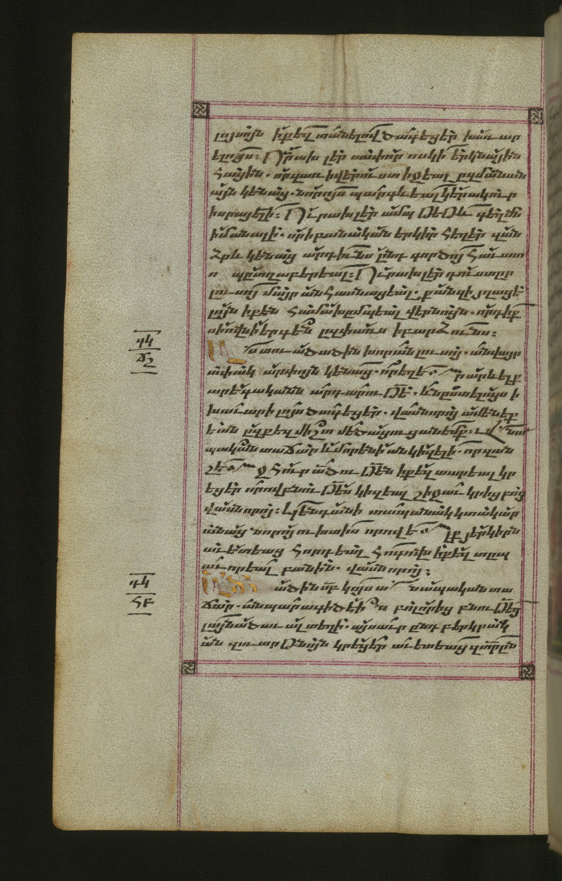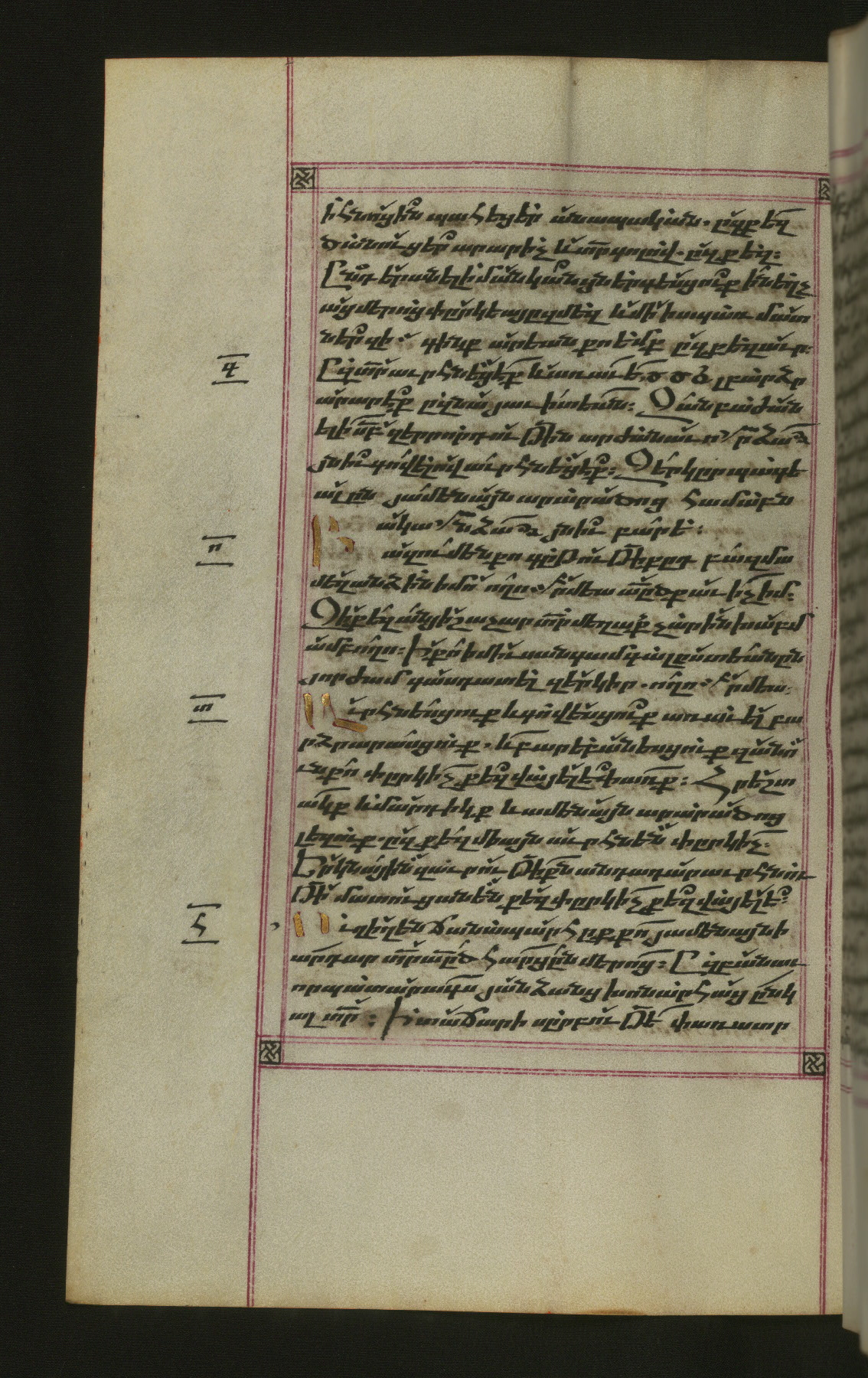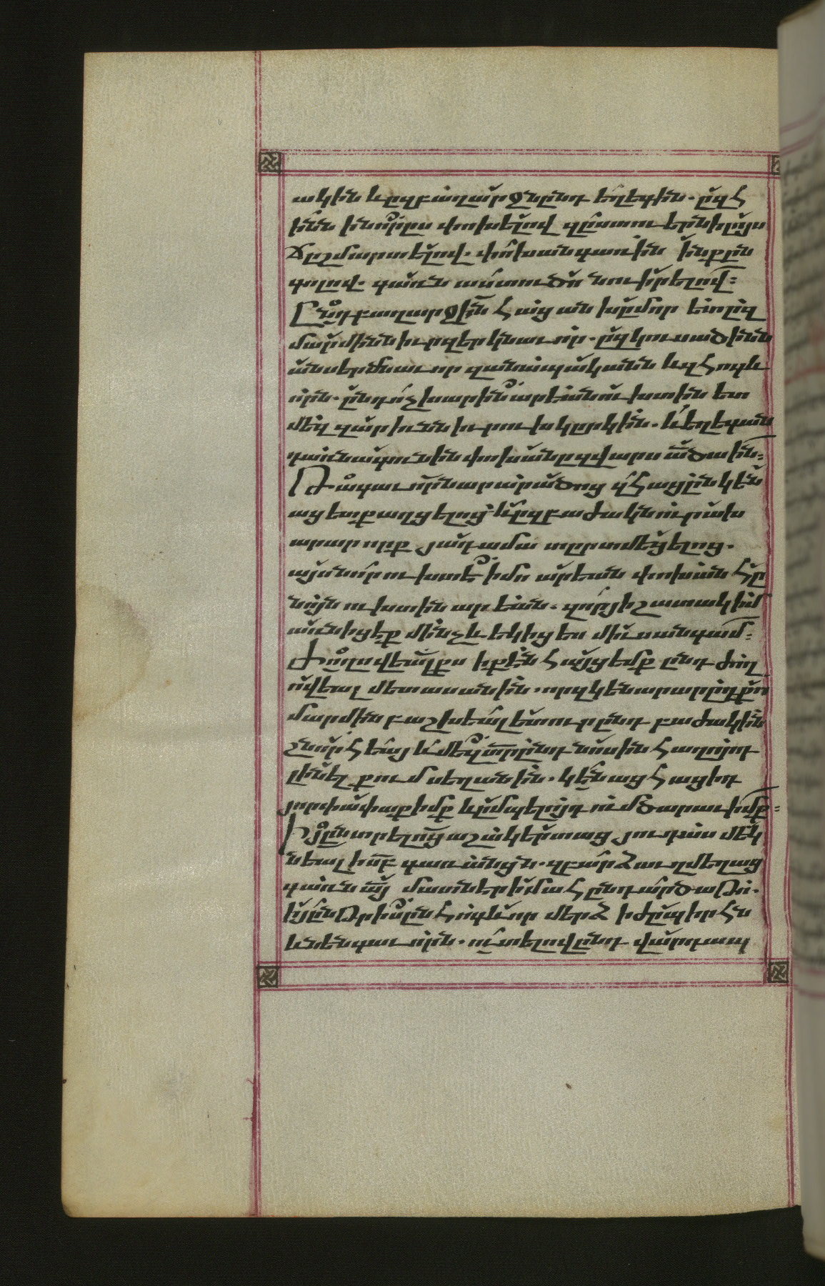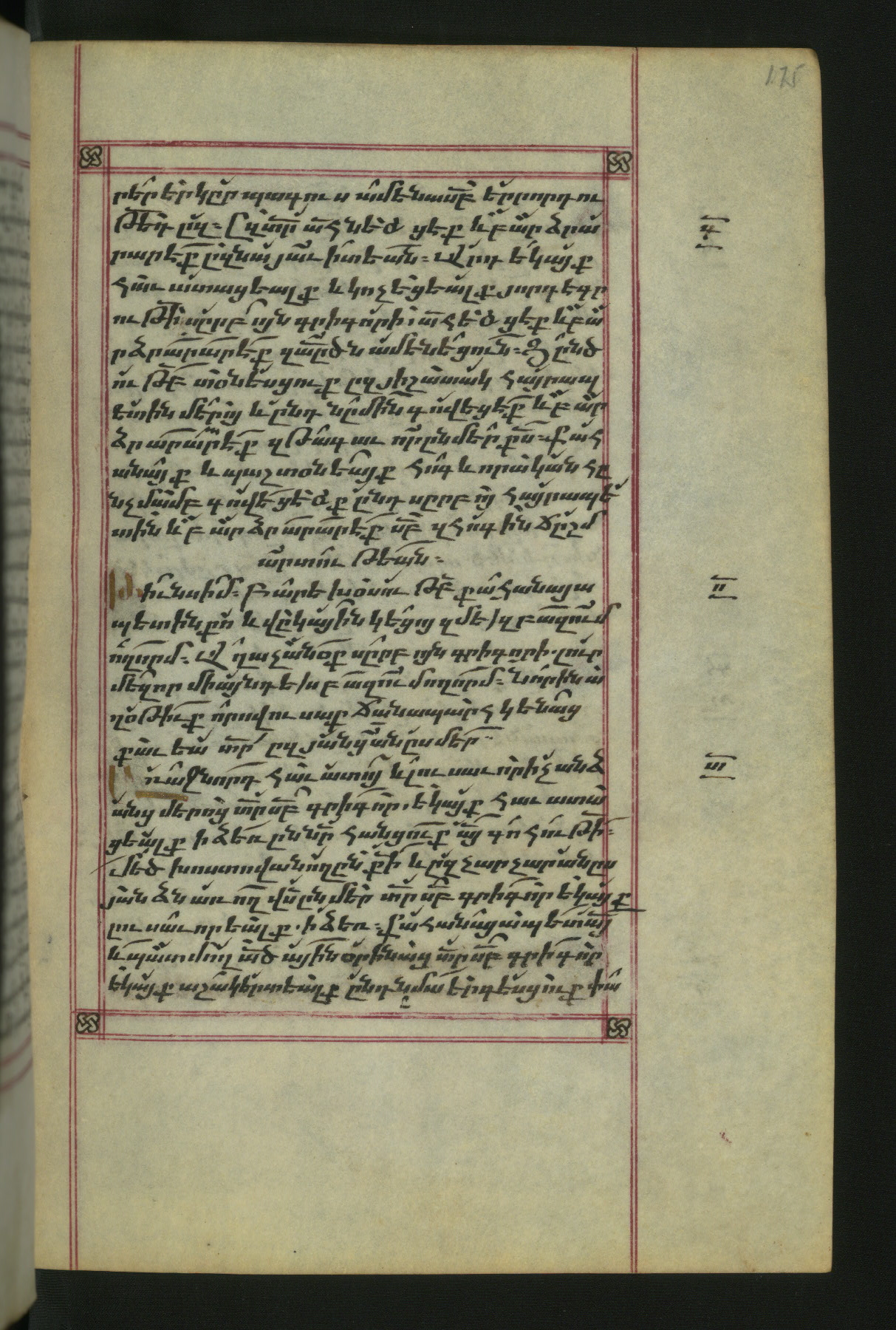 This hymnal was completed in Constantinople on August 15, 1678 [AE 1127], by the priest Yakob Pēligratc‘i, having been commissioned by Člav, son of Nawasard, as a dedication to his sons, Astuacatur and Sahak. The structure of the hymns adheres approximately to the standard Armenian hymnal (Շաբակնոց), with minor variations in order and a few substitutions (see Sanjian in the bibliography). The book is illuminated extensively, with thirty-eight full- and half-page polychrome miniatures against gold backgrounds, eight decorated head-pieces marking the principal divisions of the hymnal, and numerous marginal miniatures marking individual hymns, including biblical figures, saints, bishops, and vignettes. The style of the miniatures is largely in imitation of western European models, though more traditional Armenian and Byzantine influences stand out, such as the vibrant color palette, an iconic frontality for depictions of saints and bishops, and the highly abstracted floral motifs and zoomorphic incipits marking hymn divisions.