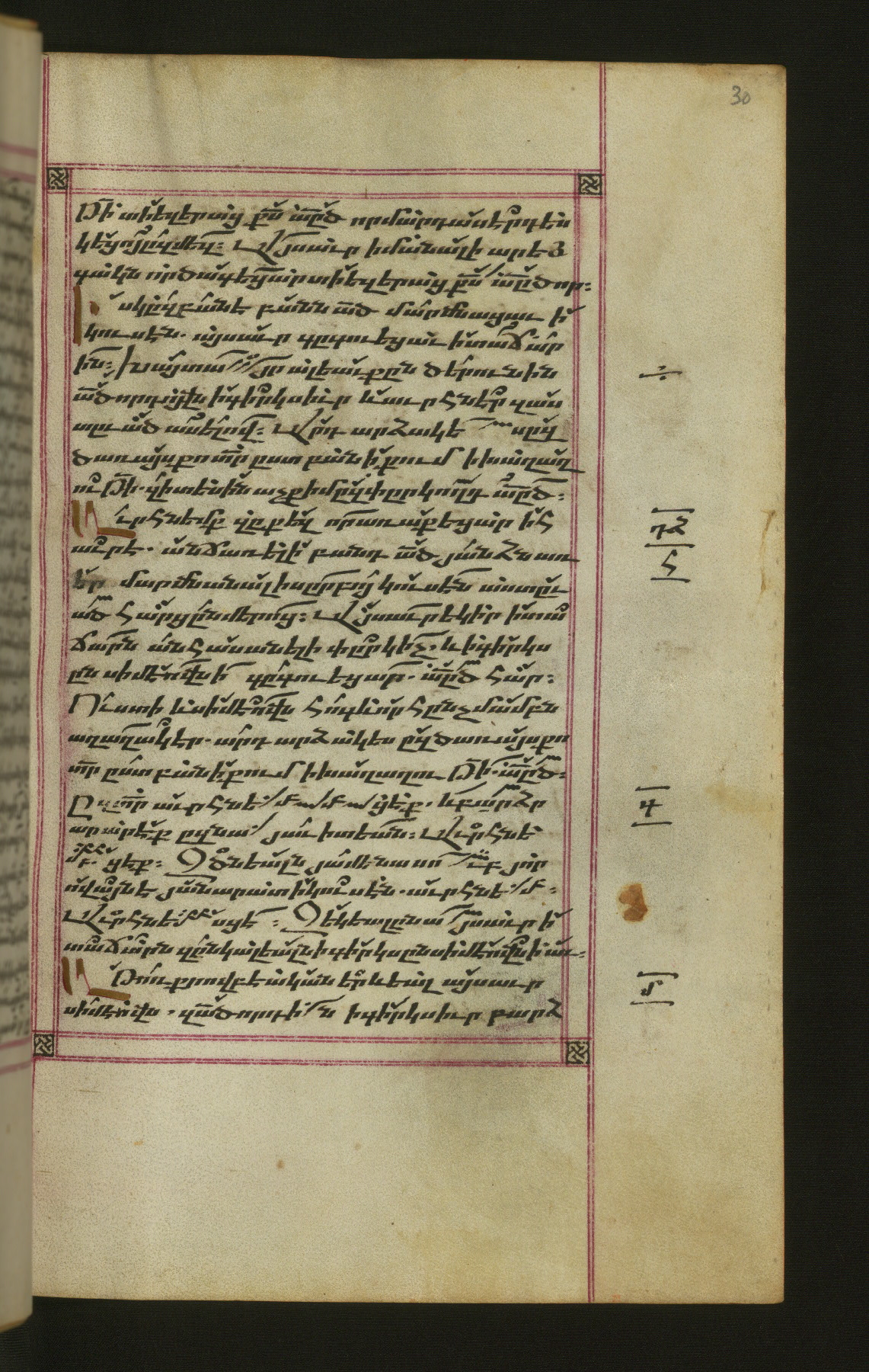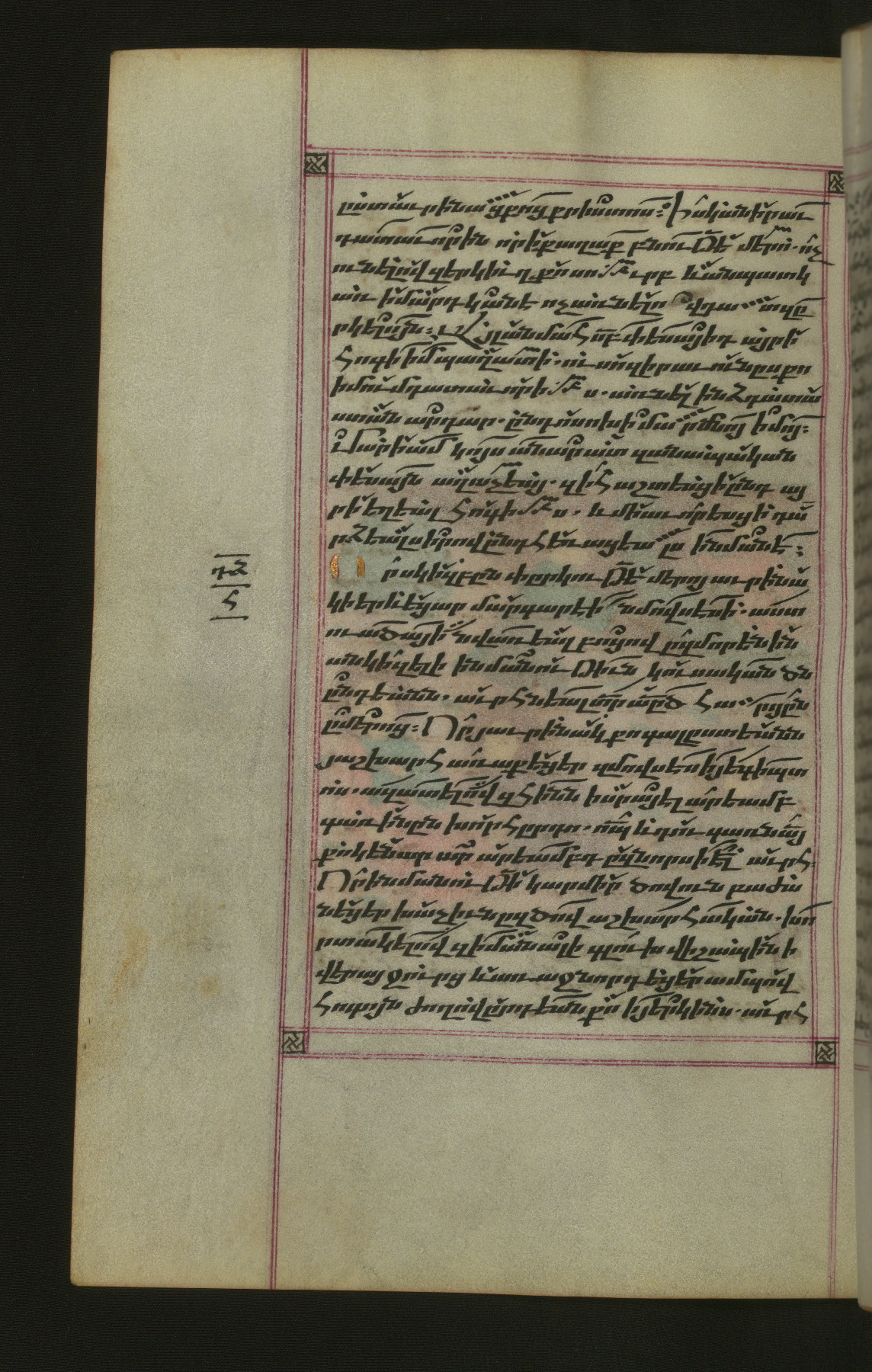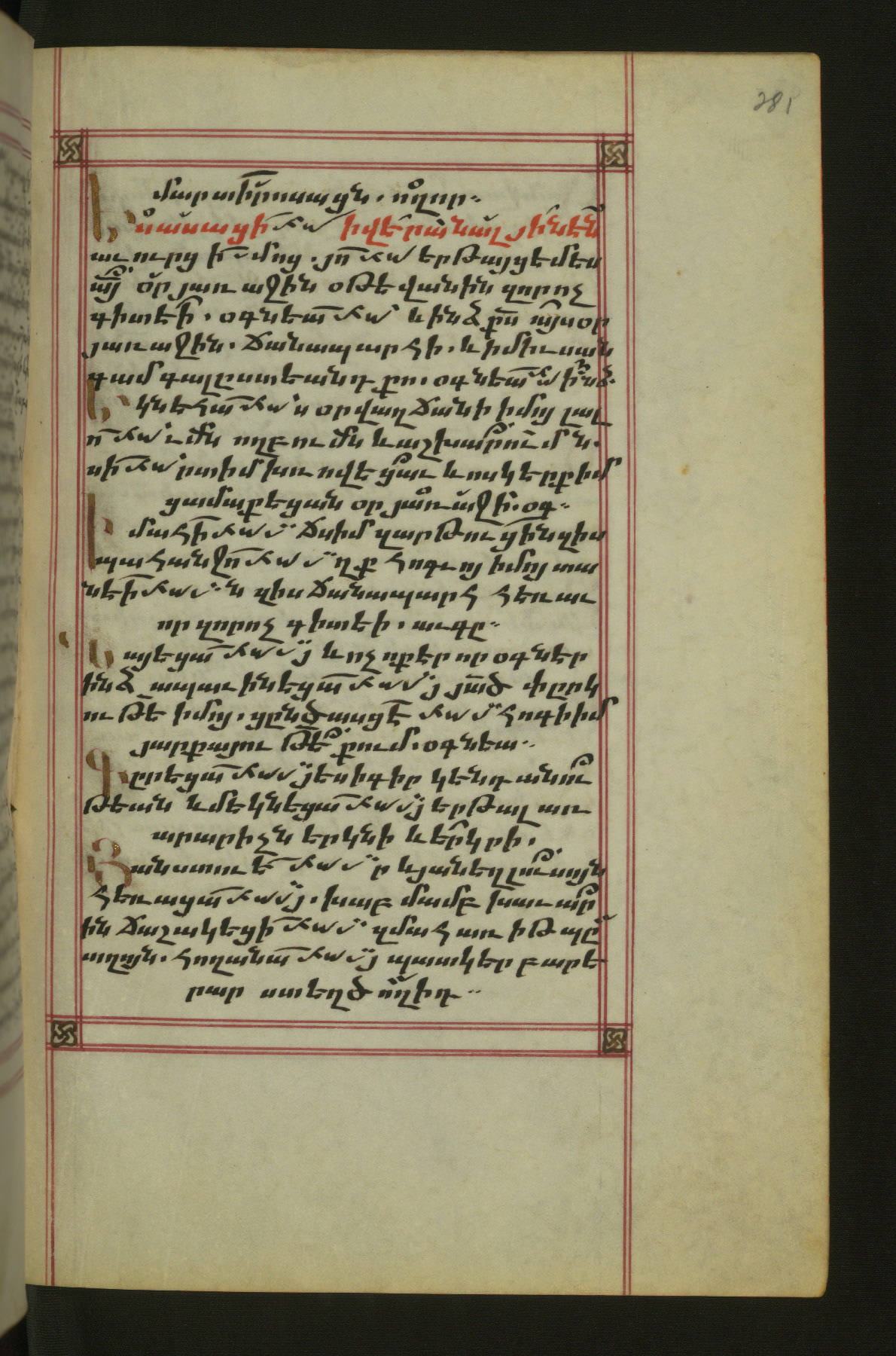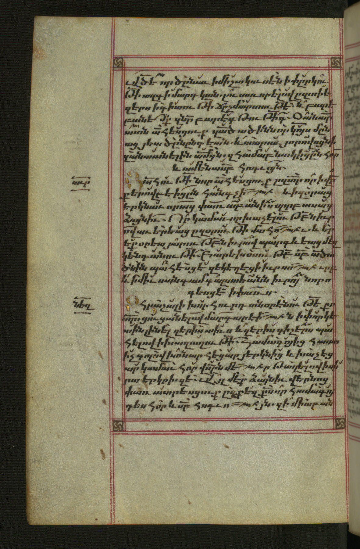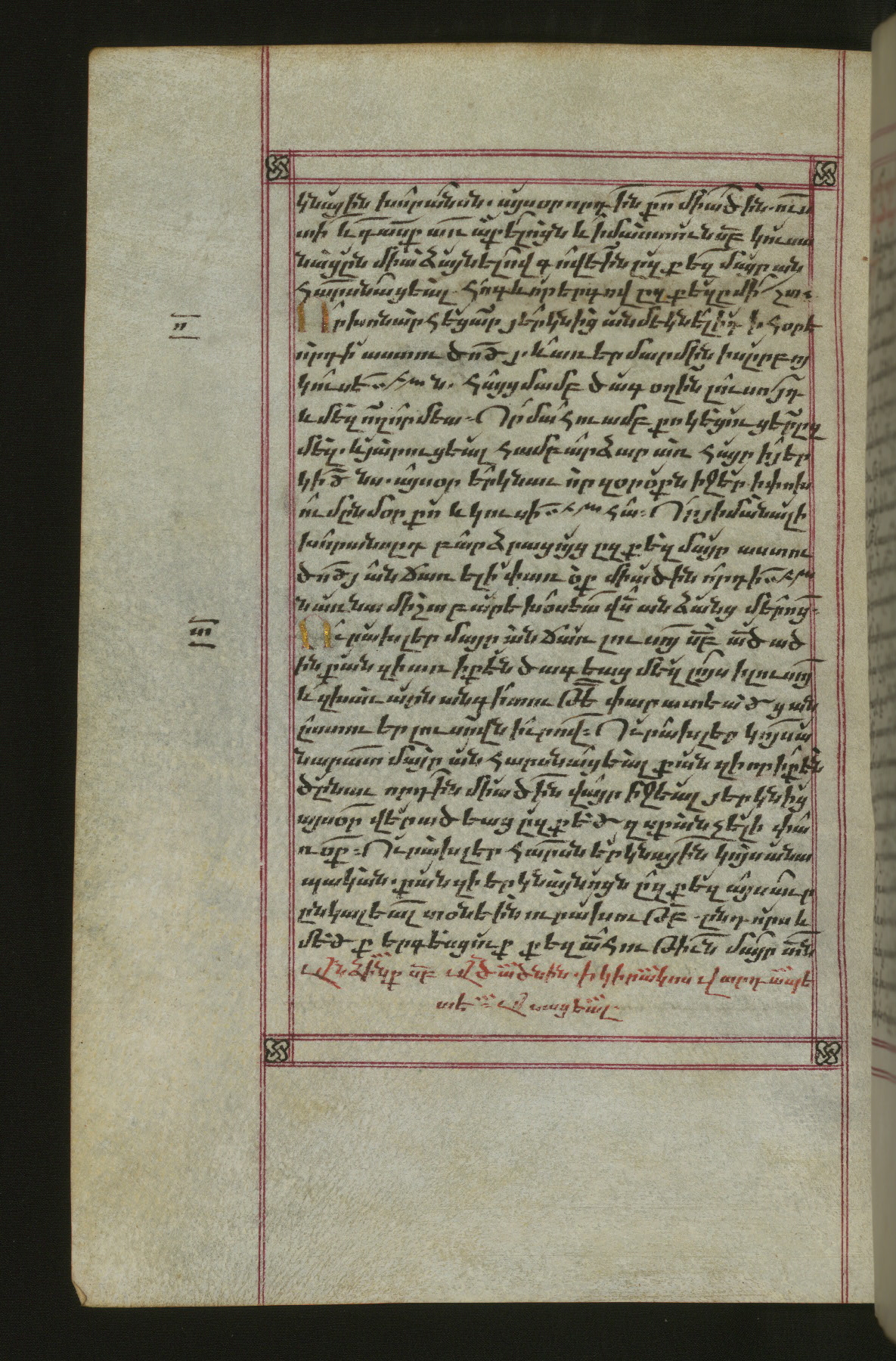 This hymnal was completed in Constantinople on August 15, 1678 [AE 1127], by the priest Yakob Pēligratc‘i, having been commissioned by Člav, son of Nawasard, as a dedication to his sons, Astuacatur and Sahak. The structure of the hymns adheres approximately to the standard Armenian hymnal (Շաբակնոց), with minor variations in order and a few substitutions (see Sanjian in the bibliography). The book is illuminated extensively, with thirty-eight full- and half-page polychrome miniatures against gold backgrounds, eight decorated head-pieces marking the principal divisions of the hymnal, and numerous marginal miniatures marking individual hymns, including biblical figures, saints, bishops, and vignettes. The style of the miniatures is largely in imitation of western European models, though more traditional Armenian and Byzantine influences stand out, such as the vibrant color palette, an iconic frontality for depictions of saints and bishops, and the highly abstracted floral motifs and zoomorphic incipits marking hymn divisions.