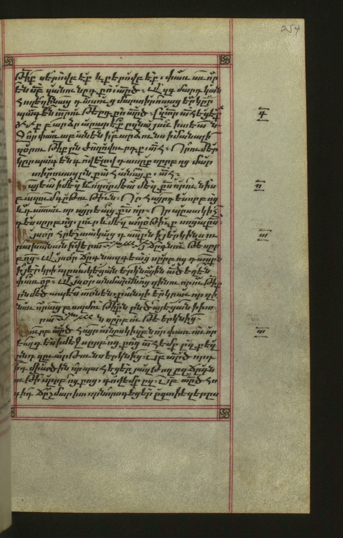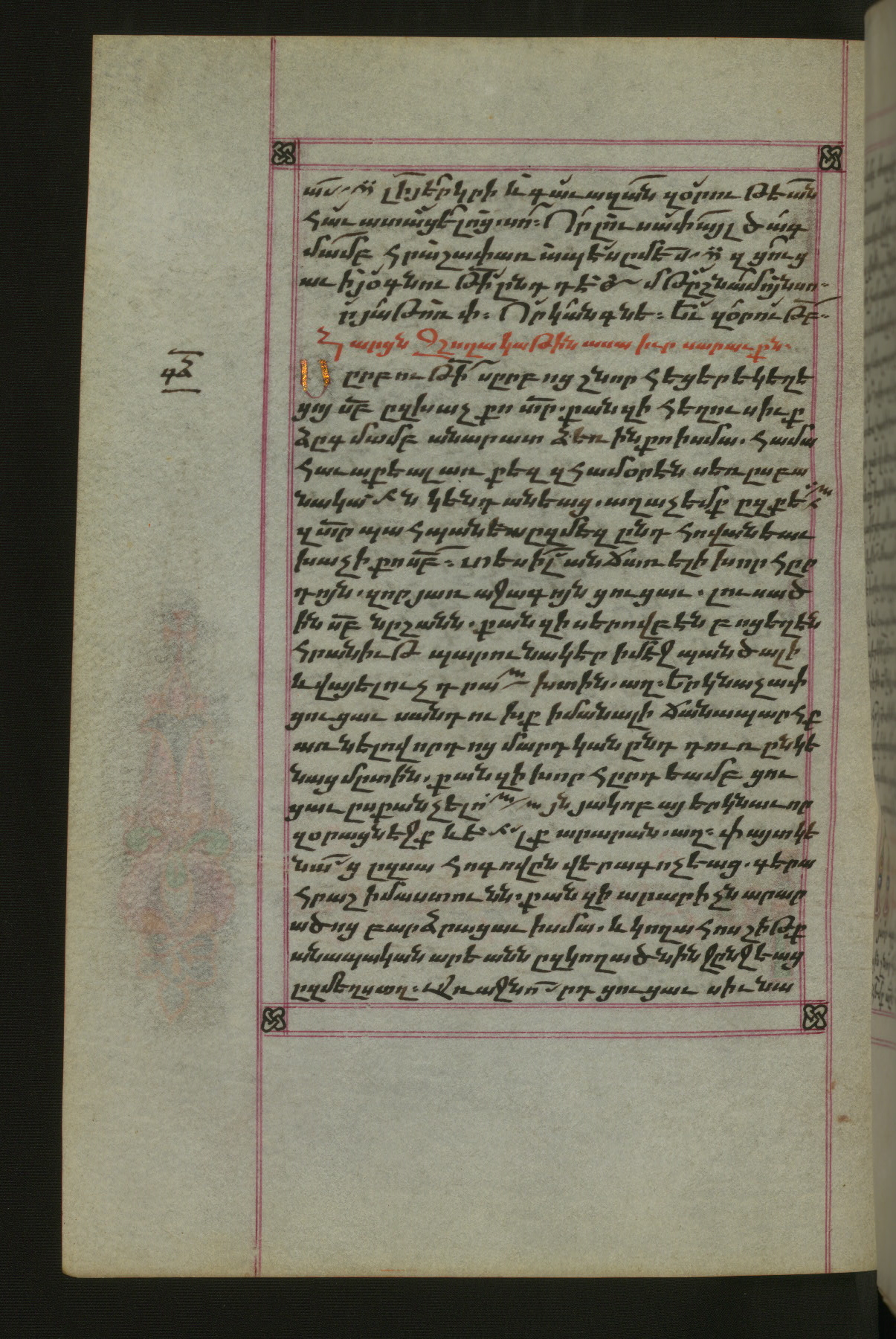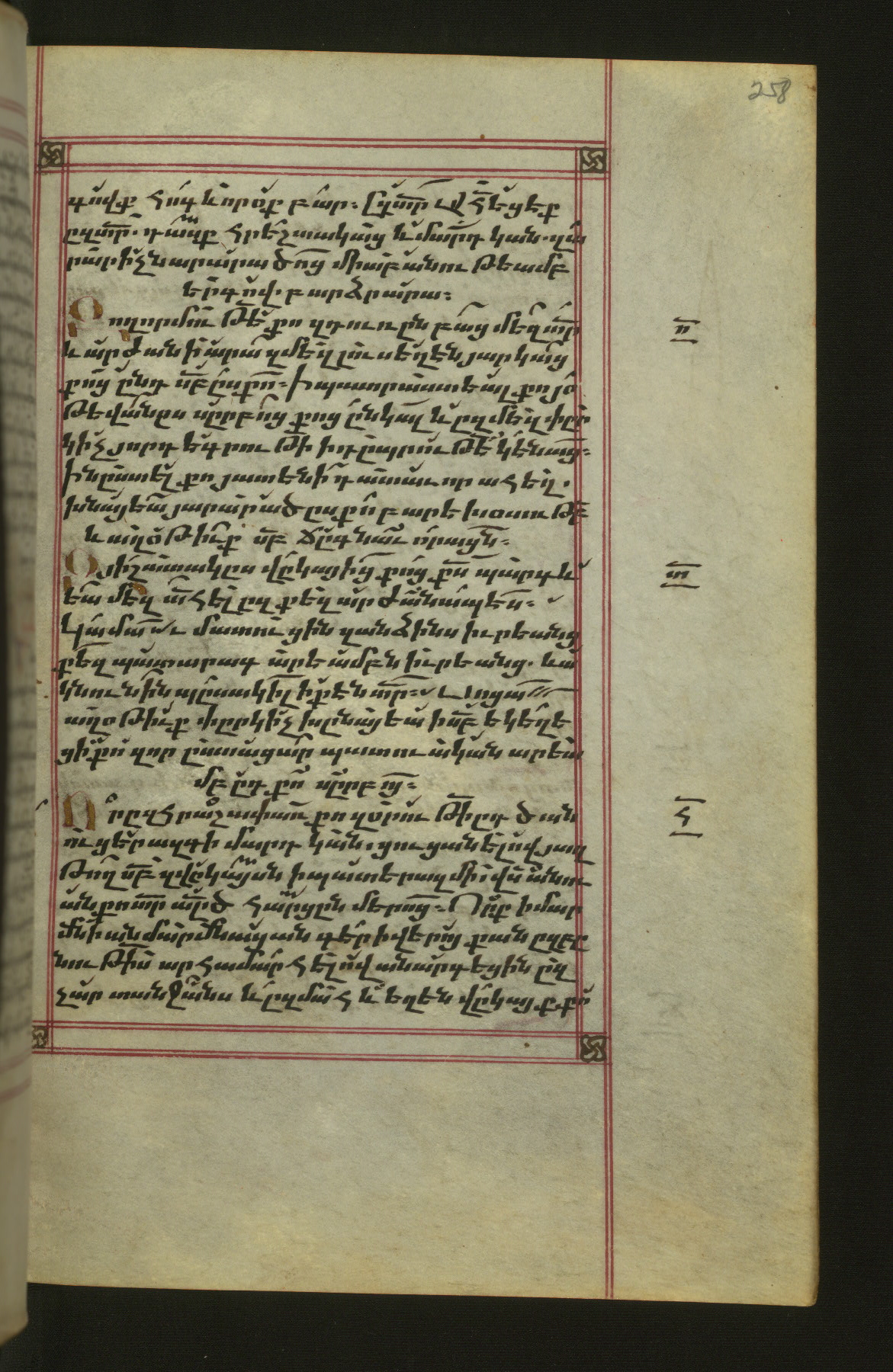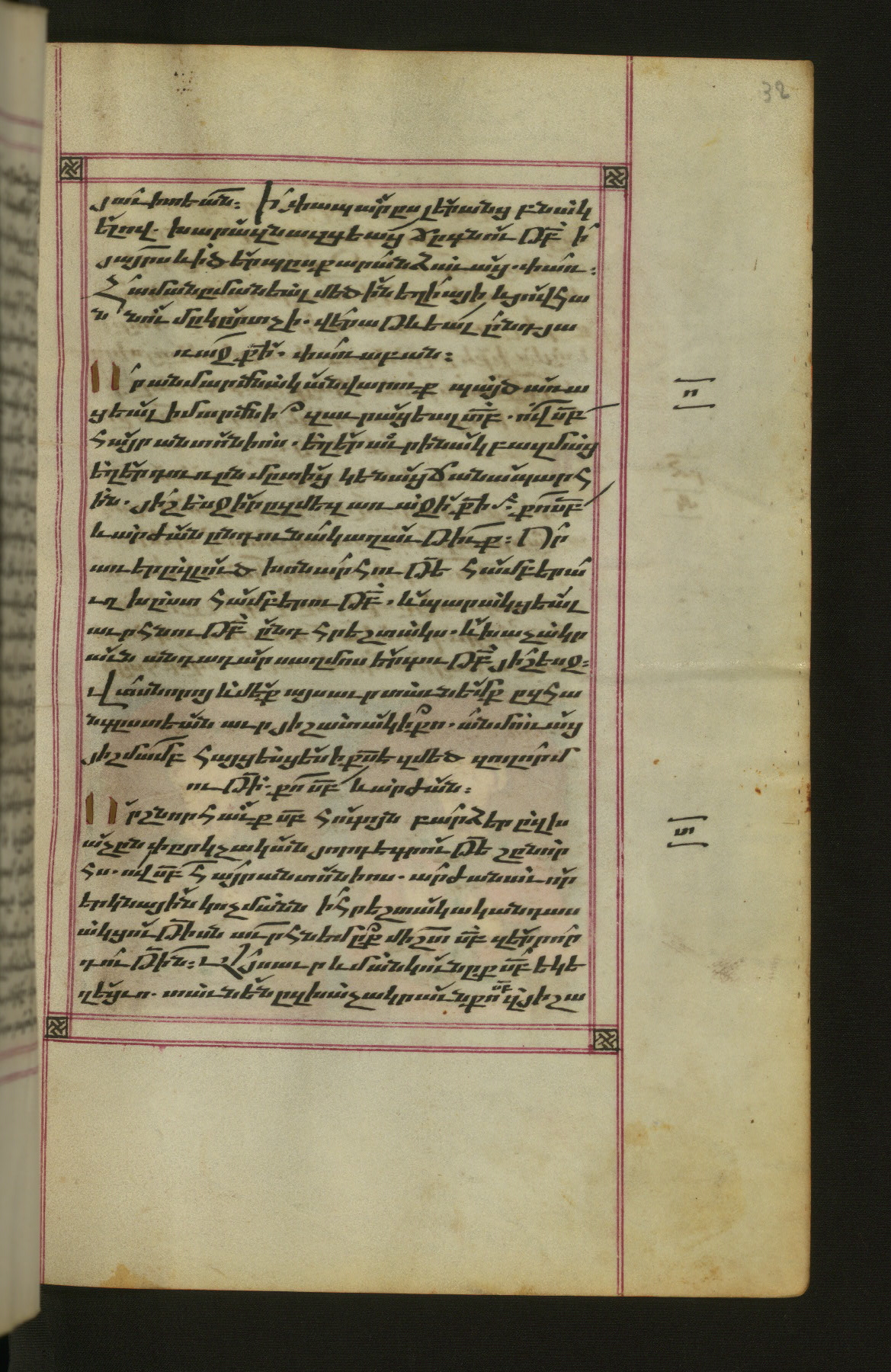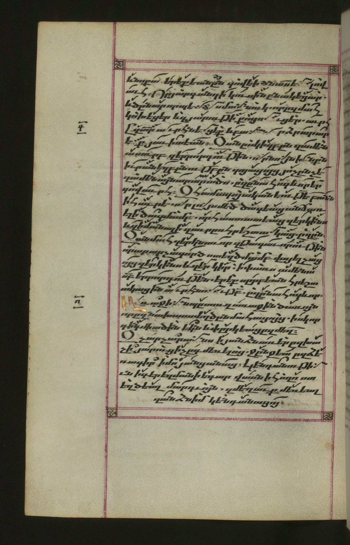 This hymnal was completed in Constantinople on August 15, 1678 [AE 1127], by the priest Yakob Pēligratc‘i, having been commissioned by Člav, son of Nawasard, as a dedication to his sons, Astuacatur and Sahak. The structure of the hymns adheres approximately to the standard Armenian hymnal (Շաբակնոց), with minor variations in order and a few substitutions (see Sanjian in the bibliography). The book is illuminated extensively, with thirty-eight full- and half-page polychrome miniatures against gold backgrounds, eight decorated head-pieces marking the principal divisions of the hymnal, and numerous marginal miniatures marking individual hymns, including biblical figures, saints, bishops, and vignettes. The style of the miniatures is largely in imitation of western European models, though more traditional Armenian and Byzantine influences stand out, such as the vibrant color palette, an iconic frontality for depictions of saints and bishops, and the highly abstracted floral motifs and zoomorphic incipits marking hymn divisions.