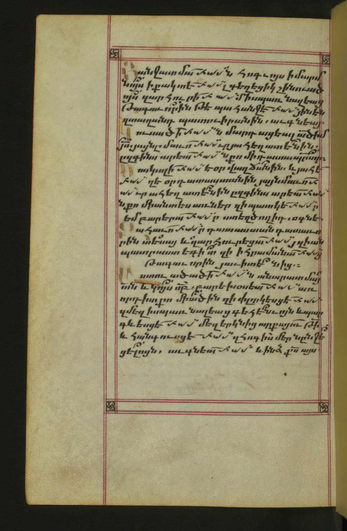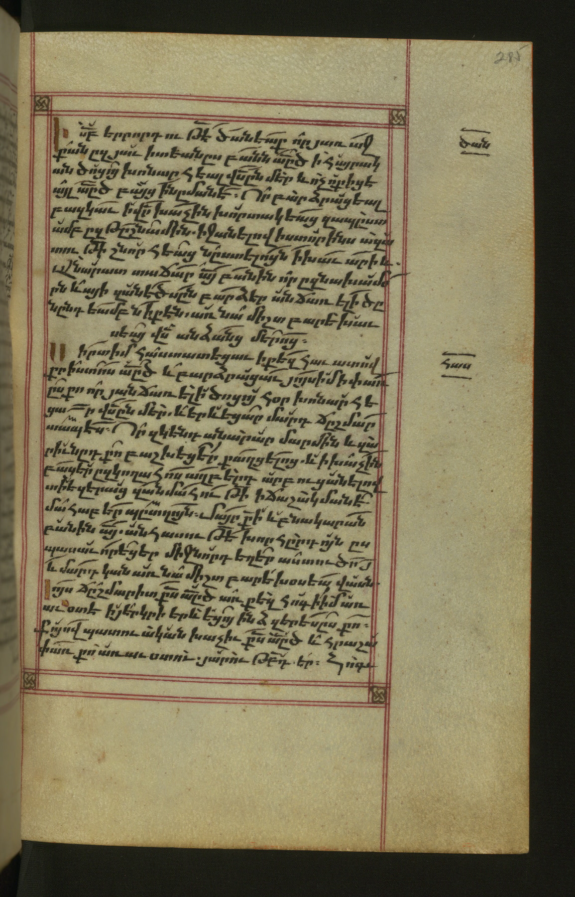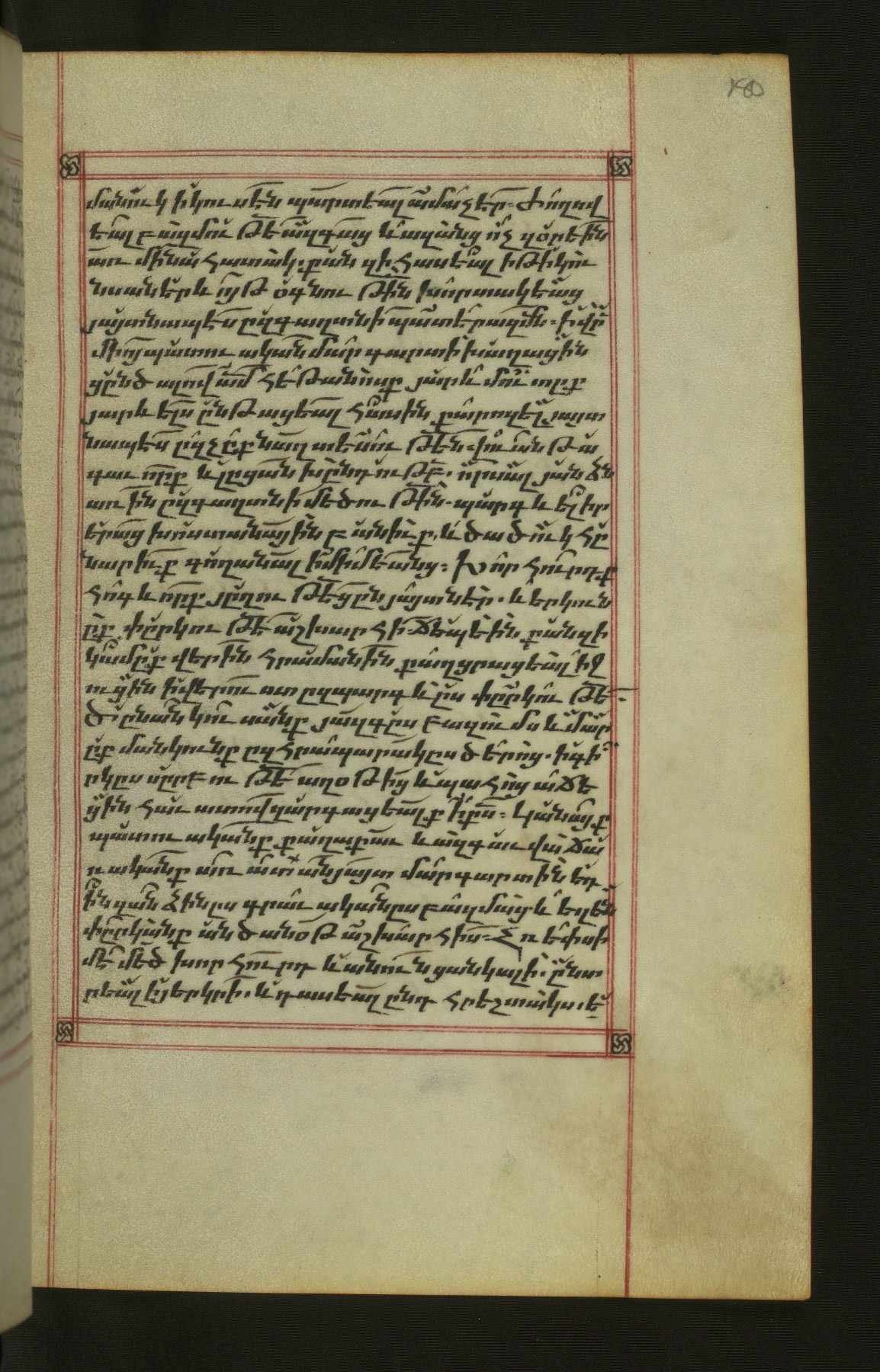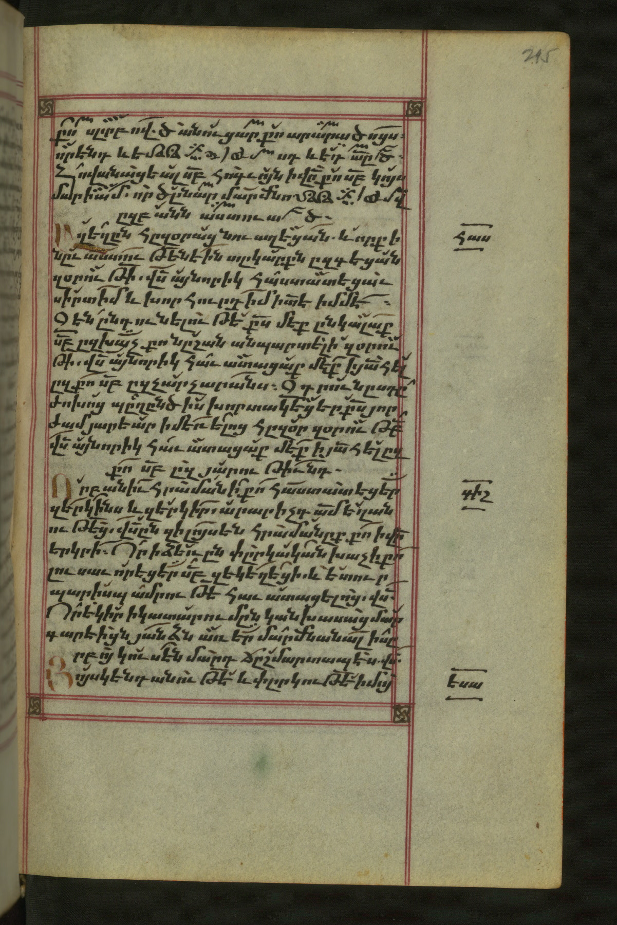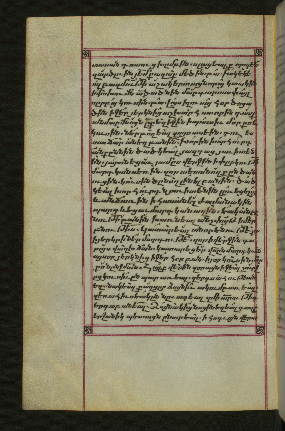 This hymnal was completed in Constantinople on August 15, 1678 [AE 1127], by the priest Yakob Pēligratc‘i, having been commissioned by Člav, son of Nawasard, as a dedication to his sons, Astuacatur and Sahak. The structure of the hymns adheres approximately to the standard Armenian hymnal (Շաբակնոց), with minor variations in order and a few substitutions (see Sanjian in the bibliography). The book is illuminated extensively, with thirty-eight full- and half-page polychrome miniatures against gold backgrounds, eight decorated head-pieces marking the principal divisions of the hymnal, and numerous marginal miniatures marking individual hymns, including biblical figures, saints, bishops, and vignettes. The style of the miniatures is largely in imitation of western European models, though more traditional Armenian and Byzantine influences stand out, such as the vibrant color palette, an iconic frontality for depictions of saints and bishops, and the highly abstracted floral motifs and zoomorphic incipits marking hymn divisions.