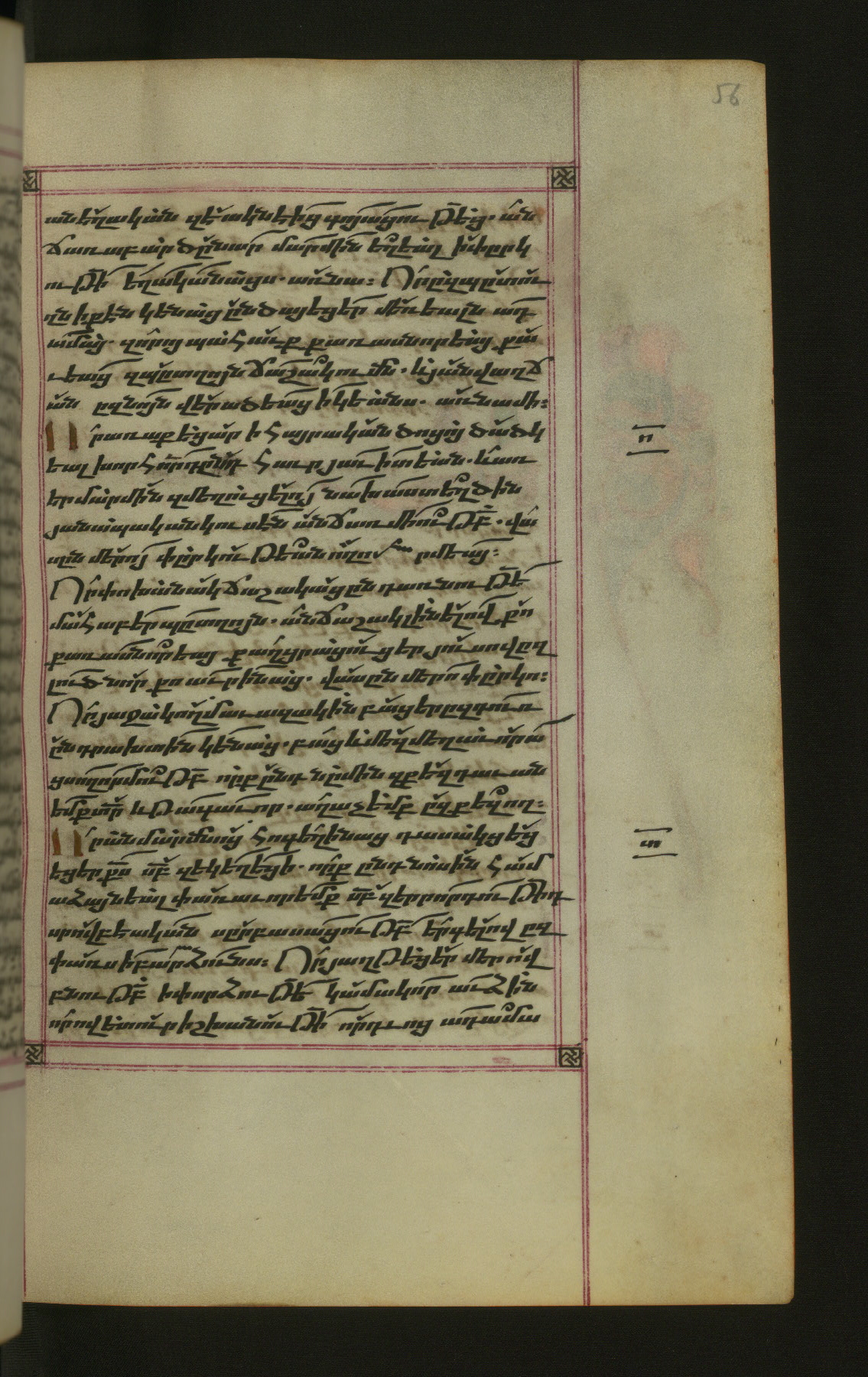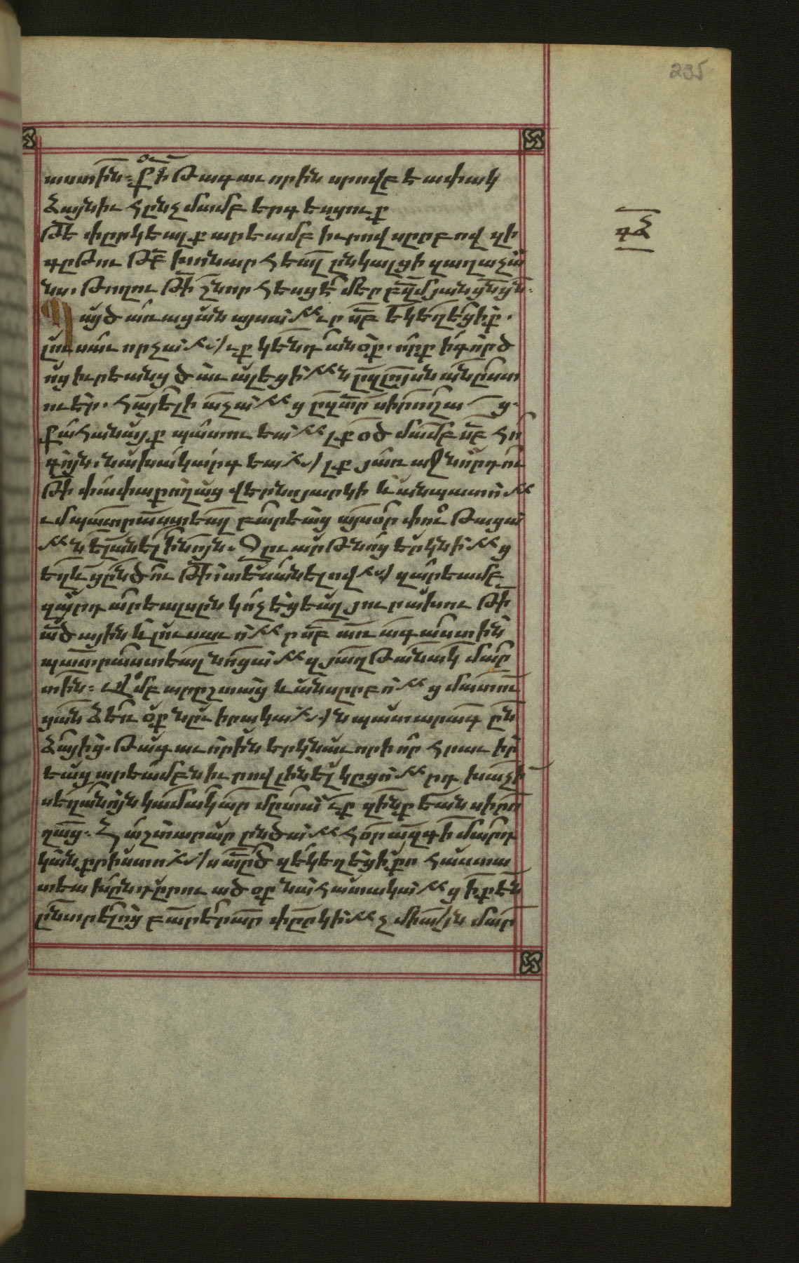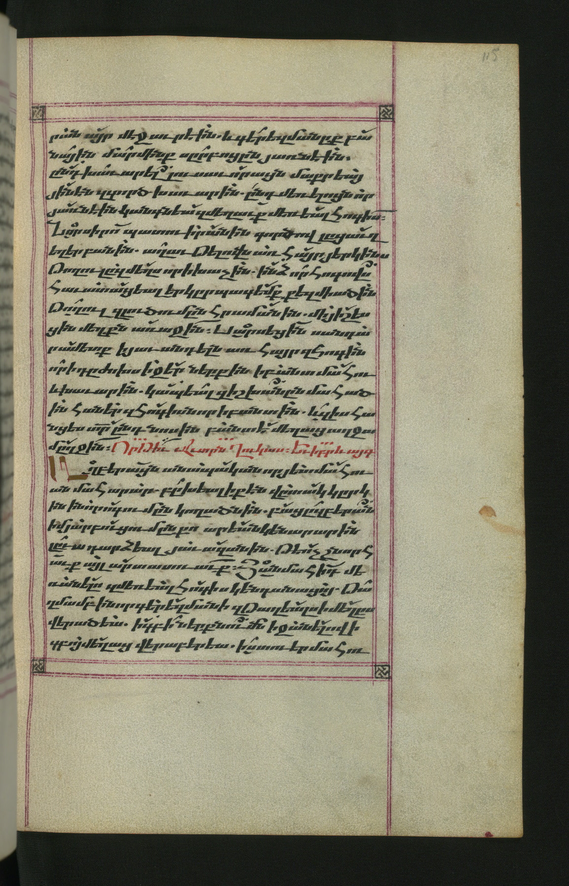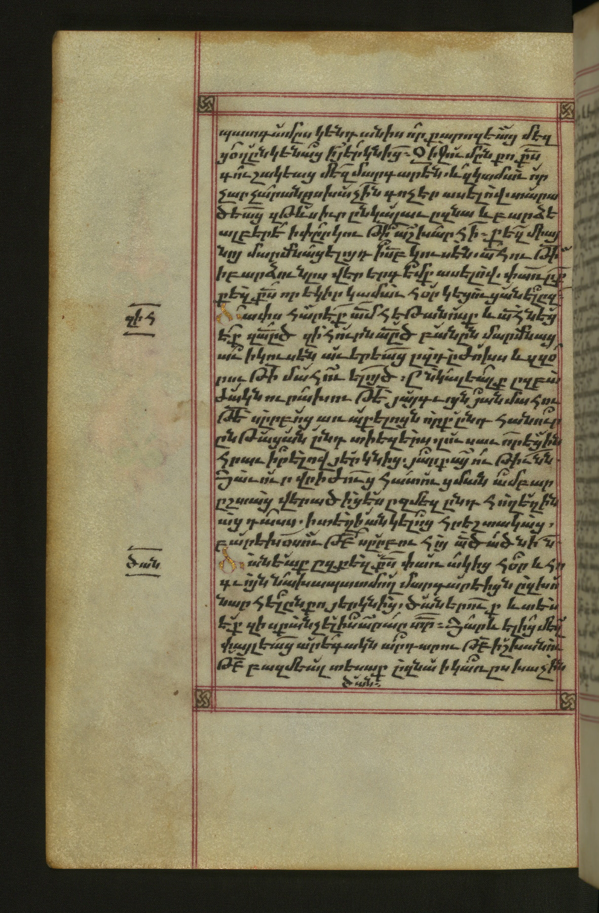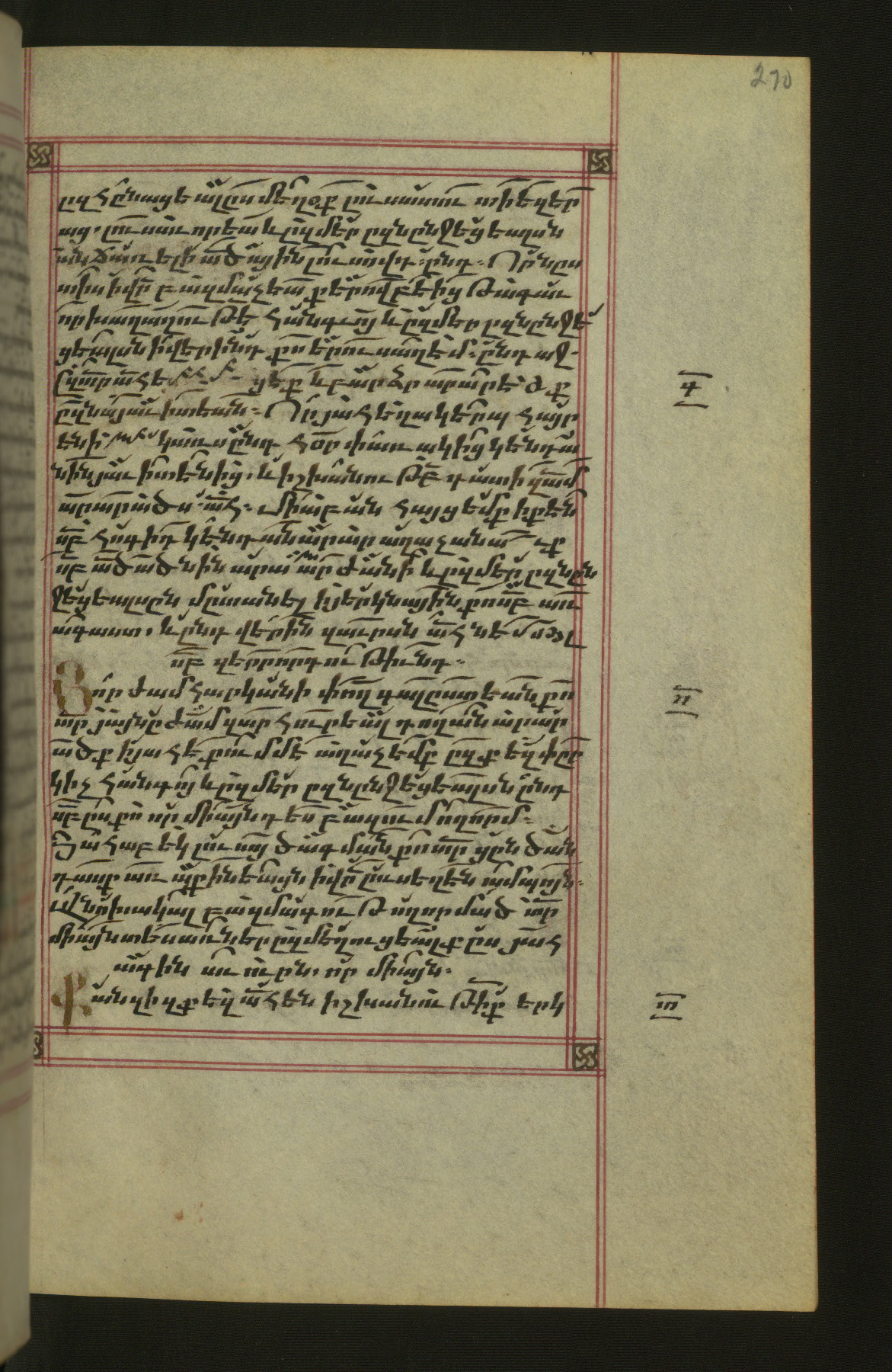 This hymnal was completed in Constantinople on August 15, 1678 [AE 1127], by the priest Yakob Pēligratc‘i, having been commissioned by Člav, son of Nawasard, as a dedication to his sons, Astuacatur and Sahak. The structure of the hymns adheres approximately to the standard Armenian hymnal (Շաբակնոց), with minor variations in order and a few substitutions (see Sanjian in the bibliography). The book is illuminated extensively, with thirty-eight full- and half-page polychrome miniatures against gold backgrounds, eight decorated head-pieces marking the principal divisions of the hymnal, and numerous marginal miniatures marking individual hymns, including biblical figures, saints, bishops, and vignettes. The style of the miniatures is largely in imitation of western European models, though more traditional Armenian and Byzantine influences stand out, such as the vibrant color palette, an iconic frontality for depictions of saints and bishops, and the highly abstracted floral motifs and zoomorphic incipits marking hymn divisions.