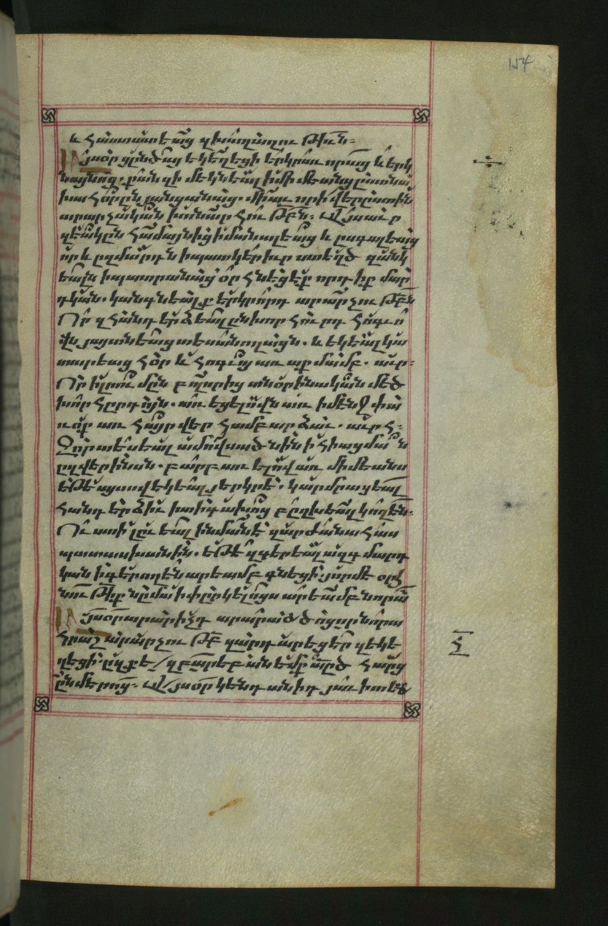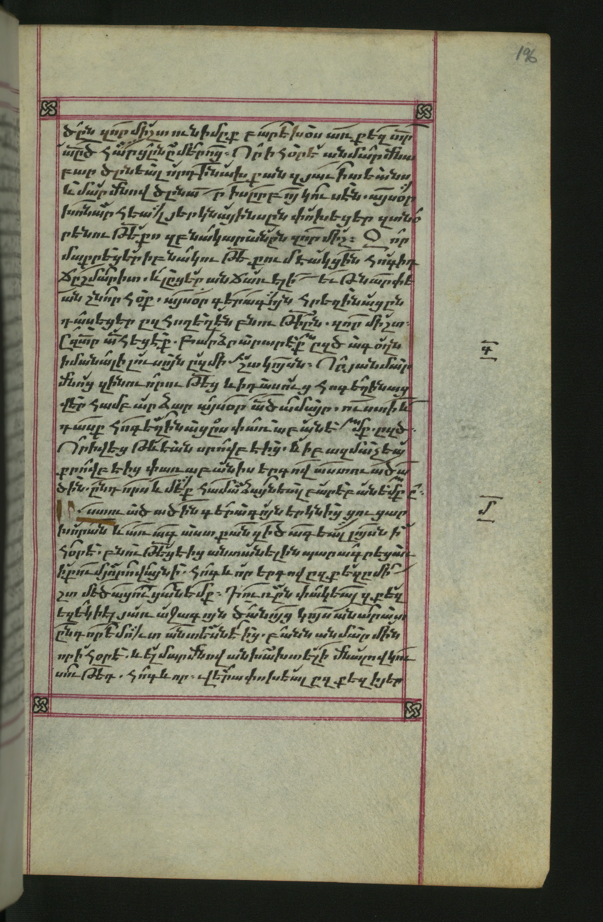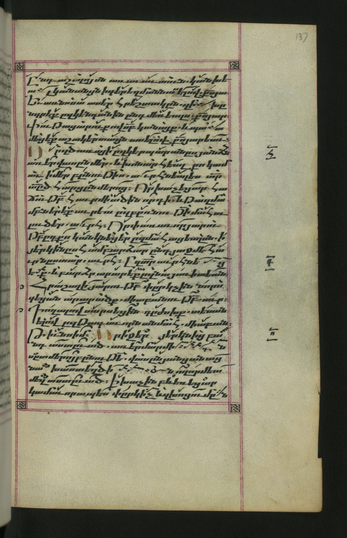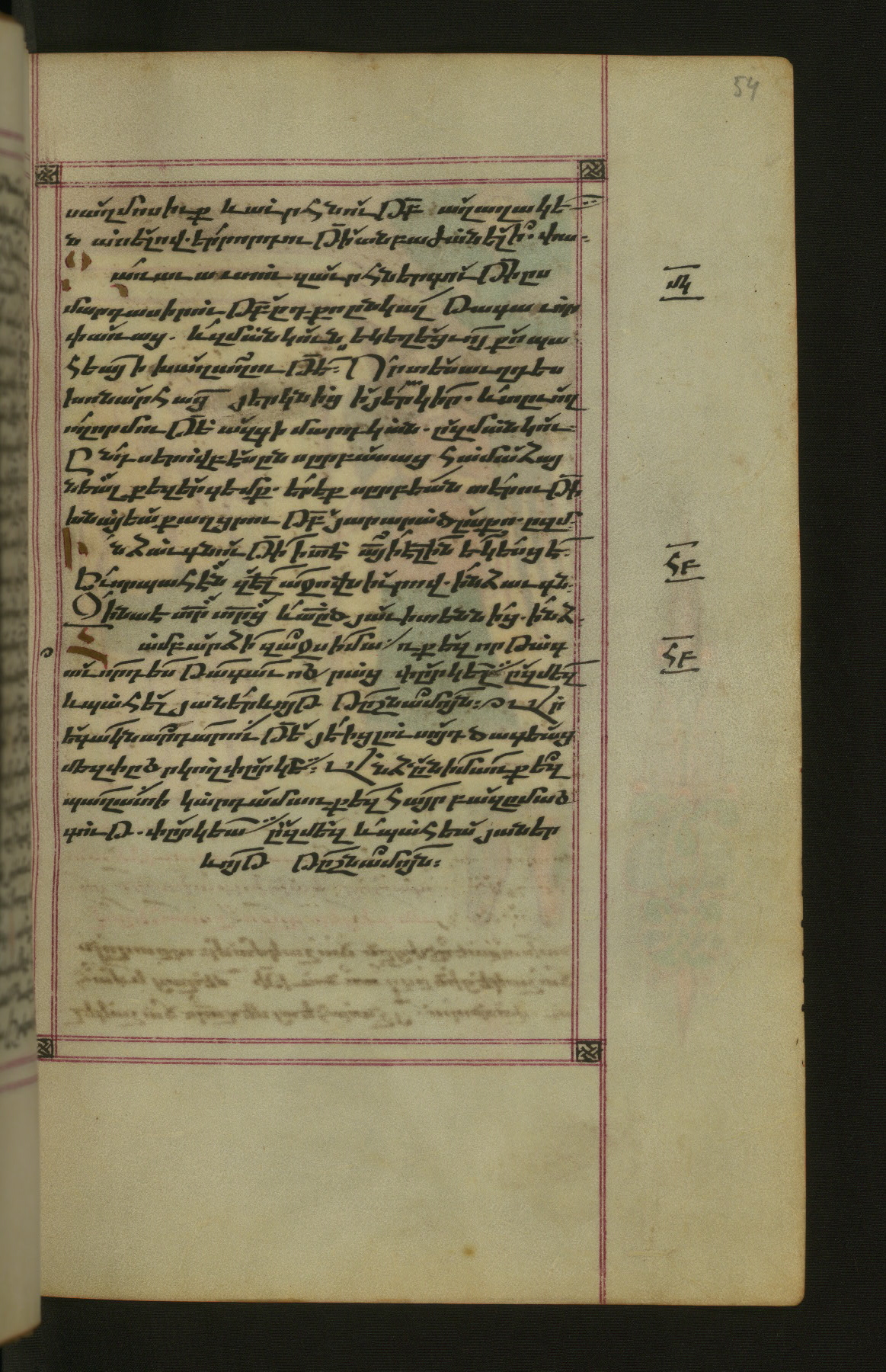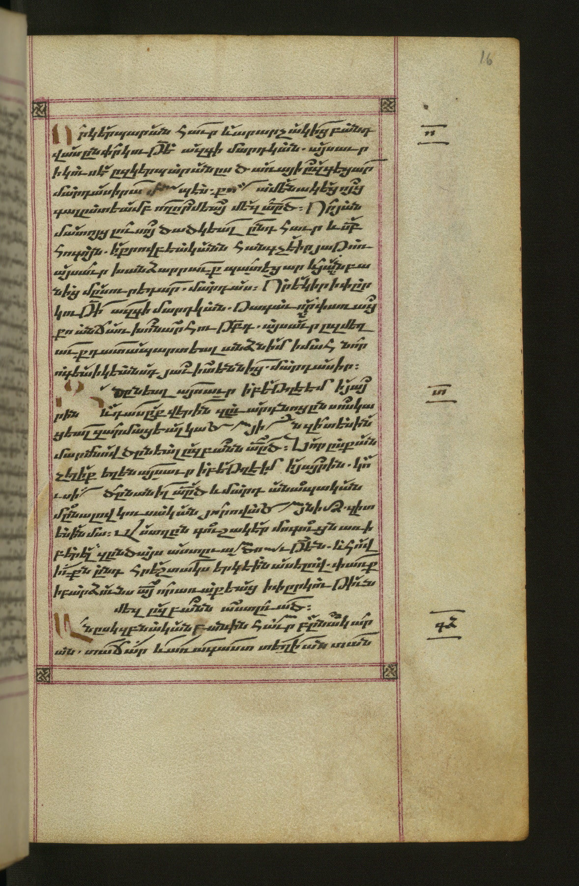 This hymnal was completed in Constantinople on August 15, 1678 [AE 1127], by the priest Yakob Pēligratc‘i, having been commissioned by Člav, son of Nawasard, as a dedication to his sons, Astuacatur and Sahak. The structure of the hymns adheres approximately to the standard Armenian hymnal (Շաբակնոց), with minor variations in order and a few substitutions (see Sanjian in the bibliography). The book is illuminated extensively, with thirty-eight full- and half-page polychrome miniatures against gold backgrounds, eight decorated head-pieces marking the principal divisions of the hymnal, and numerous marginal miniatures marking individual hymns, including biblical figures, saints, bishops, and vignettes. The style of the miniatures is largely in imitation of western European models, though more traditional Armenian and Byzantine influences stand out, such as the vibrant color palette, an iconic frontality for depictions of saints and bishops, and the highly abstracted floral motifs and zoomorphic incipits marking hymn divisions.