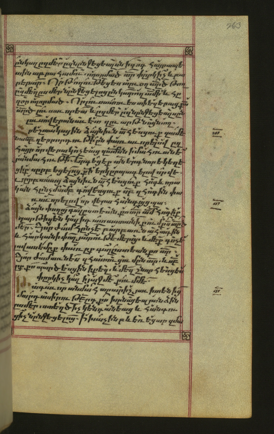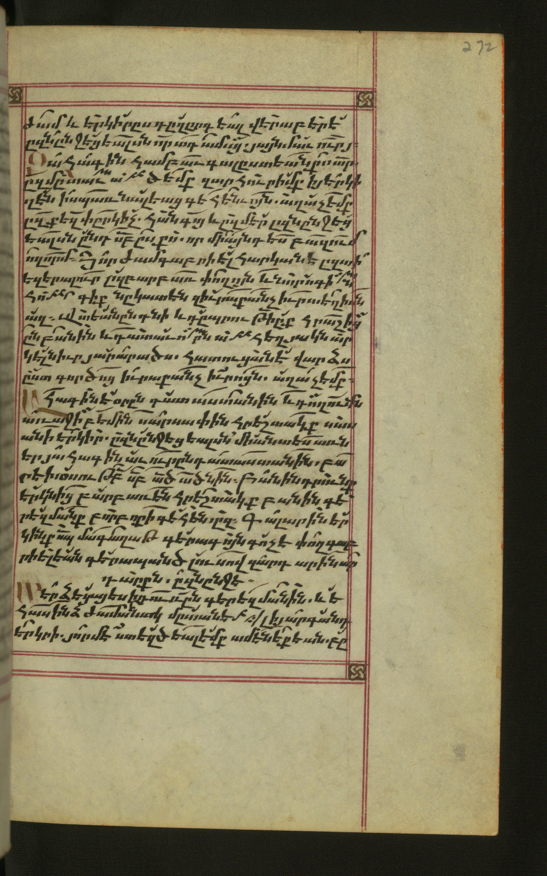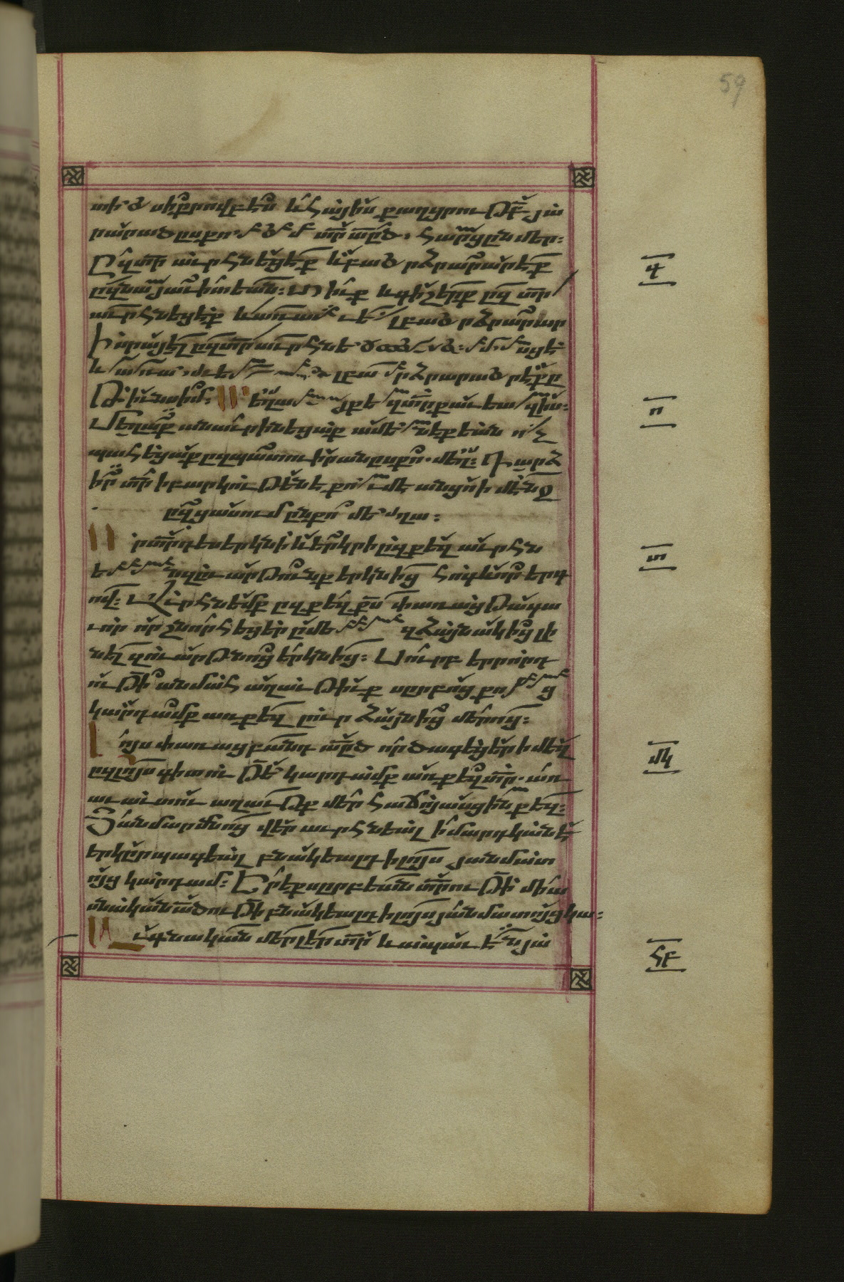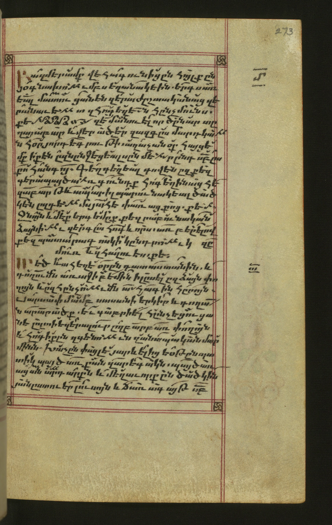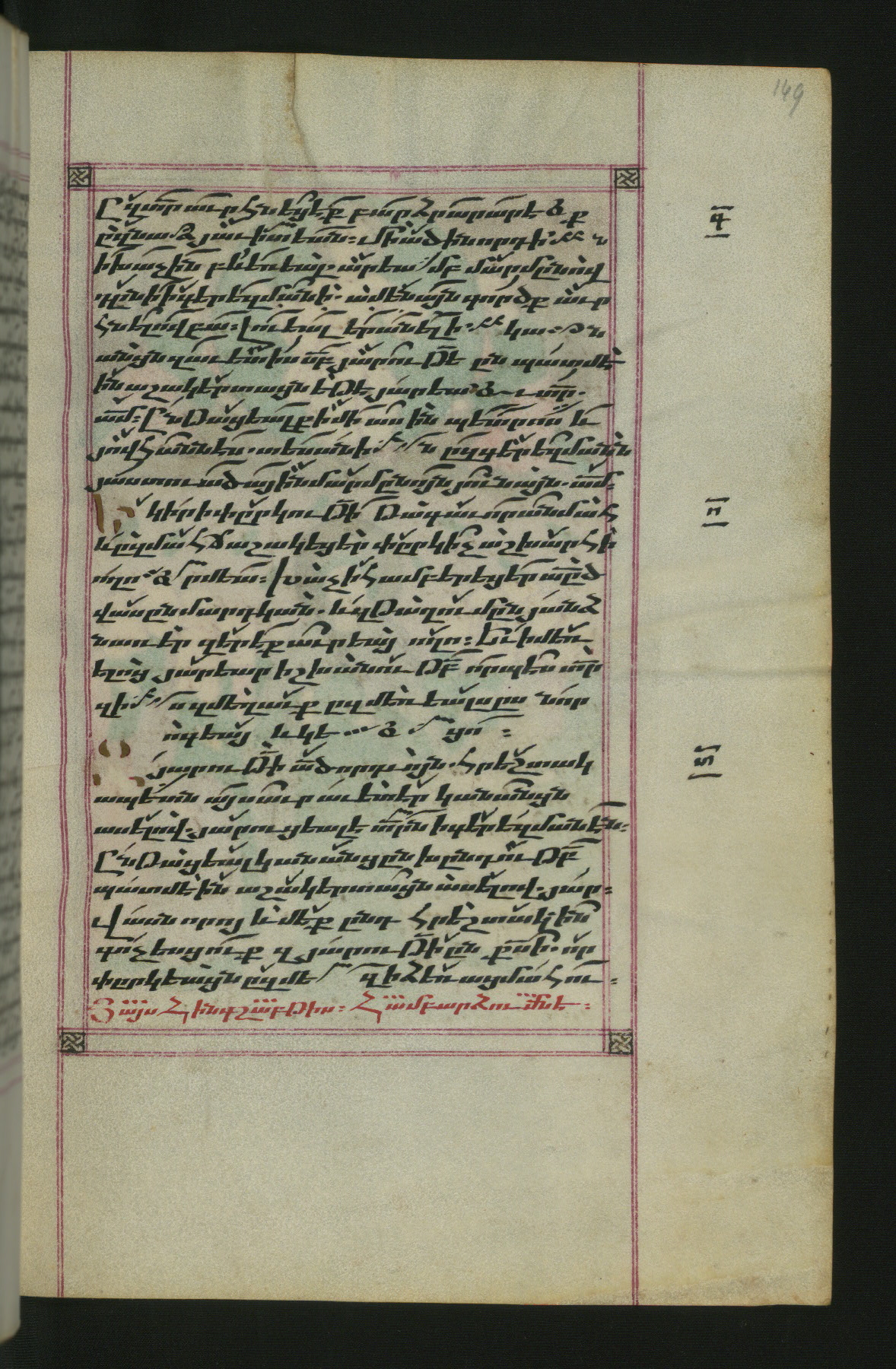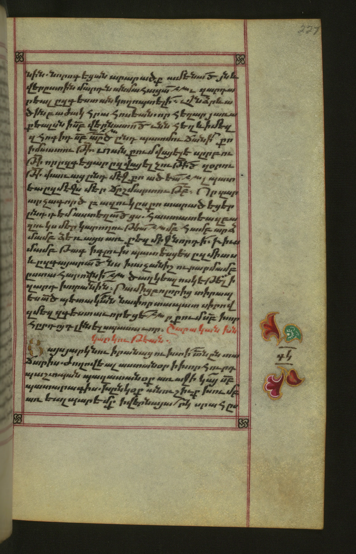 This hymnal was completed in Constantinople on August 15, 1678 [AE 1127], by the priest Yakob Pēligratc‘i, having been commissioned by Člav, son of Nawasard, as a dedication to his sons, Astuacatur and Sahak. The structure of the hymns adheres approximately to the standard Armenian hymnal (Շաբակնոց), with minor variations in order and a few substitutions (see Sanjian in the bibliography). The book is illuminated extensively, with thirty-eight full- and half-page polychrome miniatures against gold backgrounds, eight decorated head-pieces marking the principal divisions of the hymnal, and numerous marginal miniatures marking individual hymns, including biblical figures, saints, bishops, and vignettes. The style of the miniatures is largely in imitation of western European models, though more traditional Armenian and Byzantine influences stand out, such as the vibrant color palette, an iconic frontality for depictions of saints and bishops, and the highly abstracted floral motifs and zoomorphic incipits marking hymn divisions.