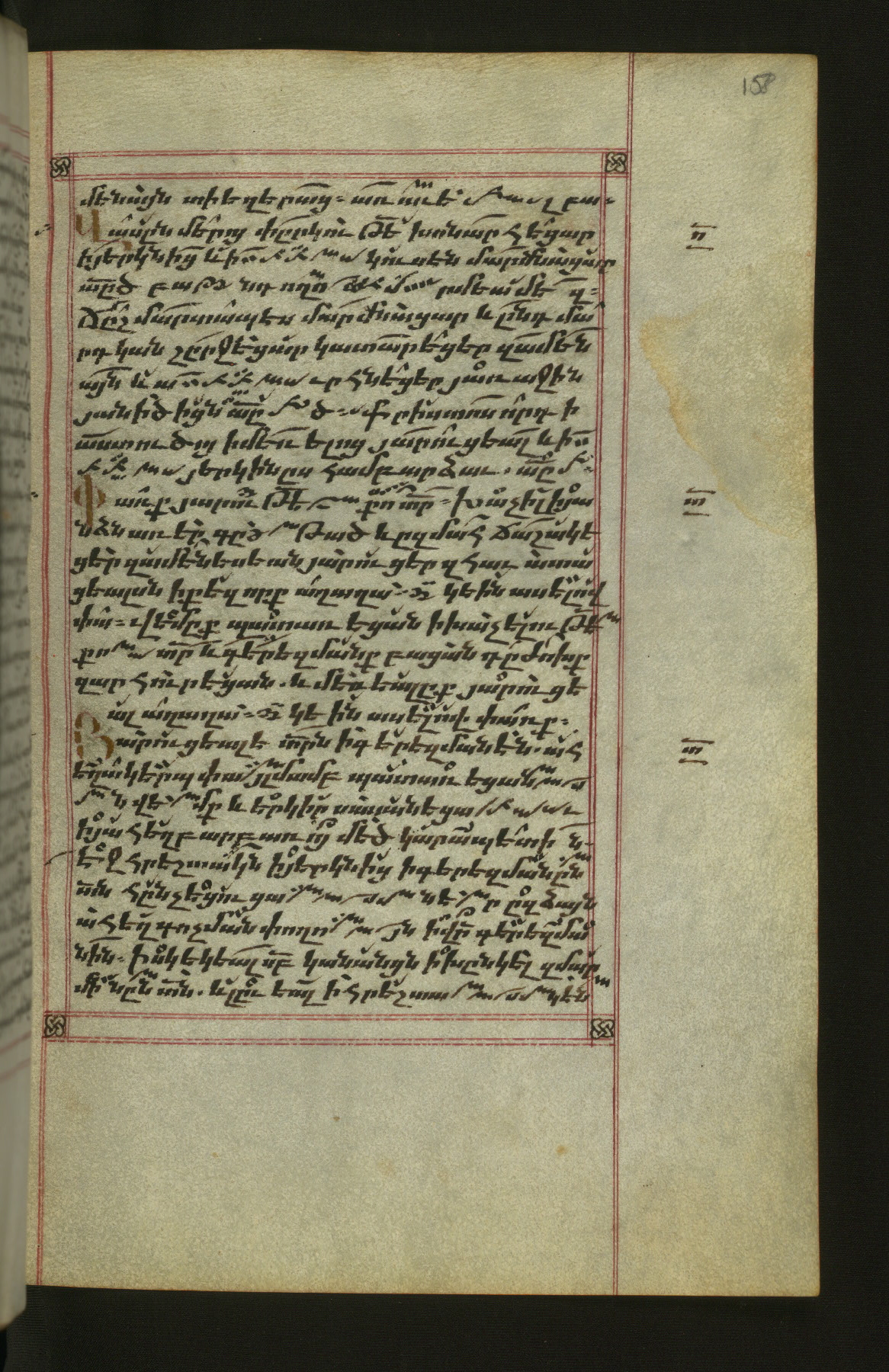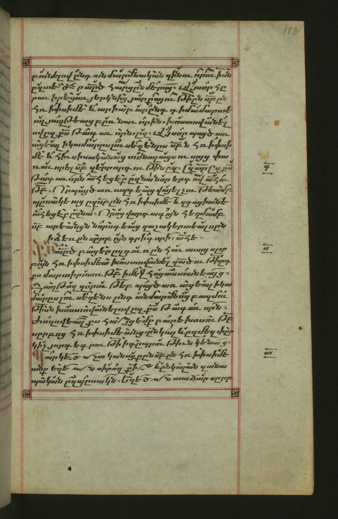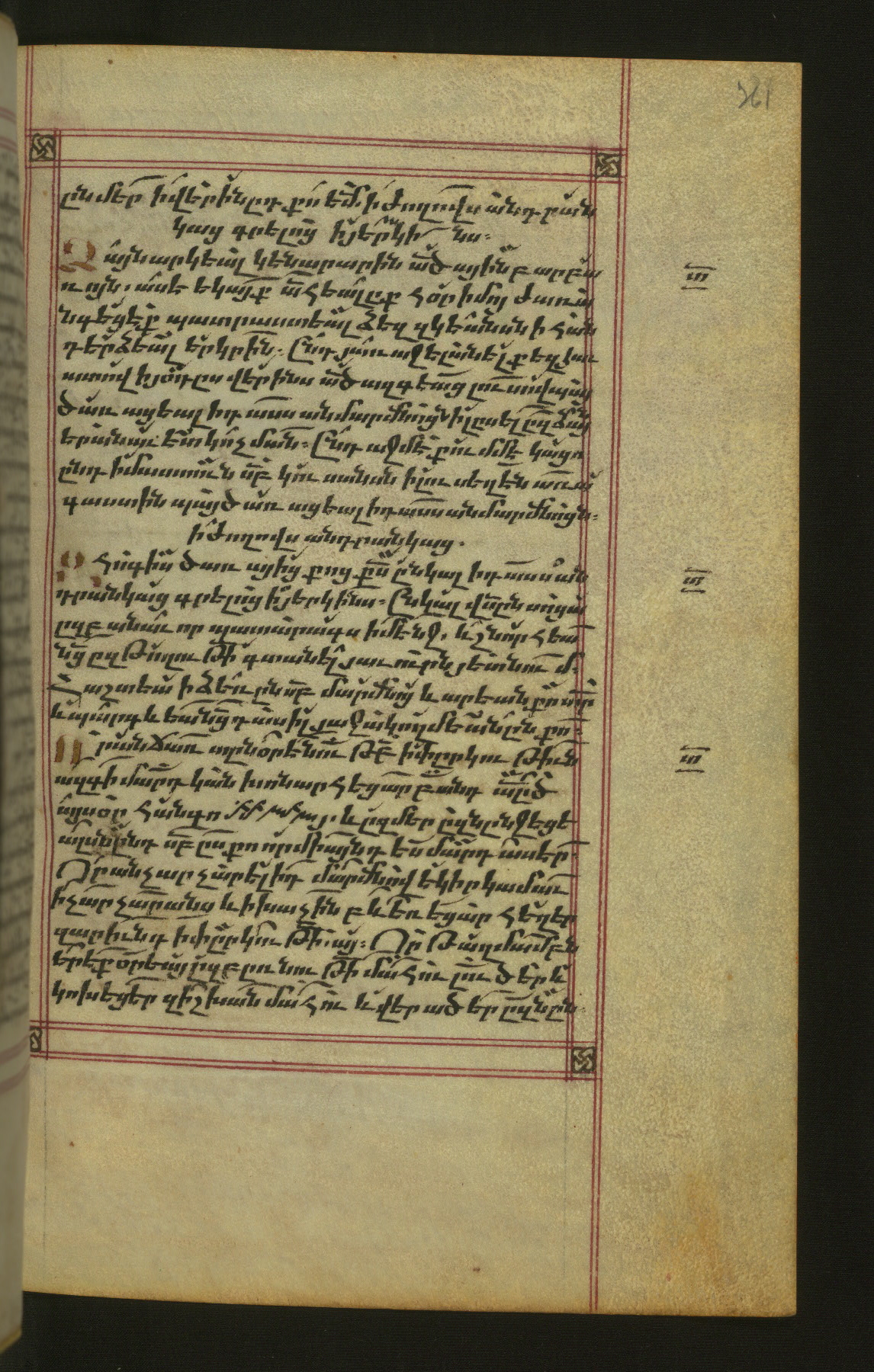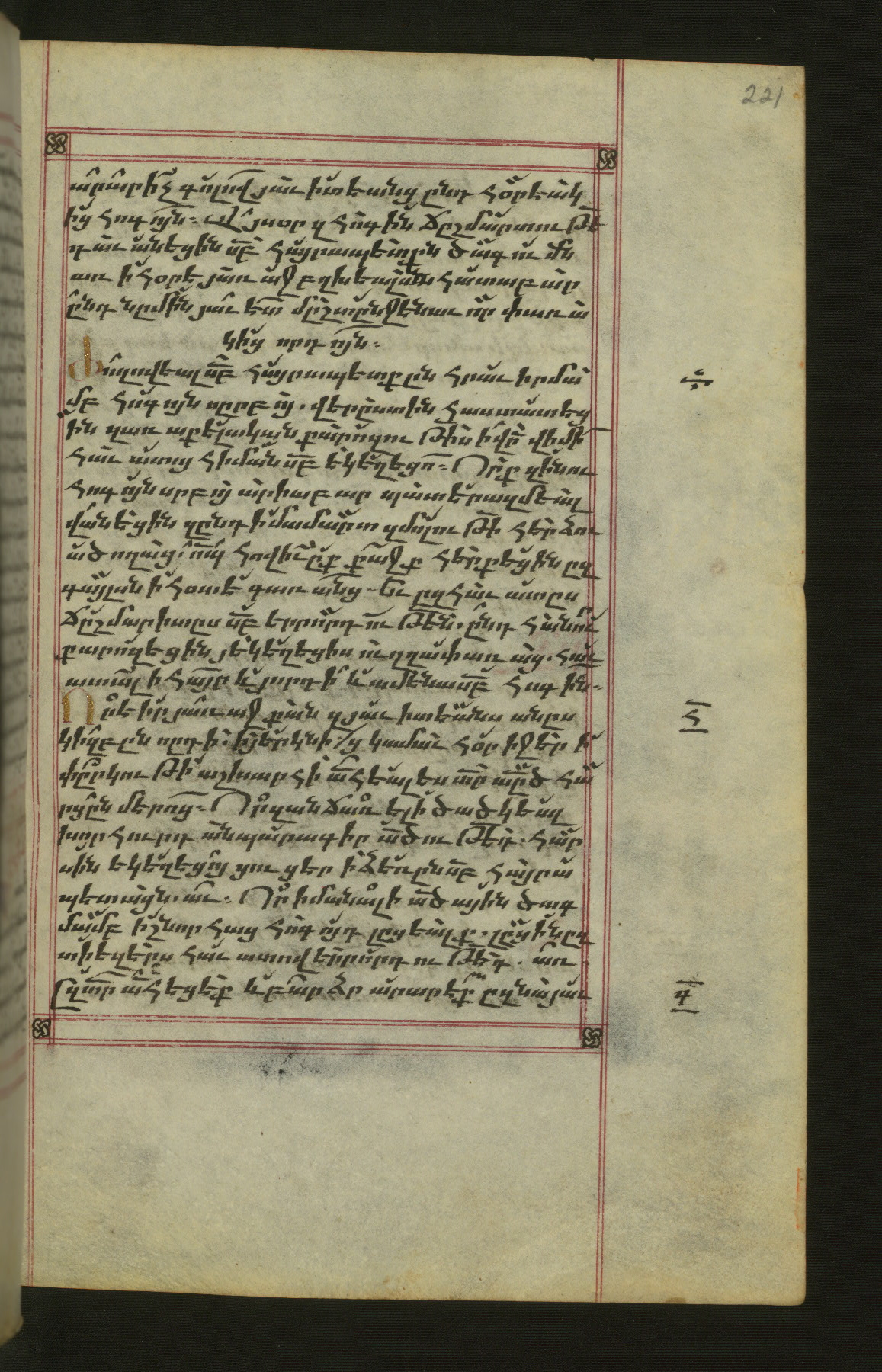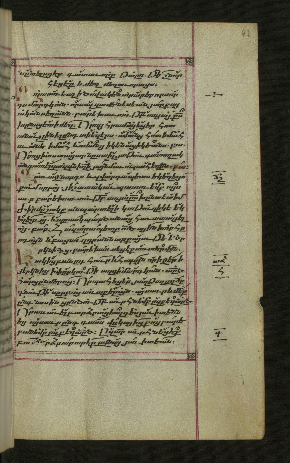 This hymnal was completed in Constantinople on August 15, 1678 [AE 1127], by the priest Yakob Pēligratc‘i, having been commissioned by Člav, son of Nawasard, as a dedication to his sons, Astuacatur and Sahak. The structure of the hymns adheres approximately to the standard Armenian hymnal (Շաբակնոց), with minor variations in order and a few substitutions (see Sanjian in the bibliography). The book is illuminated extensively, with thirty-eight full- and half-page polychrome miniatures against gold backgrounds, eight decorated head-pieces marking the principal divisions of the hymnal, and numerous marginal miniatures marking individual hymns, including biblical figures, saints, bishops, and vignettes. The style of the miniatures is largely in imitation of western European models, though more traditional Armenian and Byzantine influences stand out, such as the vibrant color palette, an iconic frontality for depictions of saints and bishops, and the highly abstracted floral motifs and zoomorphic incipits marking hymn divisions.